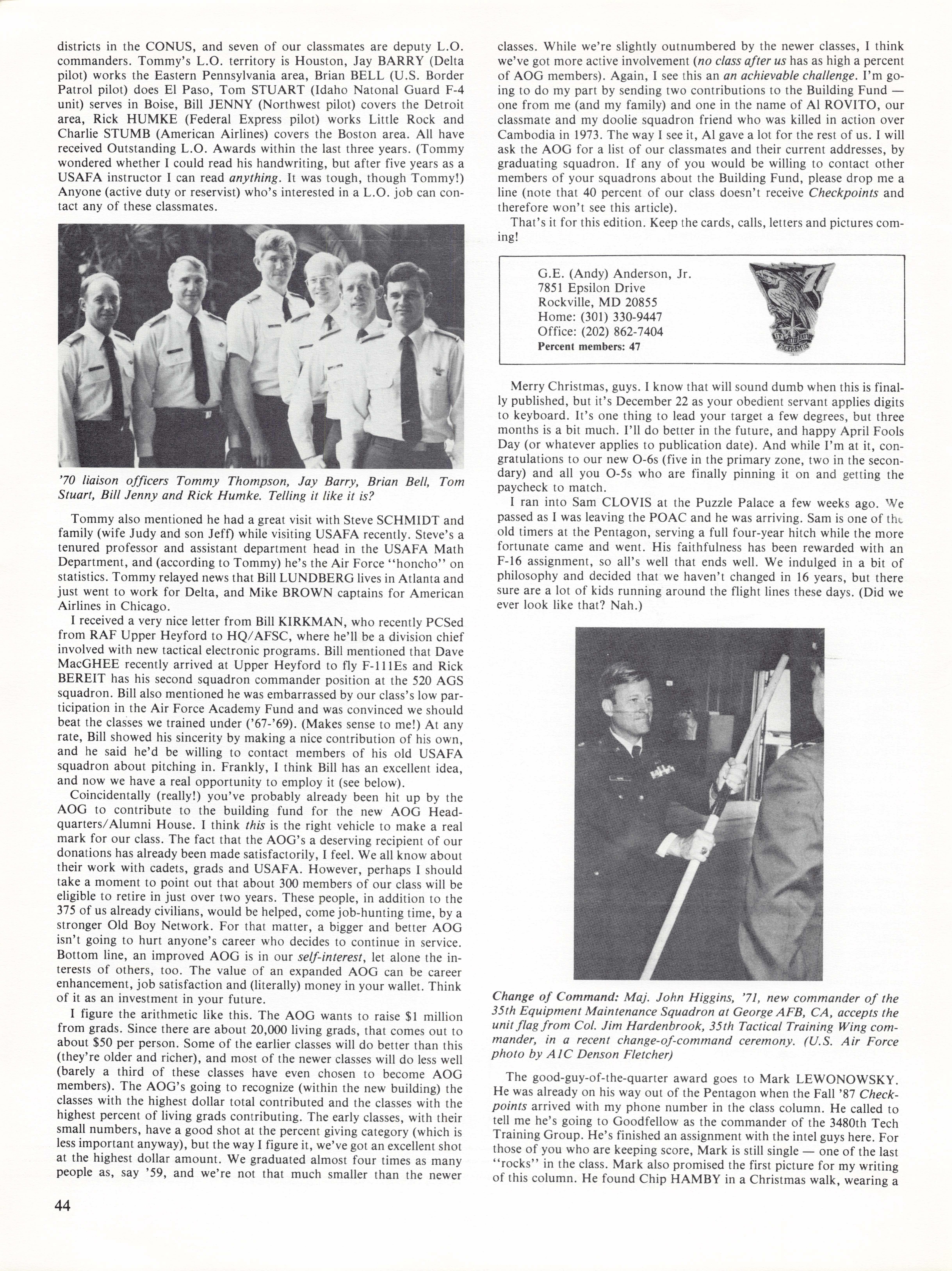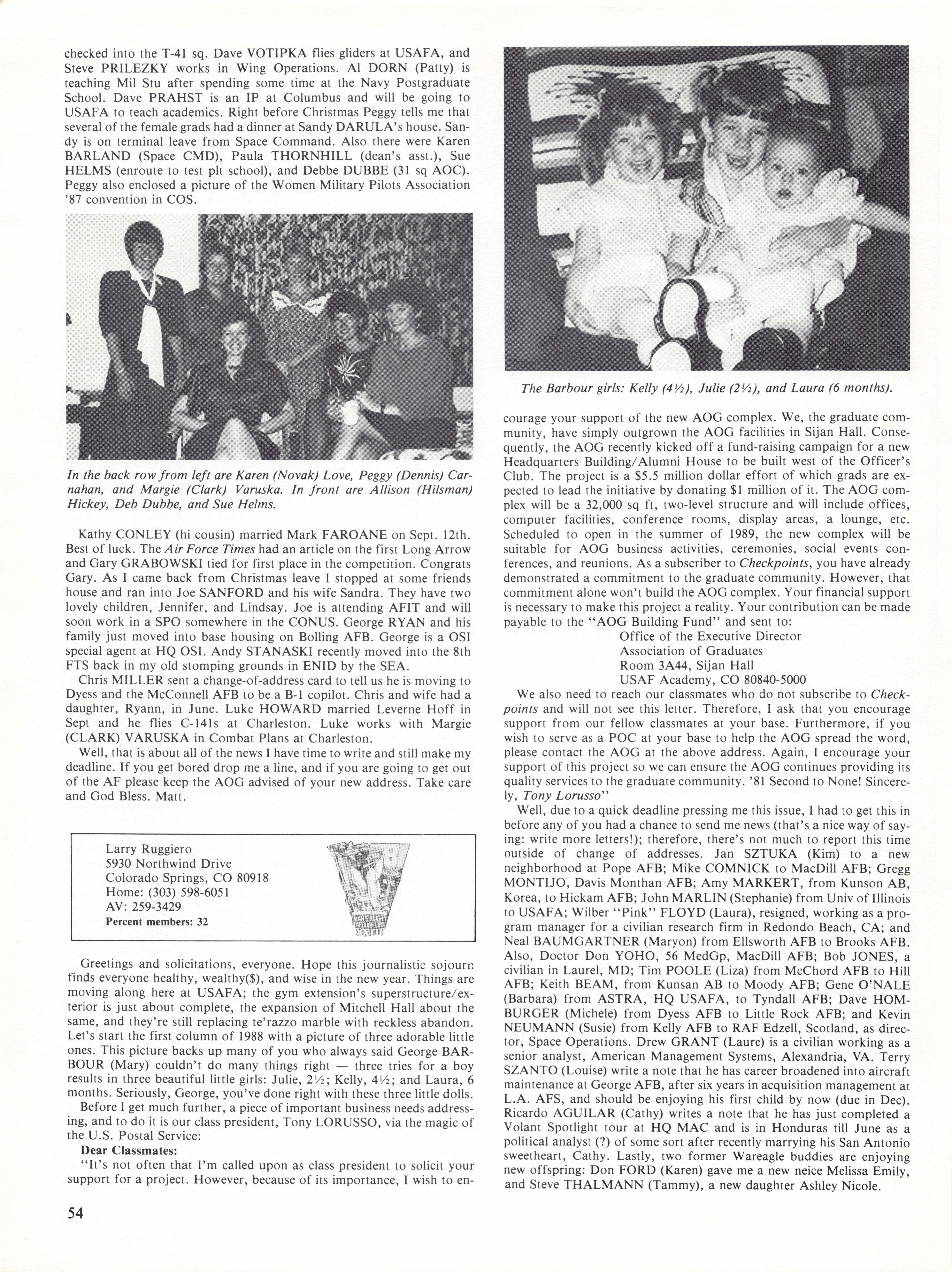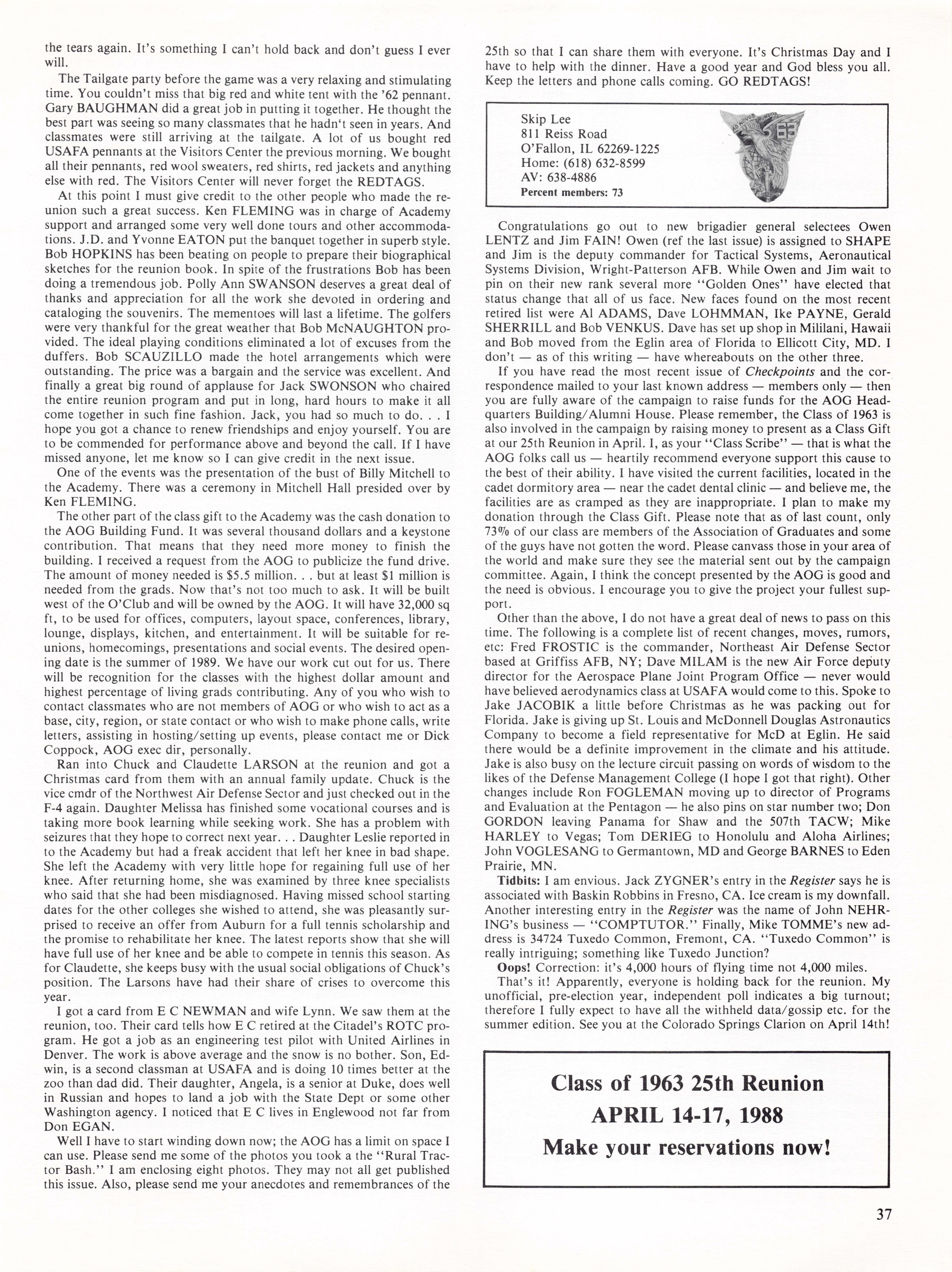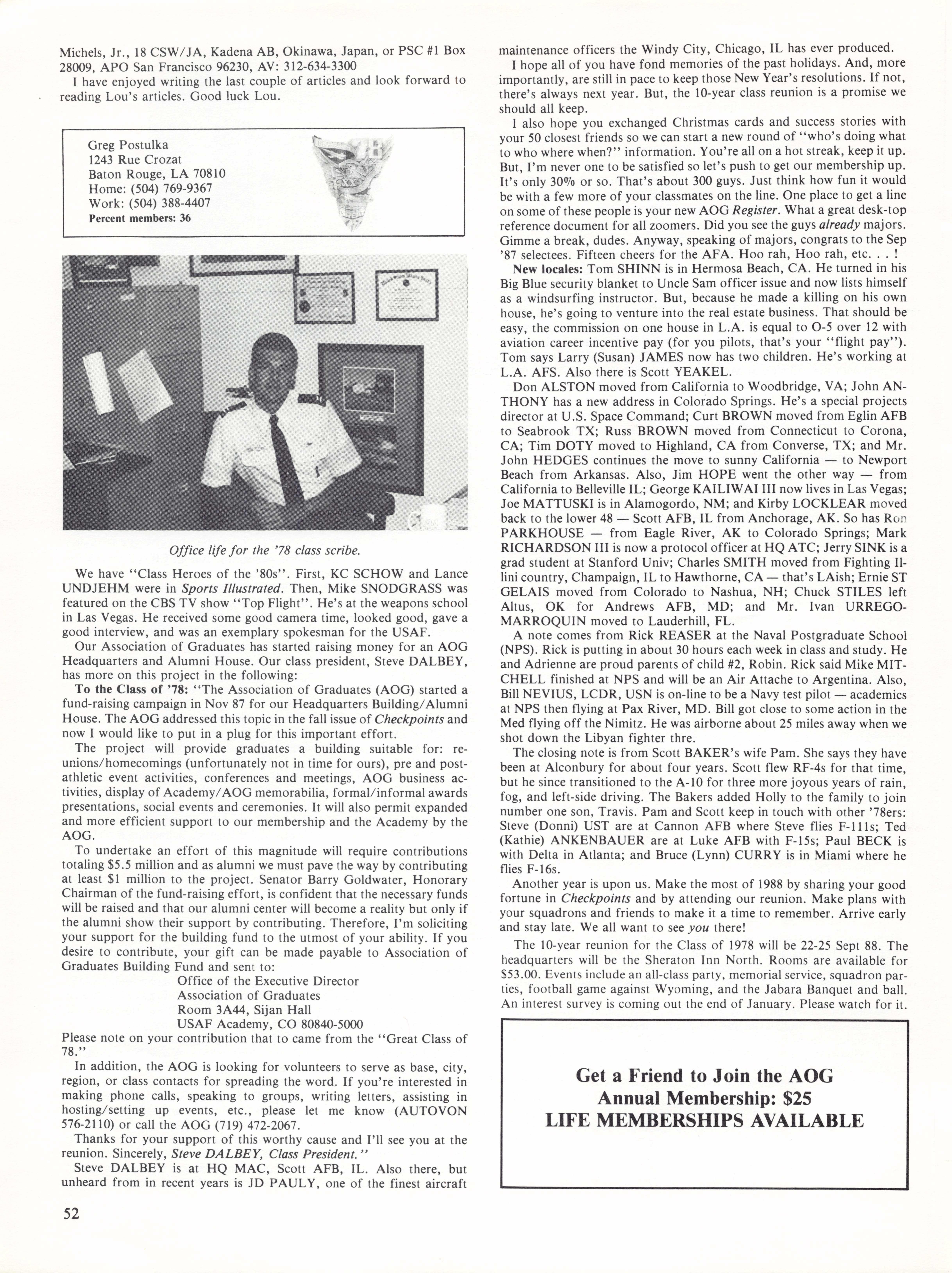 Well, that’s it for actual new news. The AOG recently kicked off its fund-raising campaign for anew AOG headquarters building/alumni house. The Academy Alumni (us) must show the way by contributing at least $1 million to the effort. Please refer to the fall issue of Checkpoints, it has acenterfold section dedicated to the AOG building. The magazine will continue to highlight fund-raising efforts until the campaign reaches asuccessful conclusion. NOW is the time for our class to join together and support OUR AOG. The new building will be built west of the O’Club and should be ready for use in the summer of ’89. Recognition in the building will be given to the classes with the highest dollar total in con¬ tributions and the highest percentage of living graduates contributing. If anyone is willing to serve as abase, city, or region contact for spreading the word please contact the AOG. I’d like to make achallenge to you—match the $50.00 1sent in. Please support our AOG.