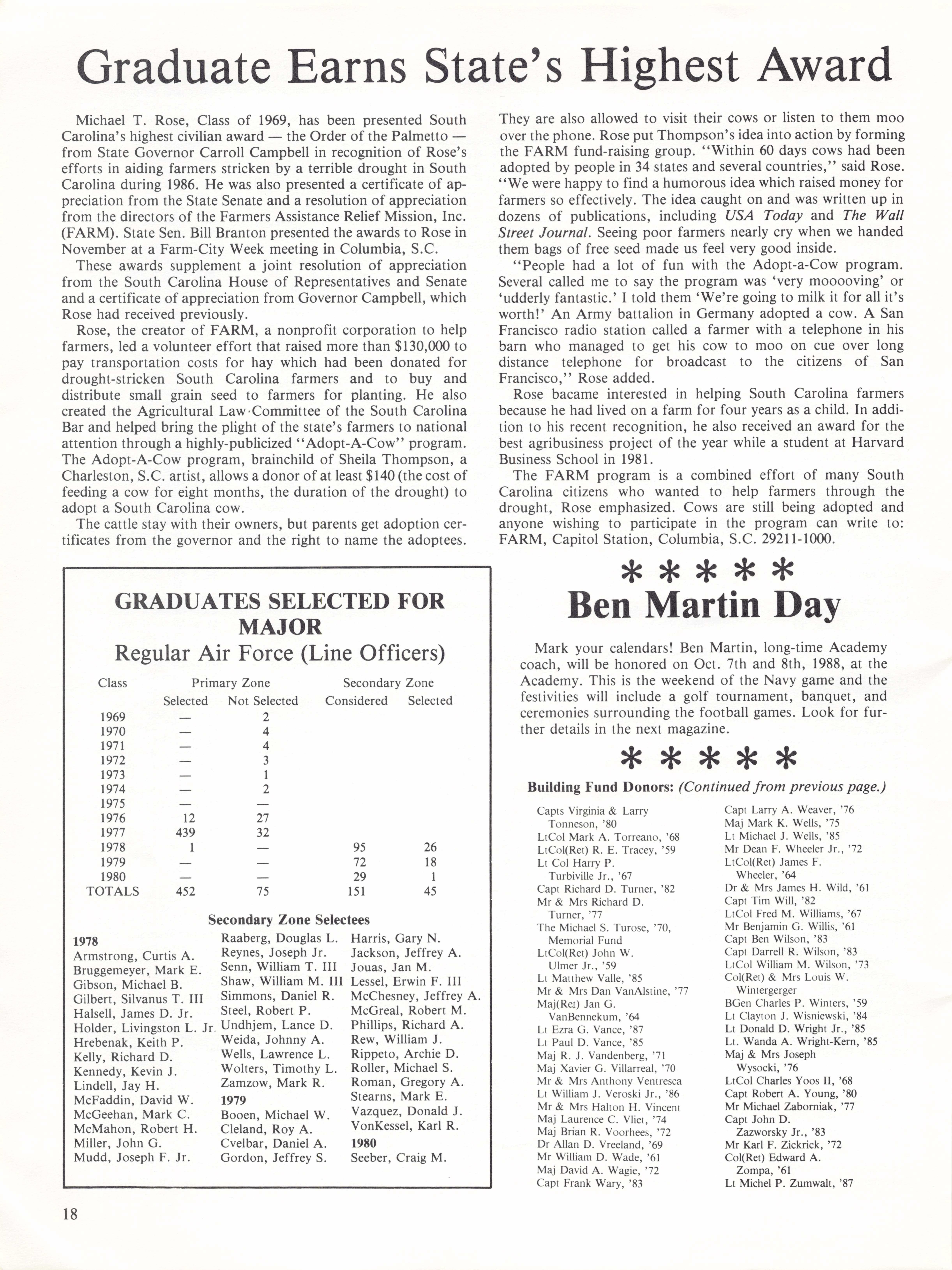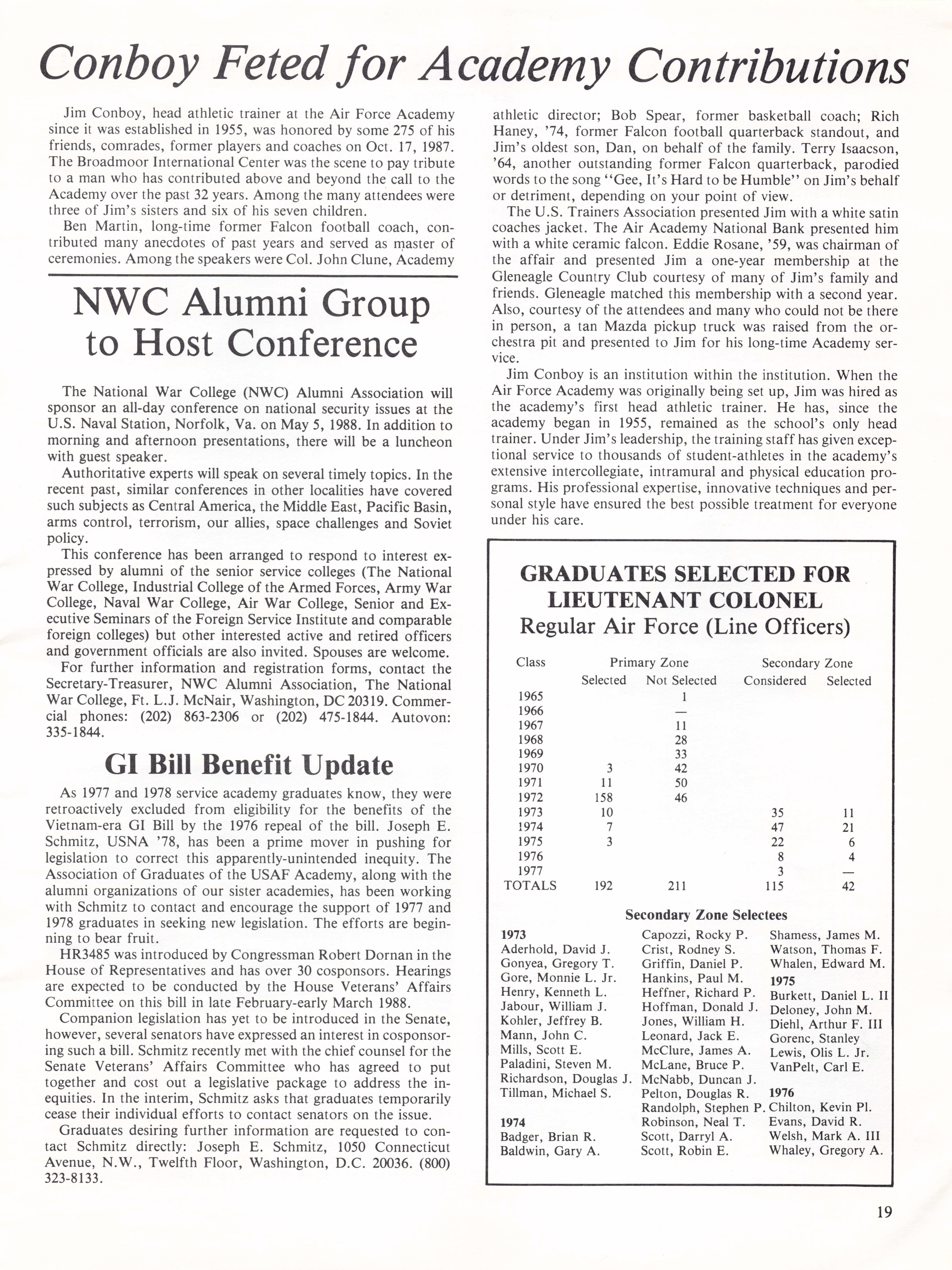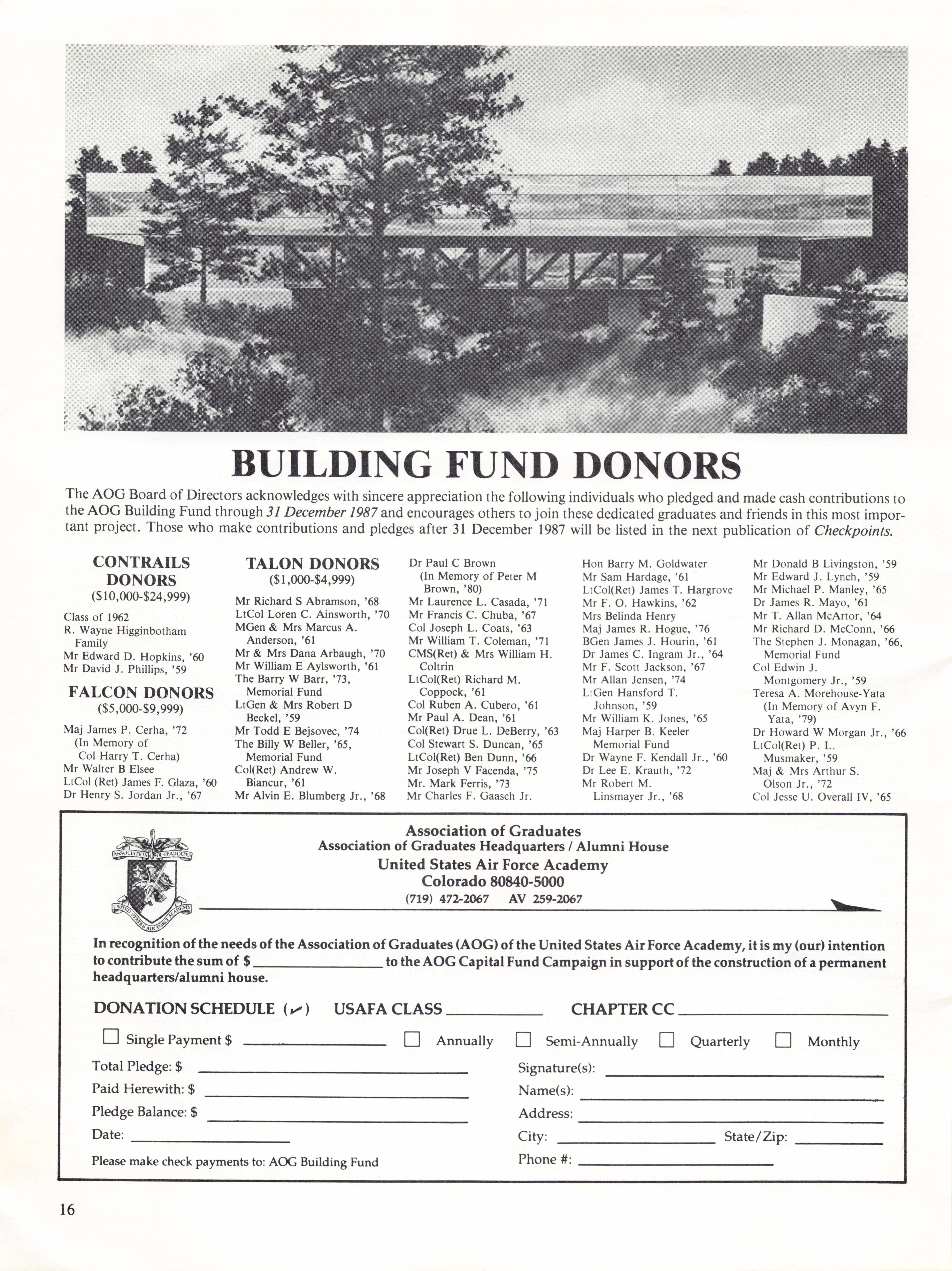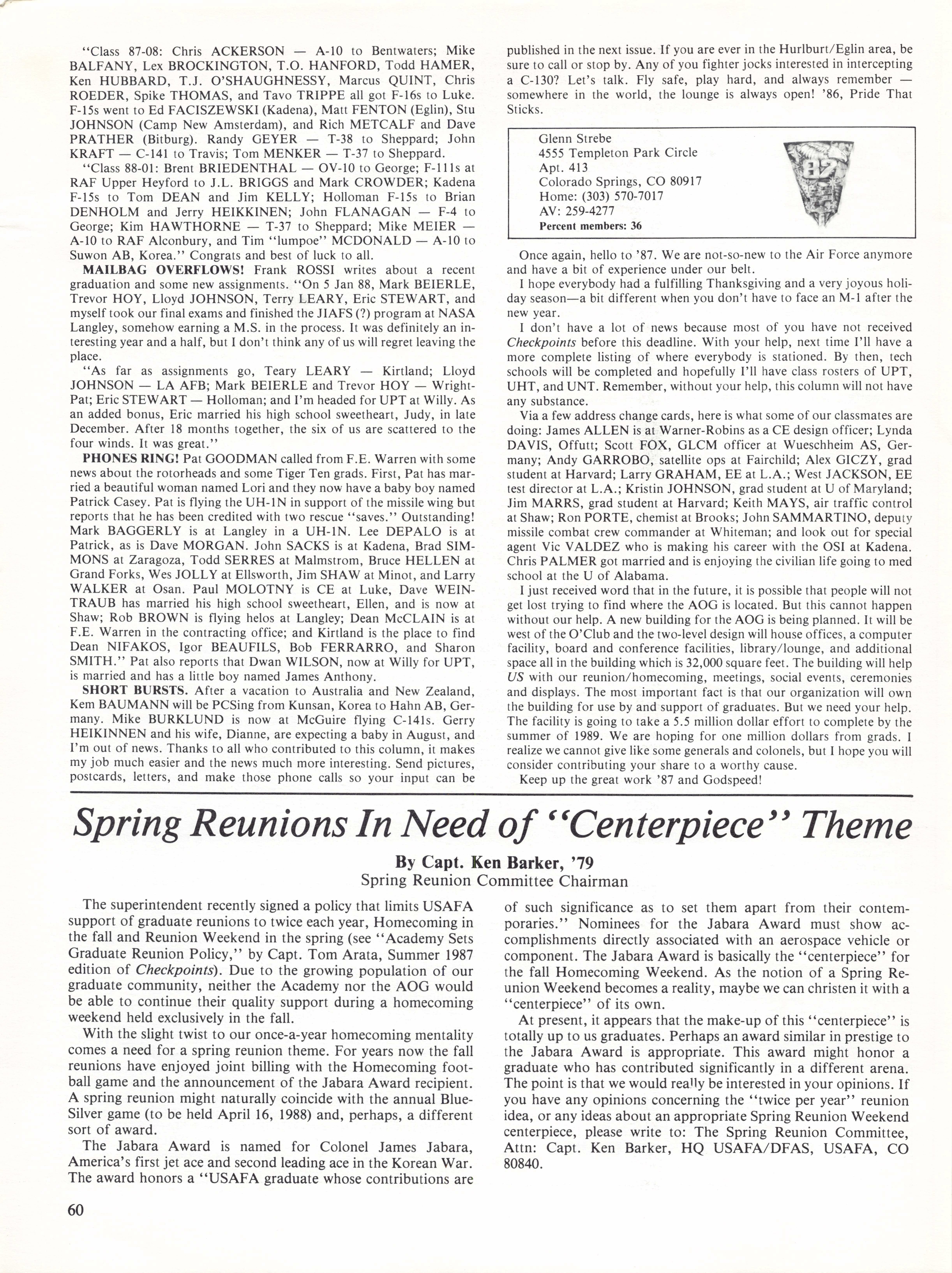 Well, that’s it for actual new news. The AOG recently kicked off its fund-raising campaign for anew AOG headquarters building/alumni house. The Academy Alumni (us) must show the way by contributing at least $1 million to the effort. Please refer to the fall issue of Checkpoints, it has acenterfold section dedicated to the AOG building. The magazine will continue to highlight fund-raising efforts until the campaign reaches asuccessful conclusion. NOW is the time for our class to join together and support OUR AOG. The new building will be built west of the O’Club and should be ready for use in the summer of ’89. Recognition in the building will be given to the classes with the highest dollar total in con¬ tributions and the highest percentage of living graduates contributing. If anyone is willing to serve as abase, city, or region contact for spreading the word please contact the AOG. I’d like to make achallenge to you—match the $50.00 1sent in. Please support our AOG.