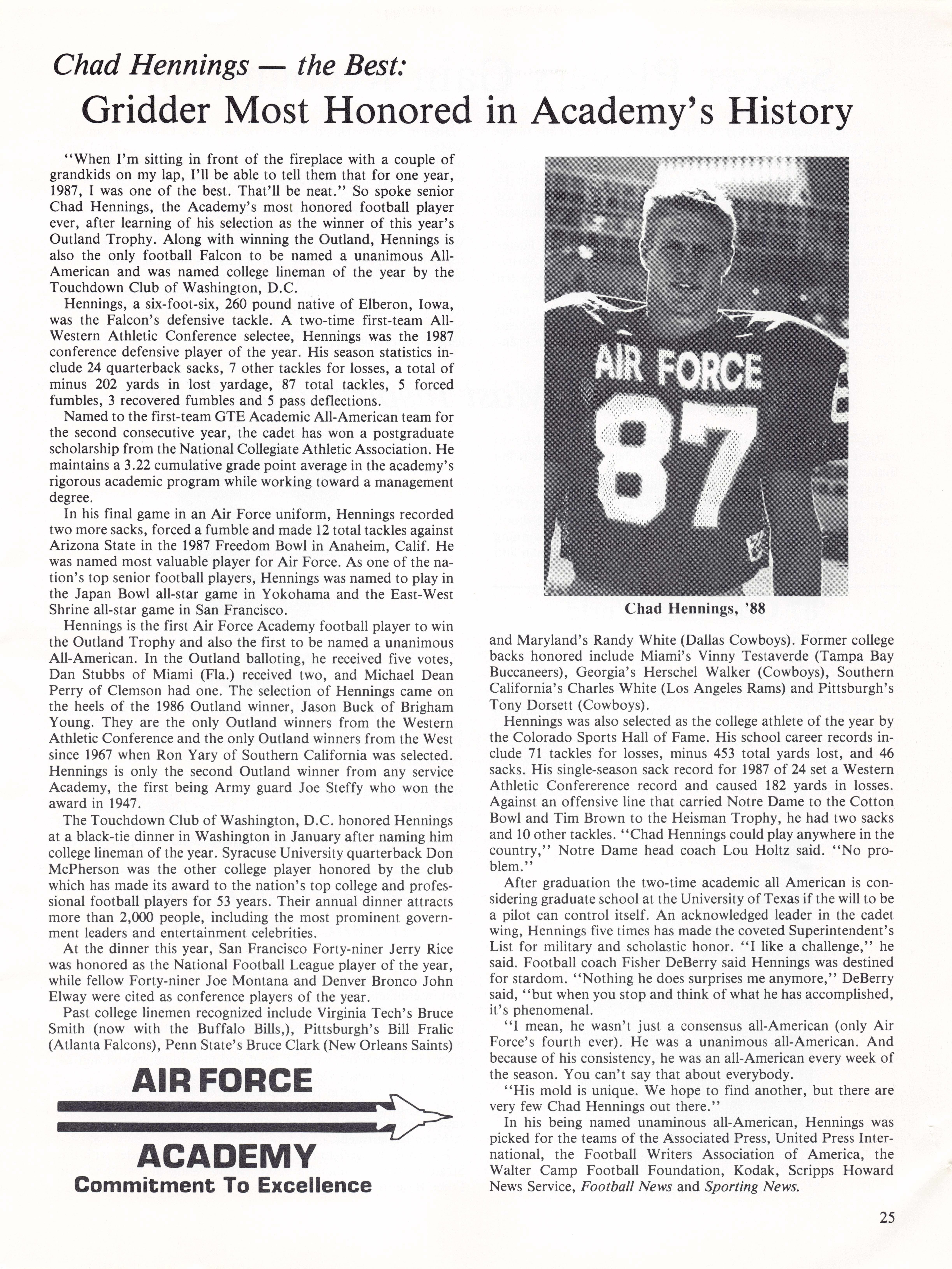 Well good people, in last quarter’s article Icertainly was pessimistic about our chances of having awinning football season, much less going to abowl game. Yet here it is in the beginning of December and our fabulous Falcons have just concluded a9-3 record and will meet the Arizona State Sun Devils in the Freedom Bowl at Anaheim, California on the 30th of December. The big difference this year has been the great leadership demonstrated by our seniors. In all my years of being associated with Academy football, Ican tell you honestly that these young men are special.