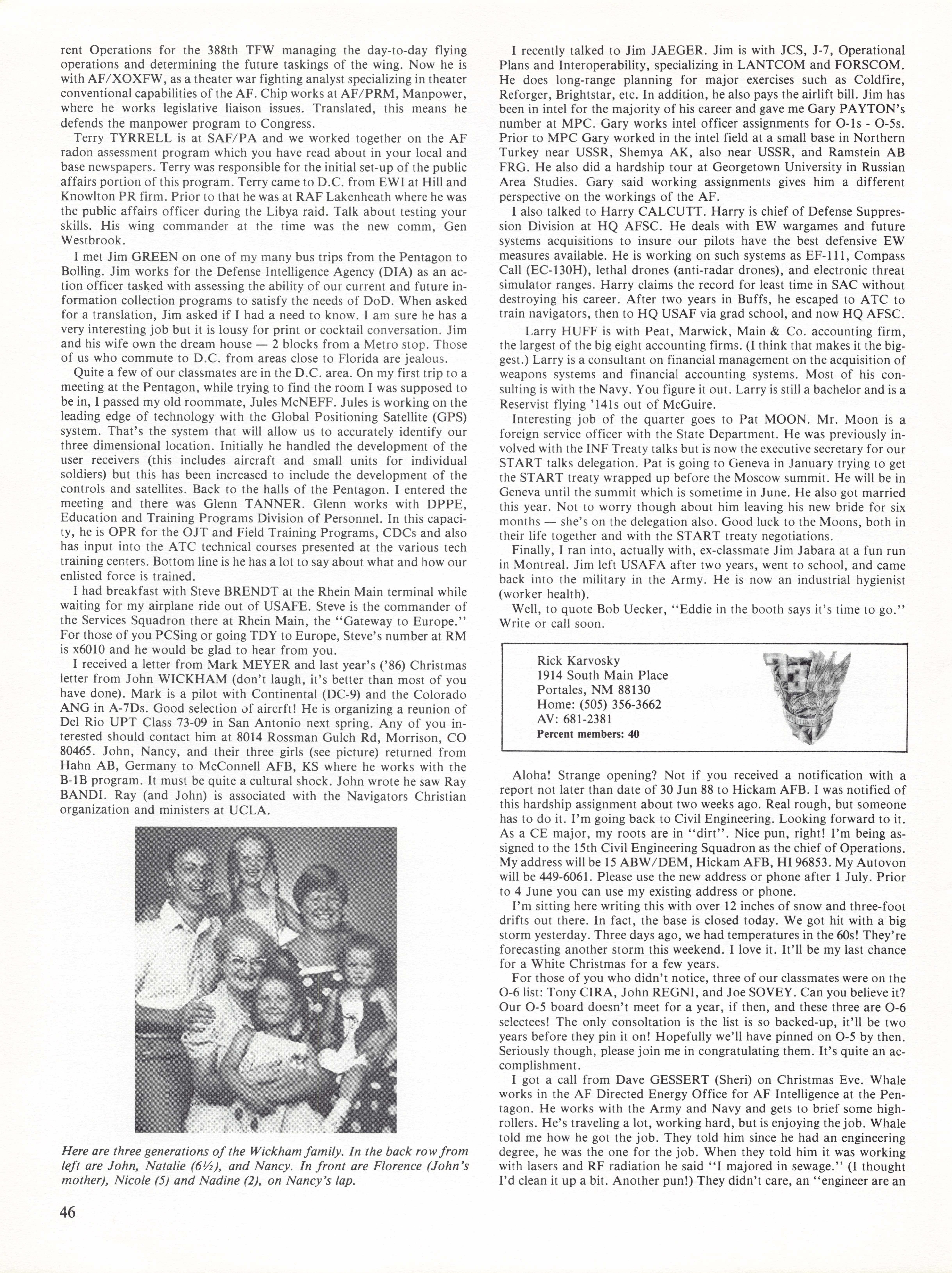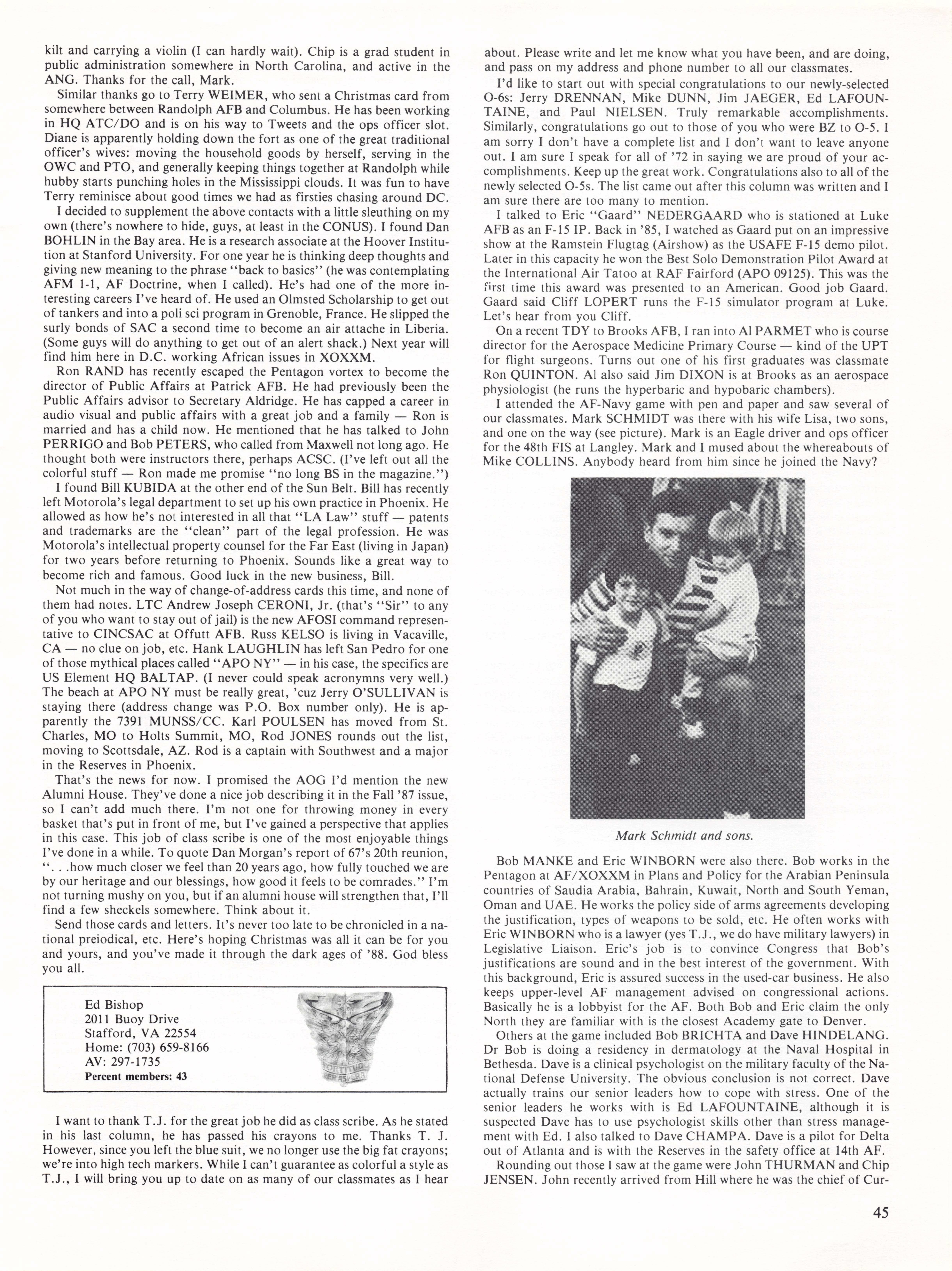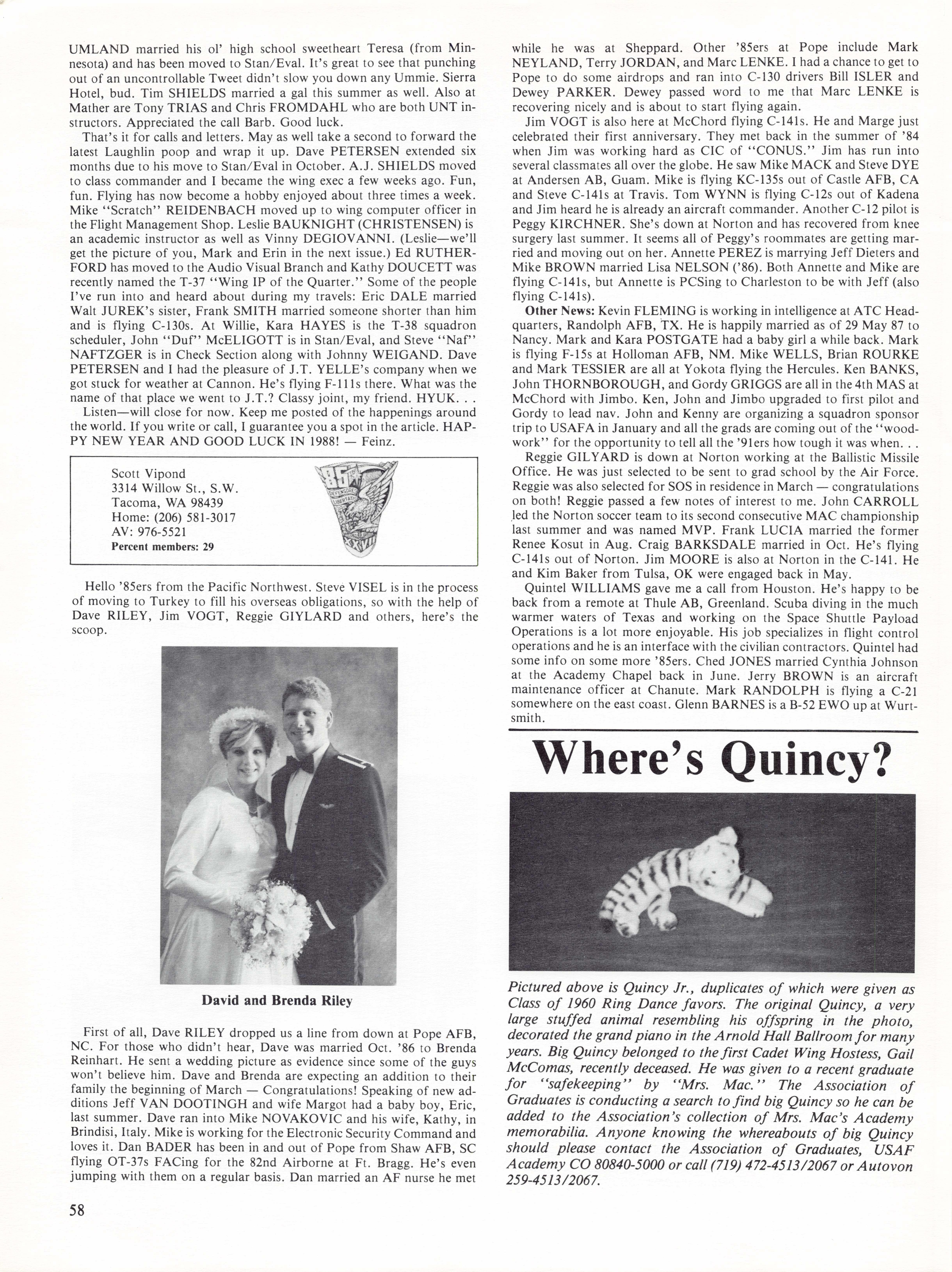 First of all, Dave RILEY dropped us aline from down at Pope AFB, NC. For those who didn’t hear, Dave was married Oct. ’86 to Brenda Reinhart. He sent awedding picture as evidence since some of the guys won’t believe him. Dave and Brenda are expecting an addition to their family the beginning of March —Congratulations! Speaking of new ad¬ ditions Jeff VAN DOOTINGH and wife Margot had ababy boy, Eric, last summer. Dave ran into Mike NOVAKOVIC and his wife, Kathy, in Brindisi, Italy. Mike is working for the Electronic Security Command and loves it. Dan BADER has been in and out of Pope from Shaw AFB, SC flying OT-37s FACing for the 82nd Airborne at Ft. Bragg. He’s even jumping with them on aregular basis. Dan married an AF nurse he met