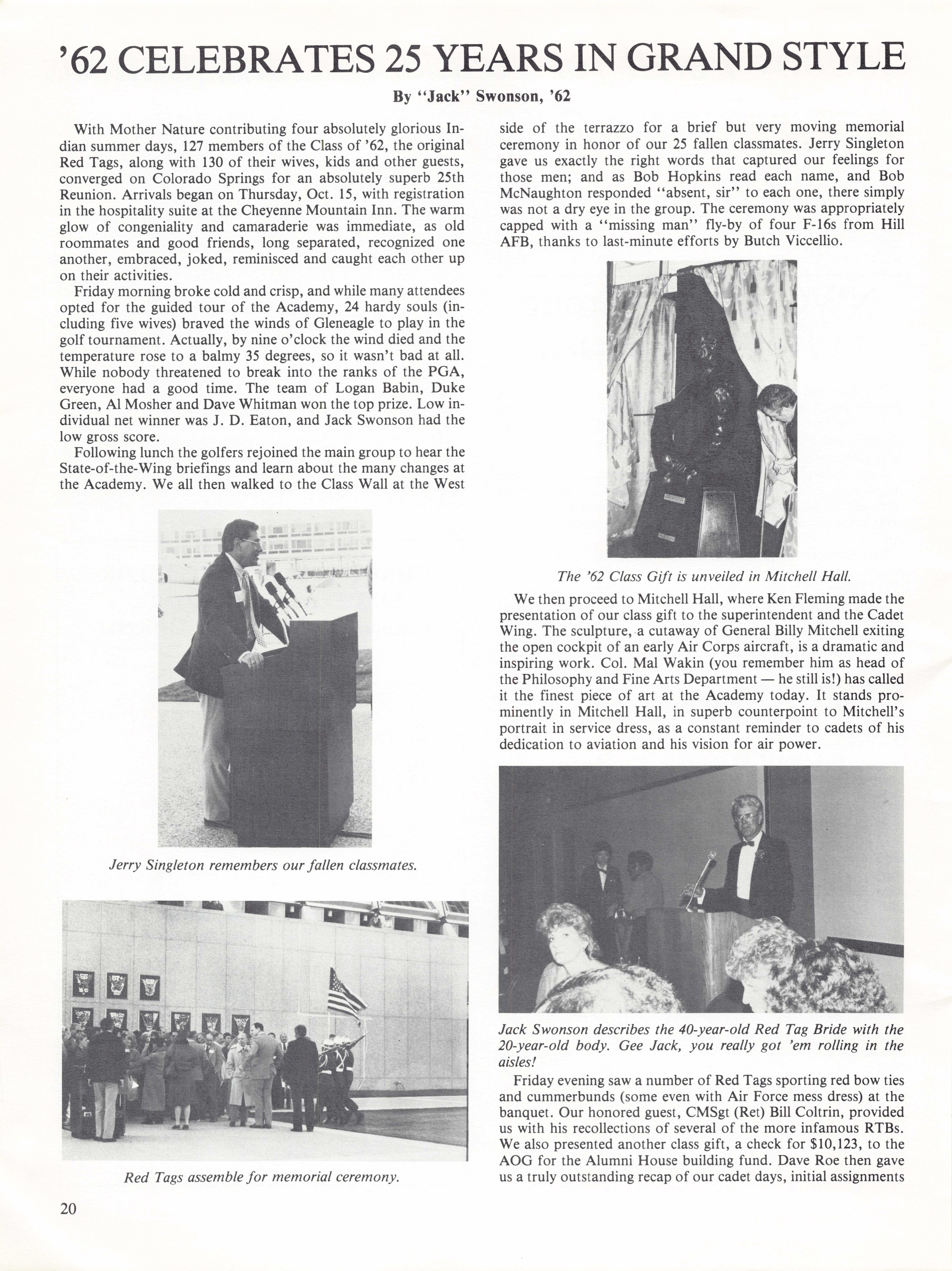 nardino Airport Authority. Good luck to you ...Otis DINNING fl ies Learjets for Flight International (I may have gotten the name wrong). He retired on 1July to get the job. They tow targets for the Navy and Air Force for ECM missions. This was amission that the old reliable T-Birds (T-33) used to do. ..Kent LAMMERS had aquick retirement to accept a job in Boulder, CO, with IBM. ..Tim GALLAGHER is still apilot for Delta fl ying the 737 out of Salt Lake City. Tim races aLotus in competi¬ tion around the country when he gets achance. He recently competed against Tom YOUNG and beat him by 15/1000 of asecond. After the race he discovered that Tom was indeed afellow Redtag. He’s looking forward to competing and winning again. By the way, Tom, several of us tried to call you at 2a.m, your time one morning just to give you afriend¬ ly hello. But you weren’t home or weren’t available. ..After the Tailgate Party on Saturday, we all started trekking for the gate where we could enter the stadium. It was way up on the highest part of the stadium. After we got up to the right gate, Ed STANTON remarked that we need a T-shirt saying “I survived the climb to Gate 7”. ..During the game, one of the spectators asked us what “RTB 62” stood for on our T-shirts. Don HUTCHINSON told him it meant Rural Tractor Bash and that we were all tractor drivers, including the tall two-star general in the front row (Butch VICCELLIO). By the way, since the knee pads with the one star on them made adecisive edge in helping Butch get his first star, the class gave him anew set of three-star knee pads. Good luck.