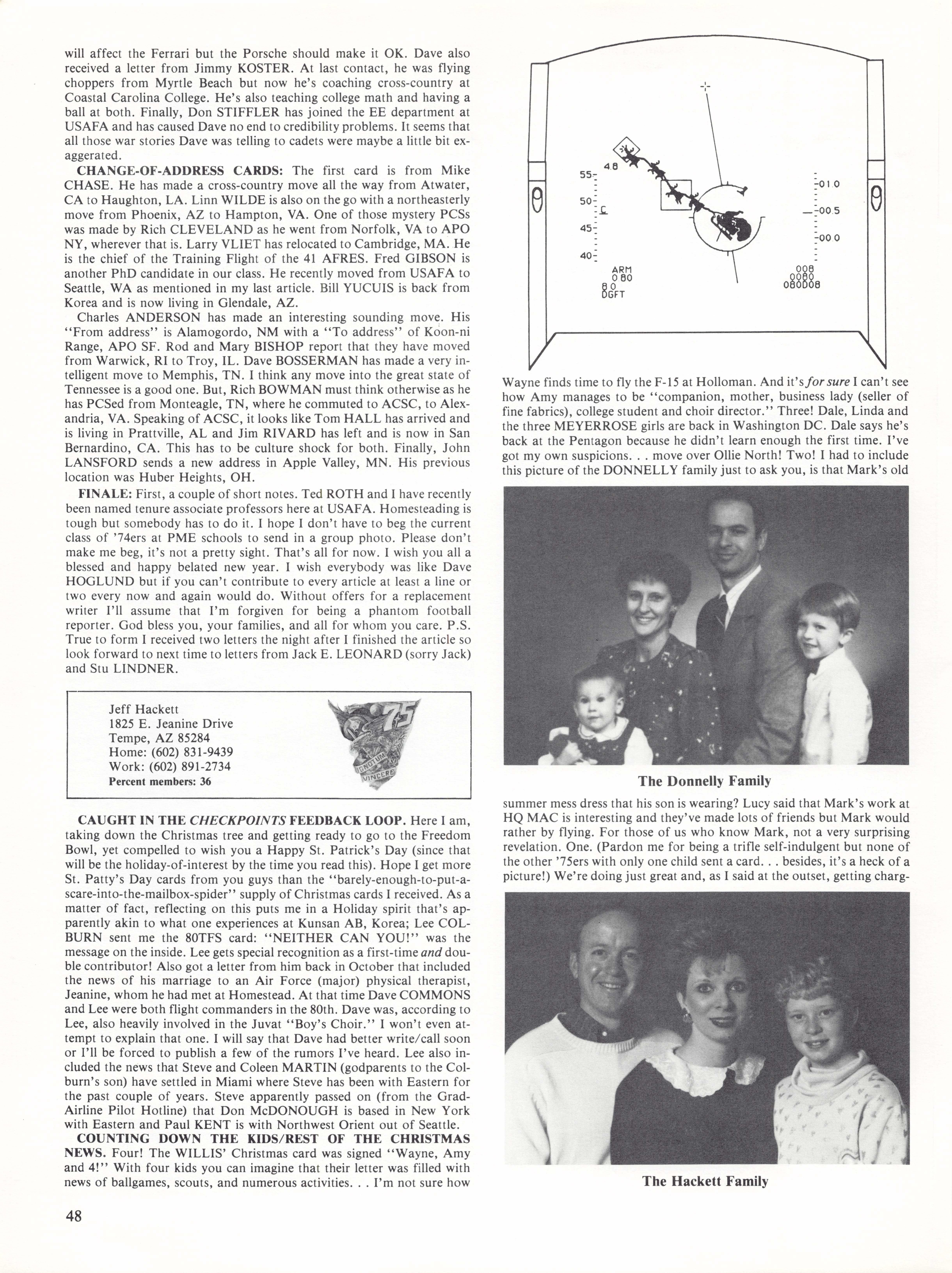 Hi Guys and Gals. Hope this article finds everyone in good spirits as another holiday season swiftly passes us by. Julie and 1luckily got afew days off from RTU to head back home—nothing like being home for the holidays. 1am currently halfway through RF-4 training at Bergstrom and will soon be one of the newest professional photographers in the Air Force. Actually it’s quite akick in the seat to fly so fast and so low—sorta contradicts what we’ve been taught these last few years. Hopefully Julie and 1will be heading east soon to the safe confines of Shaw AFB in South Carolina, but if not we’ll be headed for Germany sometime in the spring. So if anyone stumbles into Austin before April, please give us acall. We’ve got plenty of room and time.