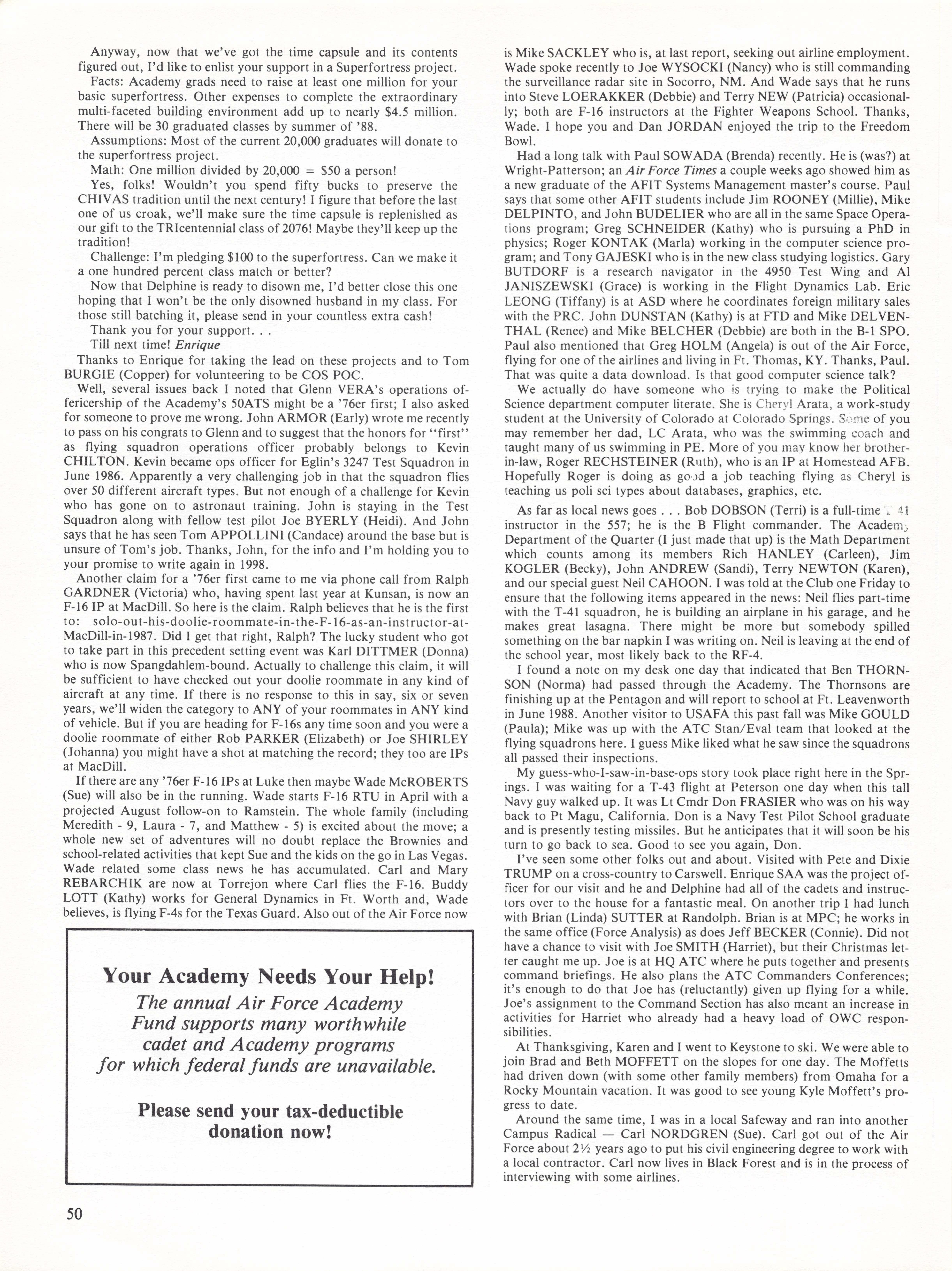 “So, what am Iasking you to do? Donate some money, of course. Now, before you say no and skip to the next letter, listen to this. The Ad¬ visory Committee, made up of retired Air Force leaders. General Scott, and several well-known corporate leaders, met to discuss the fund-raising campaign. The outcome of the meeting was simple: if all USAFA grads could come up with at least SI million, the remainder of the project could be financed. 1am committing myself to at least a$25.00 gift and hope everyone else will be able to make adonation as well.