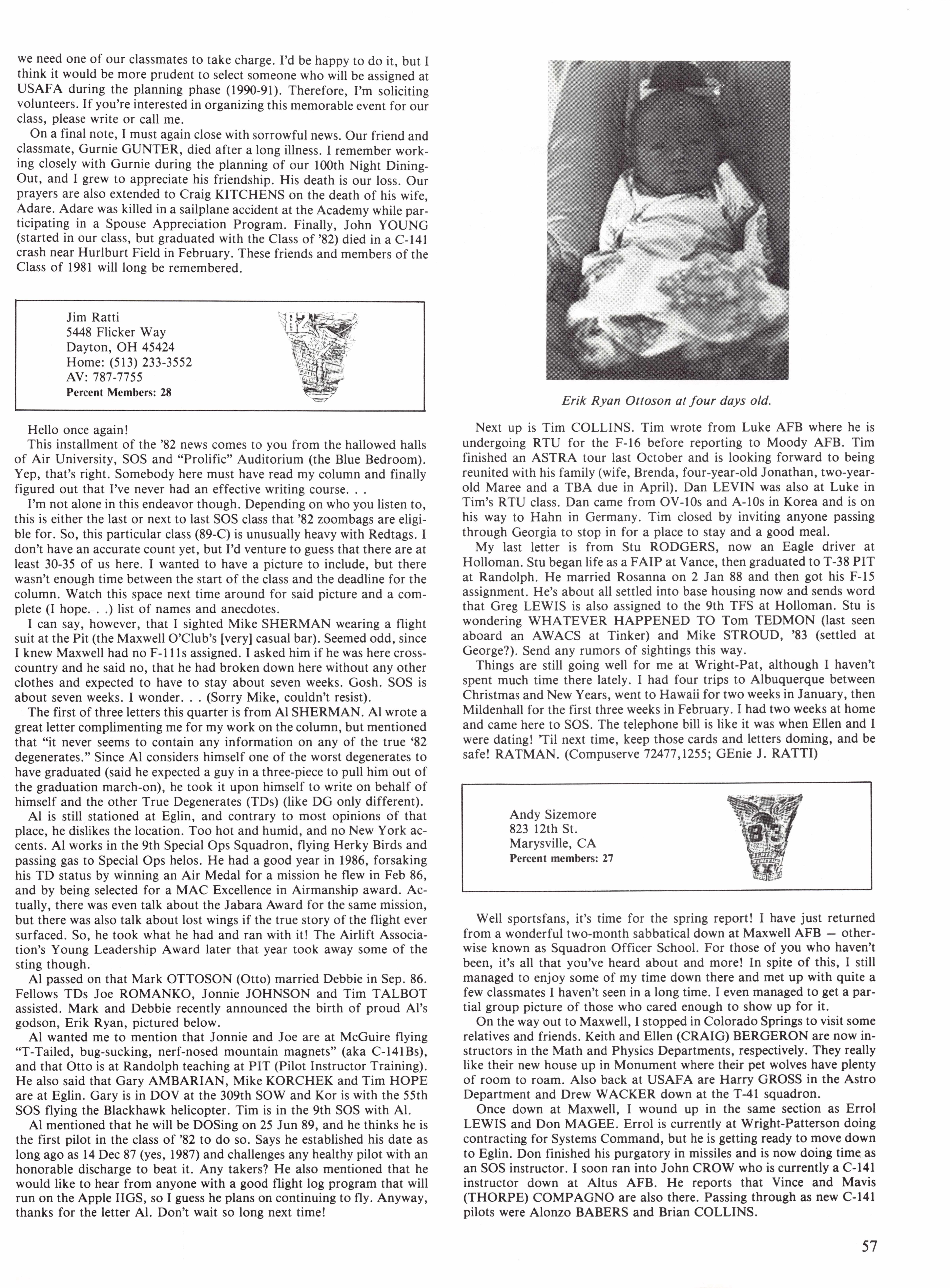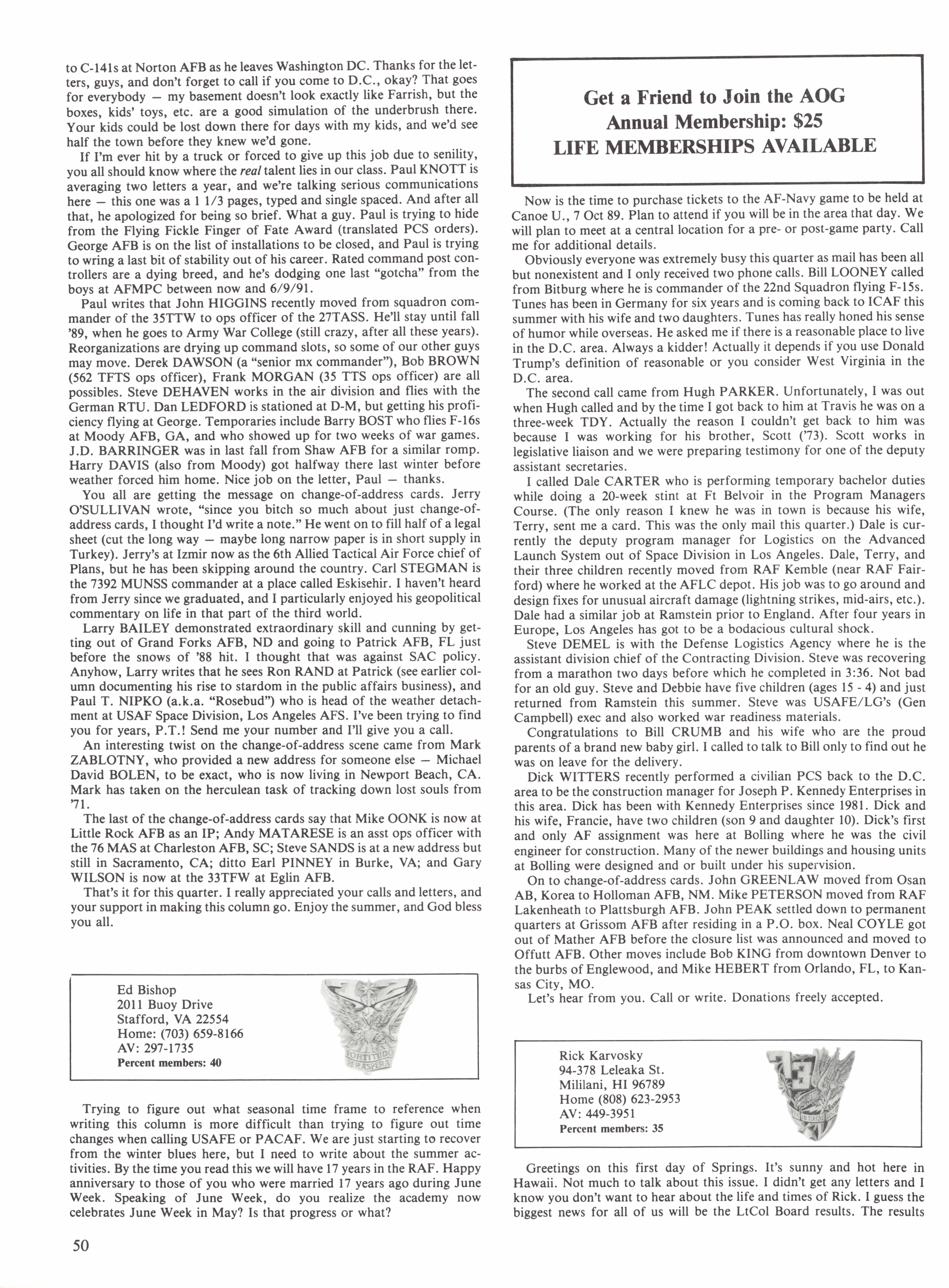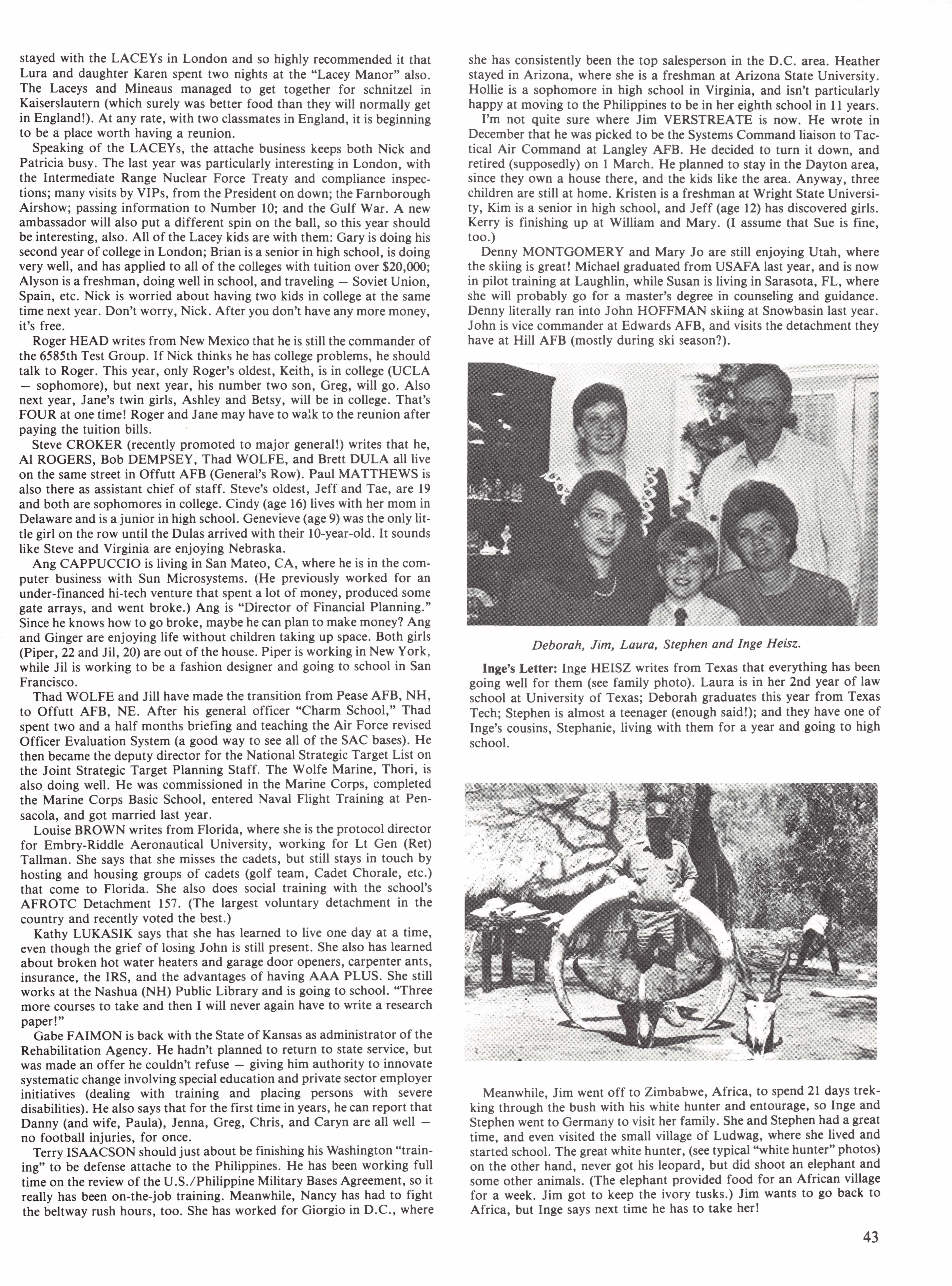 Ireceived only one letter this period from Steve LATCHFORD. He says, “Greetings from Offutt AFB. I’m an EW on RC-135s here. Iwork with Kevin CARLSON, Mike SCHETTERER, Tony HUTFLES, and Linda WITTMAN. On one flight Iran into Chris NOWAK (KC-135s, McConnell) at about 30,000 ft. on an air refueling track. His wife, Lisa, and my wife, Christina, are both due in September. 1saw Lance NITSCHKE (B-52s, Mather) at Steve SHEEHY’s wedding in Canon City, CO. Steve is amaintenance officer at Laughlin. He and Theresa are ex¬ pecting their first any time now and will soon be moving to Randolph. In Kadena Isaw Clay and Trish WISNIEWSKI (E-15s) and tfieir three children; Kyle and Jill LAMPELLA (C-12s) with one on the way; and Marty LOUTHAN (C-141s, now T-41s, USAFA) who was ferrying cadets