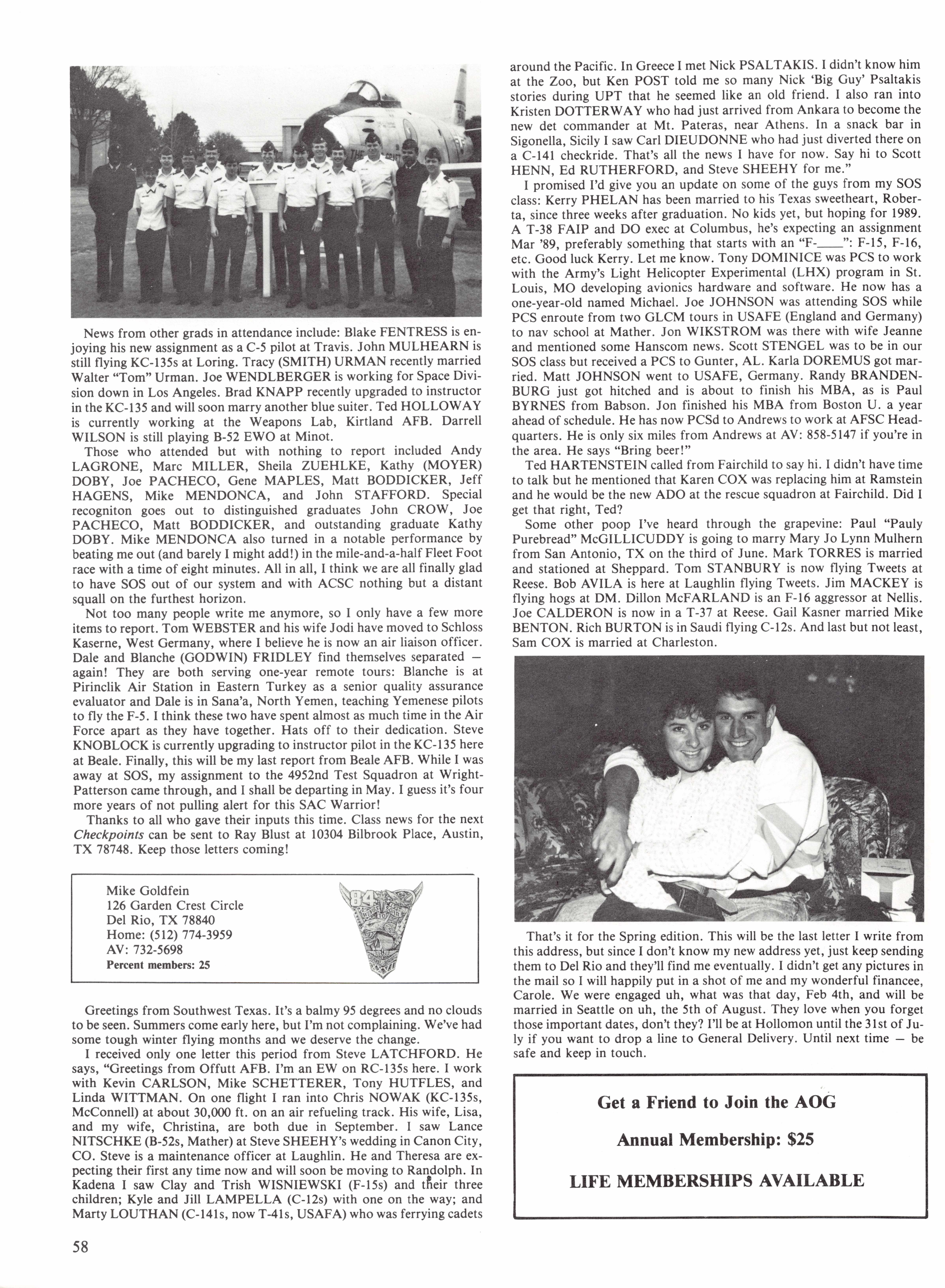 around the Pacific. In Greece Imet Nick PSALTAKIS. Ididn’t know him at the Zoo, but Ken POST told me so many Nick ‘Big Guy’ Psaltakis stories during UPT that he seemed like an old friend. 1also ran into Kristen DOTTERWAY who had just arrived from Ankara to become the new det commander at Mt. Pateras, near Athens. In asnack bar in Sigonella, Sicily 1saw Carl DIEUDONNE who had just diverted there on aC-141 checkride. That’s all the news Ihave for now. Say hi to Scott HENN, Ed RUTHERFORD, and Steve SHEEHY for me.”