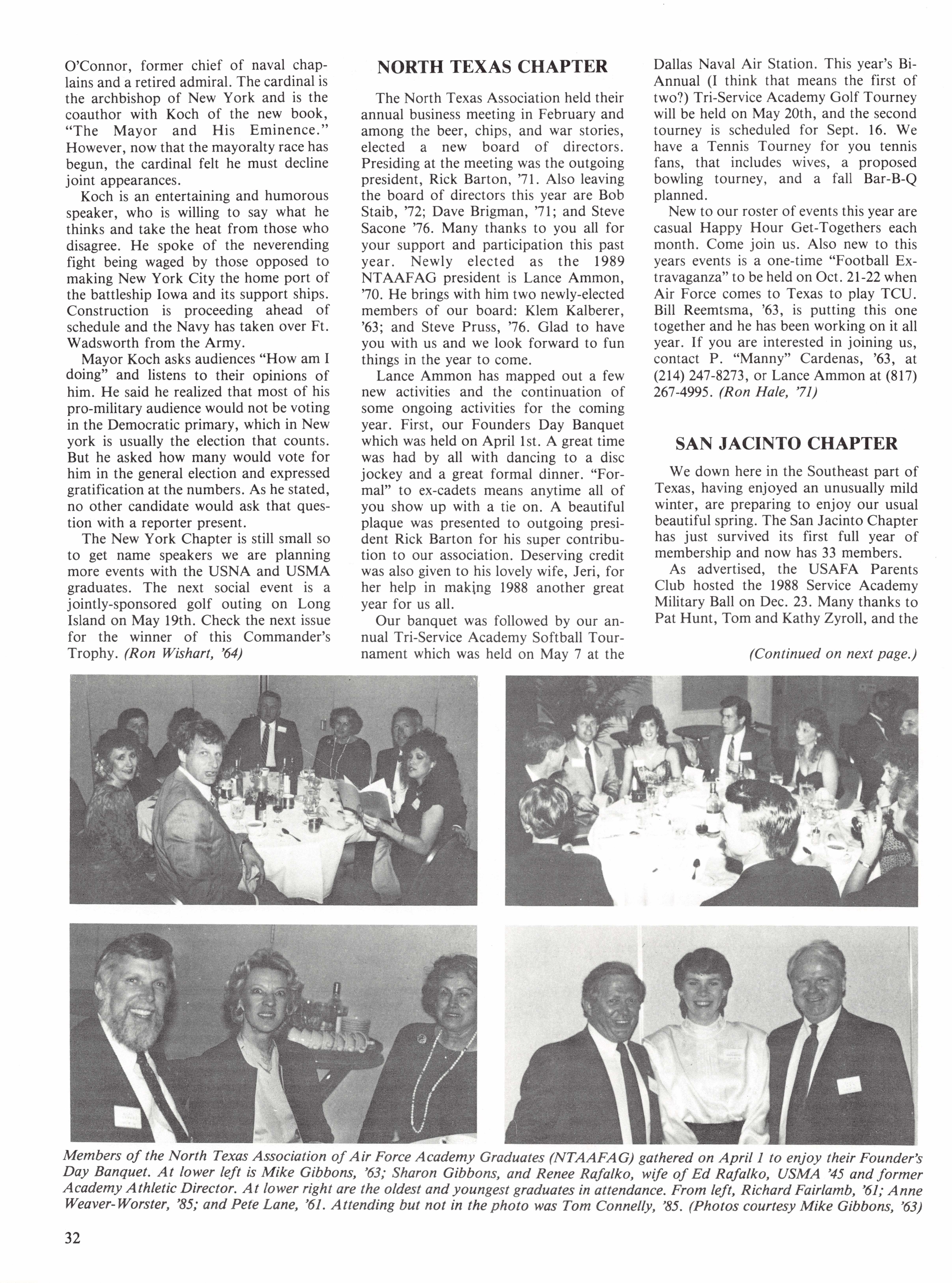 One more thing —Party !The North Texas Association of Air Force Academy Graduates is planning ahuge weekend blowout in conjunction with the Oct. 21 USAFA -Texas Christian football game. The deal includes hotel accommodations, parties, food, transportation, and game tickets. Details are provided elsewhere in this issue. We would like to endorse the work of this fi ne organization. We both took part in the post-Bluebonnet Bowl -New Year’s party they hosted in Houston on Dec. 31, 1985 -Jan. 1, 1986. It was agreat event, and the North Texas Chapter believes this will be even better than that. They would like it to be the largest graduate get-together other than Homecoming. See you there!