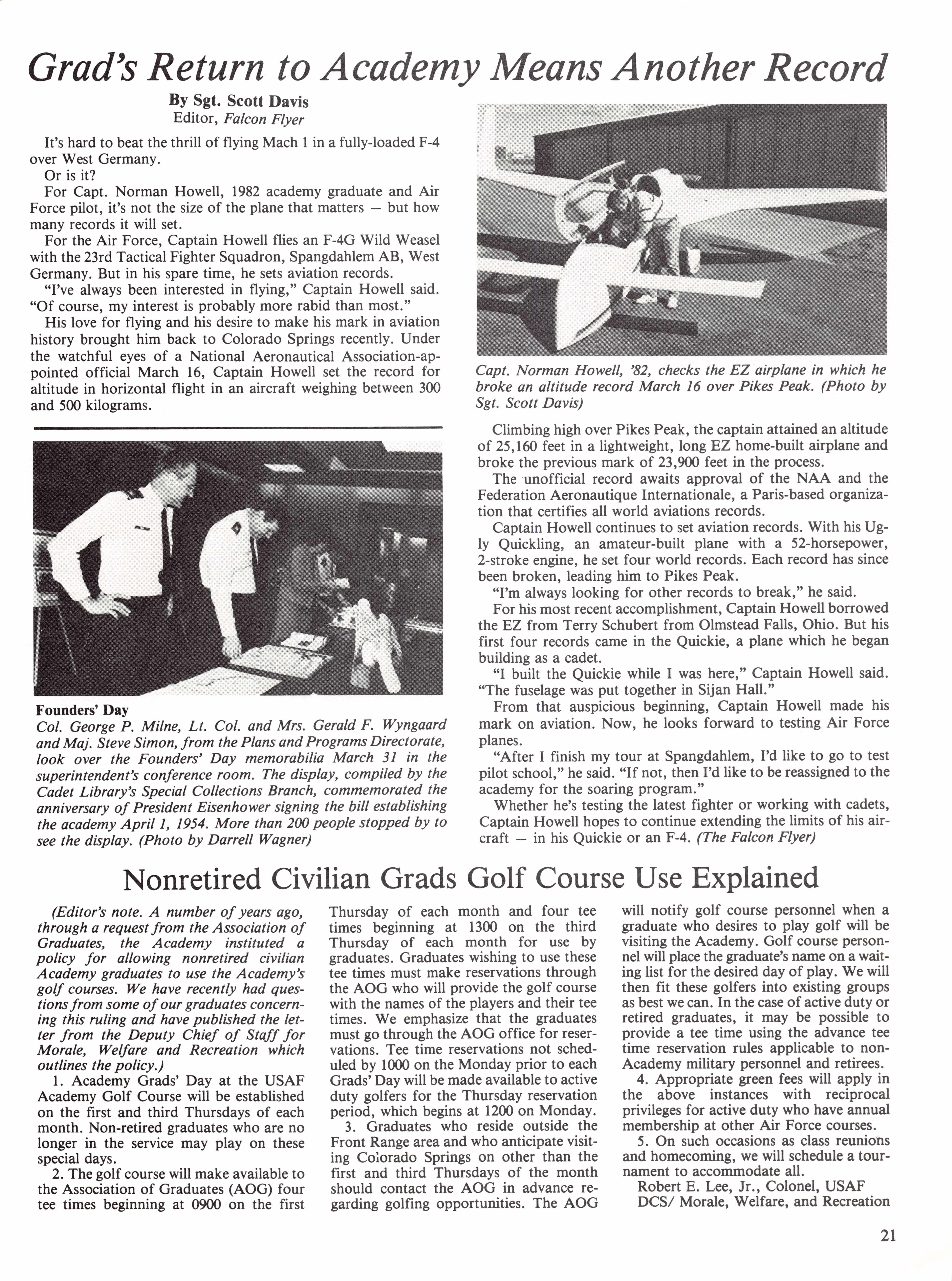 In honor of the 35th anniversary of USAFA’s founding, the Academy presented asmall Founders Day display in the Superintendent’s Conference Room. The display, to com¬ memorate President Eisenhower’s April 1, 1954 signing of the Ex¬ ecutive Order approving the Air Force Academy, included numerous historical artifacts. Included was the pen Eisenhower used to sign the Executive Order, original engineering drawings of the Academy (which look nothing like the final product), and a number of photographs of the early days. In the future, we hope to make Founders Day amuch more active and popular event, not just at the Academy, but throughout the Air Force and the AOG Chapters. (See Founders Day photo on Page 21.)
