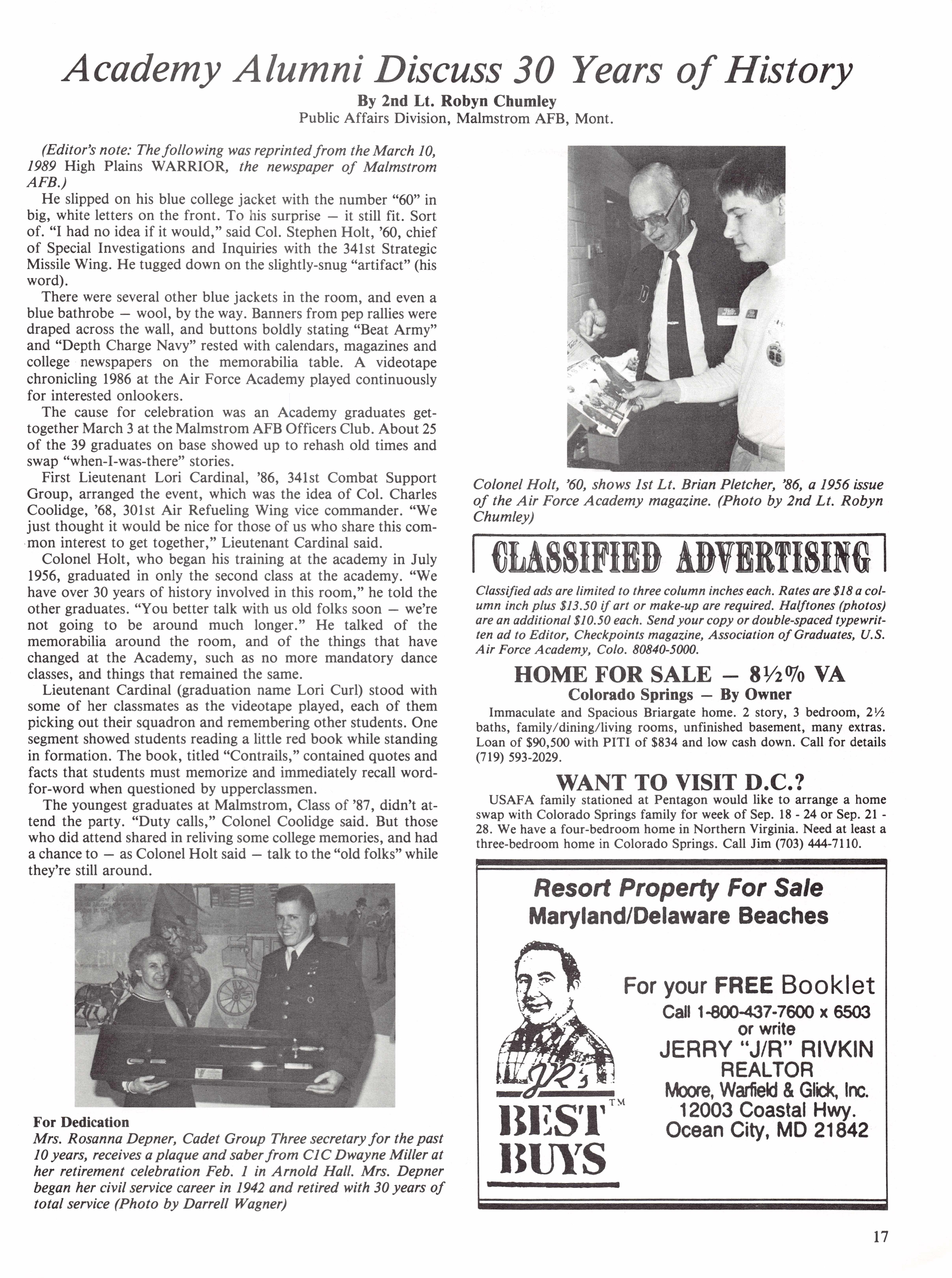 Serve Until 30 June 1989 JFGlaza ’60 MPBlaisdell ’62 JLCoates ’63 DLDeBerry ’63 BABlackman ’65 JESpittler Jr ’65 (Vice-Chairman) BGDunn ’66 JEScho fi eld ’67 CJYoos II ’68 (Secretary) RBManning ’71 WERichardson ’71 JRHogue ’76 WRKnellinger ’76 AJAretz ’80 HLEmrick Svetz ’80 To Serve Until 30 June 1991 AWBiancur ’60 WFKendall Jr ’60 WEAylsworth ’61 MJQuinlan ’61 JFWheeler ’64 SSDuncan ’65 MATorreano ’68 GDPollard ’72 ALPlotter ’75 JBEchols ’76 DMSnyder ’78 KWBarker ’79 KAYost ’80 MPPowell ’85 JTWolter ’75 To Serve Until 1June 1989 EAGanze ’88 27 33 37 DEPARTMENTS PAGE Academy Alumni Alert Graduate Book Review/AOG Fund-raiser Sought Waldo Dumbsquat/The Blue Zoo Classified Advertising Building Fund Update Falcon Sports Chapter News Gone But Not Forgotten Class News 5 11 13 17 19 28 31 34 38
