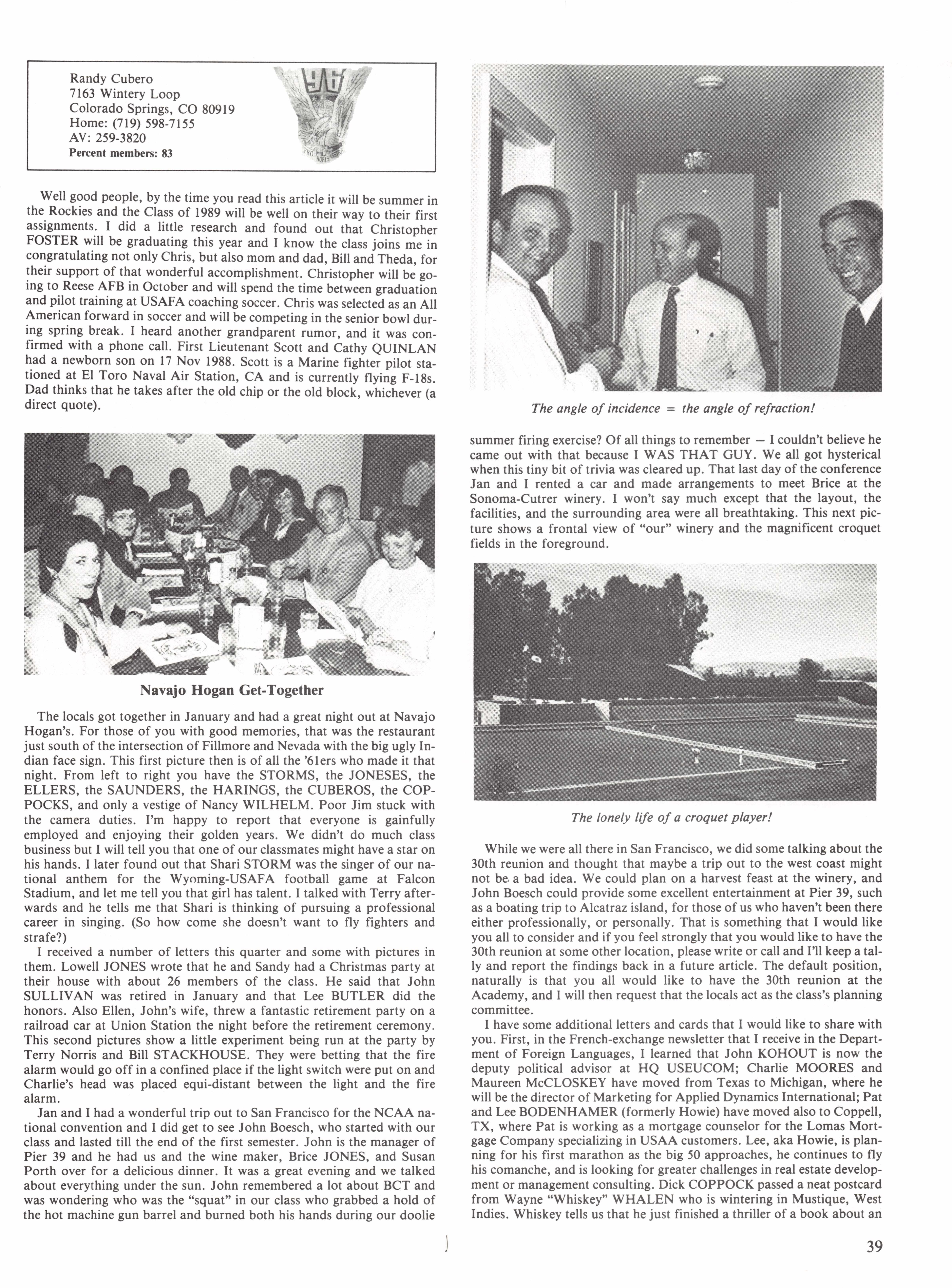 Greetings compadres! Spring has flown by with quite alot happening. 1 completed F-111 RTU the end of March with Mike PANARISI and am now stationed at RAF Lakenheath so when you write, note the new ad¬ dress. Getting right into the news, 1ran into Scott McCLEAN on aRed Flag deployment from Lakenheath while at Cannon AFB. Scott is enjoy¬ ing his assignment as aWSO in the F-11 IF but admits the sunshine was a nice break from England’s normally overcast weather. 1also talked to Dave TUCK out at the west campus of the Academy (Williams AFB). He says all is well. He states Pete DAVEY is now married and Dave TUBB is soon to be. Also Pete YORK has been married about ayear to Nancy, a native of Serria Vista, AZ. Keith KUDLA is now going through UPT at Willy after completing grad school at Harvard and Frank ROSSI is now flying the best fighter in TAC/USAFE, the F-111 Gust abit of personal bias, sorry). There are finally acouple of photos for our column (more needed). One is John and Janet AUGUSTlNE’s wedding Ireceived from Mark MEDVEC and the other is my own wedding.