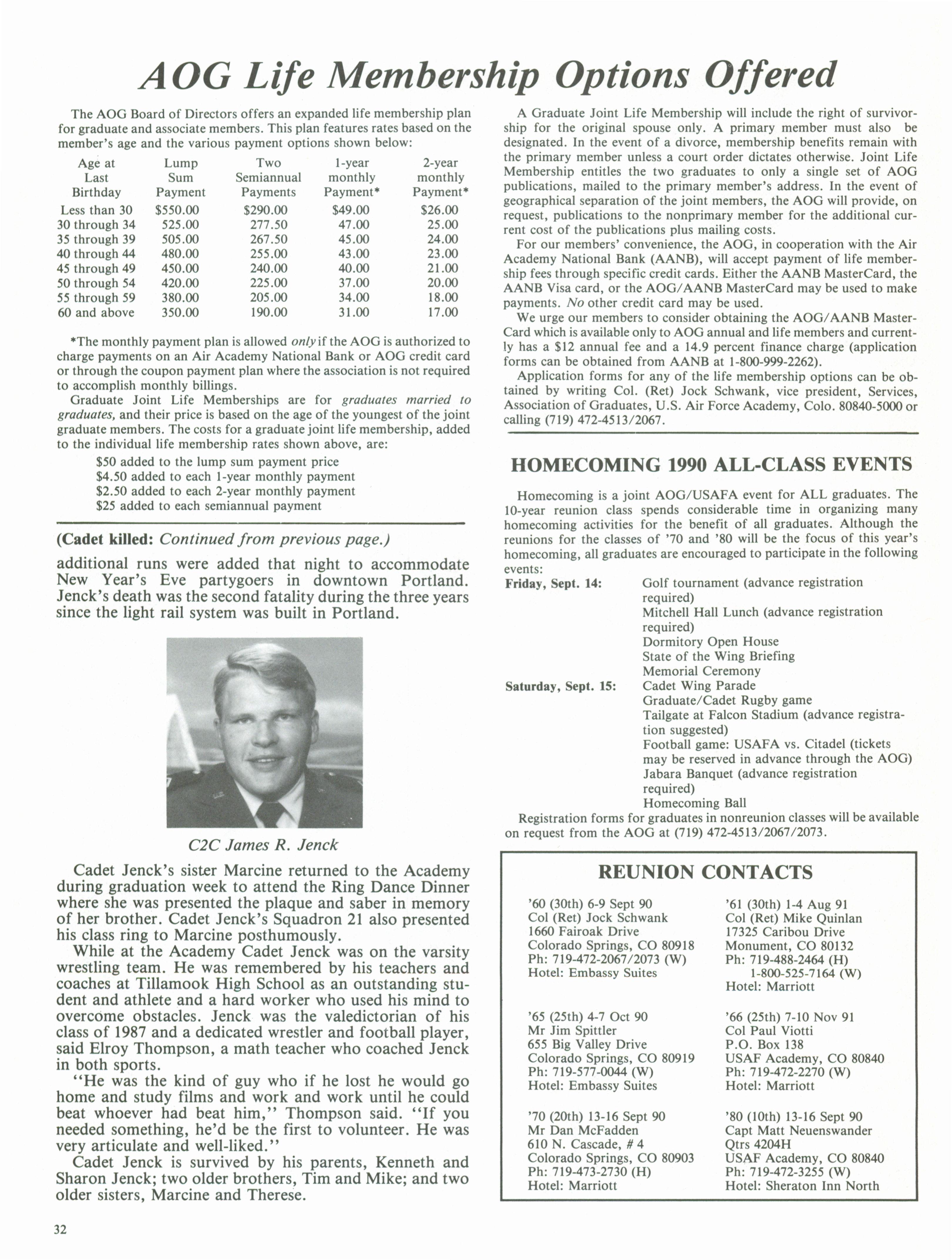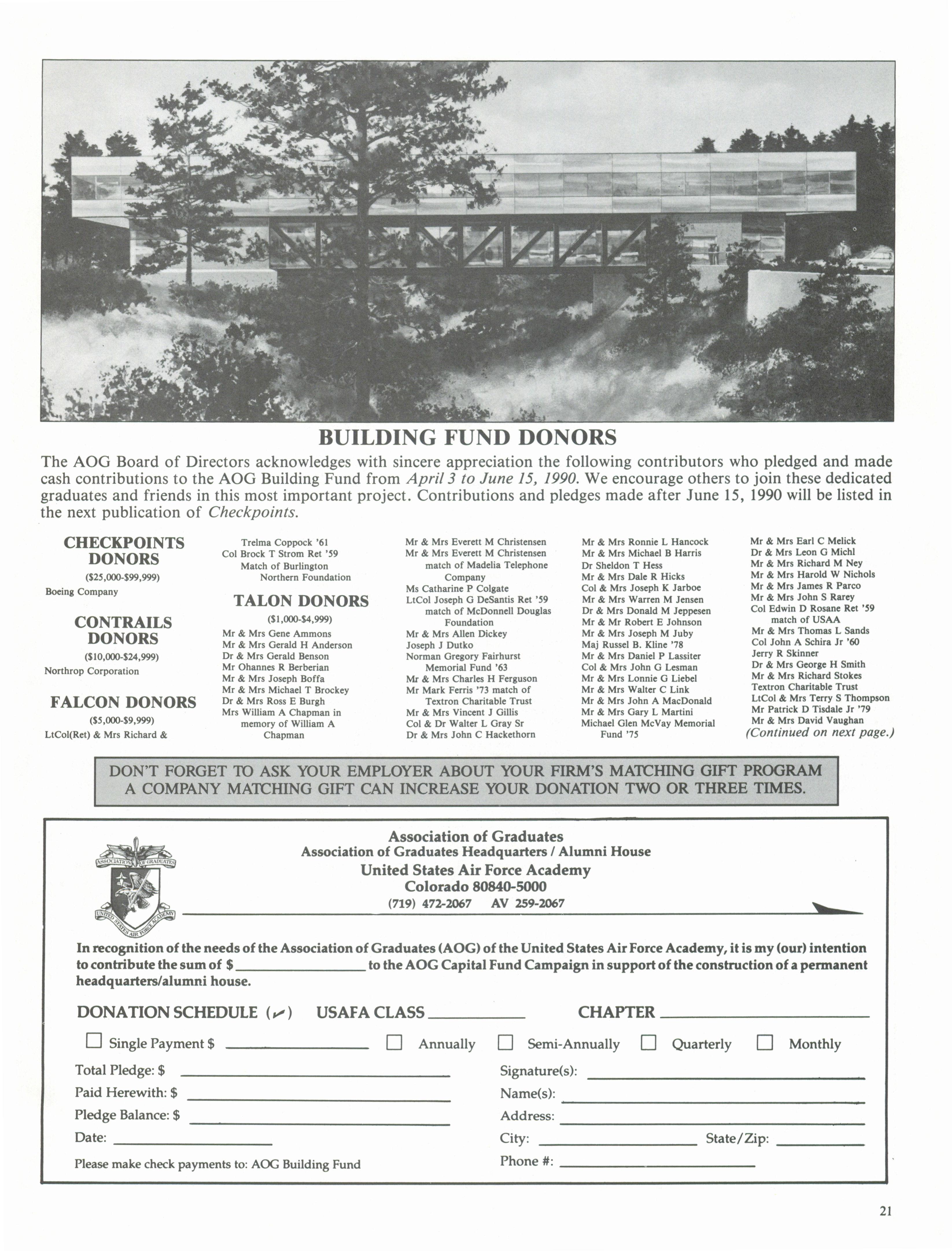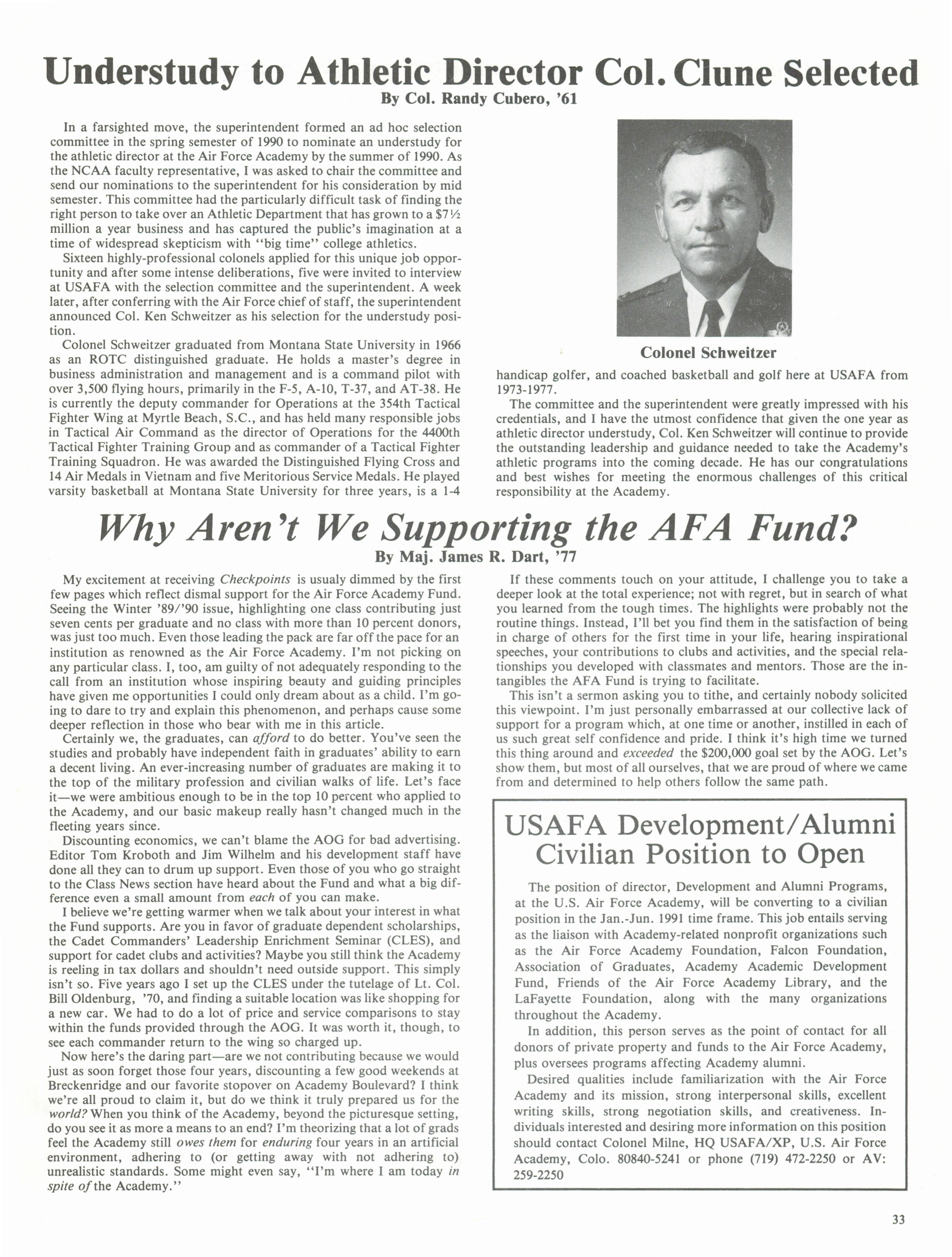 of Graduates, USAF Academy, Colo. 80840-5000 (Phone: 719-472-2067). It is provided as part of an annual membership package which costs $25. Second-class postage paid at the USAF Academy, Colo. Opinions expressed in this magazine are those of the authors. They do not necessarily reflect the opinions, policy or attitude of the Association of Graduates, its officers or the editorial staff. The appearance of advertisements in this publication does not constitute an endorsement by the Association of Graduates of the products or services advertised. Copyright, Association of Graduates of the United States Air Force Academy, Summer 1990. POSTMASTER: Send Form 3579 to Checkpoints, Association of Graduates, USAF Academy, Colo. 80840-5000.