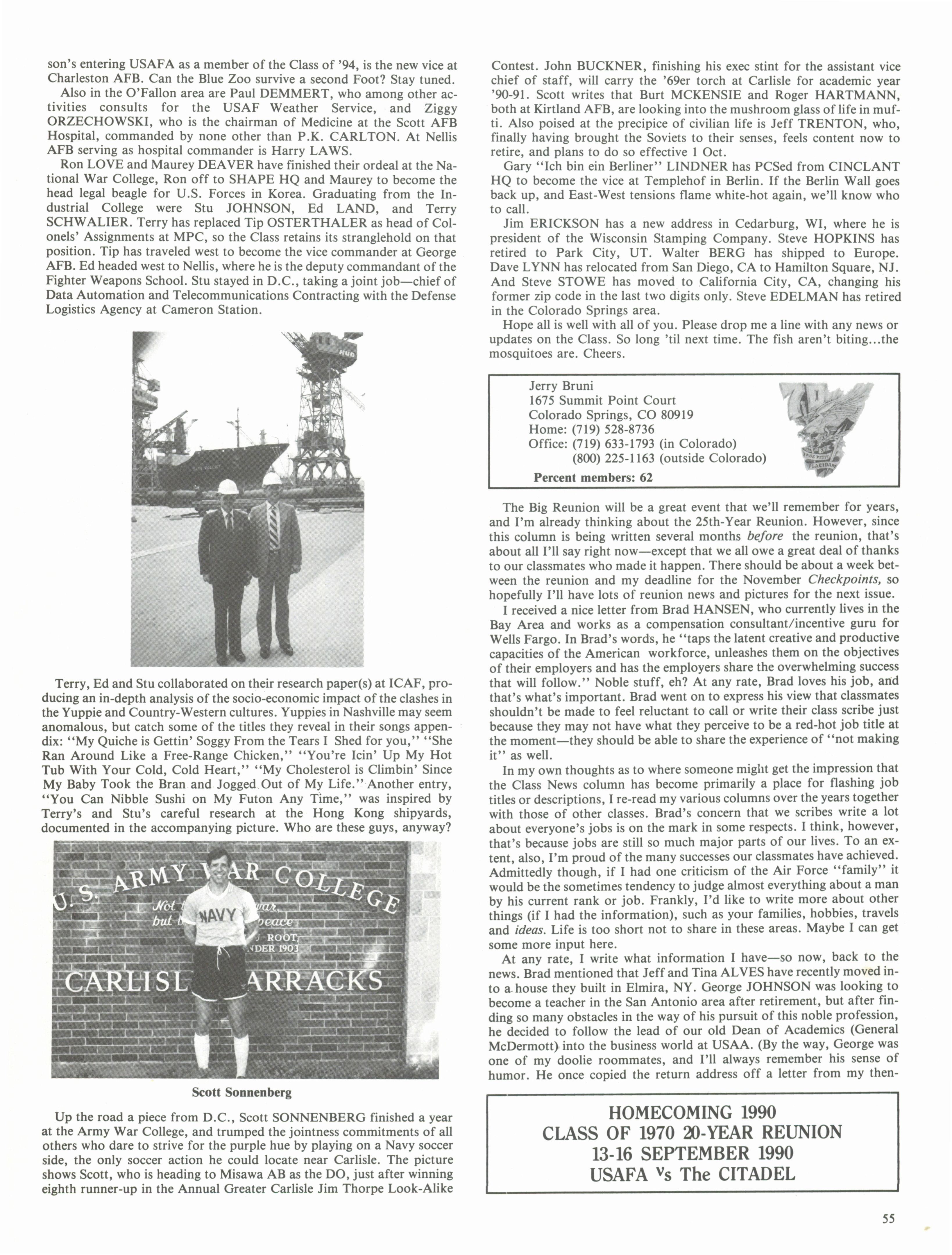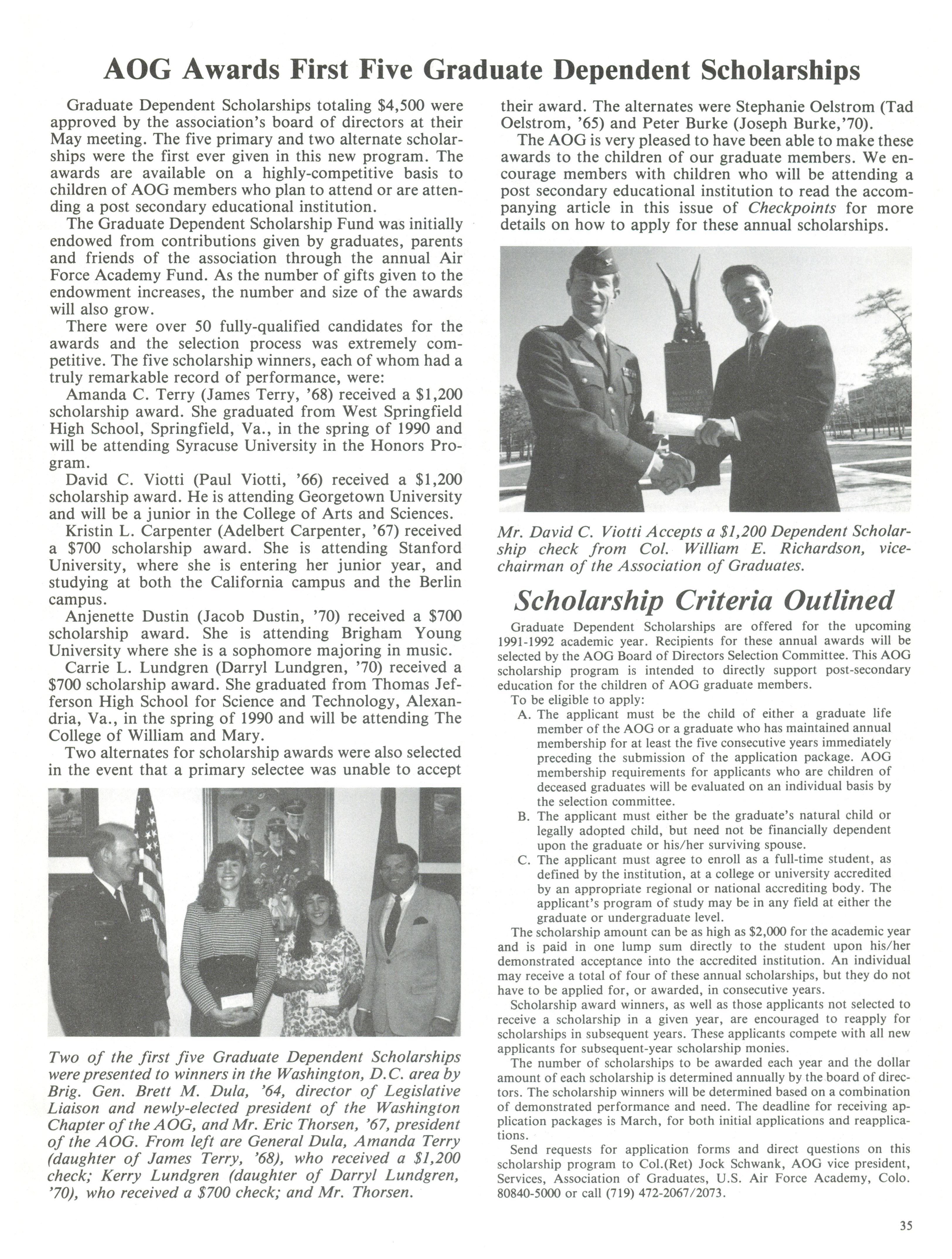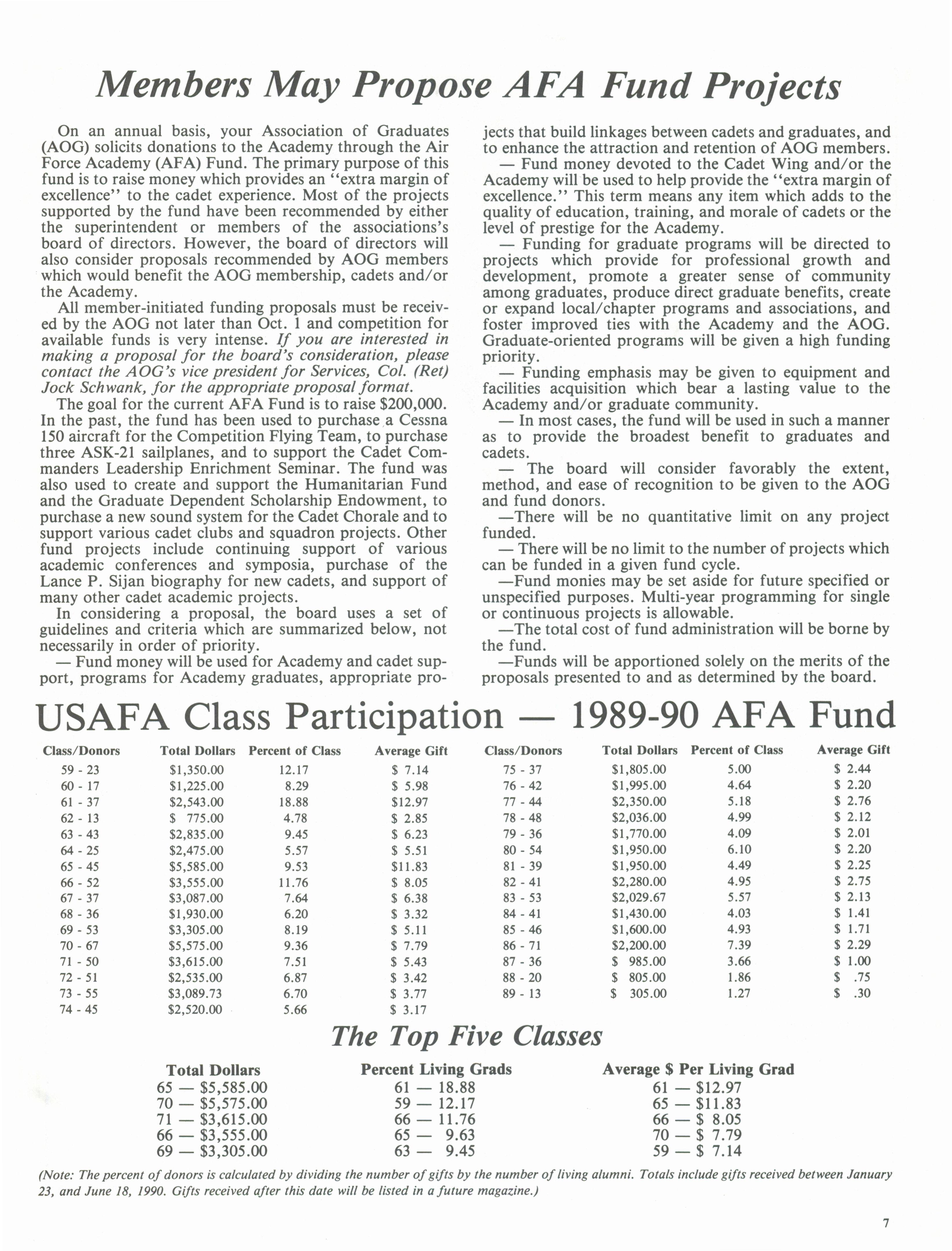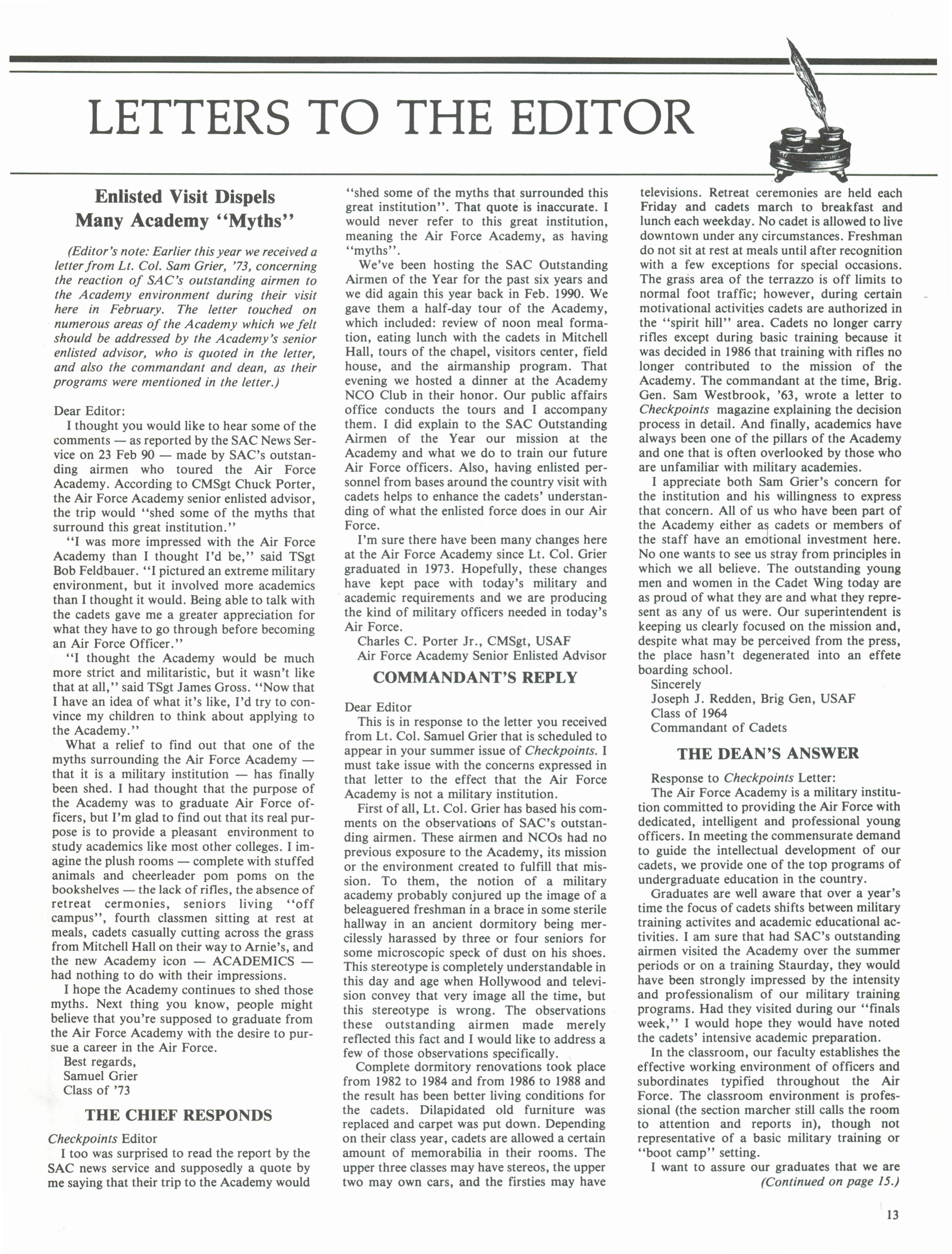 of Graduates, USAF Academy, Colo. 80840-5000 (Phone: 719-472-2067). It is provided as part of an annual membership package which costs $25. Second-class postage paid at the USAF Academy, Colo. Opinions expressed in this magazine are those of the authors. They do not necessarily reflect the opinions, policy or attitude of the Association of Graduates, its officers or the editorial staff. The appearance of advertisements in this publication does not constitute an endorsement by the Association of Graduates of the products or services advertised. Copyright, Association of Graduates of the United States Air Force Academy, Summer 1990. POSTMASTER: Send Form 3579 to Checkpoints, Association of Graduates, USAF Academy, Colo. 80840-5000.