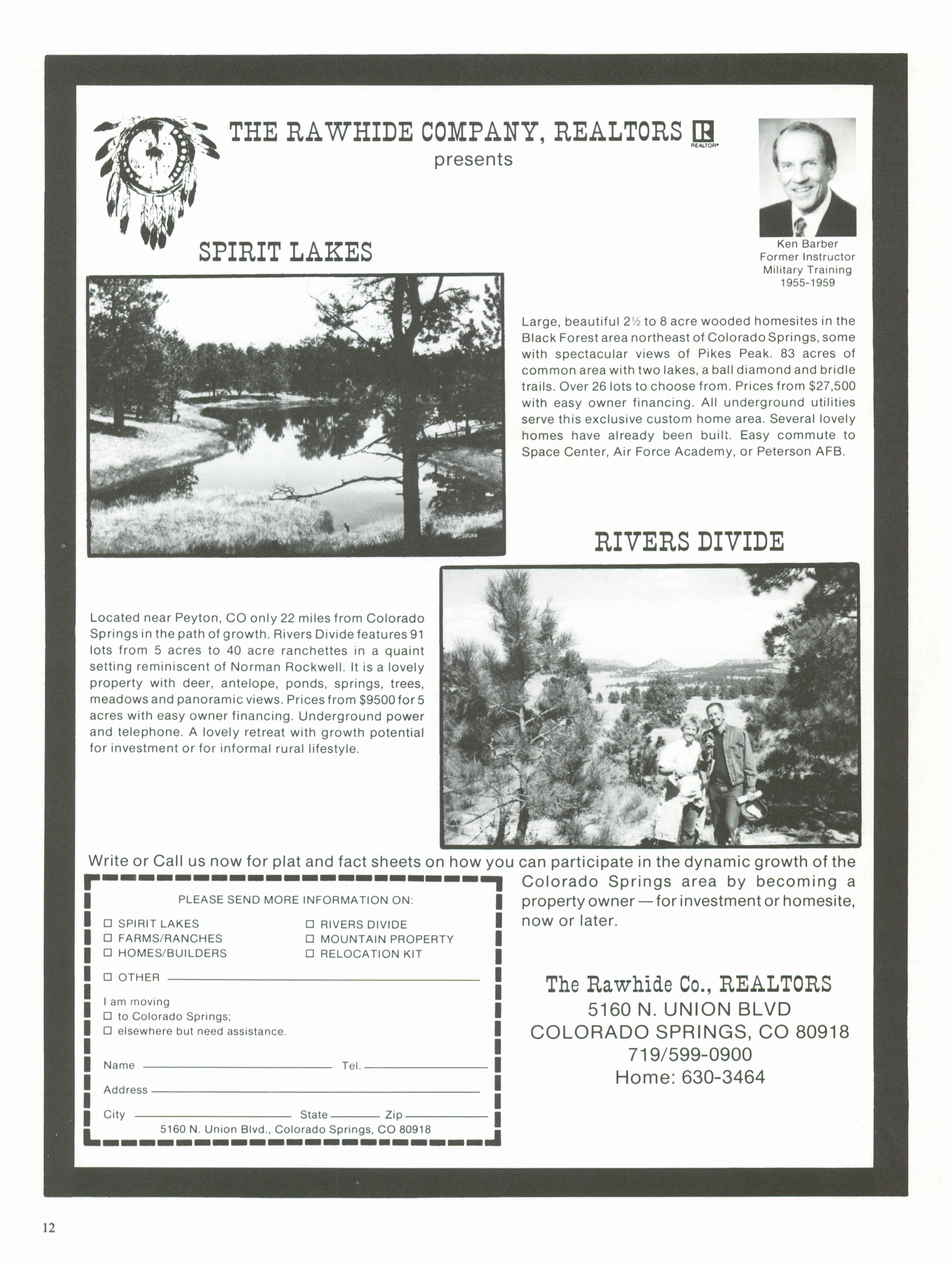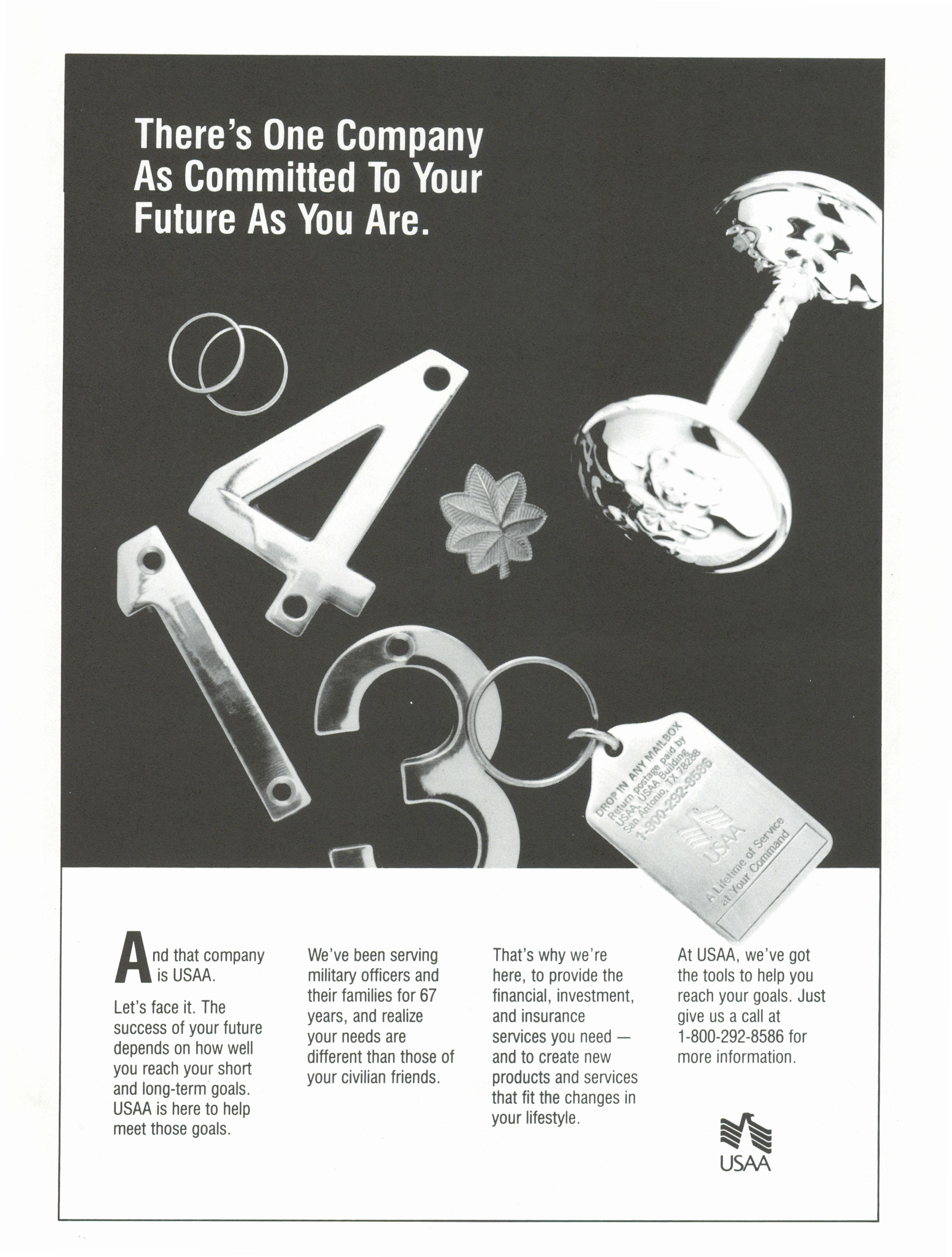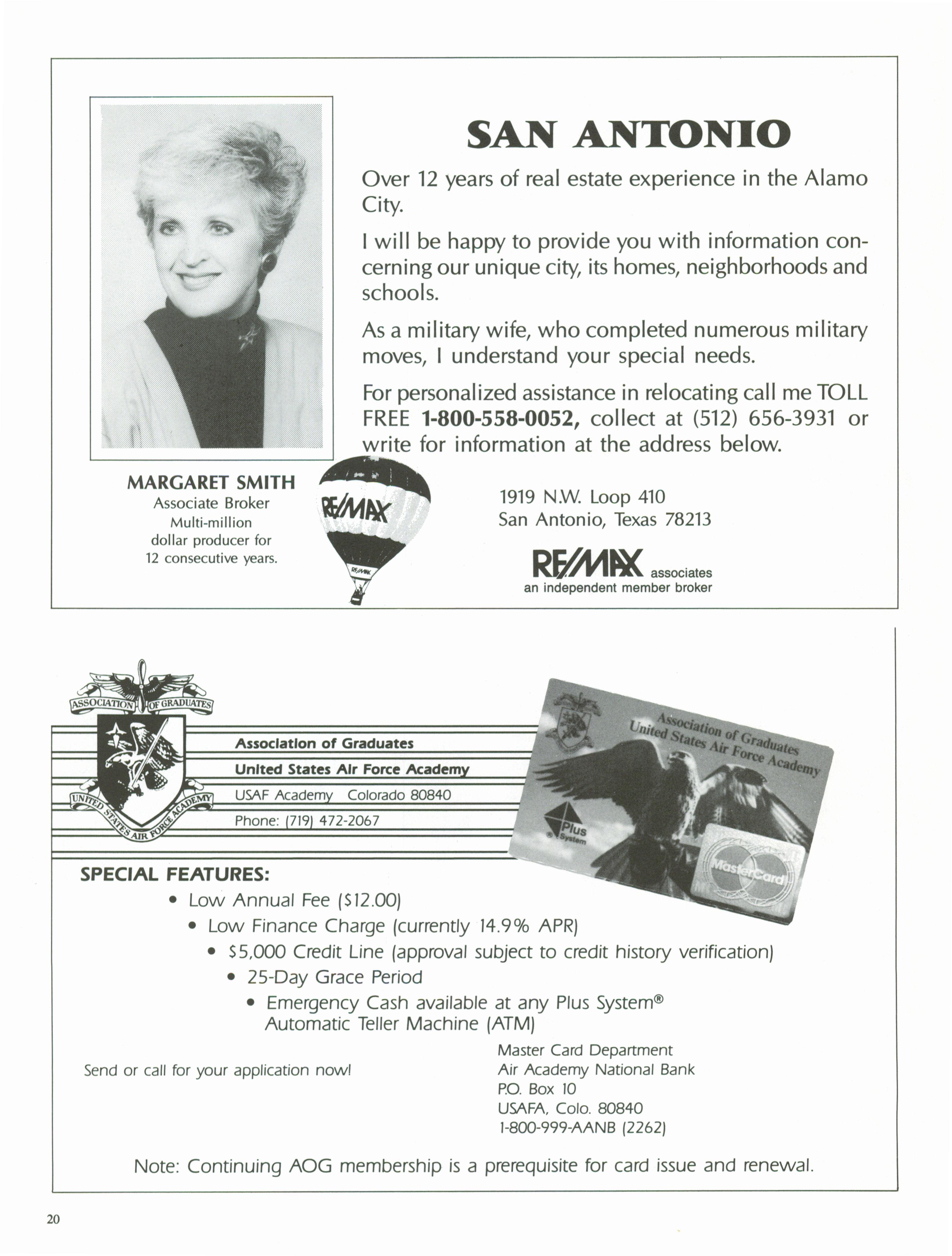 Name Grad Year Address City State Zip Phone _J ) Select Style & Metal Color: White Gold Tie Tack/Lapel Pin Q Yellow Gold □ Charm & Necklace □ Lustrium (silver color) Qty. Item Description $ Each Subtotal 14K Gold with 3ot. Diamond 185 14K Gold with Cubic Zirconium 150 14K Gold with Birthstone' 150 14K Gold Plain 130 10K Gold with 3Dt. Diamond 145 10K Gold with Cubic Zirconium 110 10K Gold with Birthstone' 110 10K Gold Plain 85 Lustrium with 3pt. Diamond 120 Lustrium with Cubic Zirconium 85 Lustrium with Birthstone' 85 Lustrium Plain 65 Birthstone choice Total (shipping md.)! 'Synthetic Birthstones - Garnet, Amethyst, Aquamarine, White Spinel, Shamrock Spinel, Alexandrite, Ruby, Peridot, Fire Blue Spinel, Rose Zircon, Golden Topaz or Blue Zircon. Please enclose your check or money order payable to Gary Autrey. Allow six weeks for delivery. Cash and Credit Cards cannot be accepted. Autrey/Jostens Prop & Wings Offer 6100 E. 39th Ave. Denver, CO 80207 (303) 388-4151 For That Link ToYour Next Career ServingJunior Officers, Retirees & Others ACADEMY GRADUATES EXECUTIVE SEARCH, INC. 576 Post Road, Suite 210, Darien, CT 06820 Phone (203) 656-0404 Nathaniel A. Gallagher Colonel USAF, Ret., President NATIONAL BUSINESS & INDUSTRY COVERAGE Make an investment in your future. JOIN THE CREDIT UNION that serves AFA graduates worldwide. SERVICES OFFERED.... Share Draft Account (Checking-Eam Interest) Regular Share Accounts Individual Retirement Accounts Certificate Accounts Money Fund Share Accounts Loans for Every Need VISA Credit Cards Travelers Checks Money Orders Free Notary Public Service New & Used Car Book Prices Automatic Teller Machines VISA Debit Account Access Cards Air Academy Federal Credit Union 1355 Kelly Johnson Boulevard Colorado Springs, CO 80920 Phone 593-8600 Each member account insured to $100,000 by the National Credit Union Administration, a U.S. Government Agency. Membership Eligibility-Members of the Association of Graduates except those eligible for membership in another occupational-type credit union.