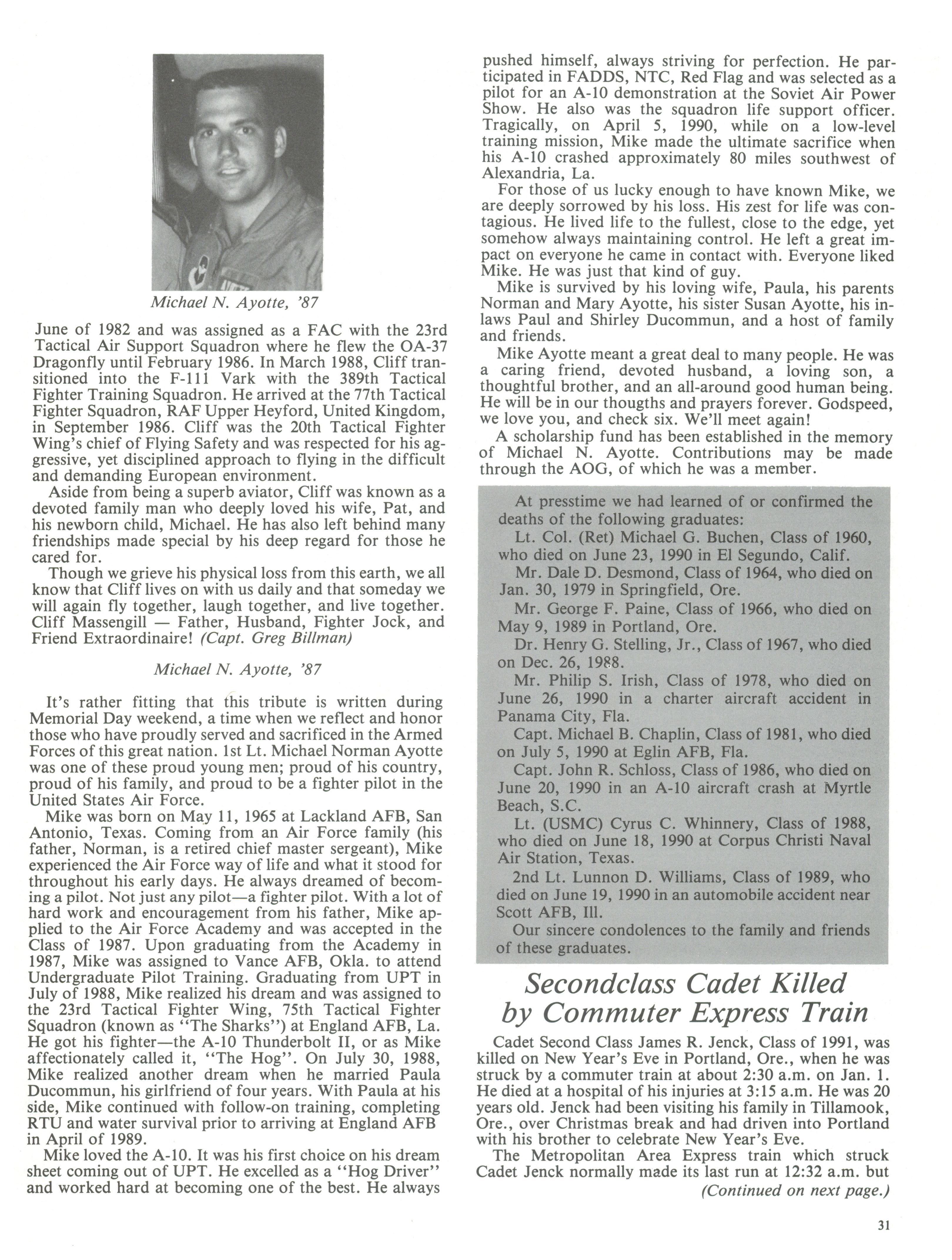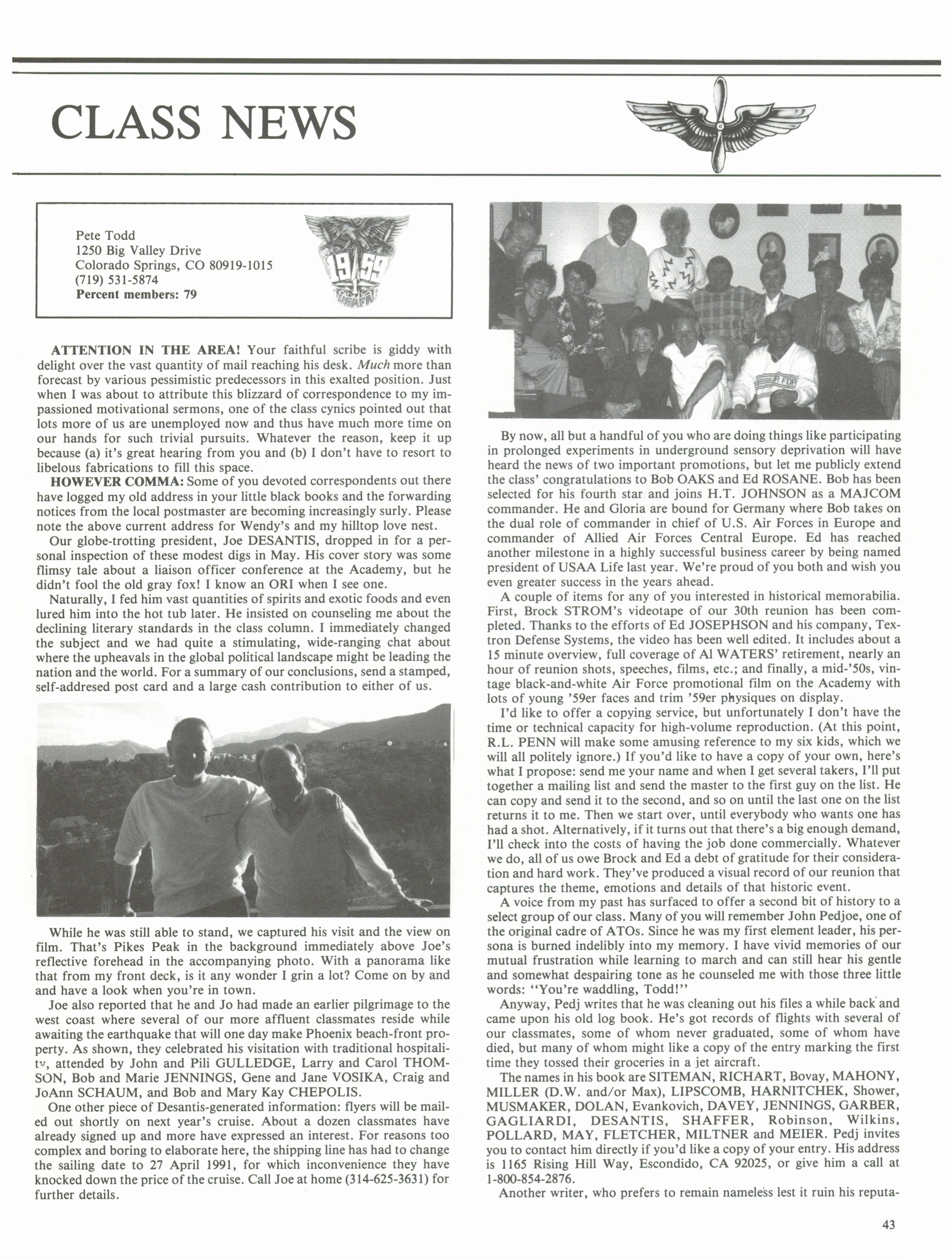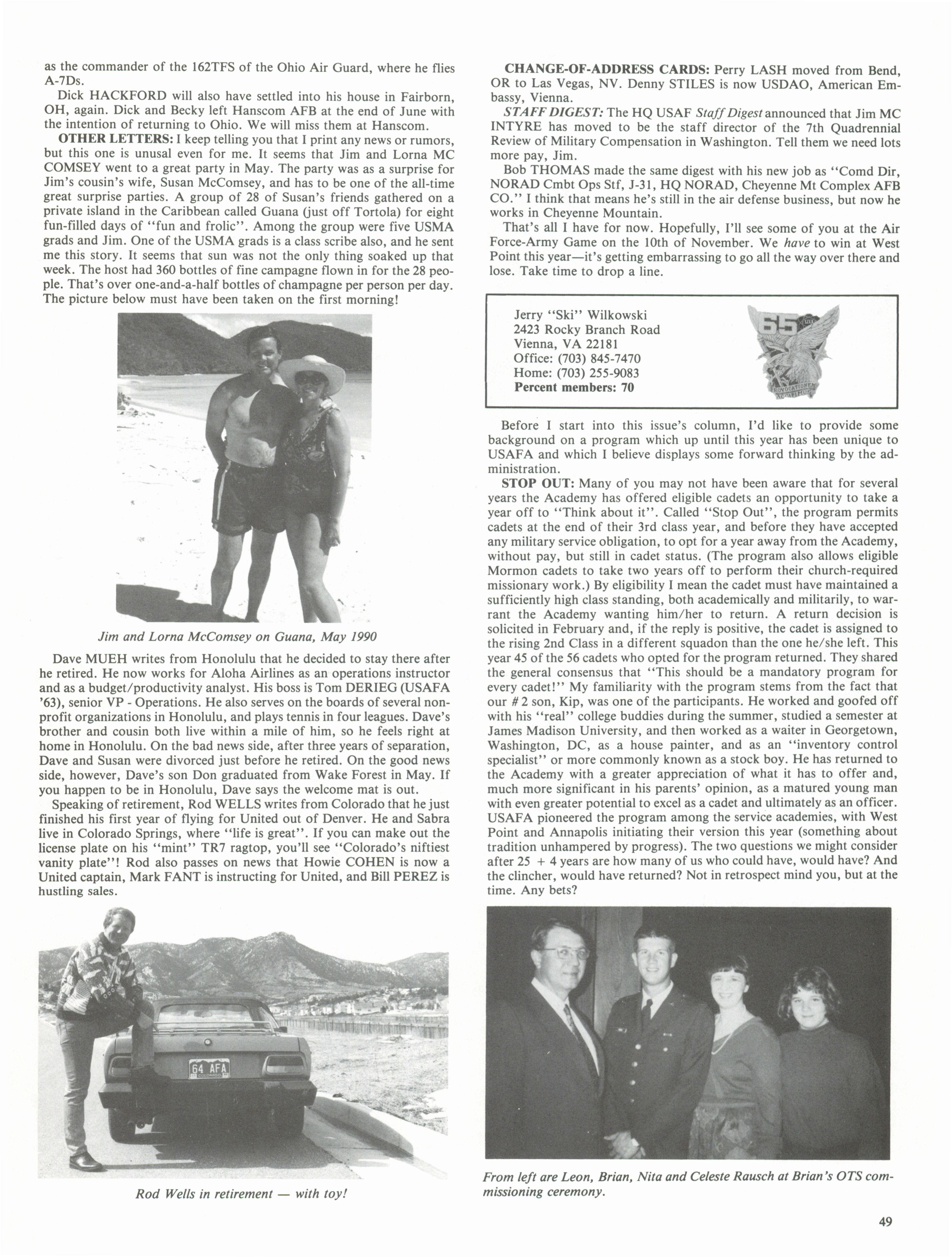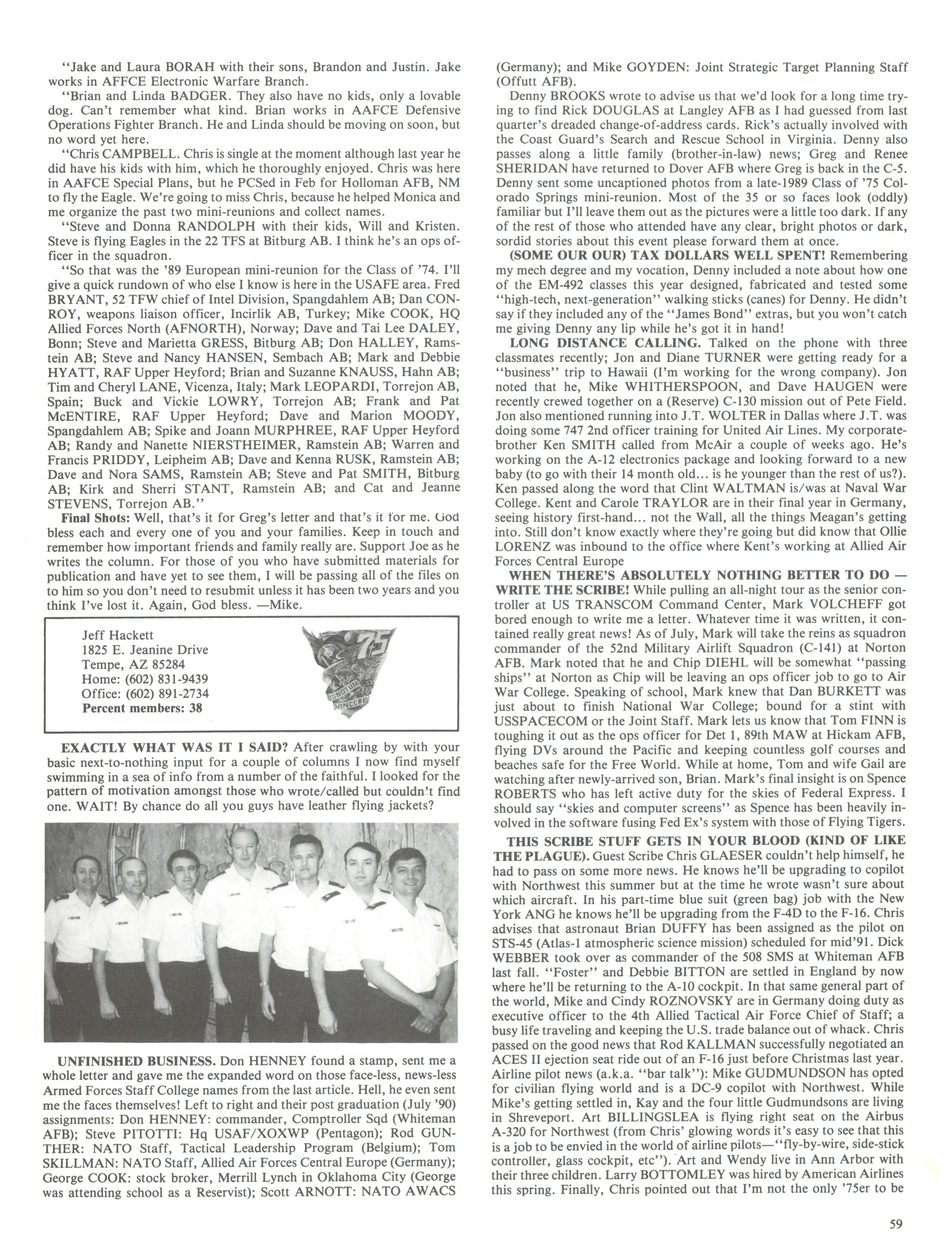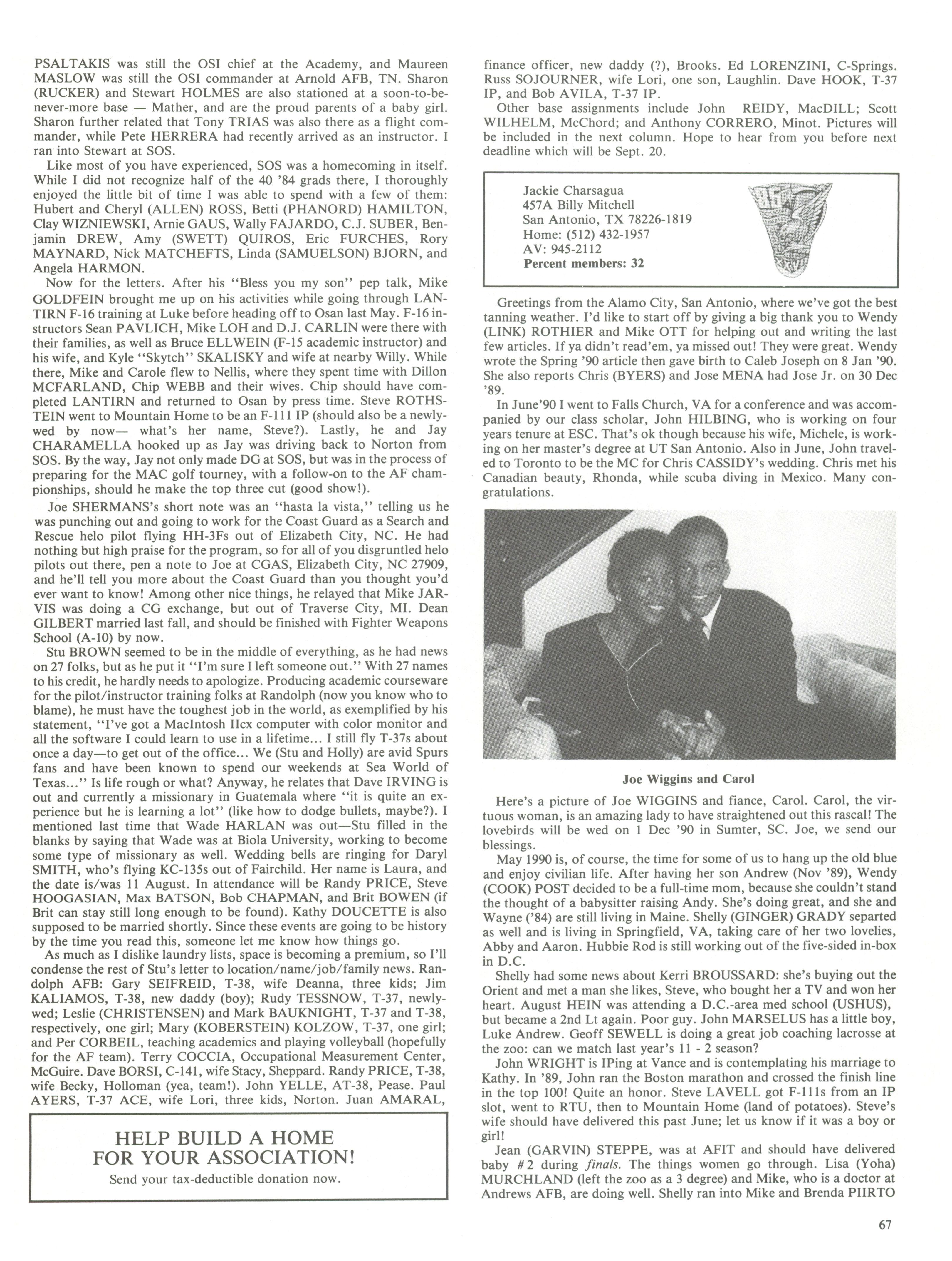 In closing, I would like to say that the class of 90-14 is doing fine. I know you all probably want details, but I will spare you this issue. I would like someone in each class at each pilot training base to PLEASE (Jabara: Continuedfrom page 11.)