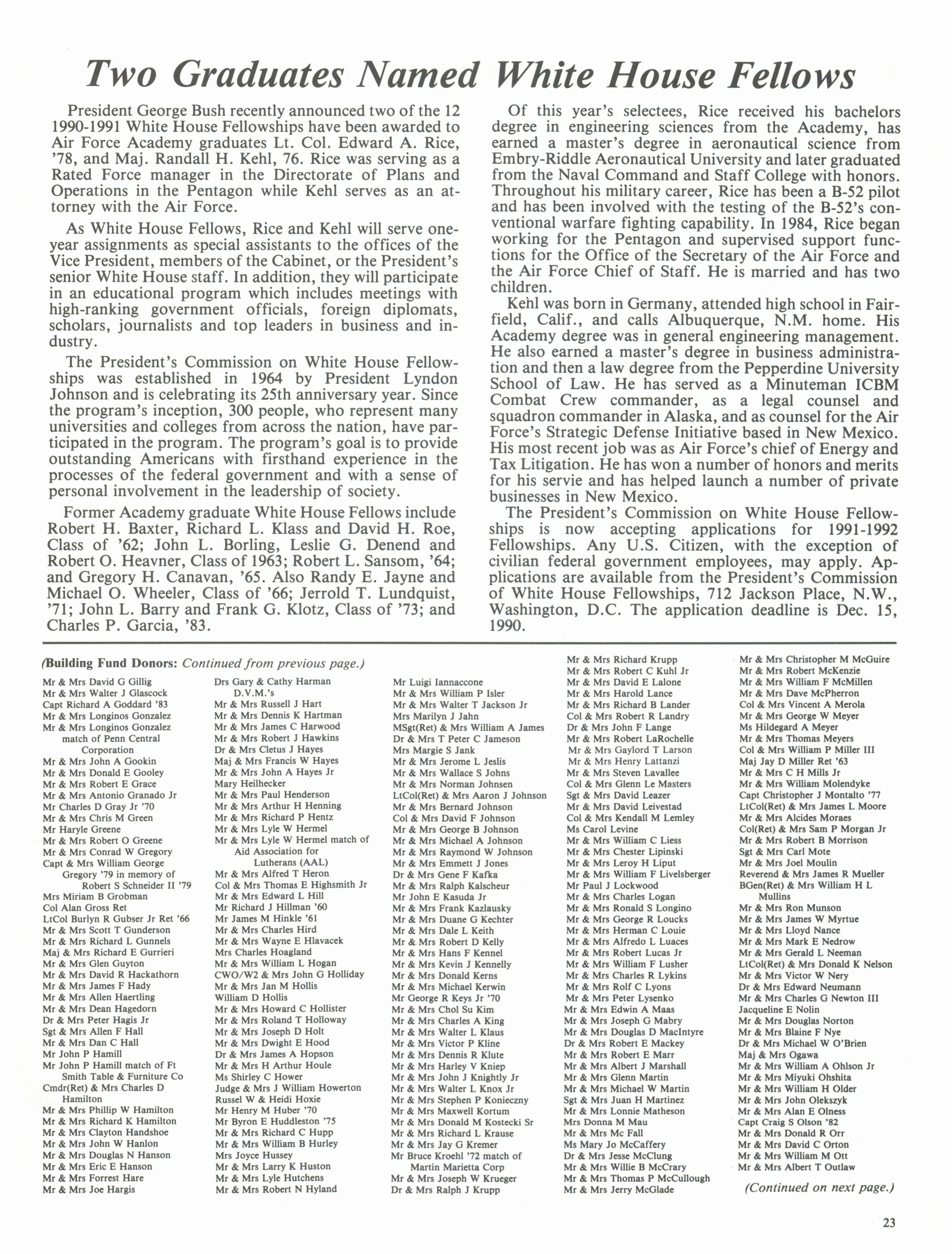 BOARD OF DIRECTORS To Serve Until 30 June 1991 A W Biancur, ’60 W F Kendall Jr., ’60 W E Aylsworth, ’61 M J Quinlan, ’61 J L Smith, ’62 L L Casada, ’71 G D Pollard, ’72 K S Samelson, ’73 R L Alcorn, ’74 P Williams, ’75 J T Wolter, ’75 J B Echols, ’76 S P Rader, ’76 D M Snyder, ’78 M P Powell, ’85 To Serve Until 30 June 1993 C H Meier Jr, ’59 J F Glaza, ’60 J P Ulm, ’61 M P Blaisdell, ’62 B A Blackman, ’65 J E Spittler Jr, ’65 G P Milne, ’67 (Secretary) E M Thorsen, ’67 (President) W W Maywhort, ’68 W E Richardson, ’71 (ViceChairman) J L Barry, ’73 K J Greenhill, ’80 K S Wilhelm, ’80 B A Hook, ’81 M S Novak, ’84 To Serve Until 30 May 1991 D M Coley, ’90 CHECKPOINTS VOLUME 19, NUMBER 2 SUMMER 1990 ARTICLES PAGE Members May Propose AFA Fund Projects/Class Participation 7 1981 Graduate Named Jabara Winner 11 Ruggers Win Second Consecutive National Championship 19 Two Graduates Named White House Fellows 23 Maj. Gen. Lyon Makes $650,000 Building Fund Challenge 24 New Building to Bear Gen. Doolittle’s Name/ Doolittle Committee to Raise $3 Million 25 House Action Benefits Classes of 1977 and 1978 27 Air Force Football to Air Nationally 28 Former Cagers Honor First Academy Basketball Coach 29 AOG Life Membership Options Offered 32 Understudy to Athletic Director Col. Clune Selected 33 Discounts Offered on Computer/Software Purchases and MCI 34 AOG Awards First Five Graduate Dependent Scholarships 35 Second Graduate Four-Star from Class of ’60 39 DEPARTMENTS PAGE View From the Top 5 Air Force Academy Fund Donors 9 Letters to the Editor 13 Building Fund Donors/Pledge Card 21 Academy Alumni Alert 26 Classified Advertising 29 Gone But Not Forgotten 30 AOG Member Benefits/Services 36 AOG Biographical Information Form 37 Chapter News 40 The Secret Life of Waldo F. Dumbsquat 42 Class News 43