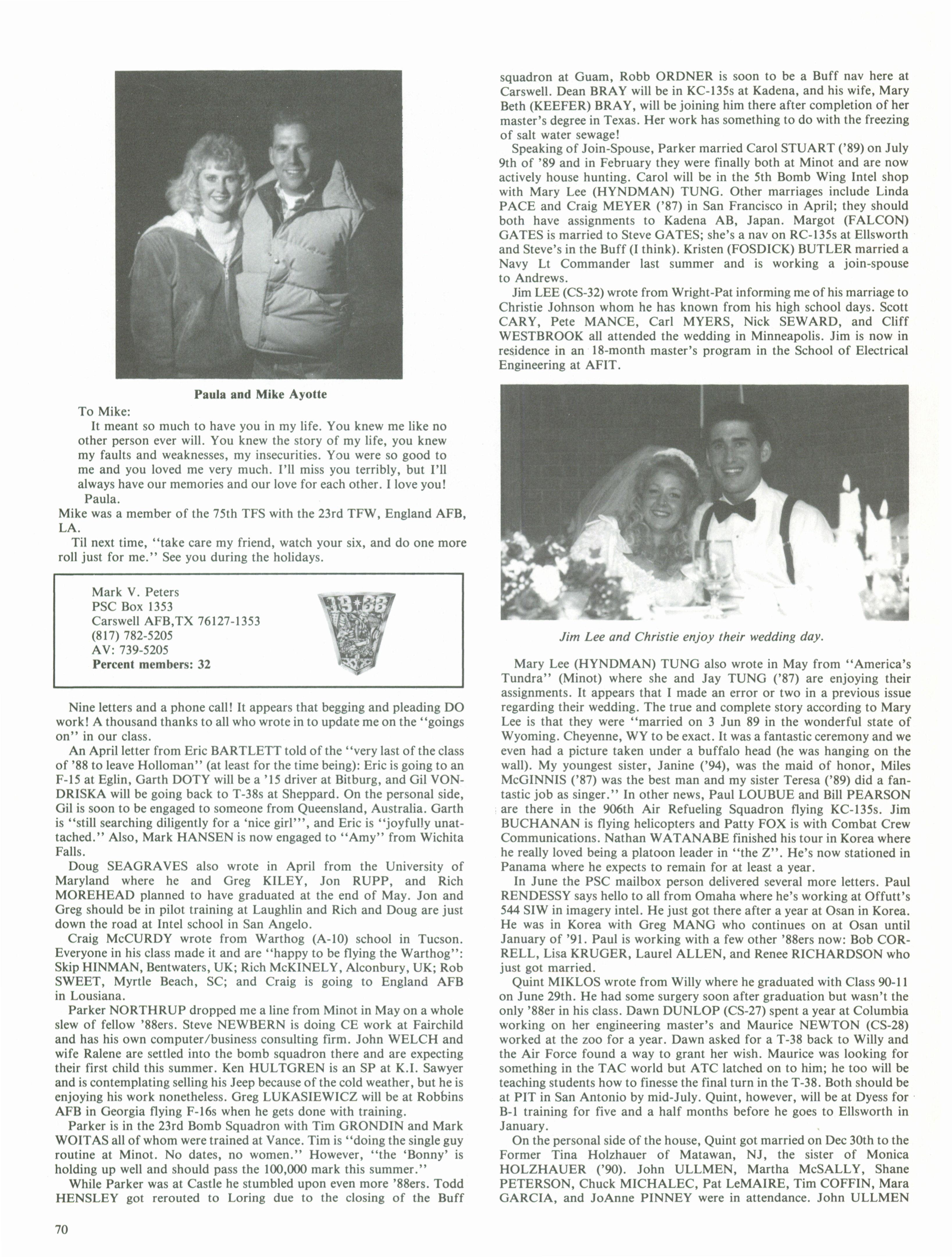 Speaking of Join-Spouse, Parker married Carol STUART (’89) on July 9th of ’89 and in February they were finally both at Minot and are now actively house hunting. Carol will be in the 5th Bomb Wing Intel shop with Mary Lee (HYNDMAN) TUNG. Other marriages include Linda PACE and Craig MEYER (’87) in San Francisco in April; they should both have assignments to Kadena AB, Japan. Margot (FALCON) GATES is married to Steve GATES; she’s a nav on RC-135s at Ellsworth and Steve’s in the Buff (I think). Kristen (FOSDICK) BUTLER married a Navy Lt Commander last summer and is working a join-spouse to Andrews.