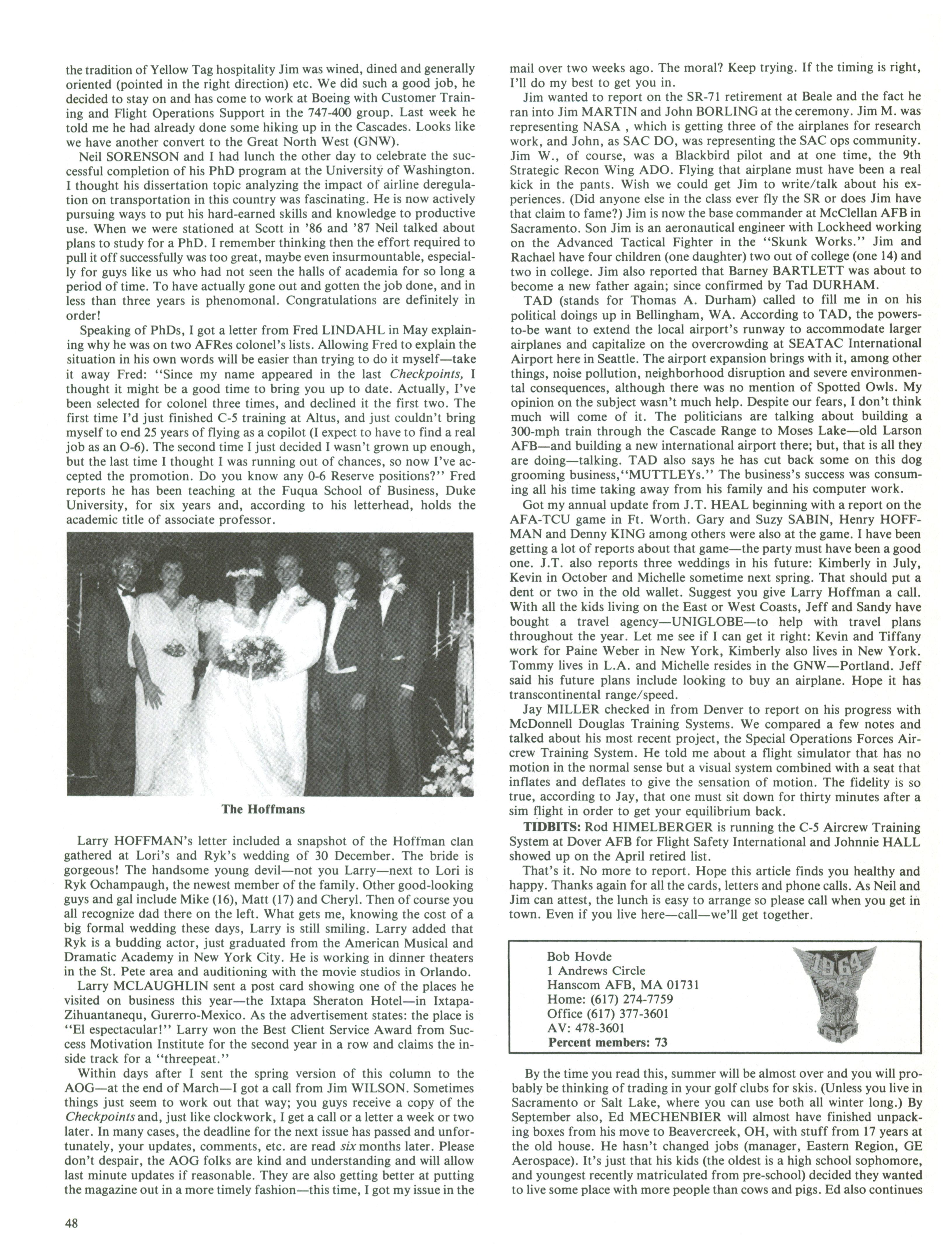 My next letter came from Tony SOMMER just a few weeks ago. Tony is in Oklahoma in “AWACSland” slogging through training with Ted MEYER, Teresa HYNDMAN, Don SIMPSON, Juan SOTO, Shawn WASHINGTON, Jeff KAMNIKAR, Mitch NITTA, Andy FORSTNER, Tom BAKER, and Danielle CASEY. Tony says they are the cockiest students to come through in a while, so they’re having a good time. They should get their assignments and their aircrew wings sometime in August. Tony says they will all be stationed at Tinker, so it is a good thing they like Oklahoma, since they’ll probably be there a long time (five years or so). Mitch NITTA got engaged in May, with a projected spring/summer ’91 wedding planned. Doug COX and his wife, Lynae, had their first child, a boy, in March. His name is Allen and Tony says he is HUGE—weighing 10 lbs. 15 ozs. at birth. Doug finished in May and is bound for Castle to learn how to use his nav skills in the B-52. Lastly, Tony heard from Peg McCABE, who is doing fine in the comm squadron at Dover. Tony’s old roomie, Kirk ALEXANDER, is putting his English major to use in systems ac at Norton. Tatiana STEAD is doing fine working in public affairs also at Norton. Thanks for writing, Tony.