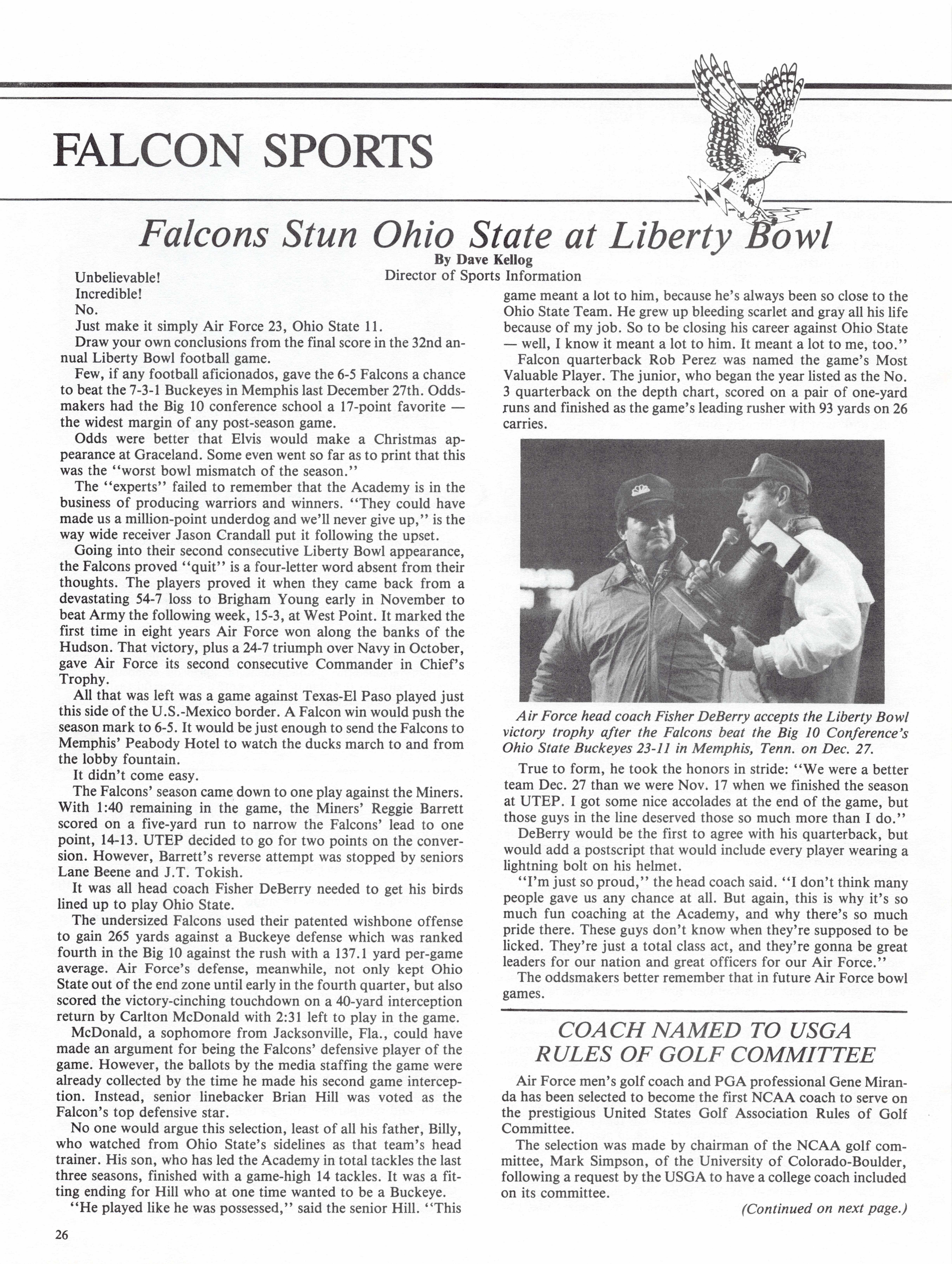 Special thanks to the Academy’s Directorate of Visual Information for our front cover. Photographers Sgt. Mario Hernandez and Sgt. Michael Reinhardt covered the Liberty Bowl game and got this sparkling shot of the Falcons coming off the field after their practice just prior to the game. See related story on page 26.