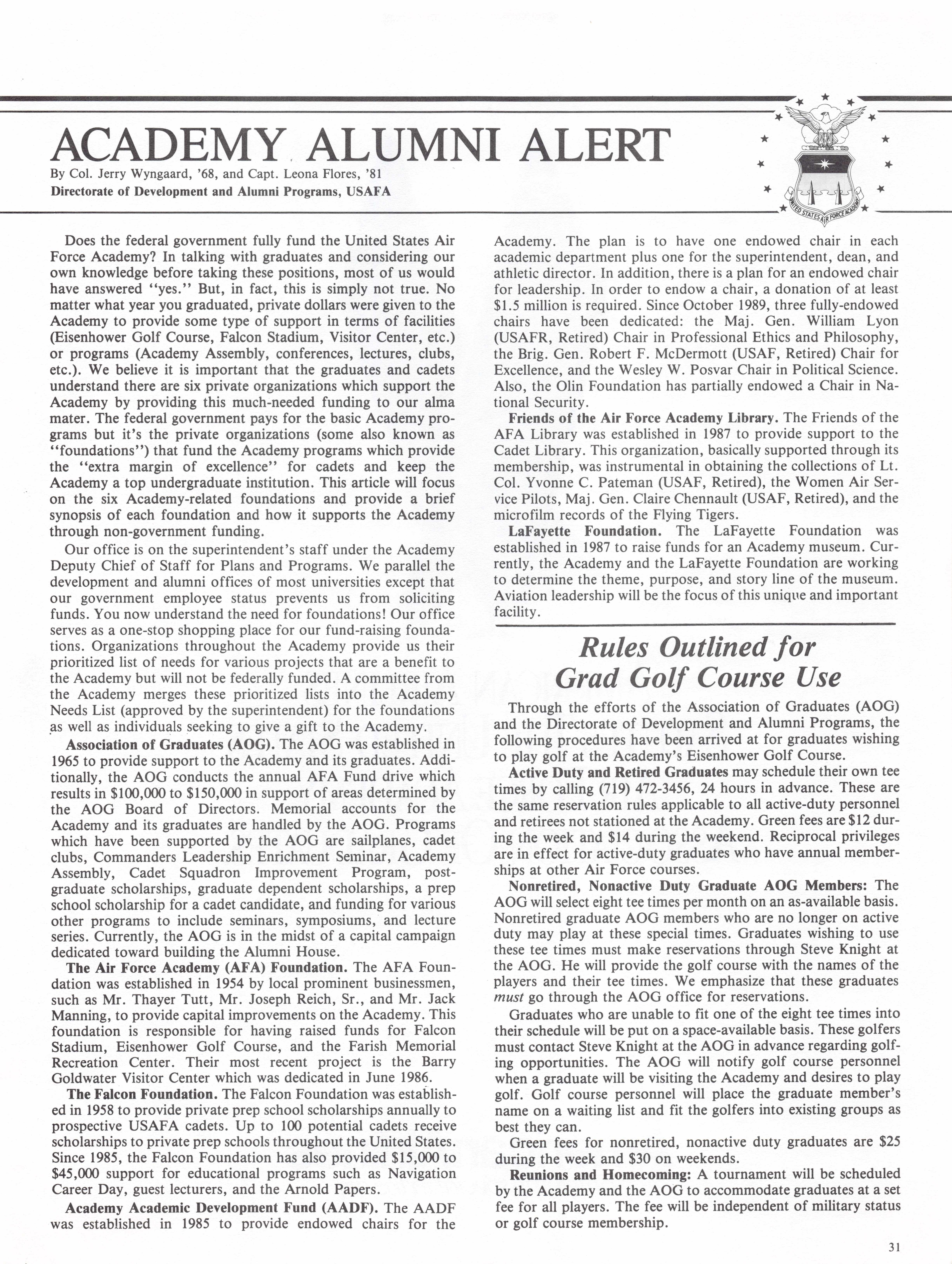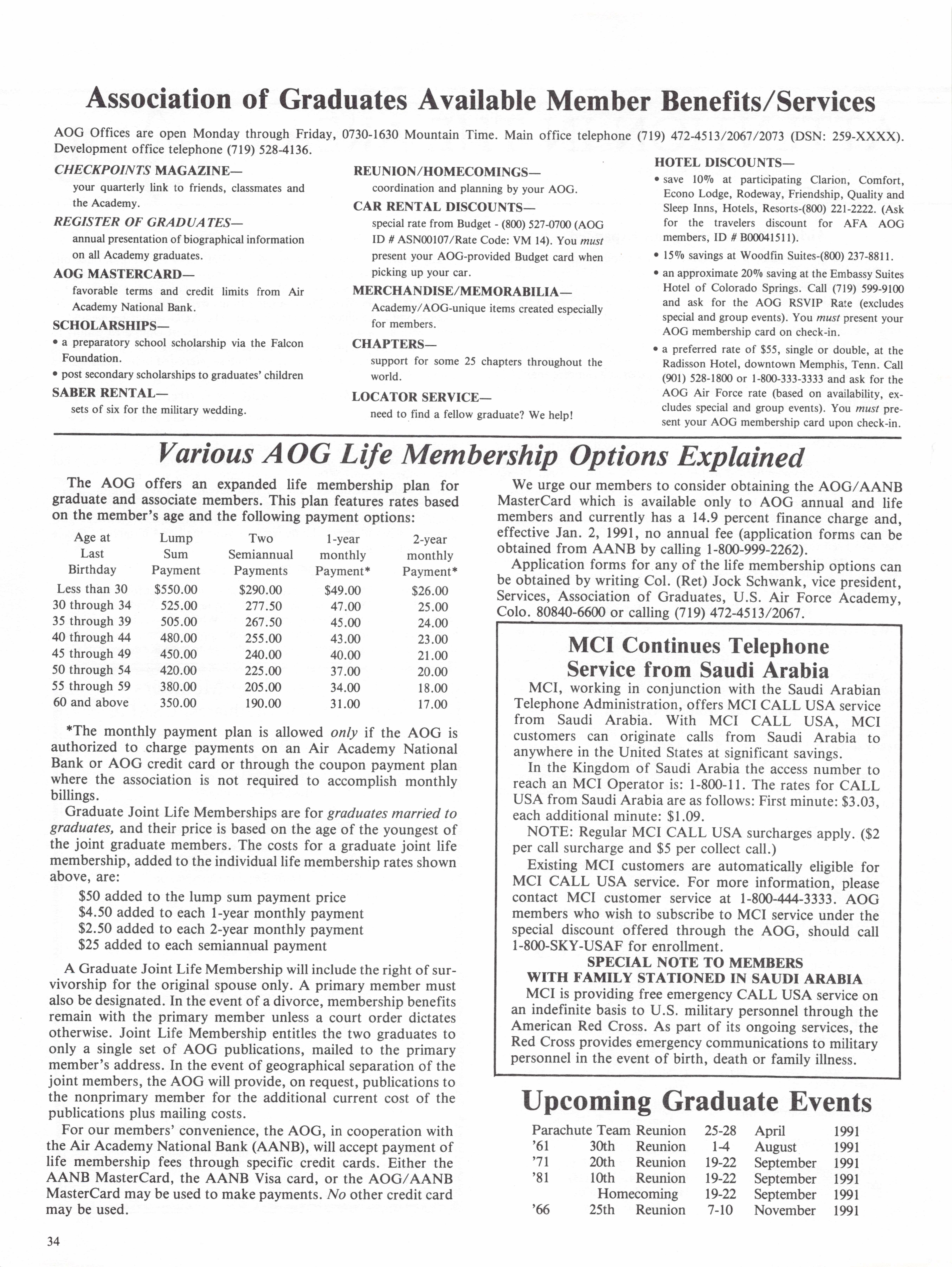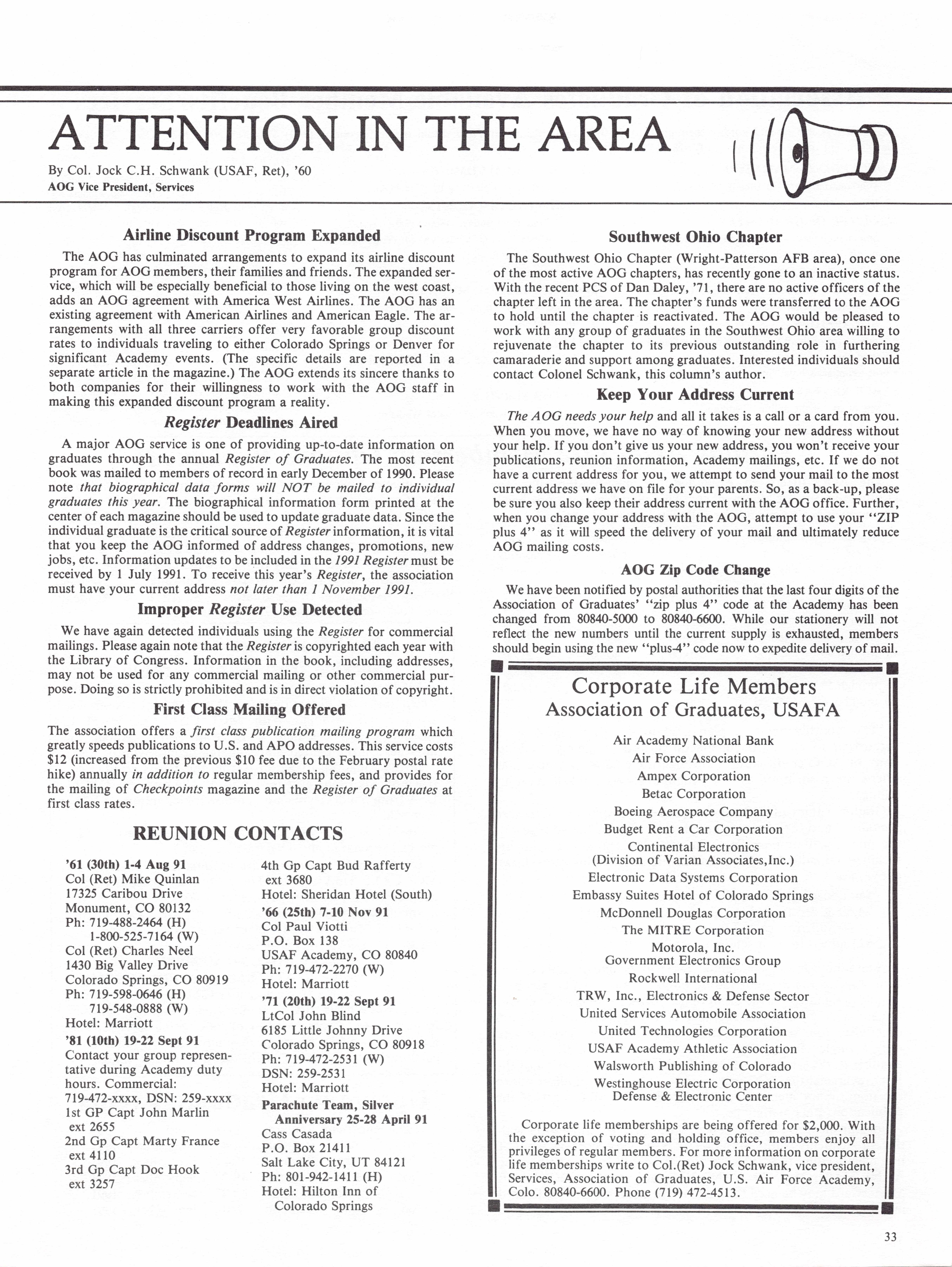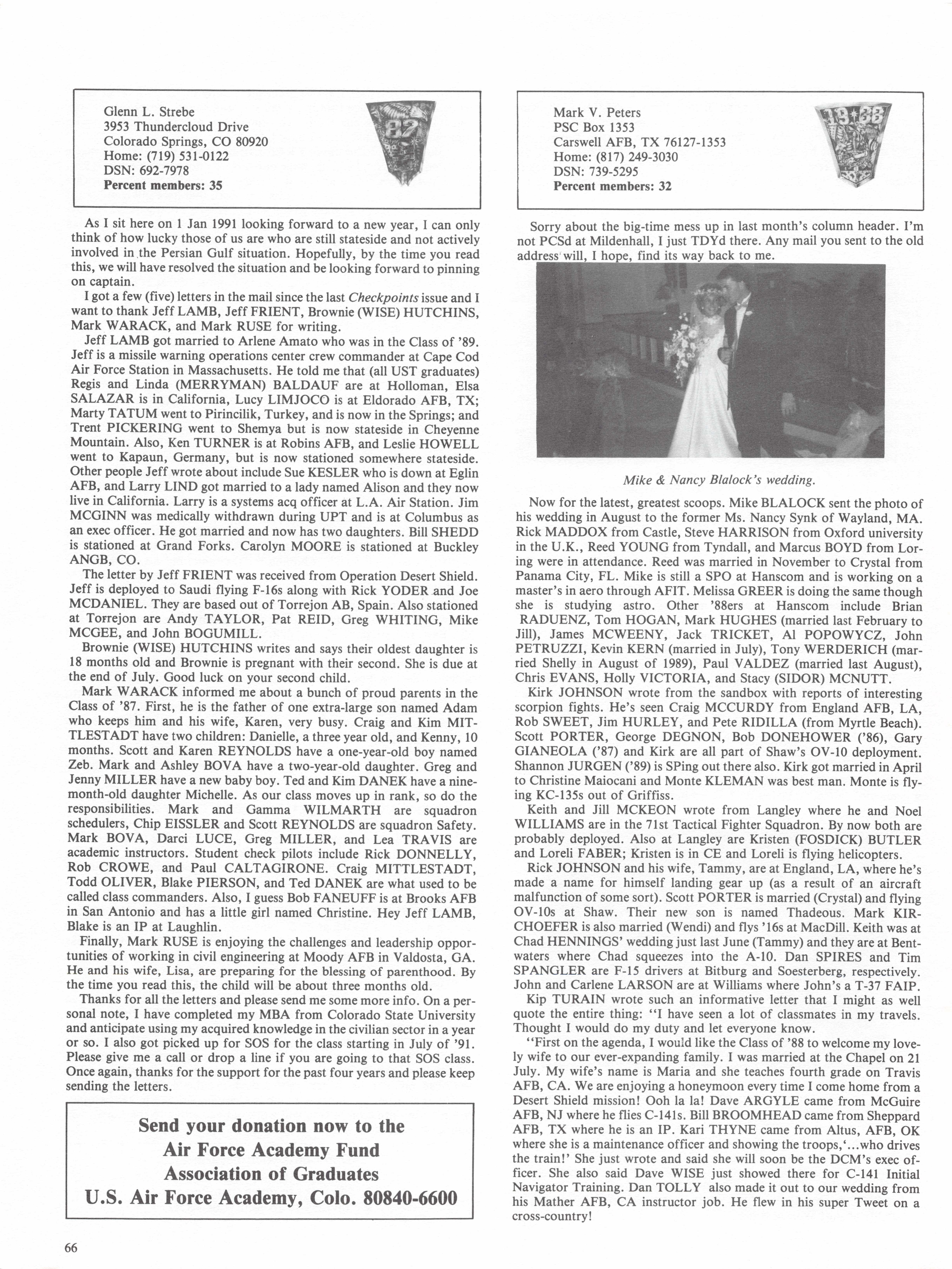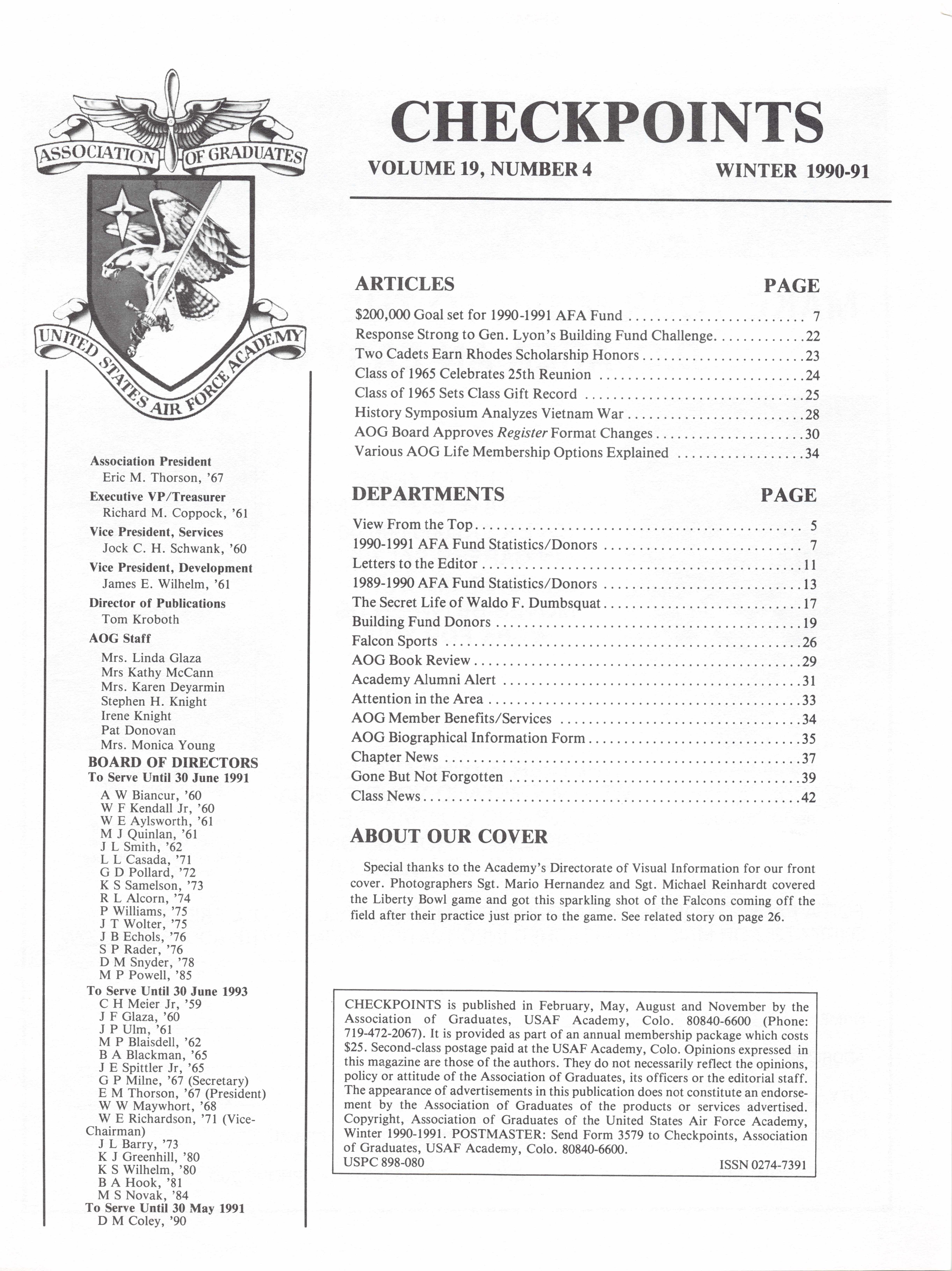 CHECKPOINTS is published in February, May, August and November by the Association of Graduates, USAF Academy, Colo. 80840-66(K) (Phone: 719-472-2067). It is provided as part of an annual membership package which costs $25. Second-class postage paid at the USAF Academy, Colo. Opinions expressed in this magazine are those of the authors. They do not necessarily reflect the opinions, policy or attitude of the Association of Graduates, its officers or the editorial staff. The appearance of advertisements in this publication does not constitute an endorse¬ ment by the Association of Graduates of the products or services advertised. Copyright, Association of Graduates of the United States Air Force Academy, Winter 1990-1991. POSTMASTER: Send Form 3579 to Checkpoints, Association of Graduates, USAF Academy, Colo. 80840-6600. USPC 898-080