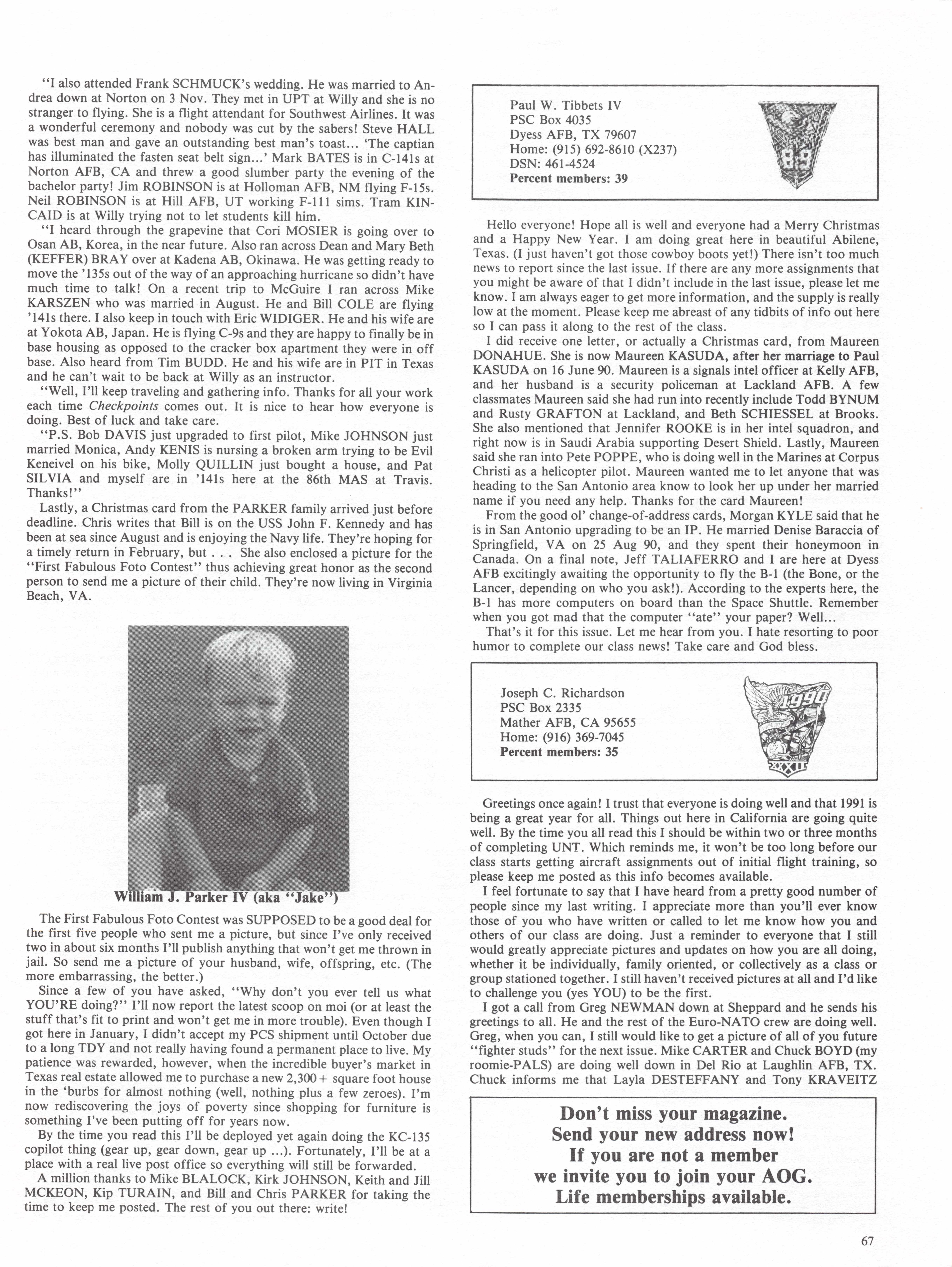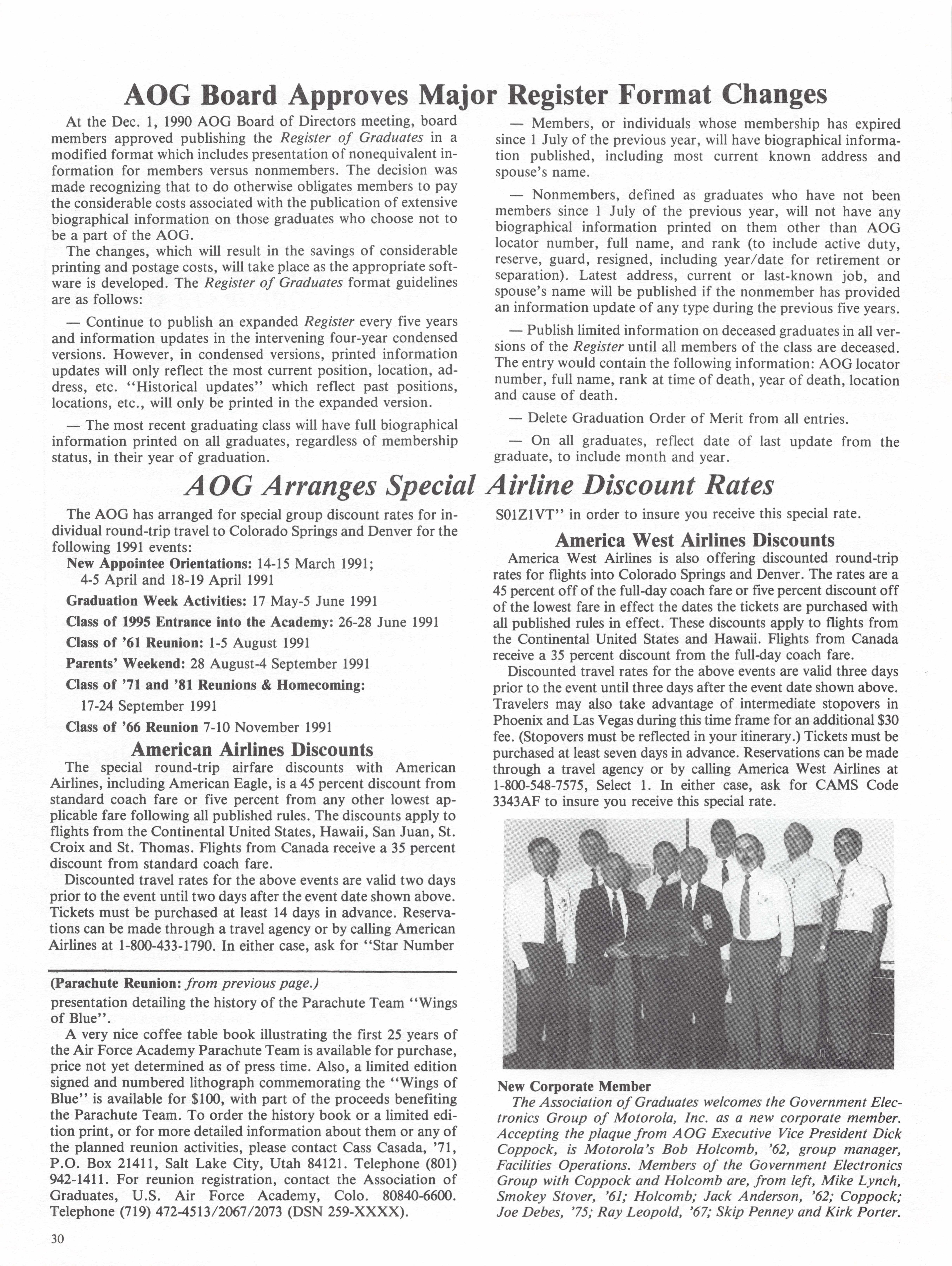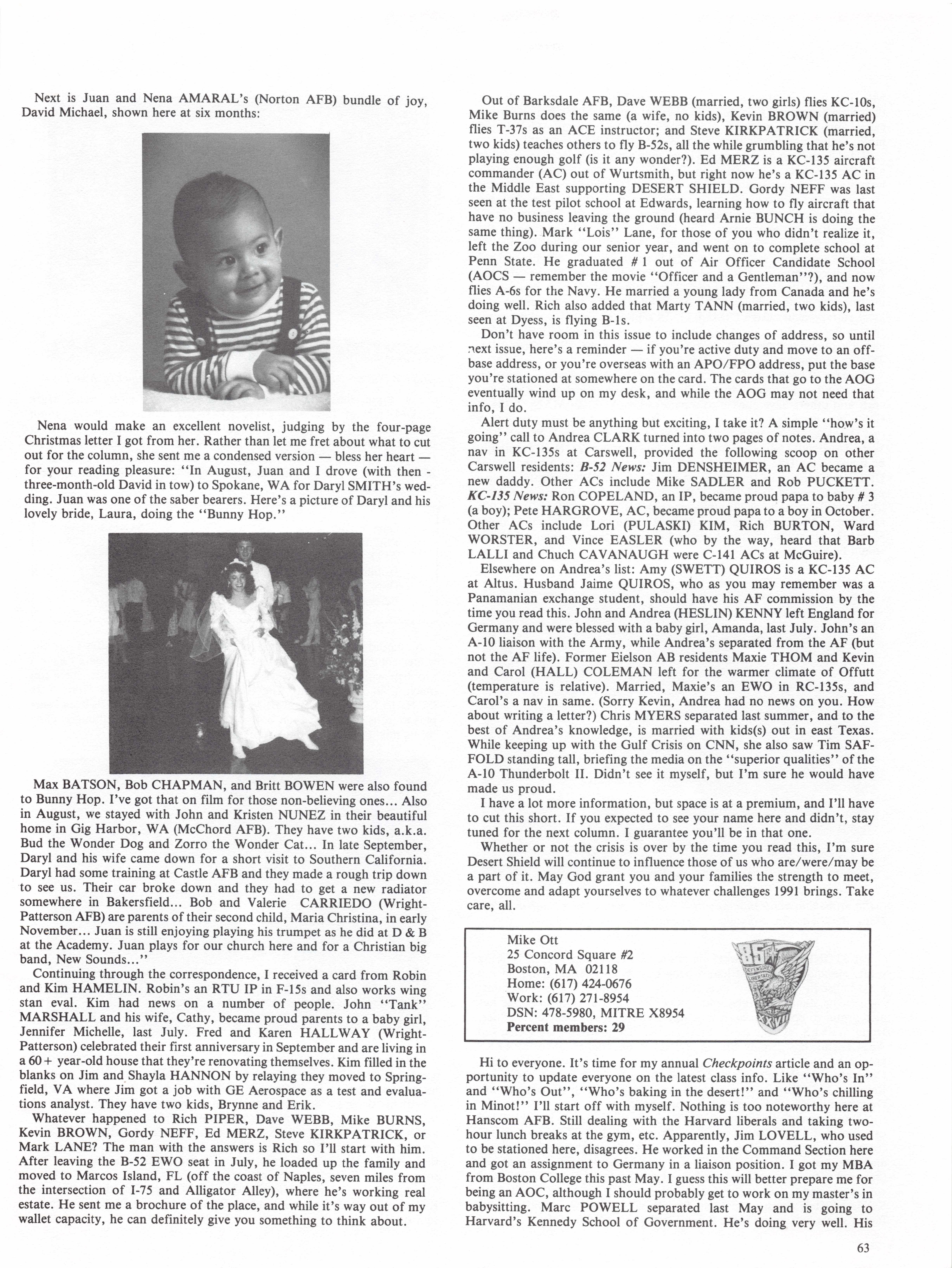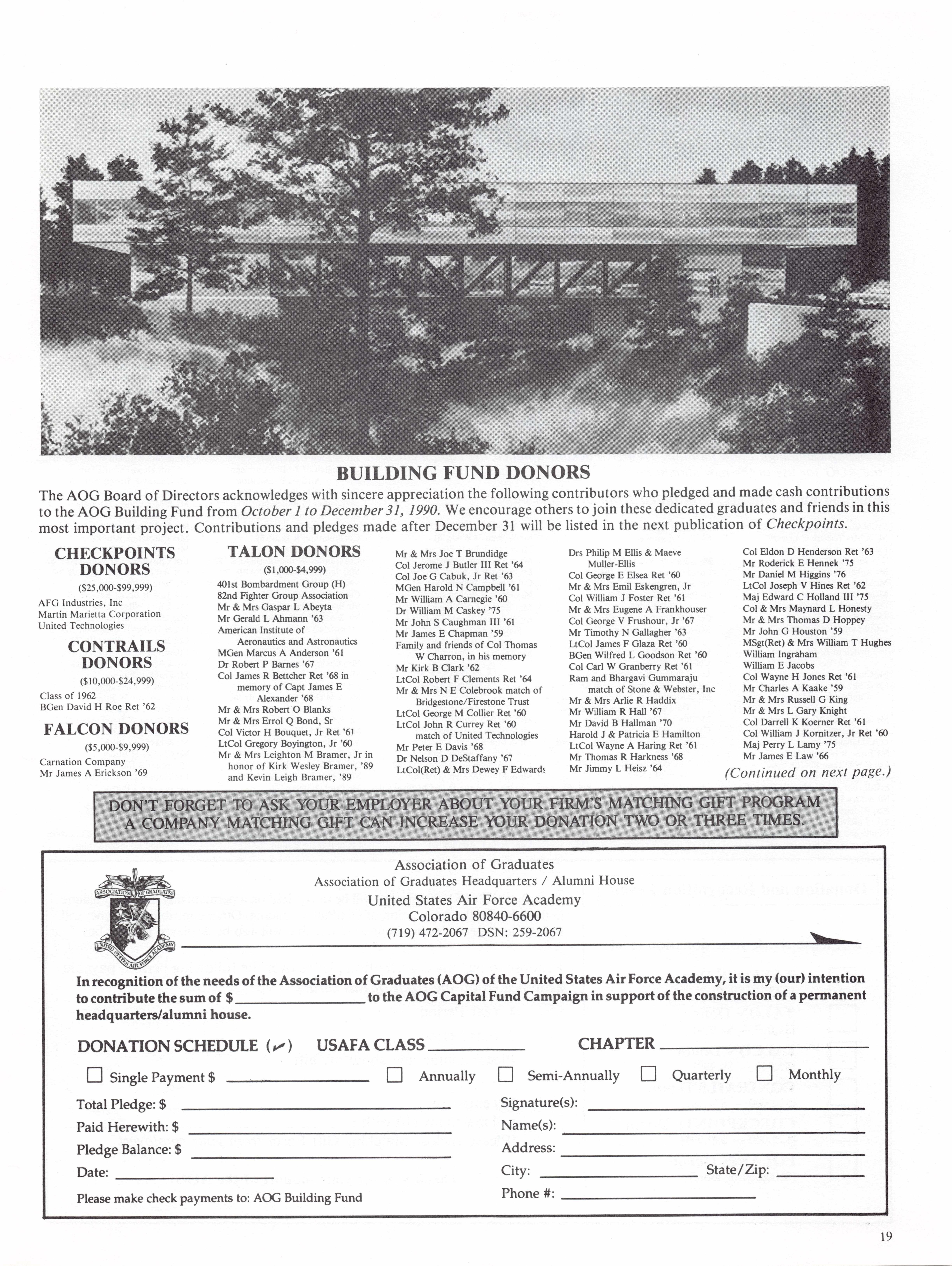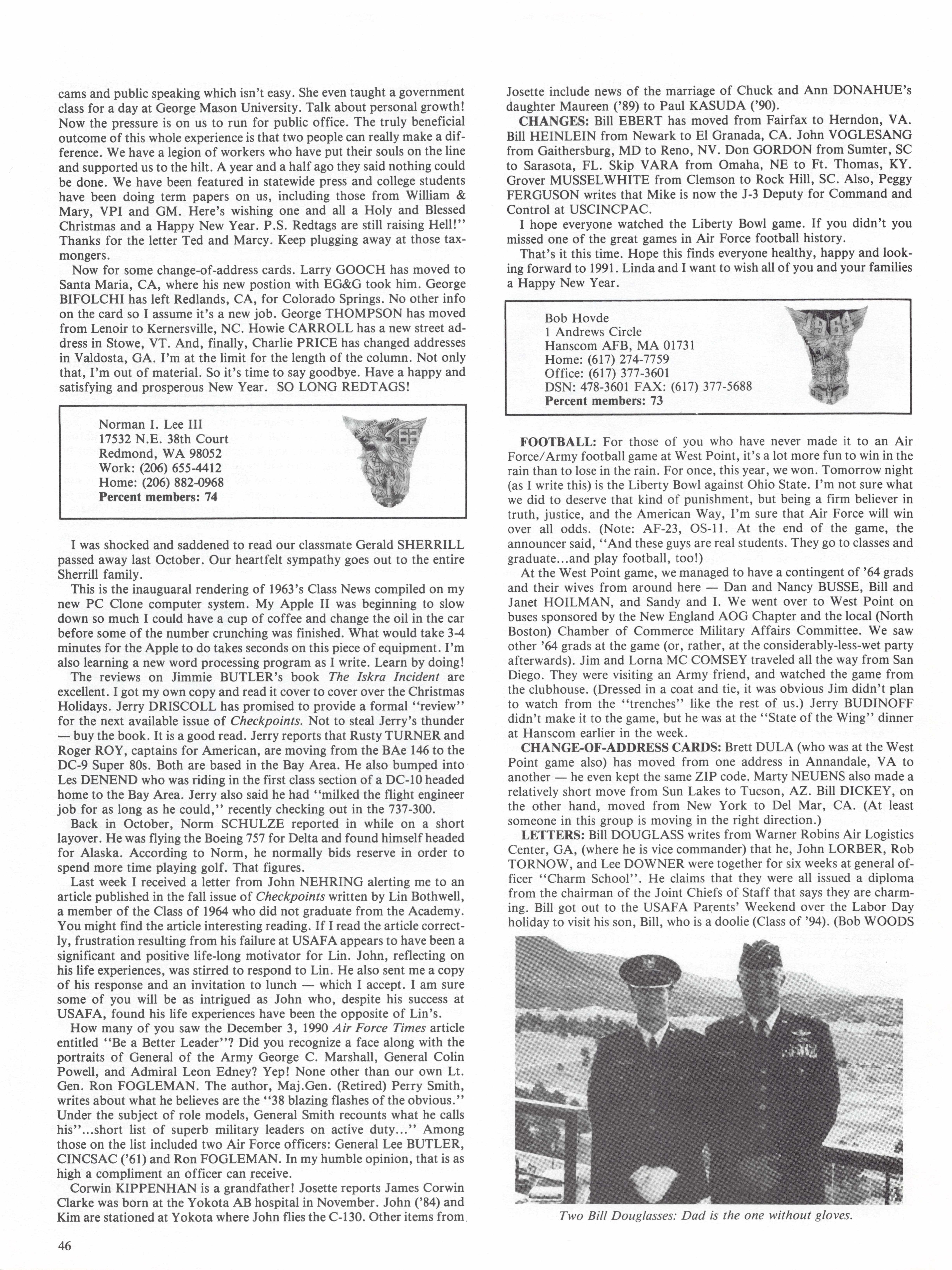 CHECKPOINTS is published in February, May, August and November by the Association of Graduates, USAF Academy, Colo. 80840-66(K) (Phone: 719-472-2067). It is provided as part of an annual membership package which costs $25. Second-class postage paid at the USAF Academy, Colo. Opinions expressed in this magazine are those of the authors. They do not necessarily reflect the opinions, policy or attitude of the Association of Graduates, its officers or the editorial staff. The appearance of advertisements in this publication does not constitute an endorse¬ ment by the Association of Graduates of the products or services advertised. Copyright, Association of Graduates of the United States Air Force Academy, Winter 1990-1991. POSTMASTER: Send Form 3579 to Checkpoints, Association of Graduates, USAF Academy, Colo. 80840-6600. USPC 898-080