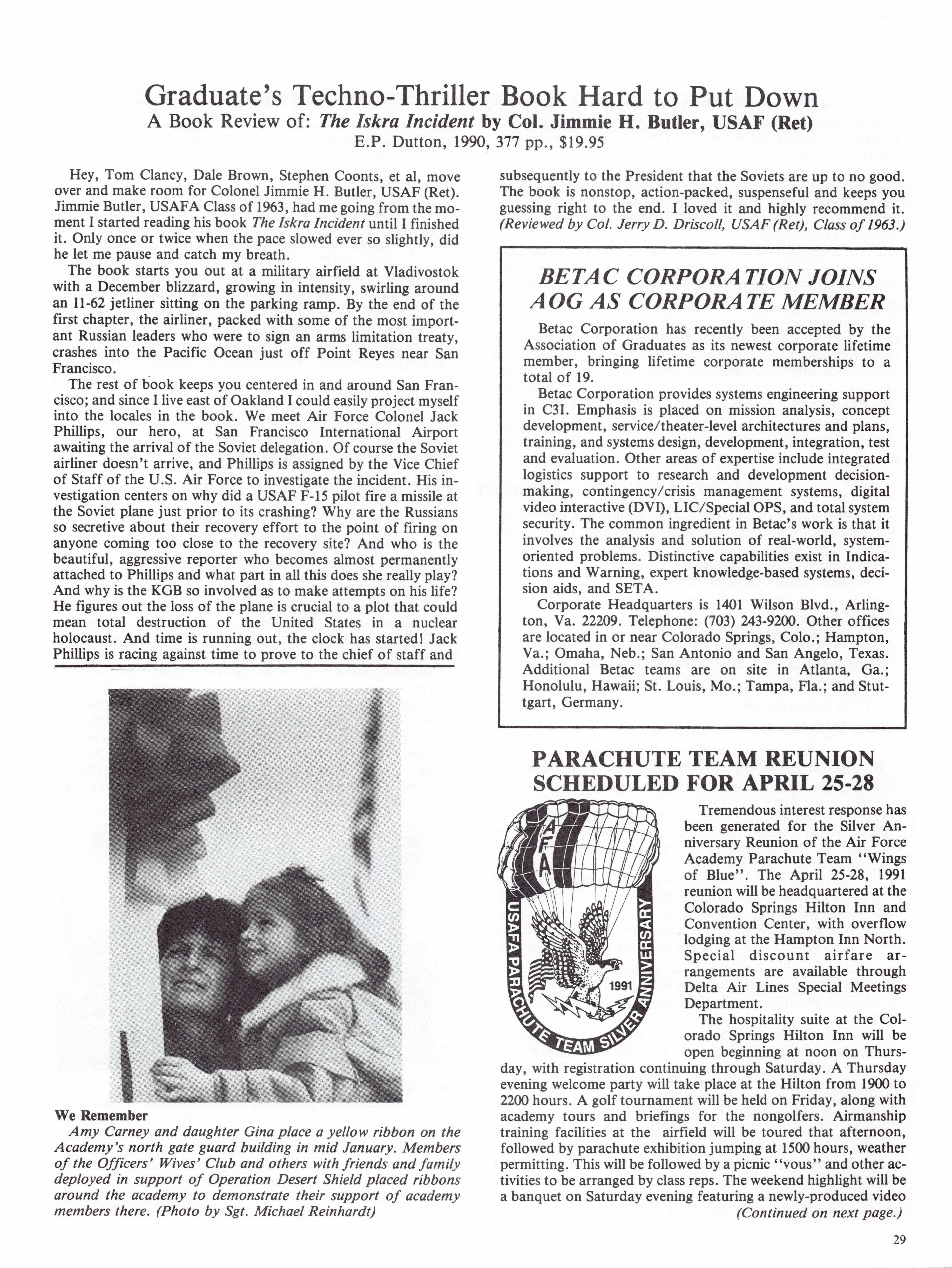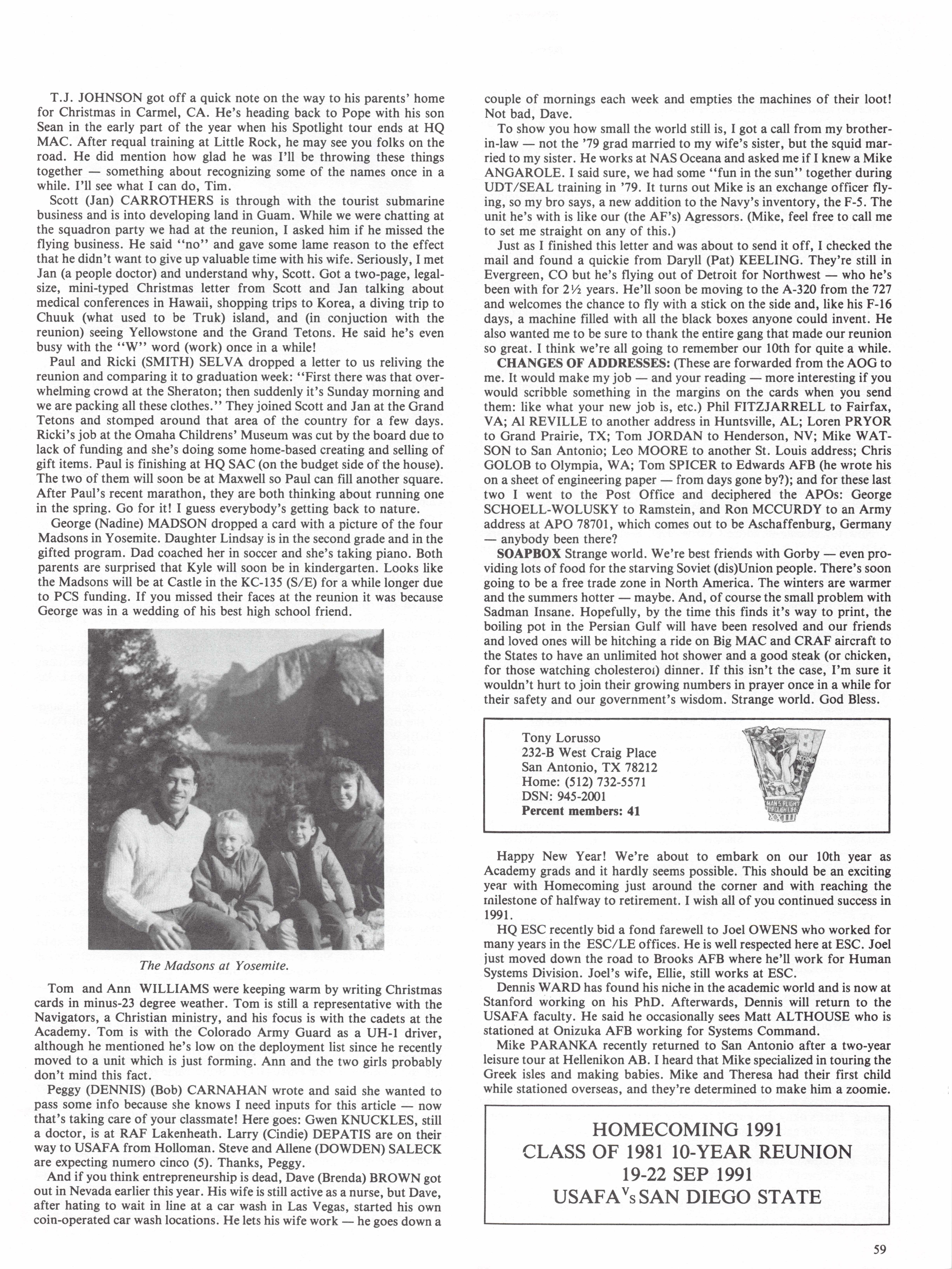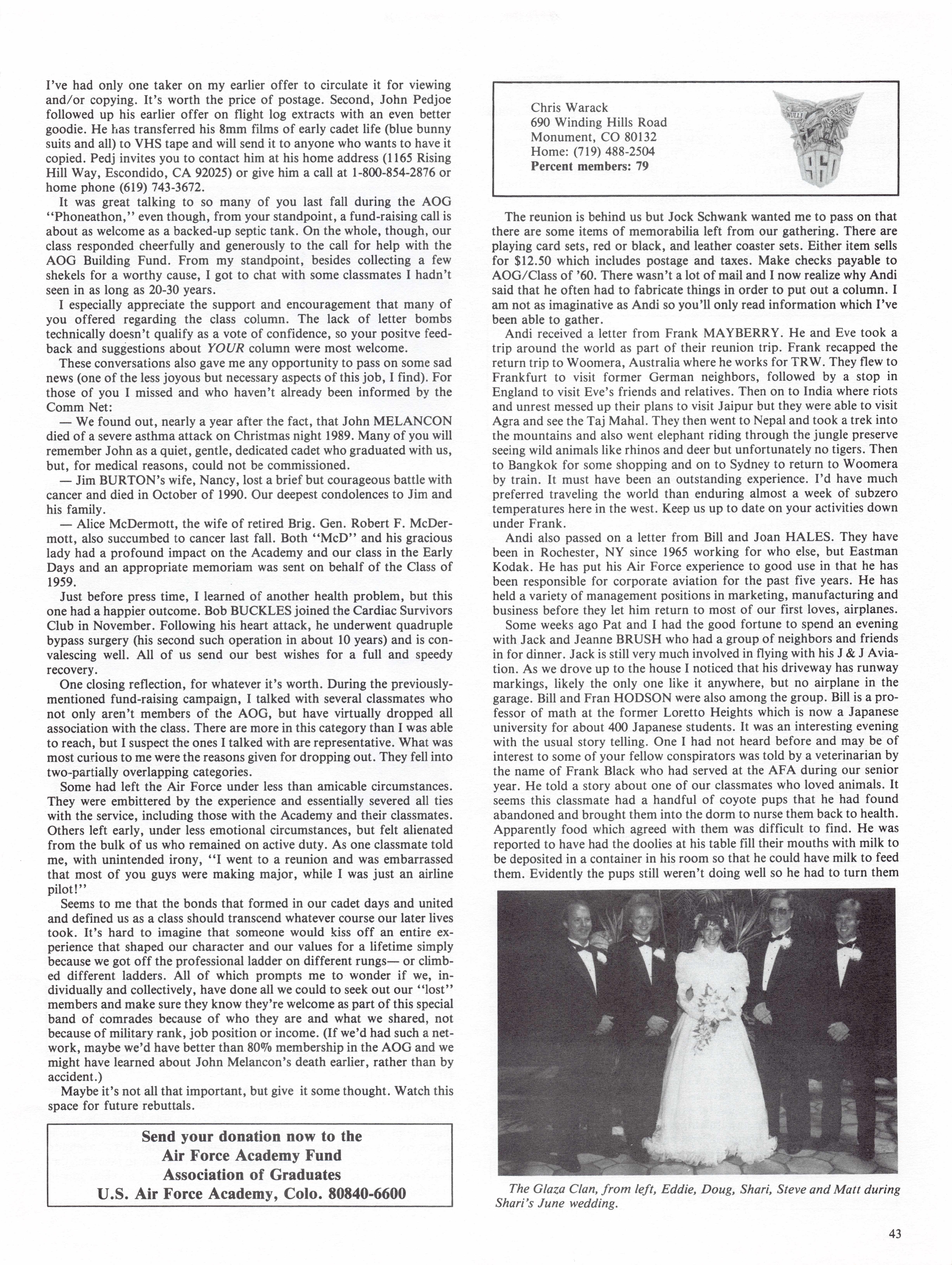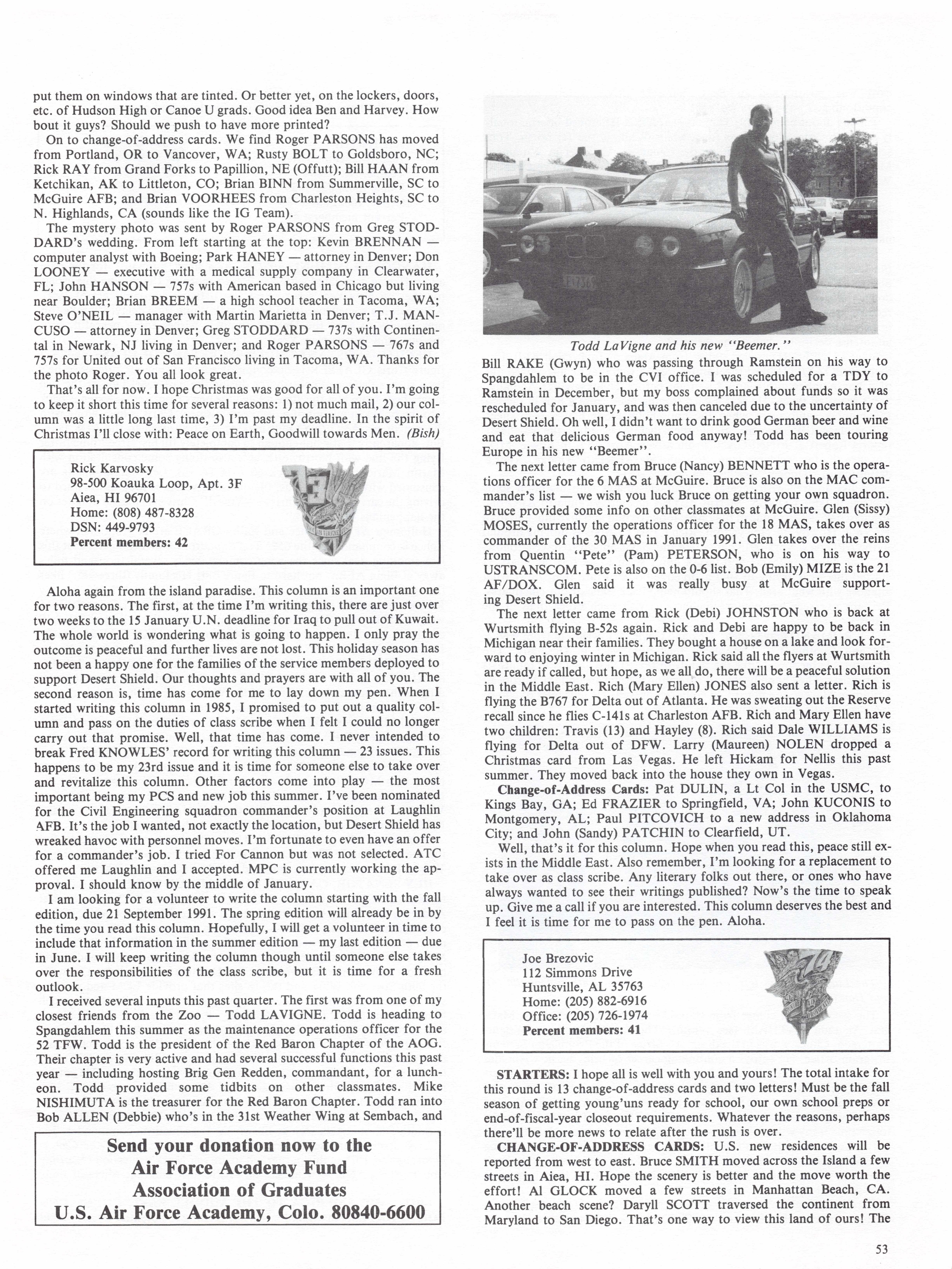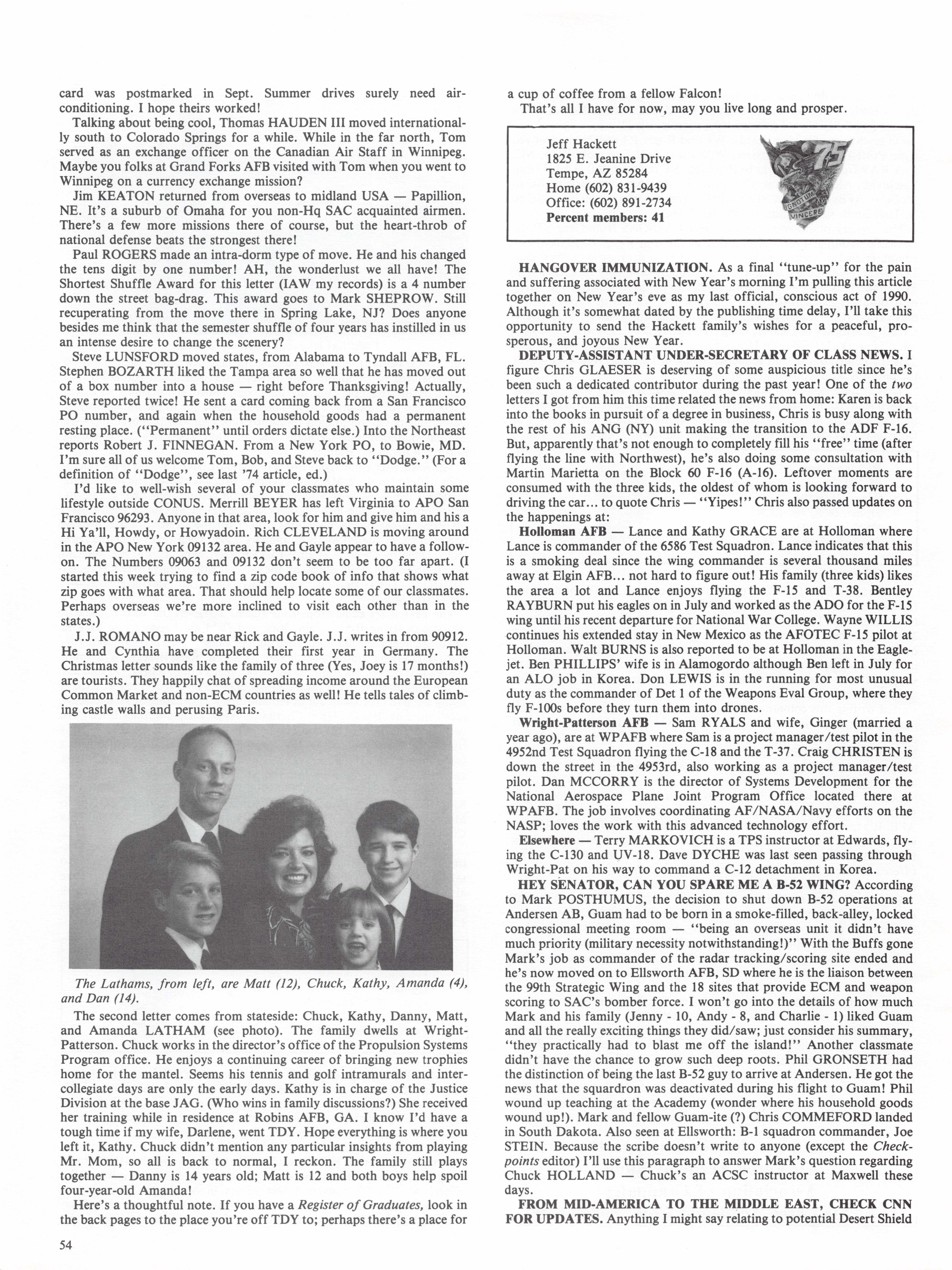 CHECKPOINTS is published in February, May, August and November by the Association of Graduates, USAF Academy, Colo. 80840-66(K) (Phone: 719-472-2067). It is provided as part of an annual membership package which costs $25. Second-class postage paid at the USAF Academy, Colo. Opinions expressed in this magazine are those of the authors. They do not necessarily reflect the opinions, policy or attitude of the Association of Graduates, its officers or the editorial staff. The appearance of advertisements in this publication does not constitute an endorse¬ ment by the Association of Graduates of the products or services advertised. Copyright, Association of Graduates of the United States Air Force Academy, Winter 1990-1991. POSTMASTER: Send Form 3579 to Checkpoints, Association of Graduates, USAF Academy, Colo. 80840-6600. USPC 898-080