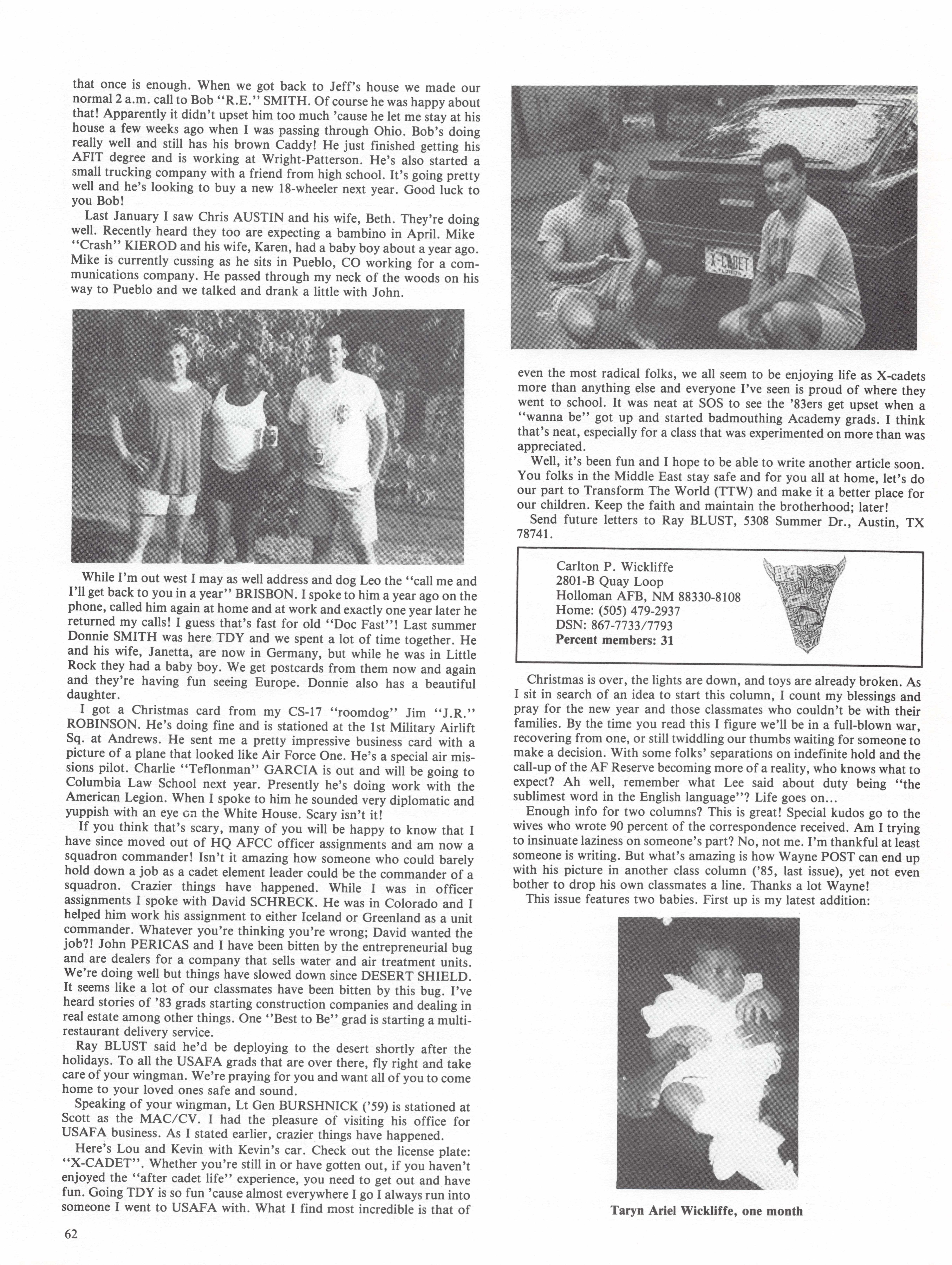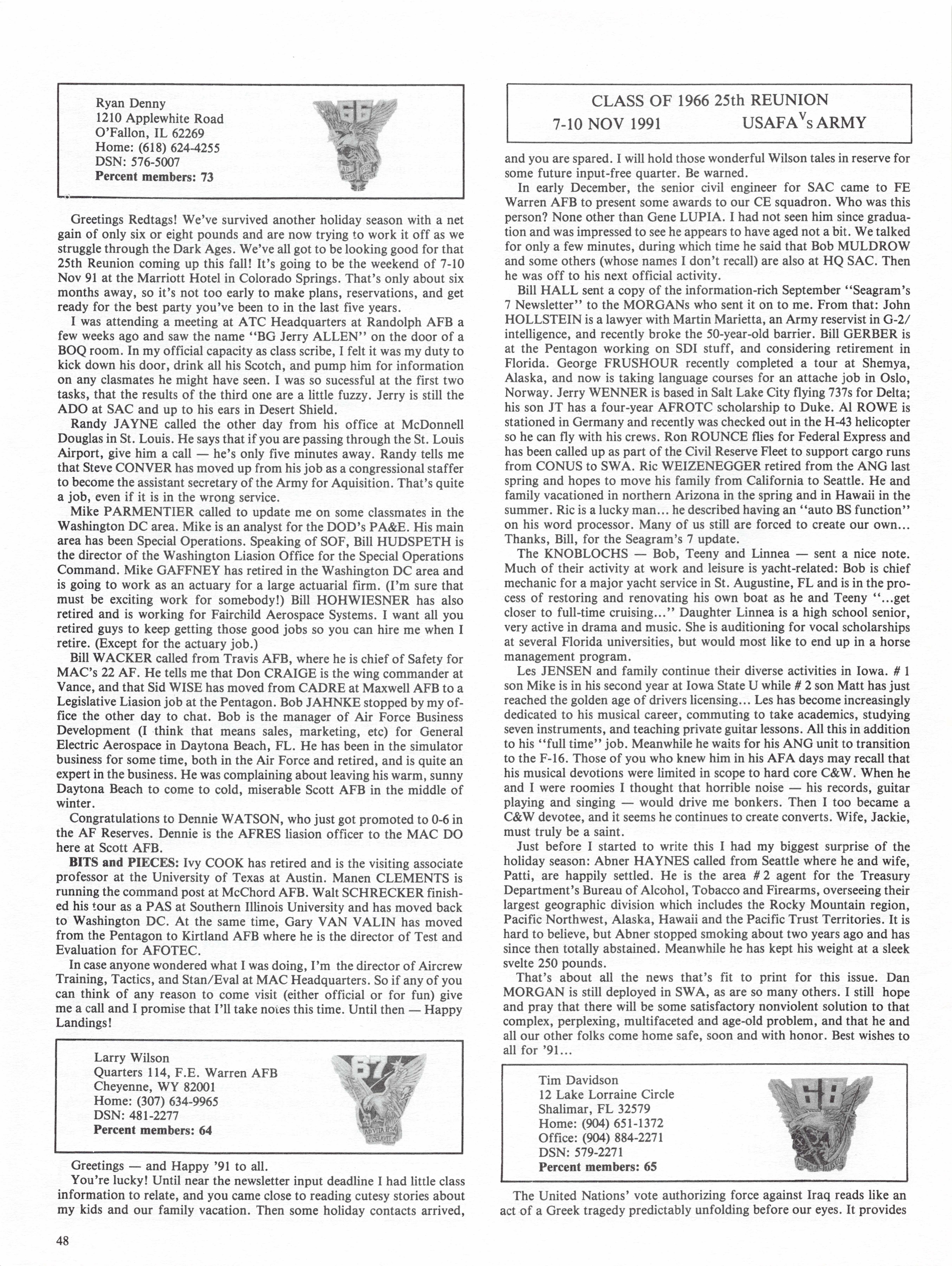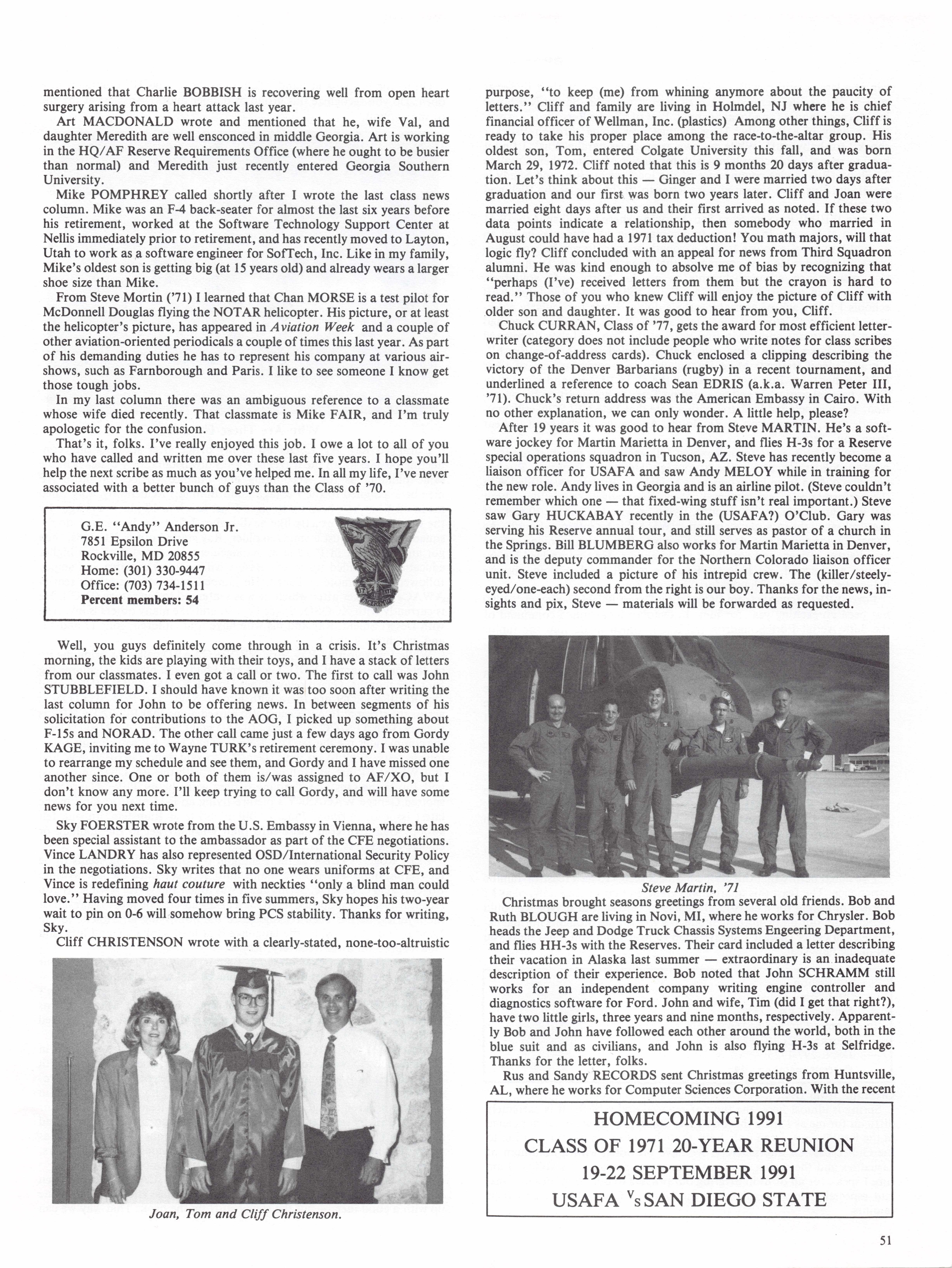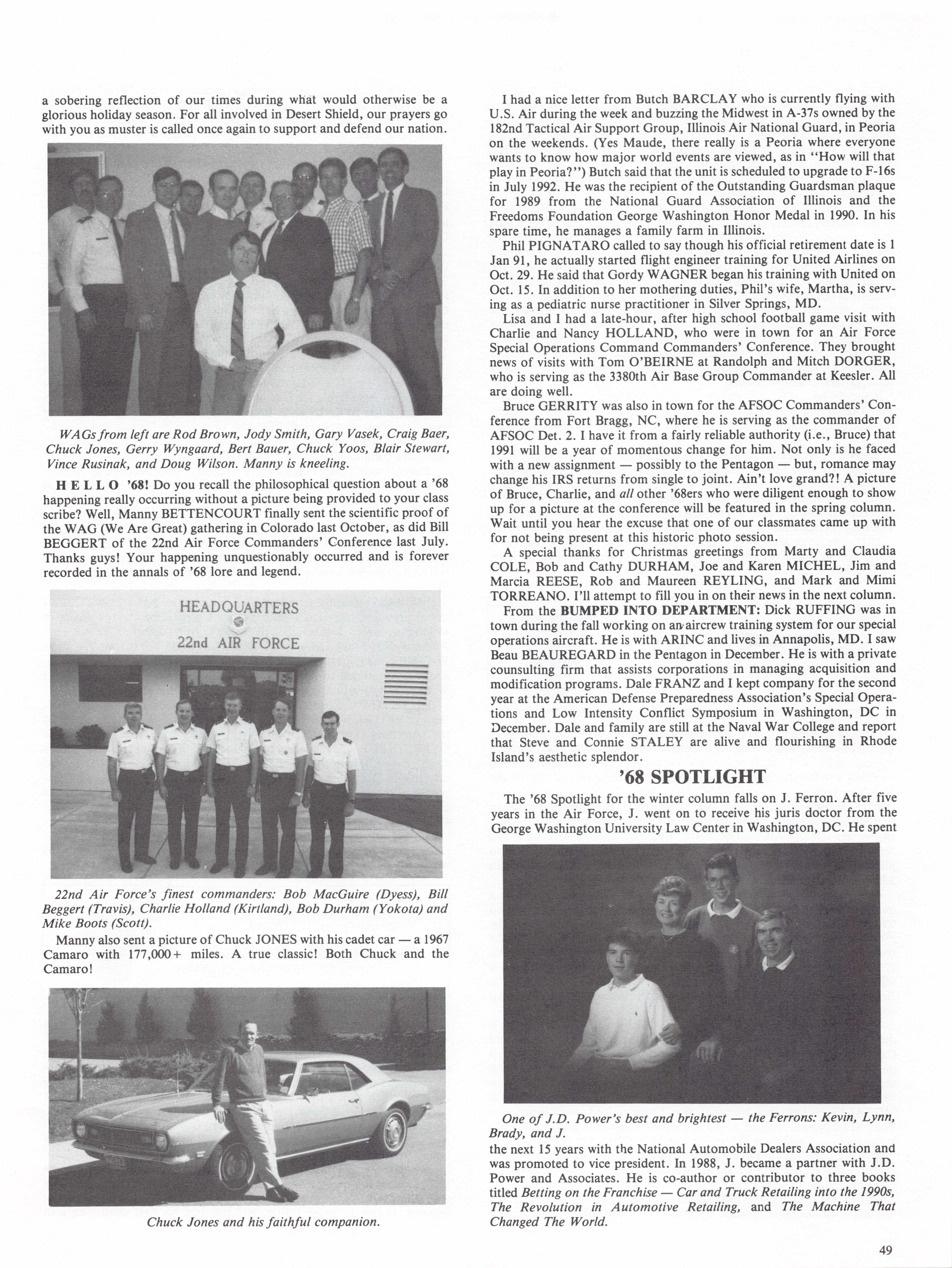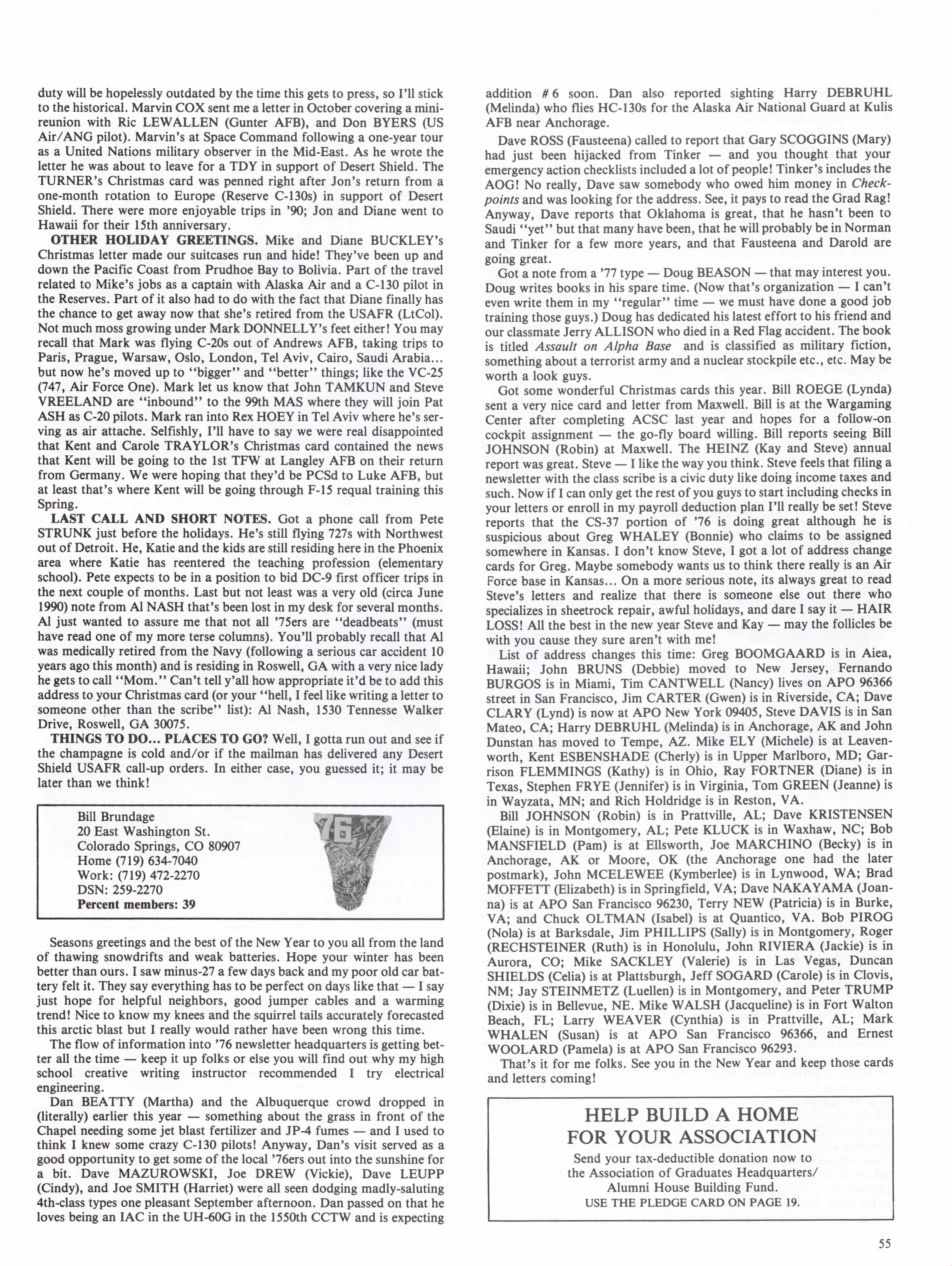 CHECKPOINTS is published in February, May, August and November by the Association of Graduates, USAF Academy, Colo. 80840-66(K) (Phone: 719-472-2067). It is provided as part of an annual membership package which costs $25. Second-class postage paid at the USAF Academy, Colo. Opinions expressed in this magazine are those of the authors. They do not necessarily reflect the opinions, policy or attitude of the Association of Graduates, its officers or the editorial staff. The appearance of advertisements in this publication does not constitute an endorse¬ ment by the Association of Graduates of the products or services advertised. Copyright, Association of Graduates of the United States Air Force Academy, Winter 1990-1991. POSTMASTER: Send Form 3579 to Checkpoints, Association of Graduates, USAF Academy, Colo. 80840-6600. USPC 898-080