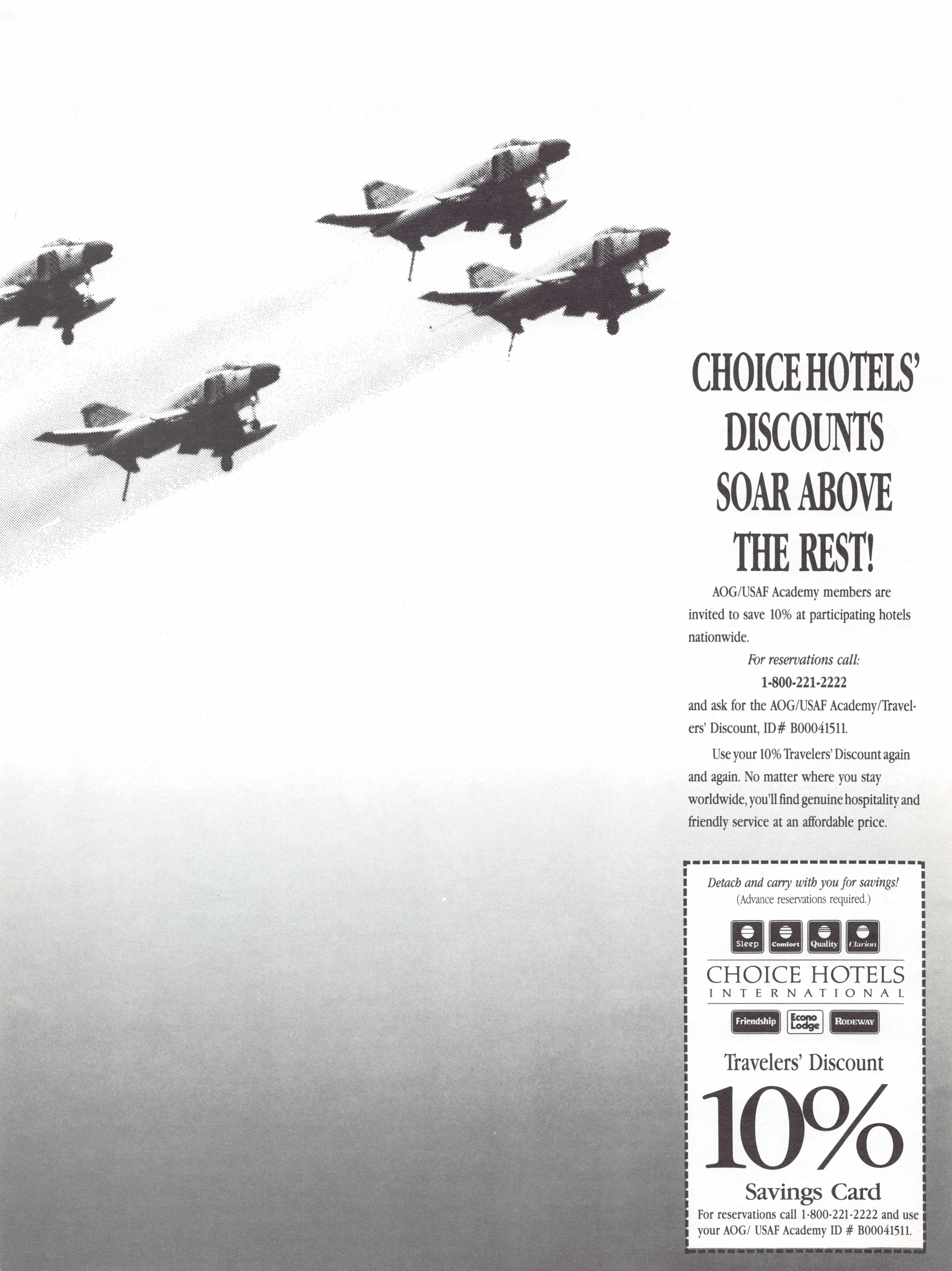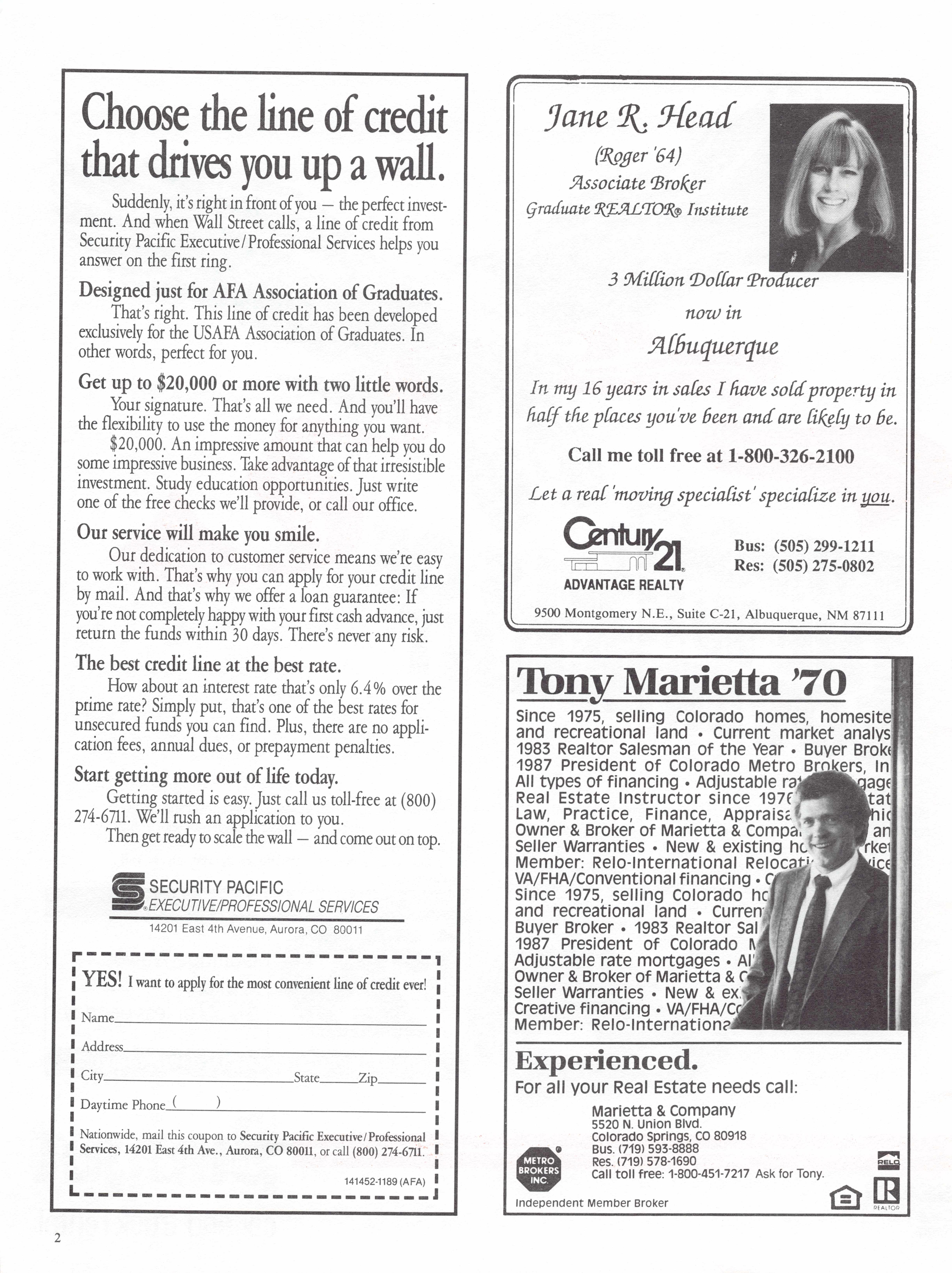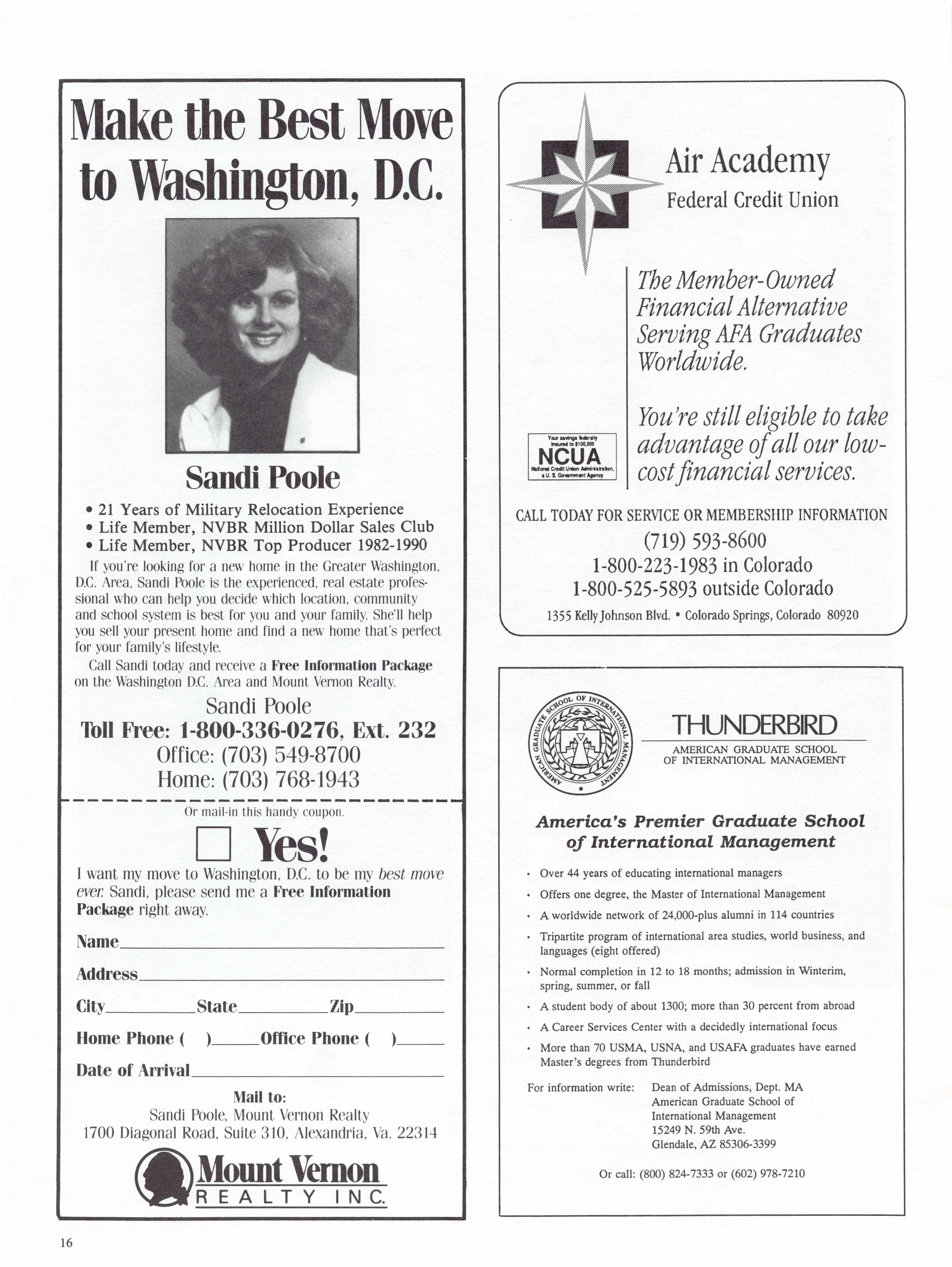 Membership Privileges Equal Now, take advantage of this Great Bene fi t! Travel Insurance (up to $100,000) provided at NO addtional cost. Emergency Cash— 24 hours aday, 7 days aweek, at any Plus Systenf ATM. Air Academy National Bank s MasterCard issued exclusively for Members of the Association of Graduates. (There are thousands of locations worldwide). $1,000 Hospital Idenmity Plan. A25-Day (jrace Period. Additional Card at NO eictra cost. Discount at Car Rentals. (Hertz and National Car Rental). SPECUa FEATURES: Effective 1/2/91. Annual Percentage Rate of 14.9%. Pre-Approved $5,000 Credit line. (Approval subject to credit history verification). Call or write today for your Association of Graduates MasterCard application... You’ll be glad you did! 1-800-365-5890 iUr Academy Nattonof Bank— The "Home Bank" of the Air Force. MasterCard Department*Air Academy National Bank Post Of fi ce Box 10 ● USAFA, Colorado 80840 Telephone: (719) 598-2933 Association of Graduates United States Air Force Academy USAF Academy, CO 80840 Note: Continuing AOG membership is aprerequisite for card issue and renewal. MM.