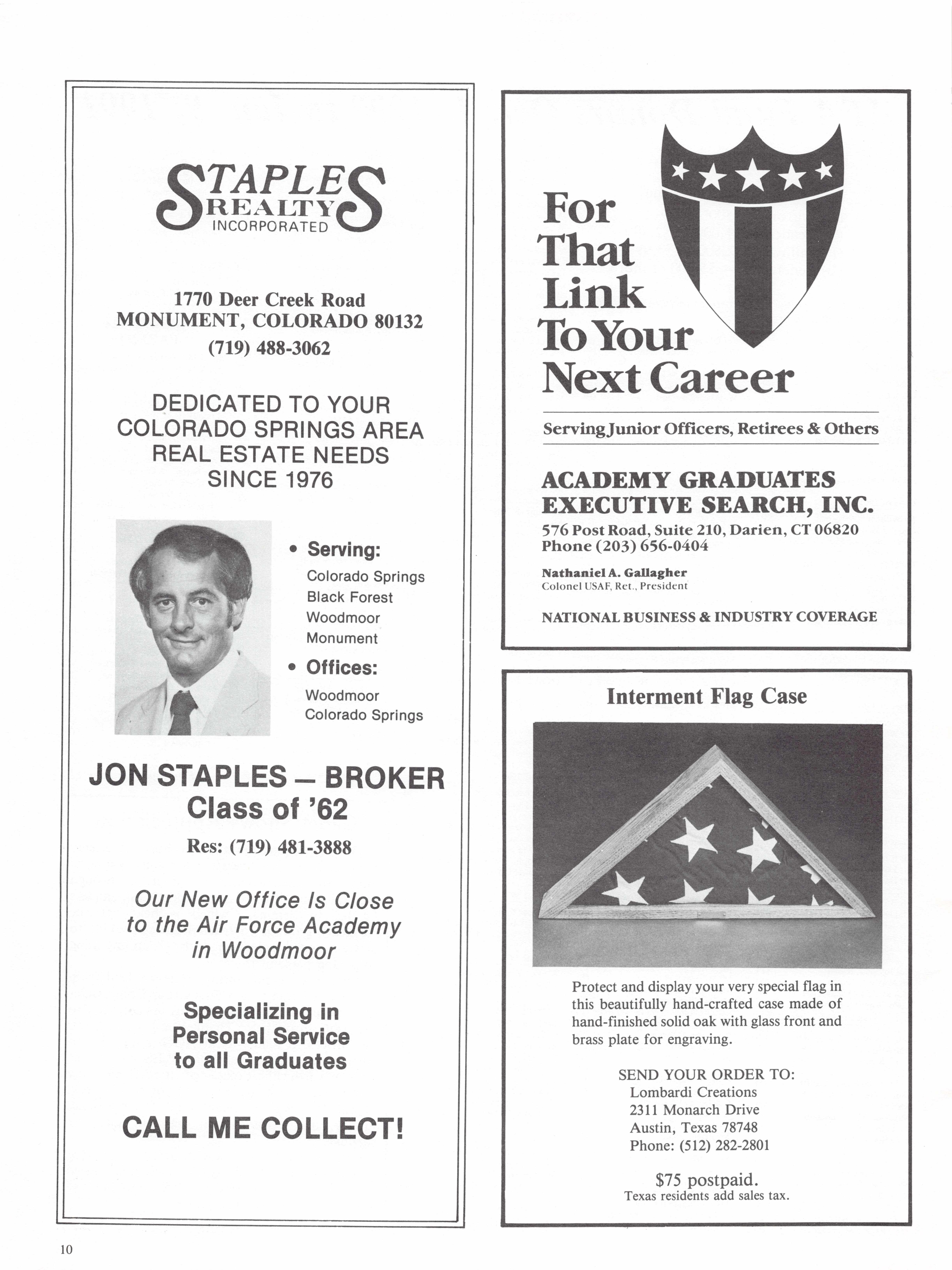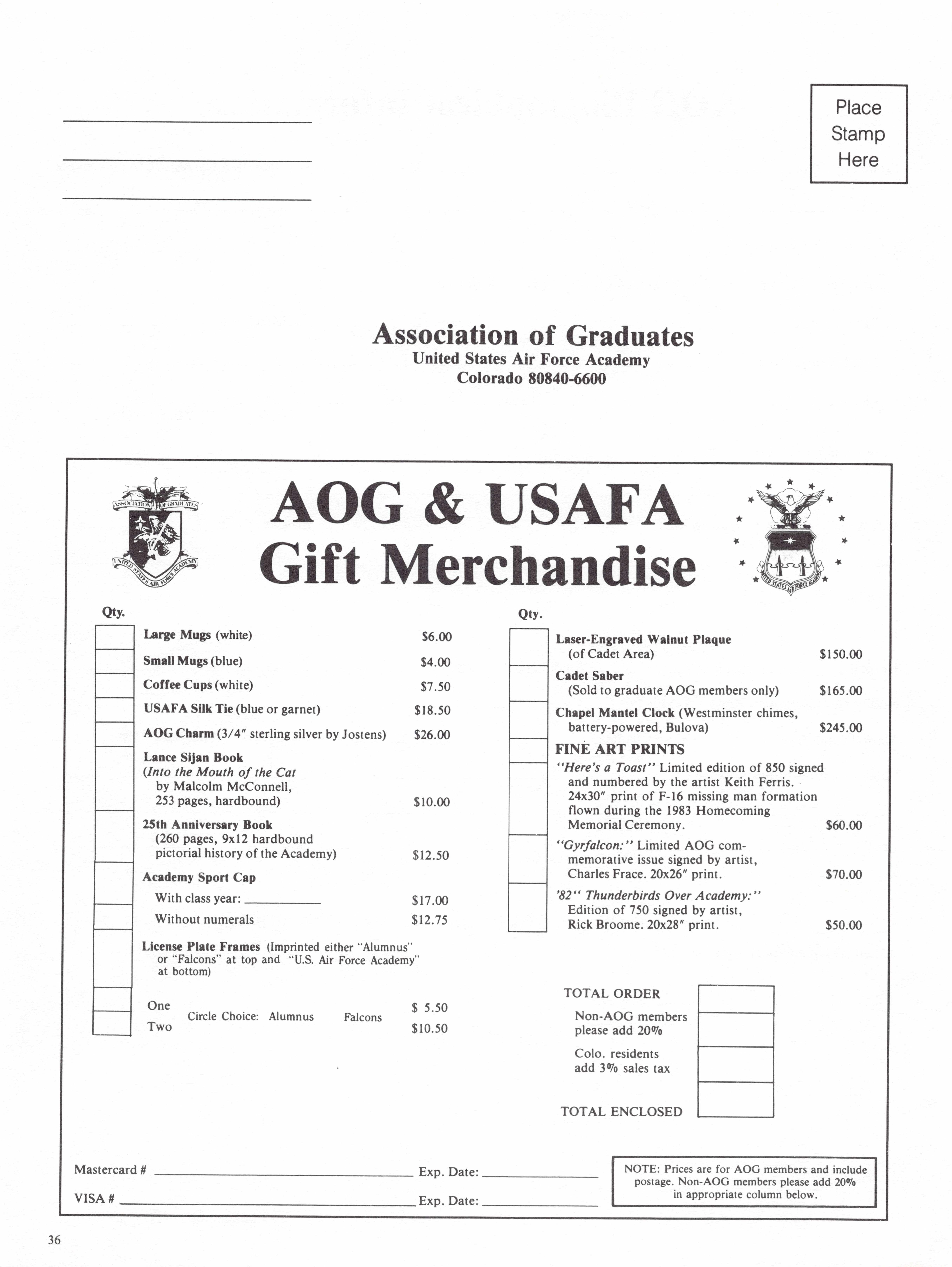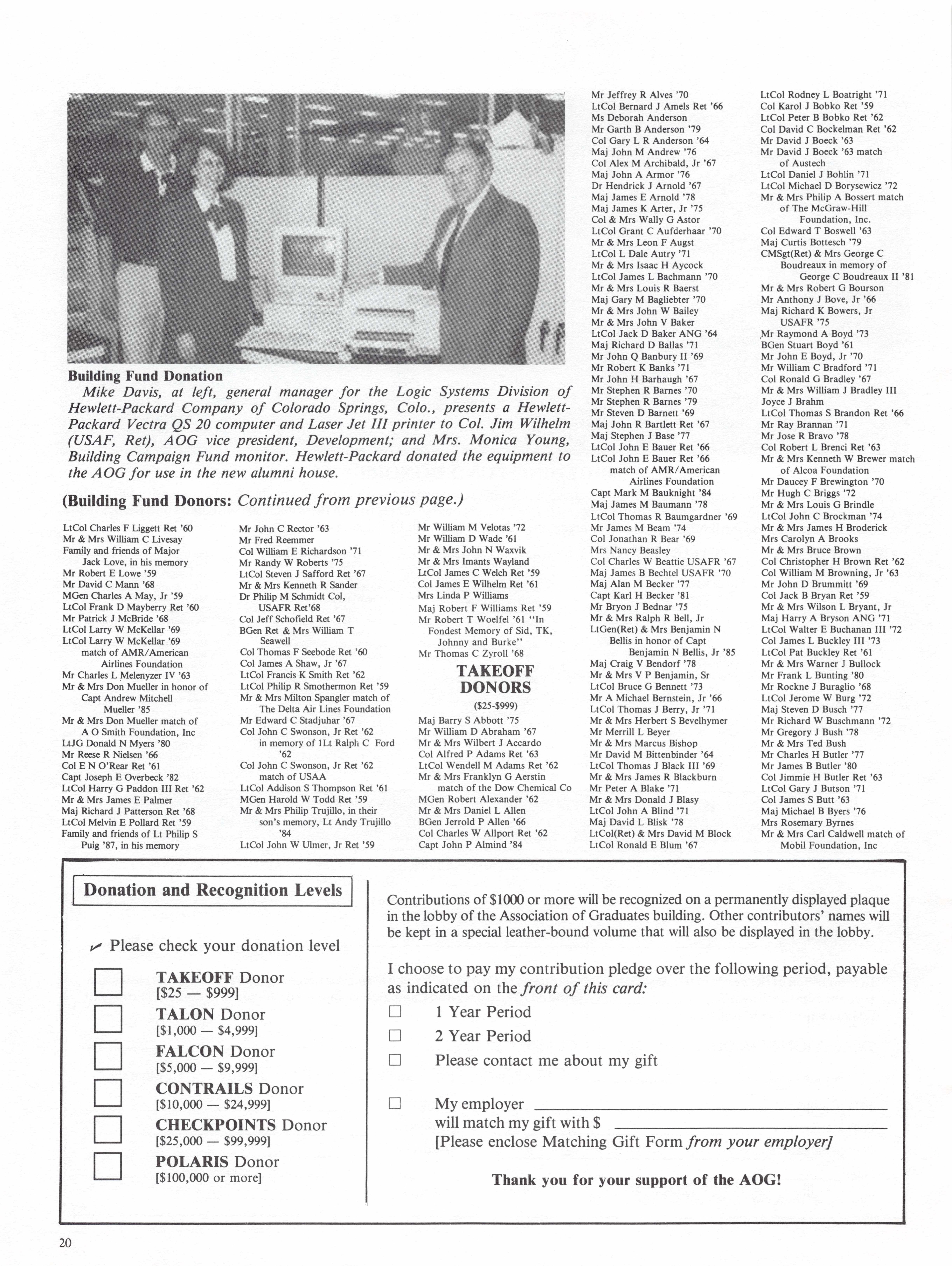 Membership Privileges Equal Now, take advantage of this Great Bene fi t! Travel Insurance (up to $100,000) provided at NO addtional cost. Emergency Cash— 24 hours aday, 7 days aweek, at any Plus Systenf ATM. Air Academy National Bank s MasterCard issued exclusively for Members of the Association of Graduates. (There are thousands of locations worldwide). $1,000 Hospital Idenmity Plan. A25-Day (jrace Period. Additional Card at NO eictra cost. Discount at Car Rentals. (Hertz and National Car Rental). SPECUa FEATURES: Effective 1/2/91. Annual Percentage Rate of 14.9%. Pre-Approved $5,000 Credit line. (Approval subject to credit history verification). Call or write today for your Association of Graduates MasterCard application... You’ll be glad you did! 1-800-365-5890 iUr Academy Nattonof Bank— The "Home Bank" of the Air Force. MasterCard Department*Air Academy National Bank Post Of fi ce Box 10 ● USAFA, Colorado 80840 Telephone: (719) 598-2933 Association of Graduates United States Air Force Academy USAF Academy, CO 80840 Note: Continuing AOG membership is aprerequisite for card issue and renewal. MM.