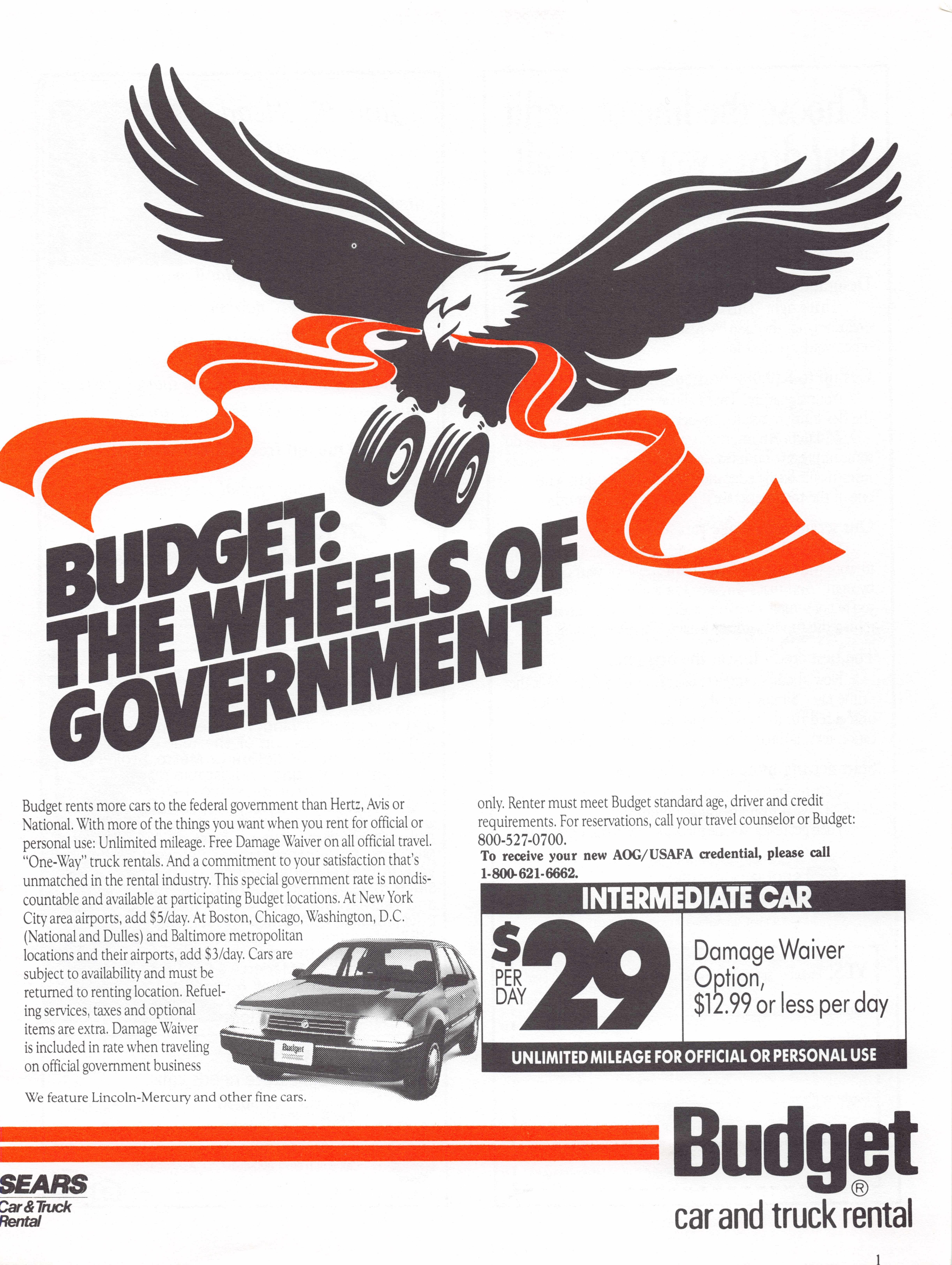 BudgetrentsmorecarstothefederalgovernmentthanHertz,Avisor National. With more of the things you want when you rent for official or personaluse:Unlimitedmileage.FreeDamageWaiveronallofficialtravel. “One-Way" truck rentals.And acommitment to your satisfaction that’s unmatchedintherentalindustry.ThisspecialgovernmentrateisnondiscountableandavailableatparticipatingBudgetlocations.AtNewYork Cityareaairports,add$5/day.AtBoston,Chicago,Washington,D.C. (NationalandDulles)andBaltimoremetropolitan locationsandtheirairports,add$3/day.Carsare subject to availability and must be returned to renting location. Refueling services, taxes and optional items are extra. Damage Waiver is included in rate when traveling on official government business