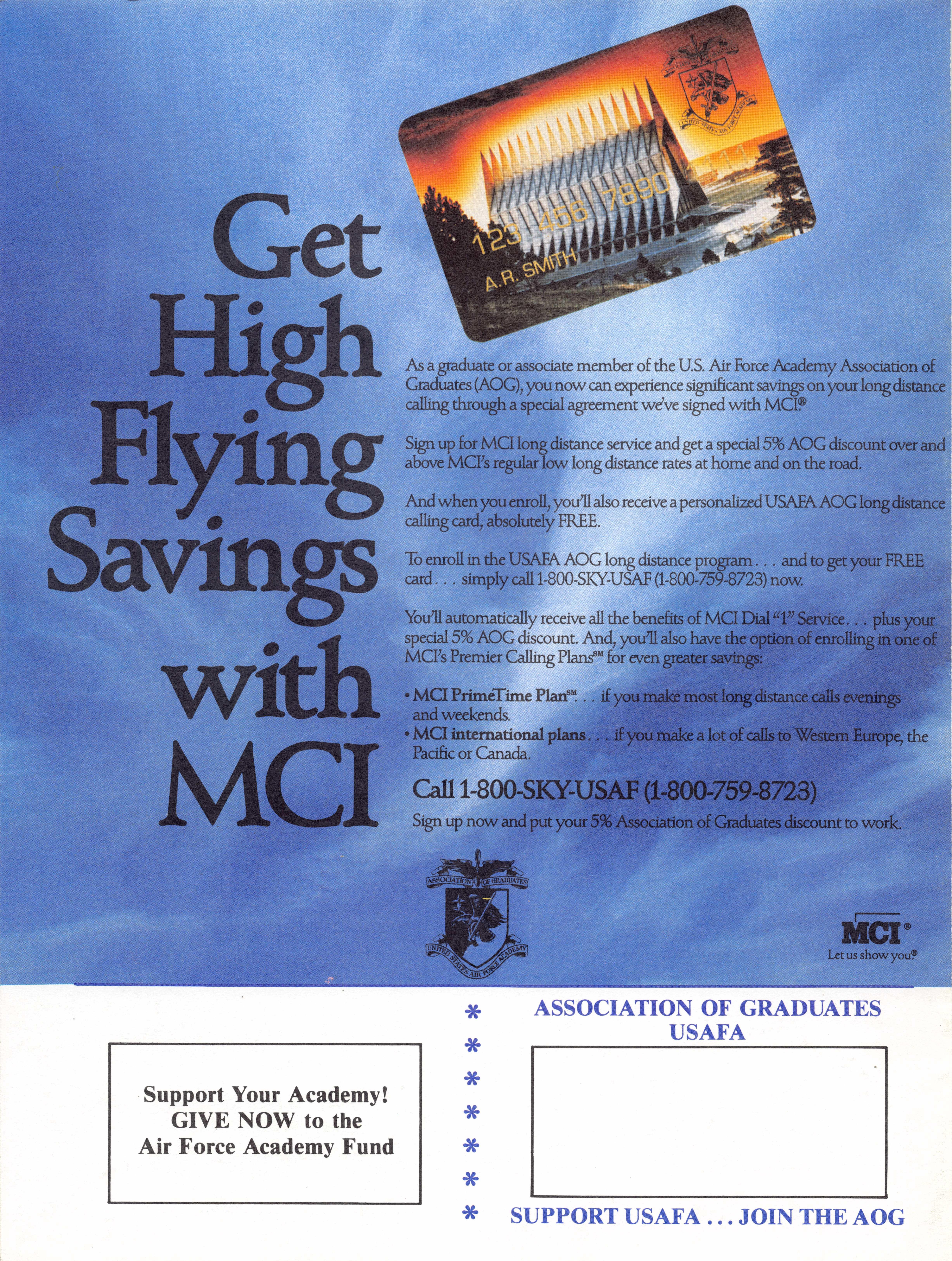 MQ Call 1-800-SKY-USAF (1-800-759-8723) Signupnowandputyour5%AssociationofGraduatesdiscounttowork. MCI Let us show you® ASSOCIATION OF GRADUATES USAFA * * * Support Your Academy! GIVE NOW to the Air Force Academy Fund * * * * SUPPORT USAFA ... JOIN THE AOG