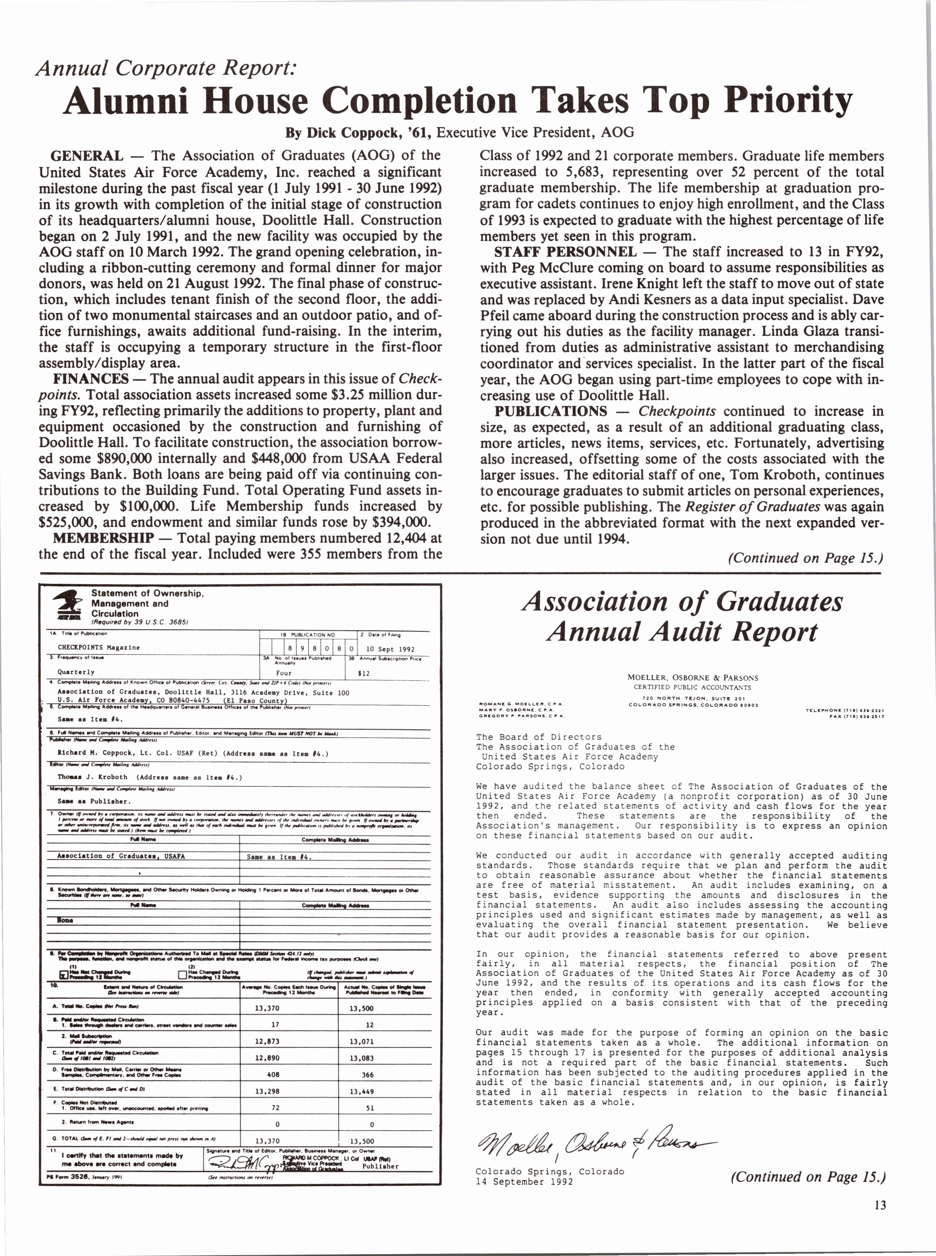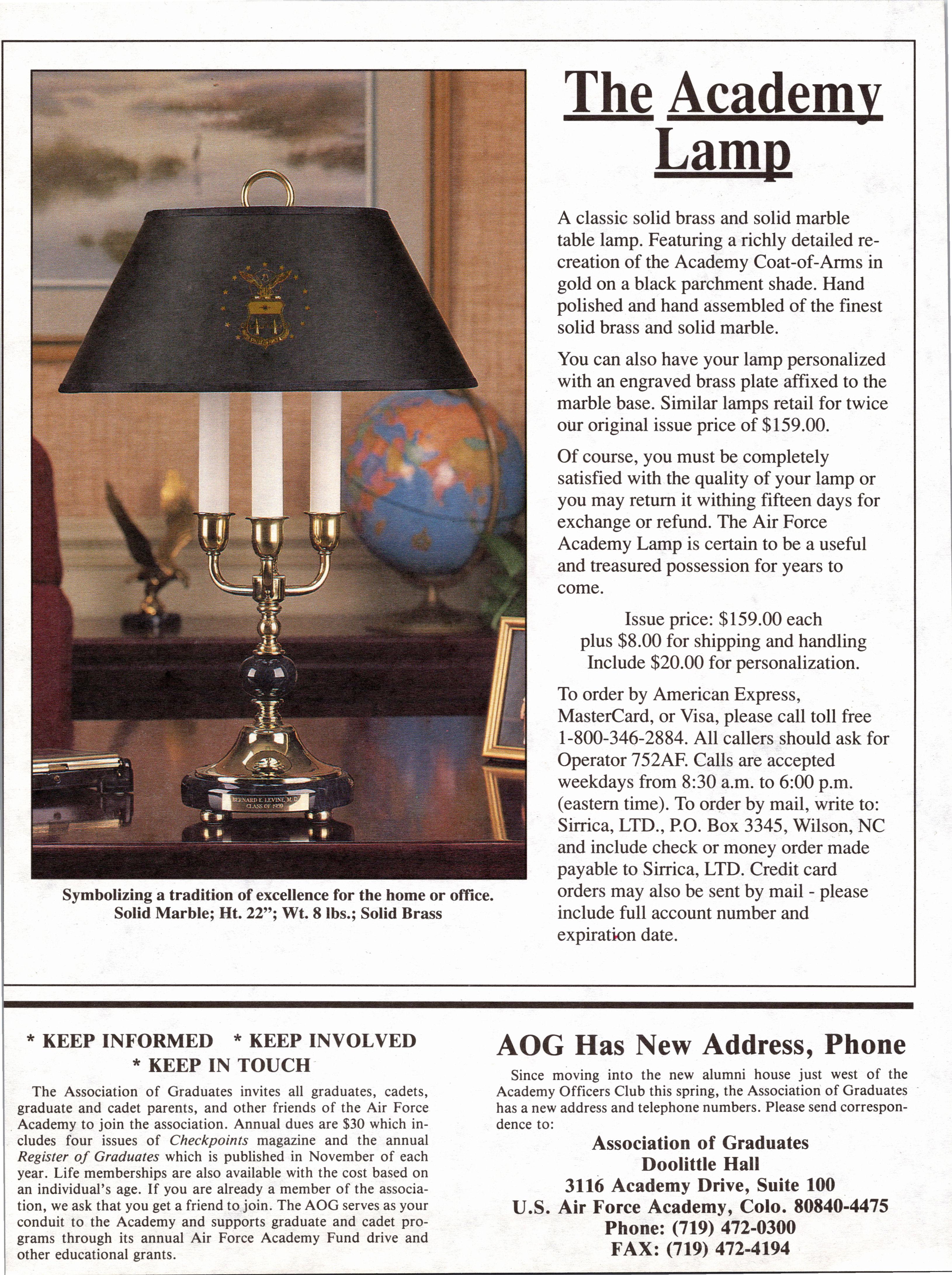 CHECKPOINTS (ISSN 0274-7391) (USPS 898-080) is published quarterly in February, May, August and November by the Association of Graduates, U.S. Air Force Academy. (Phone: 719-472-0300, DSN: 259-2067. FAX: 719-472-4194.) It is provided as part of a $30 subscription package of which the magazine accounts for $10. Single copies of CHECKPOINTS for members $2.50, for nonmembers $3.50. Second-class postage paid at the U.S. Air Force Academy, Colo. POSTMASTER: