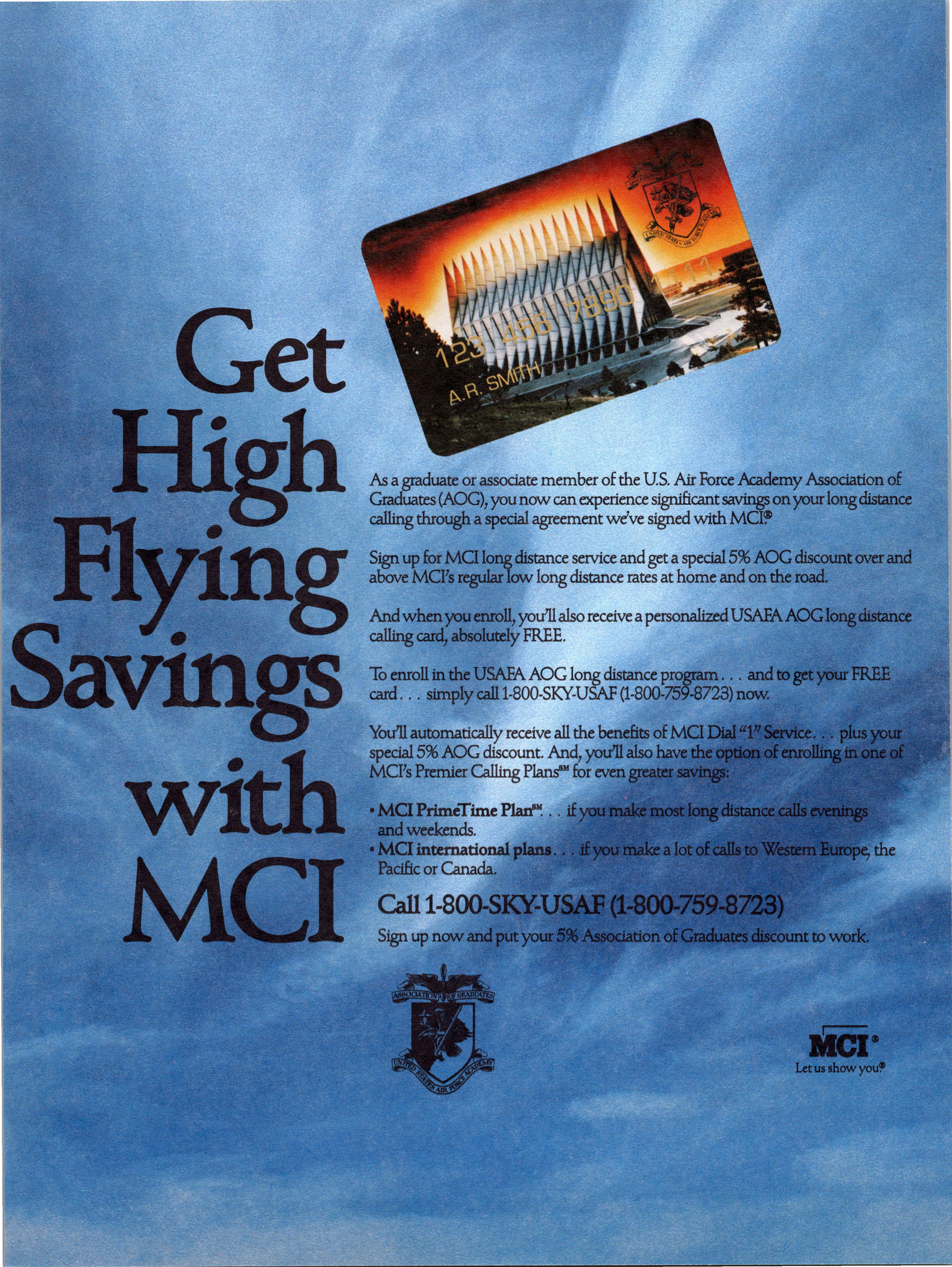 As a graduate or associate member ofthe U.S. Air Force Academy Association of Graduates(AOG); you now can experiencesignificantsavings on yourlongdistance callingthrough a special agreement weVe signed with MCI®