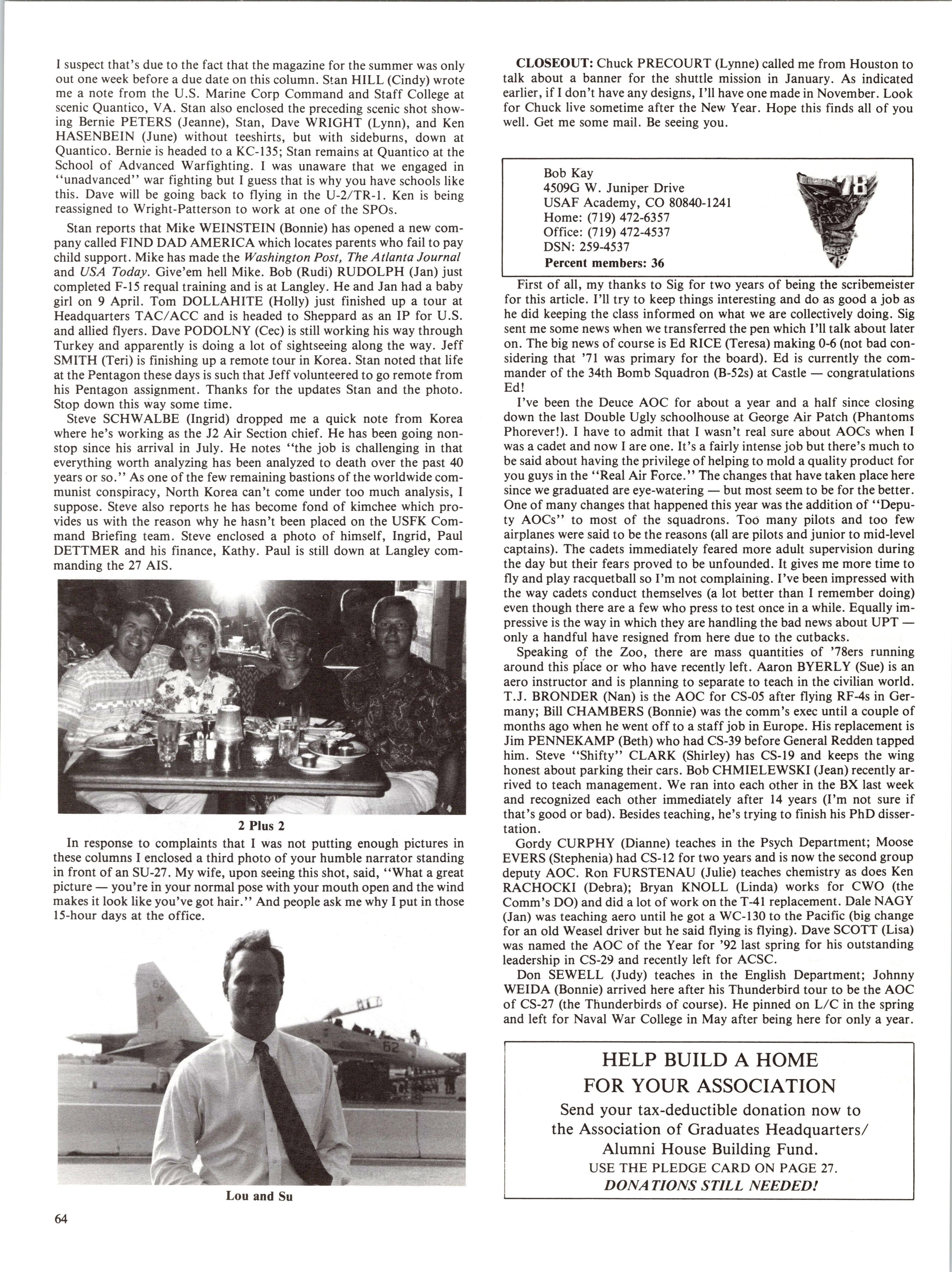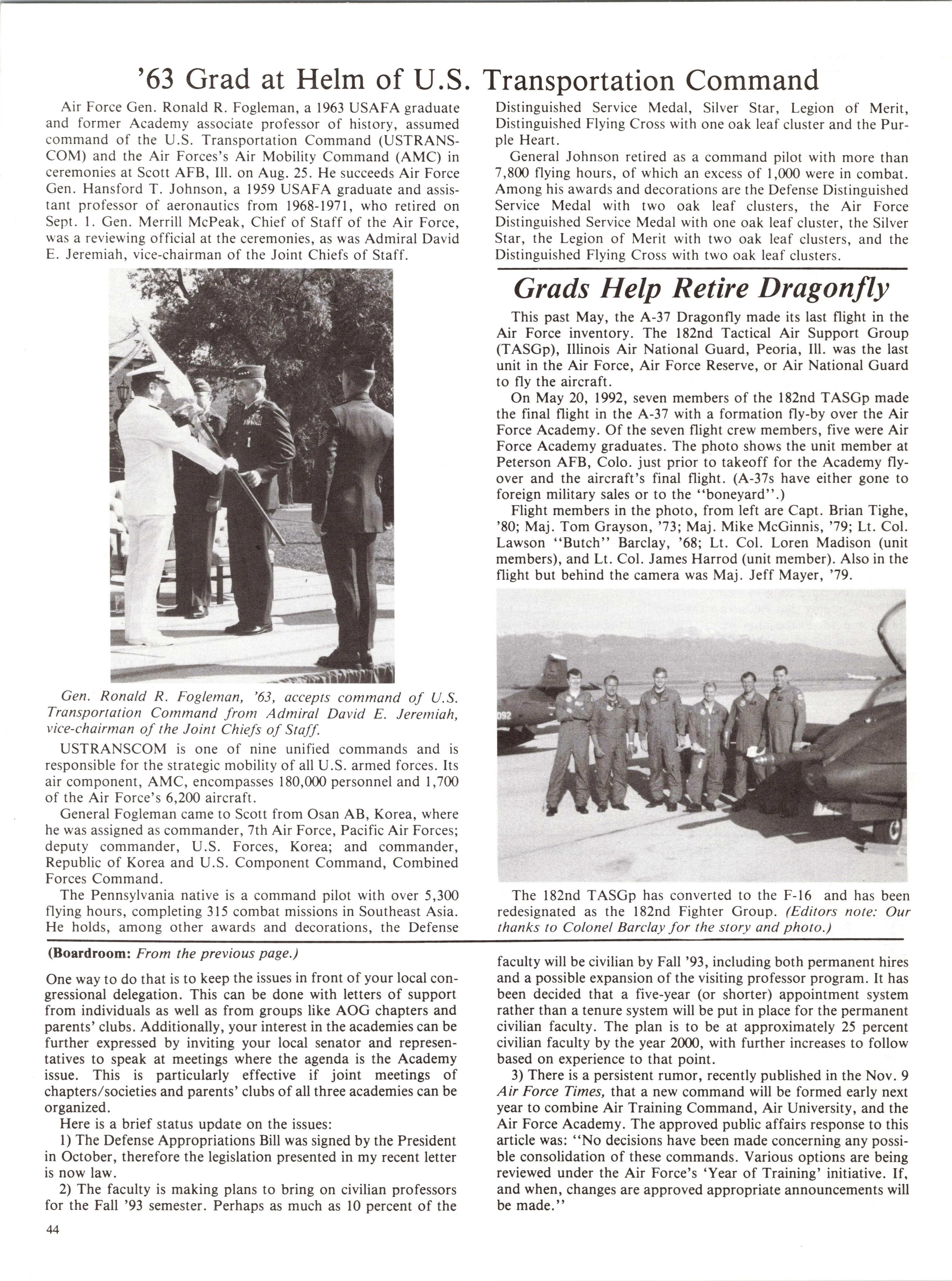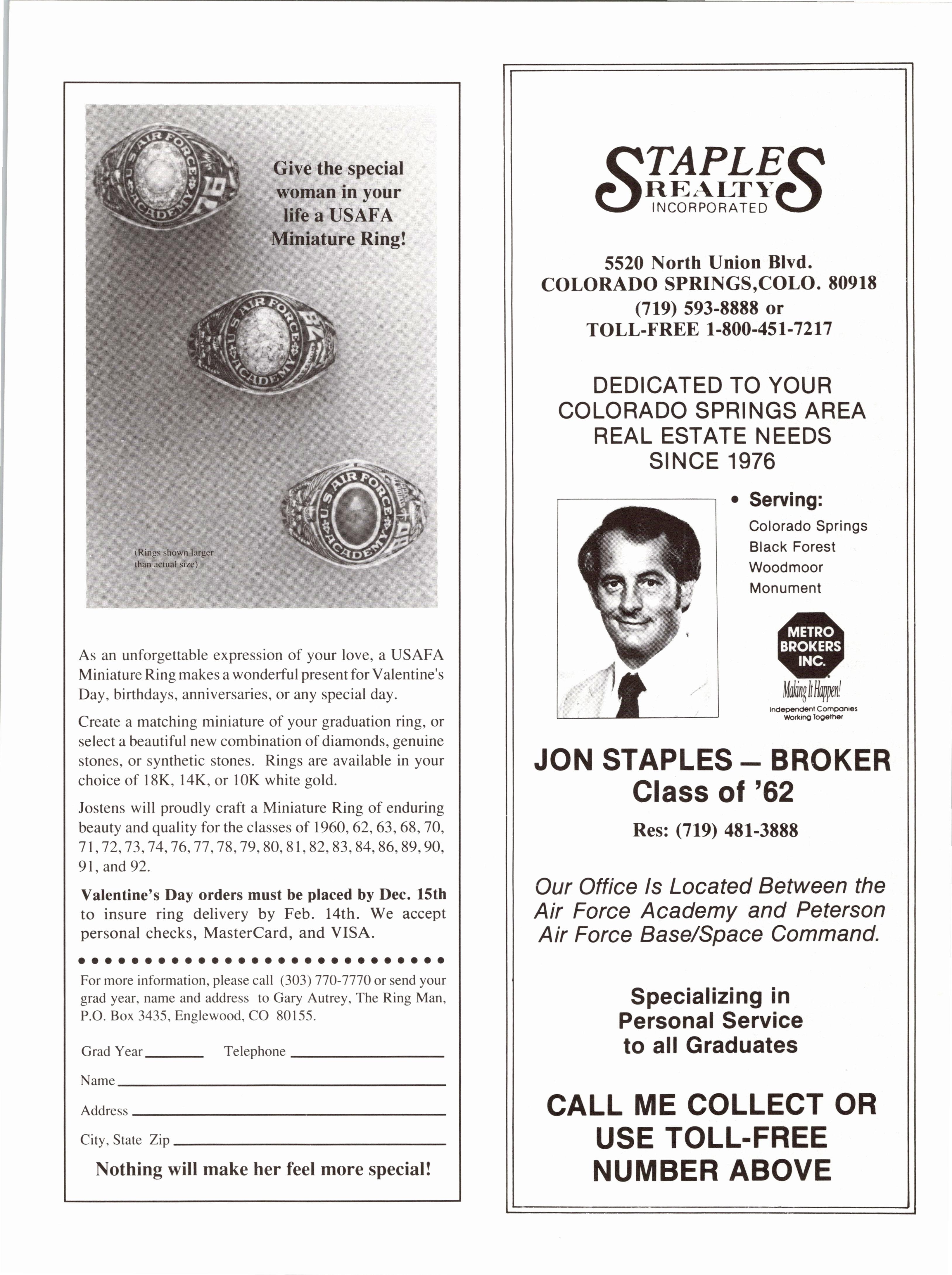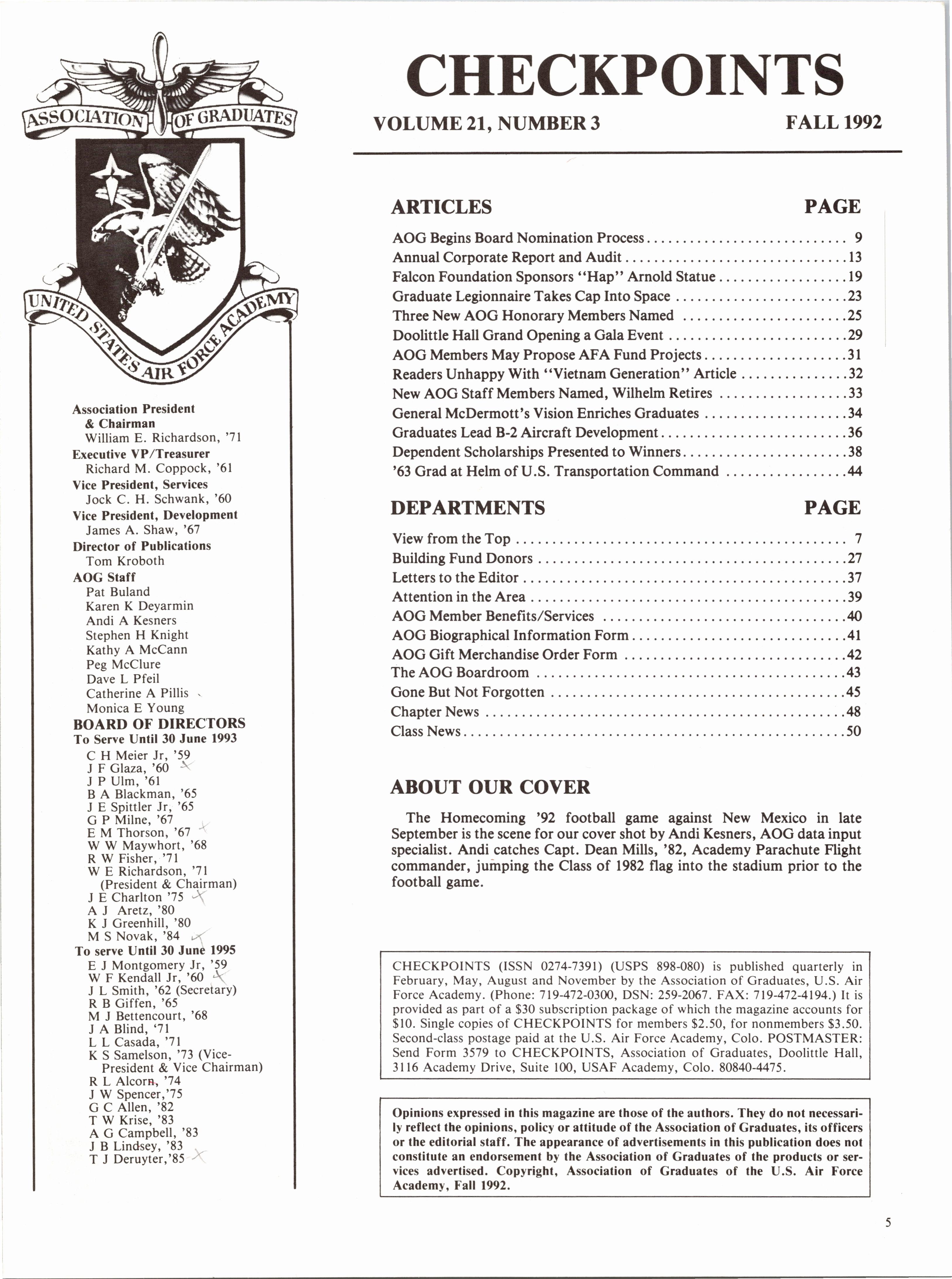 Opinions expressed in this magazine are those of the authors. They do not necessarily reflect the opinions, policy or attitude of the Association of Graduates, its officers or the editorial staff. The appearance of advertisements in this publication does not constitute an endorsement by the Association of Graduates of the products or services advertised. Copyright, Association of Graduates of the U.S. Air Force Academy, Fall 1992.