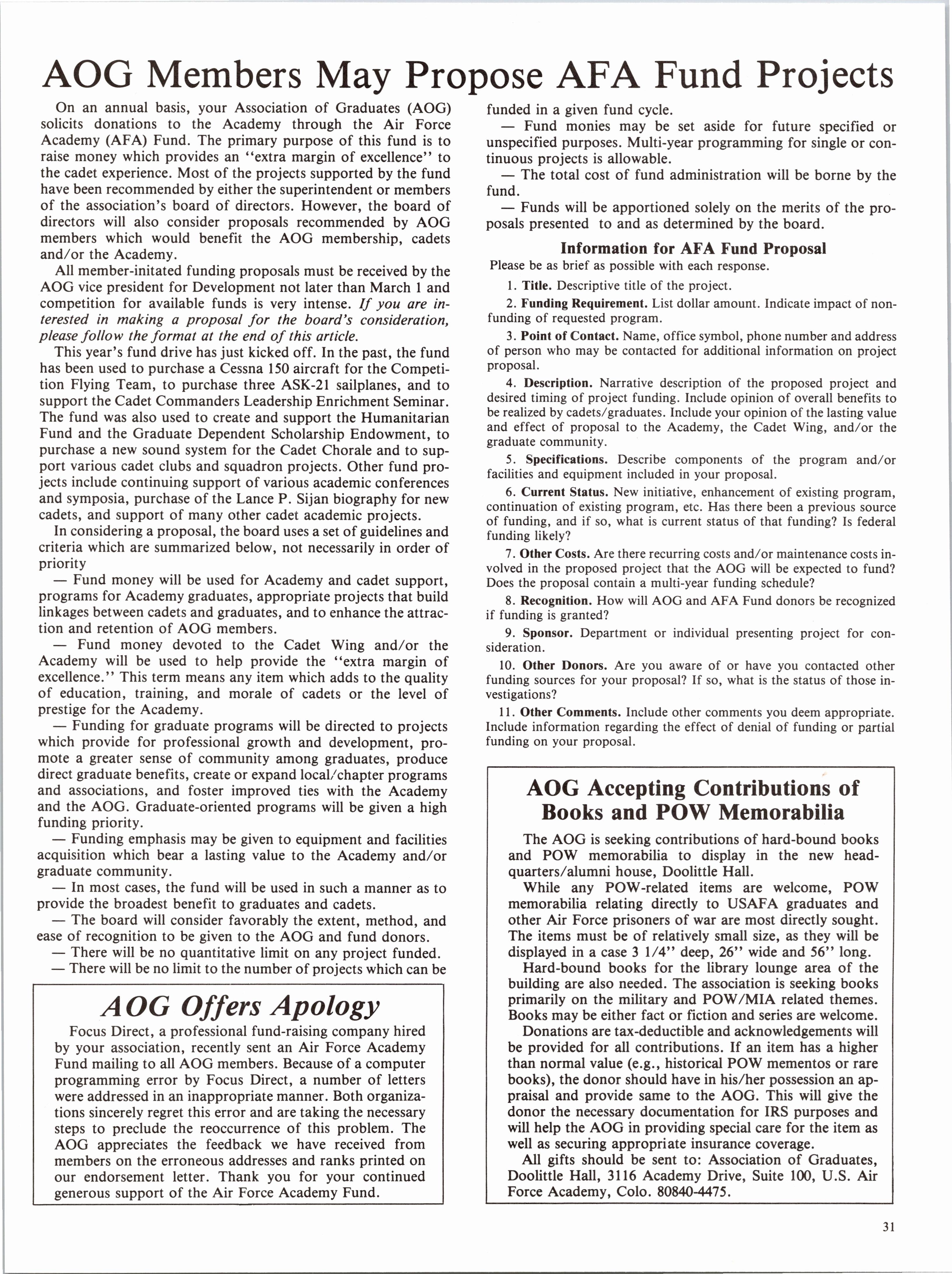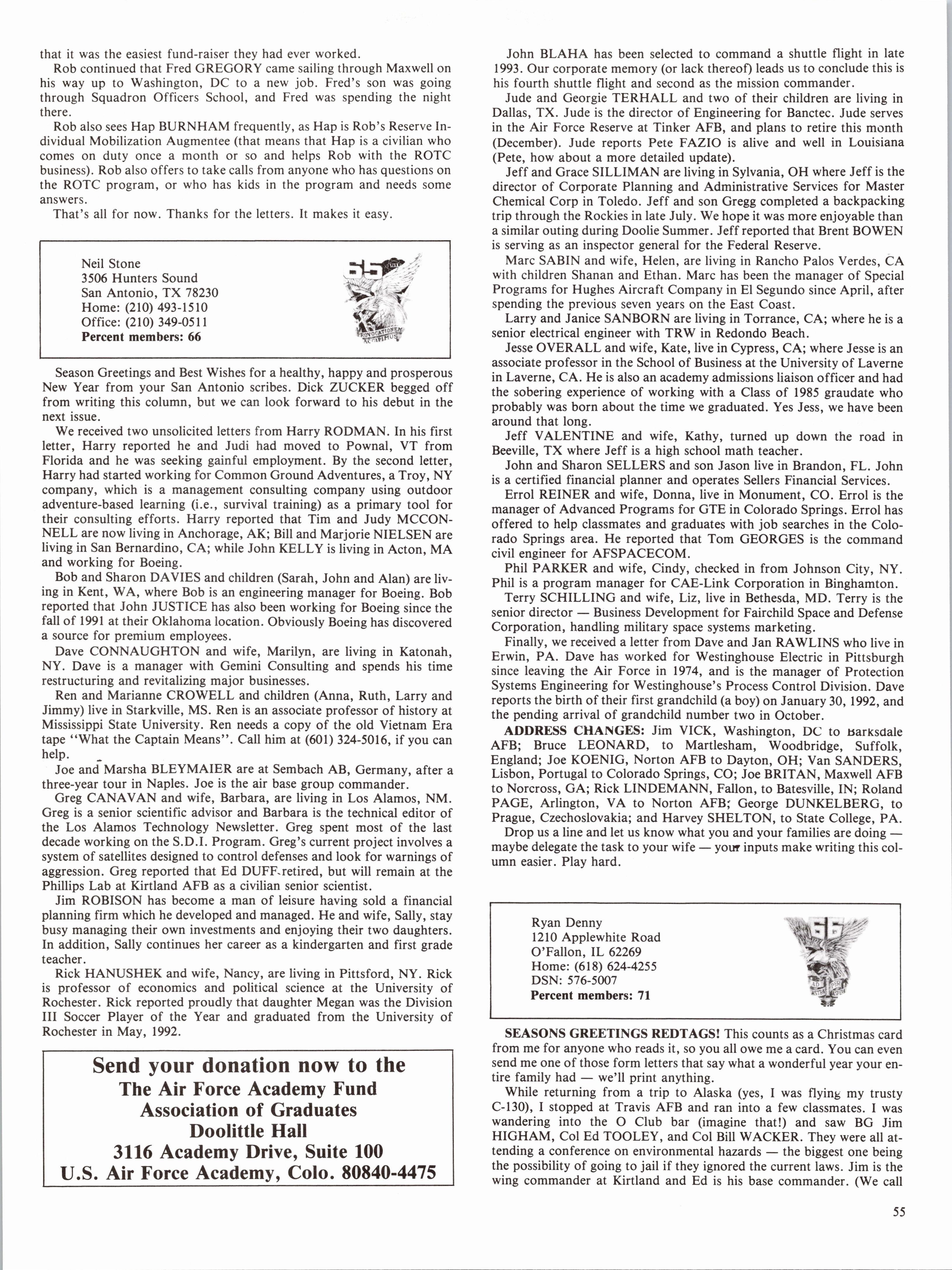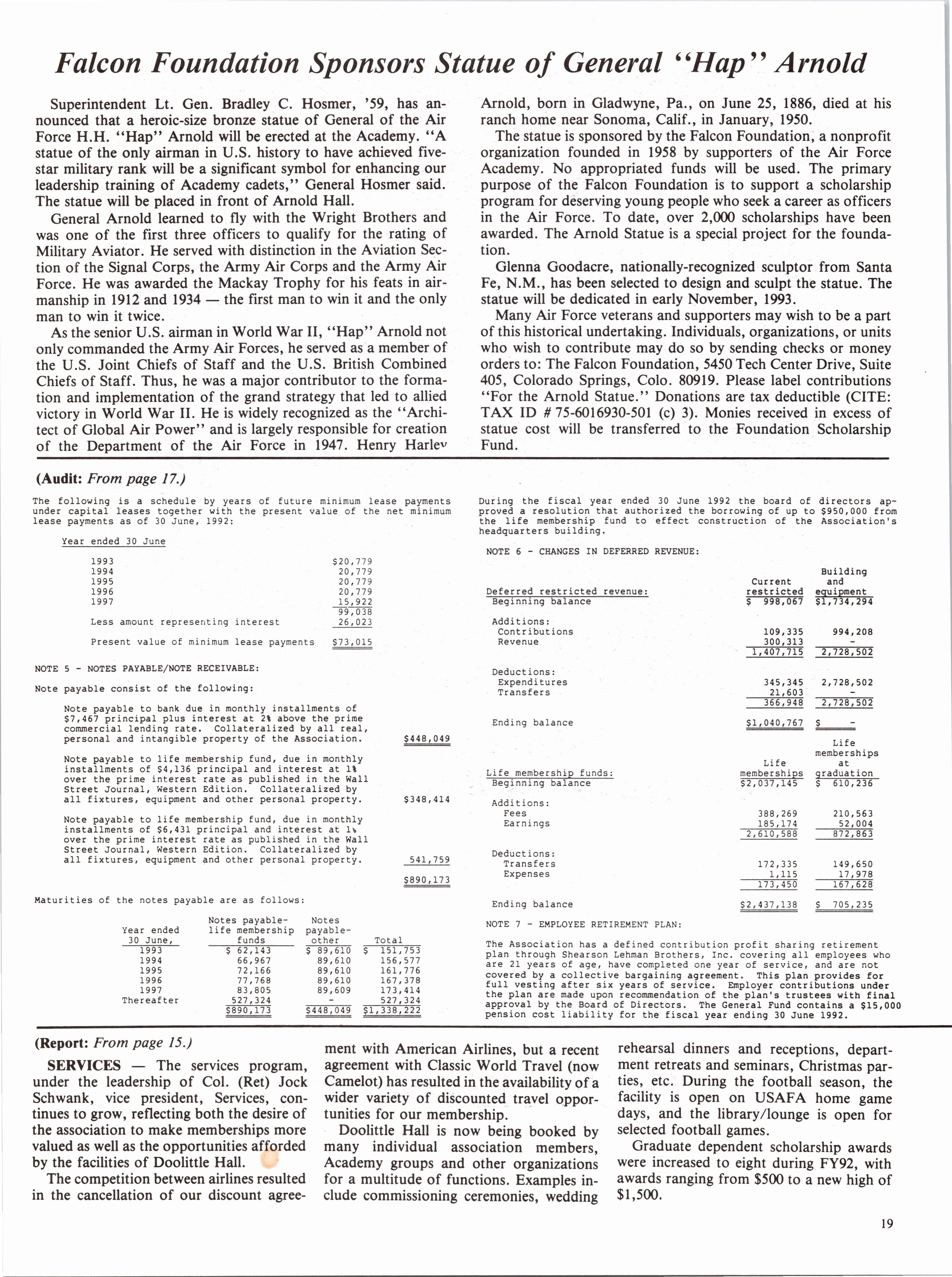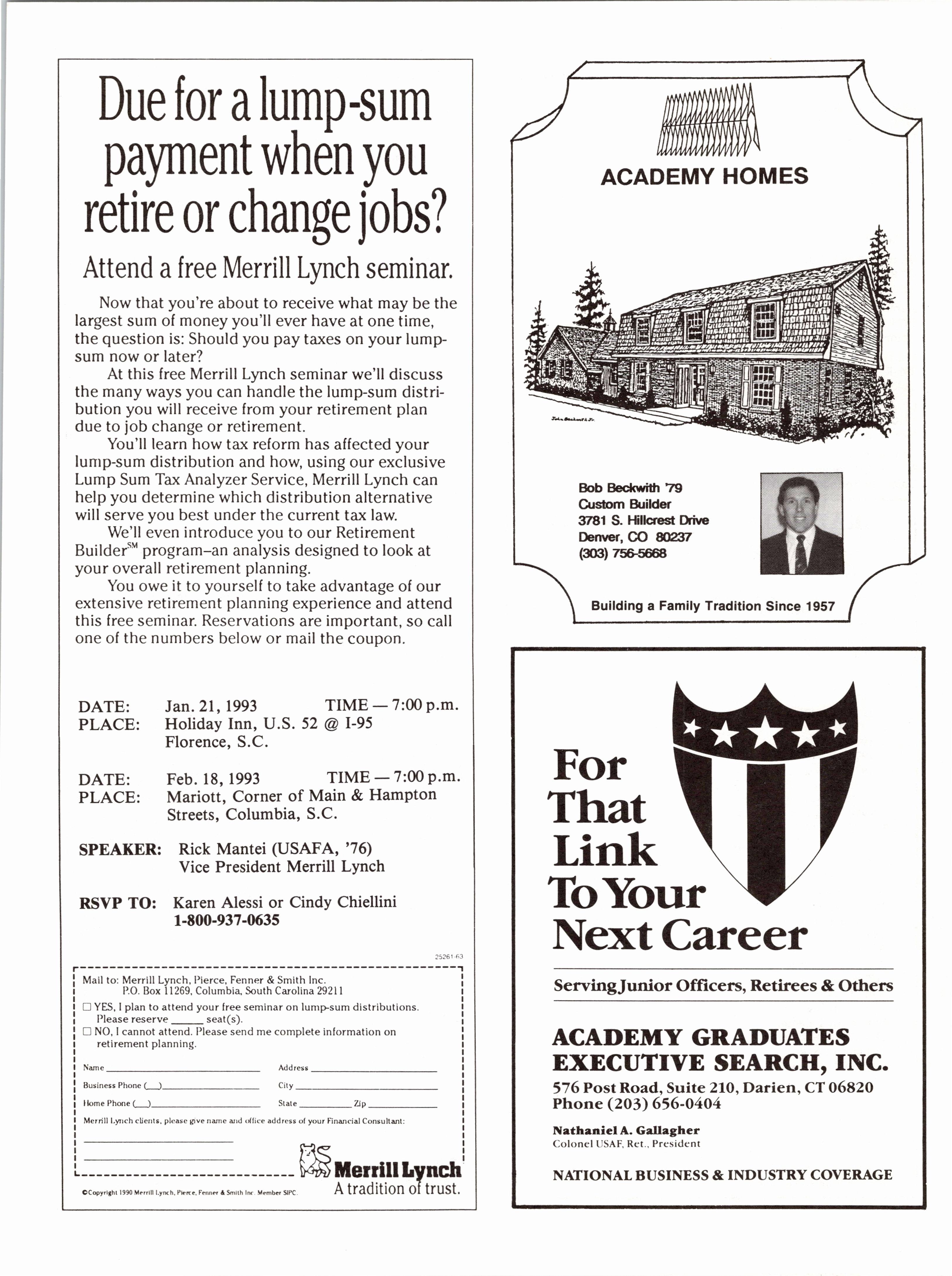 Opinions expressed in this magazine are those of the authors. They do not necessarily reflect the opinions, policy or attitude of the Association of Graduates, its officers or the editorial staff. The appearance of advertisements in this publication does not constitute an endorsement by the Association of Graduates of the products or services advertised. Copyright, Association of Graduates of the U.S. Air Force Academy, Fall 1992.