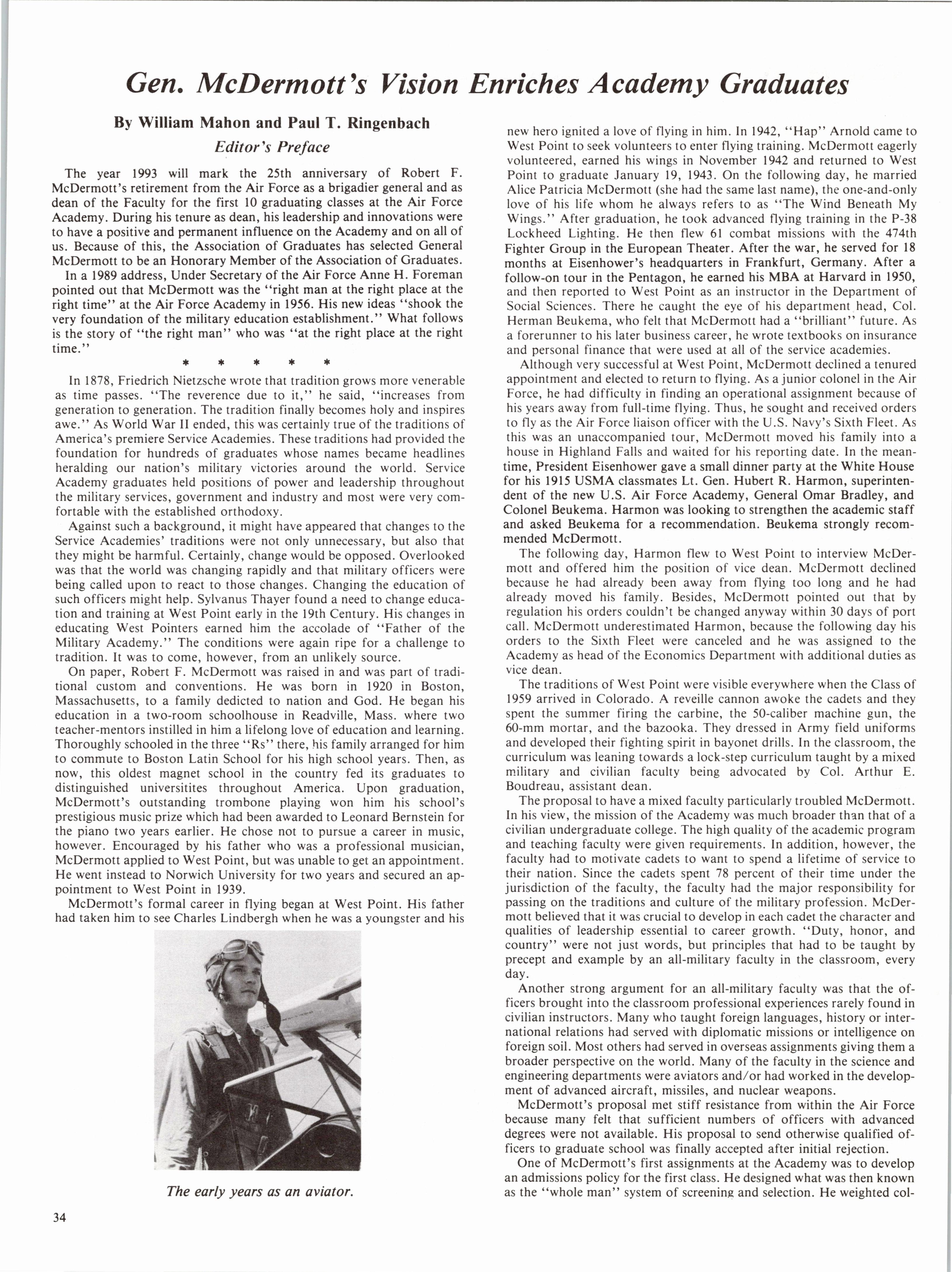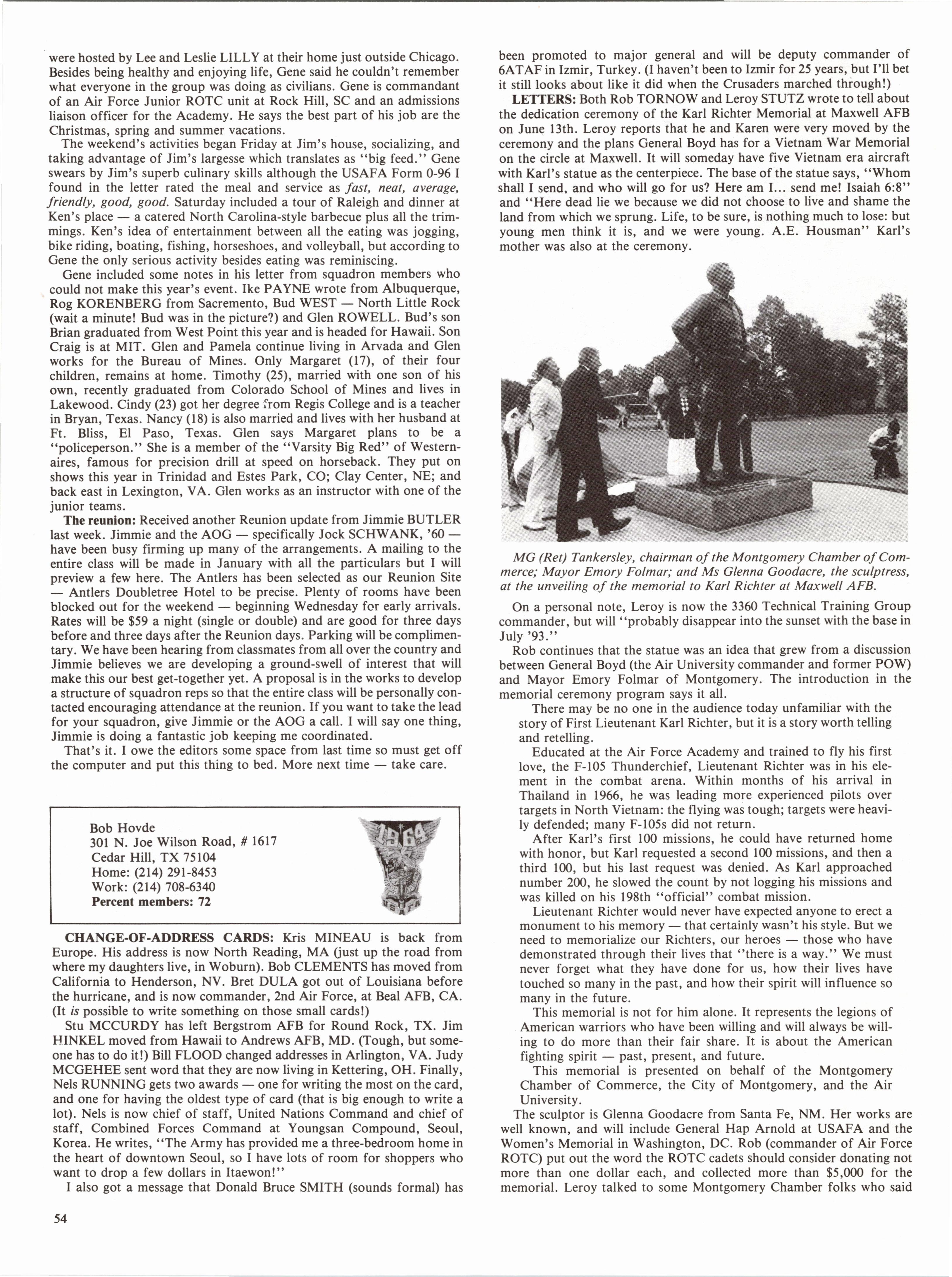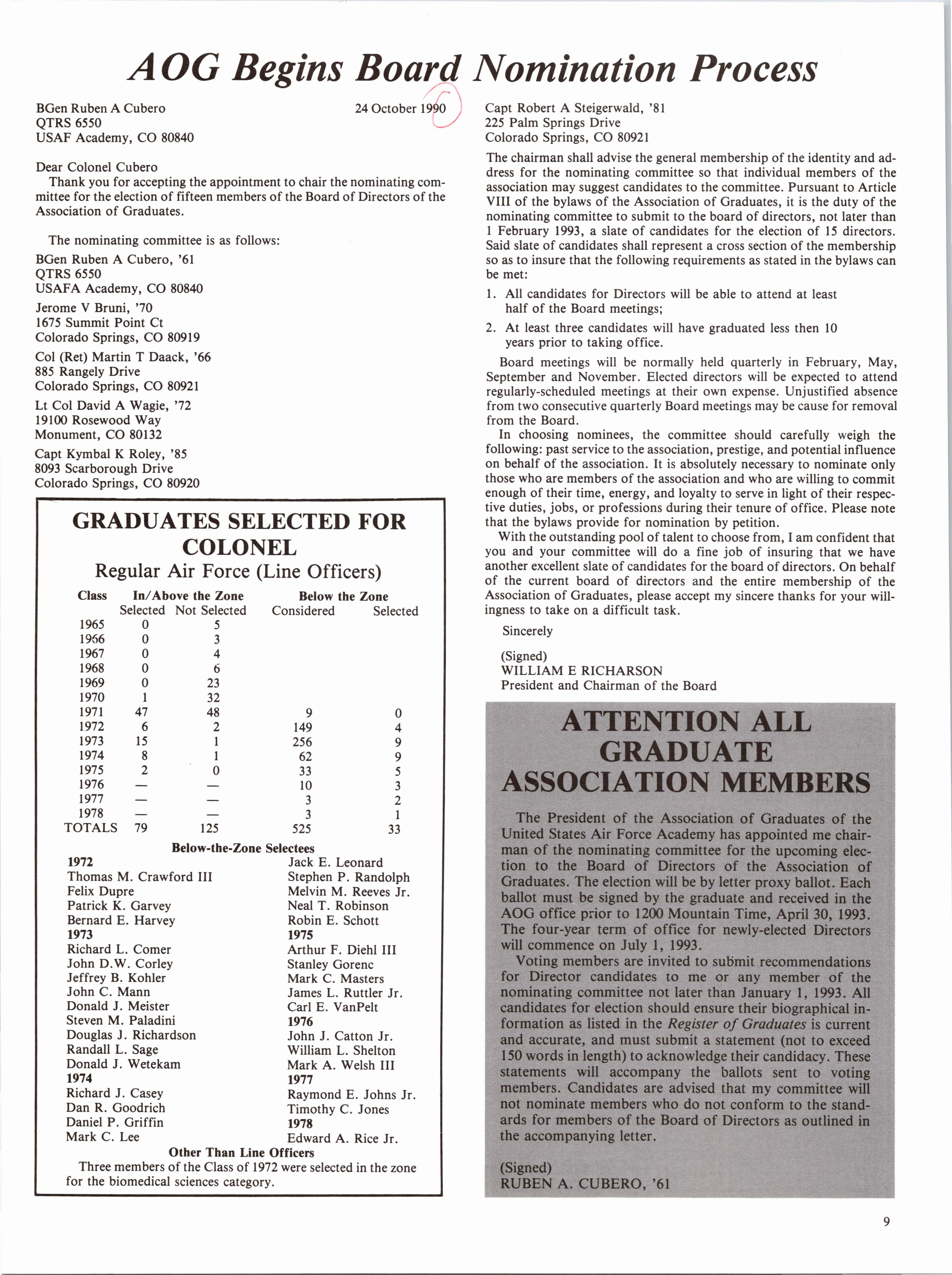 WILLIAM E RICHARSON President and Chairman of the BoardThe President of the Association of Graduates of the United States Air Force Academy has appointed me chairman of the nominating committee for the upcoming election to the Board of Directors of the Association of Graduates. The election will be by letter proxy ballot. Each ballot must be signed by the graduate and received in the AOG office prior to 1200 Mountain Time, April 30, 1993. The four-year term of office for newly-elected Directors will commence on July 1, 1993.