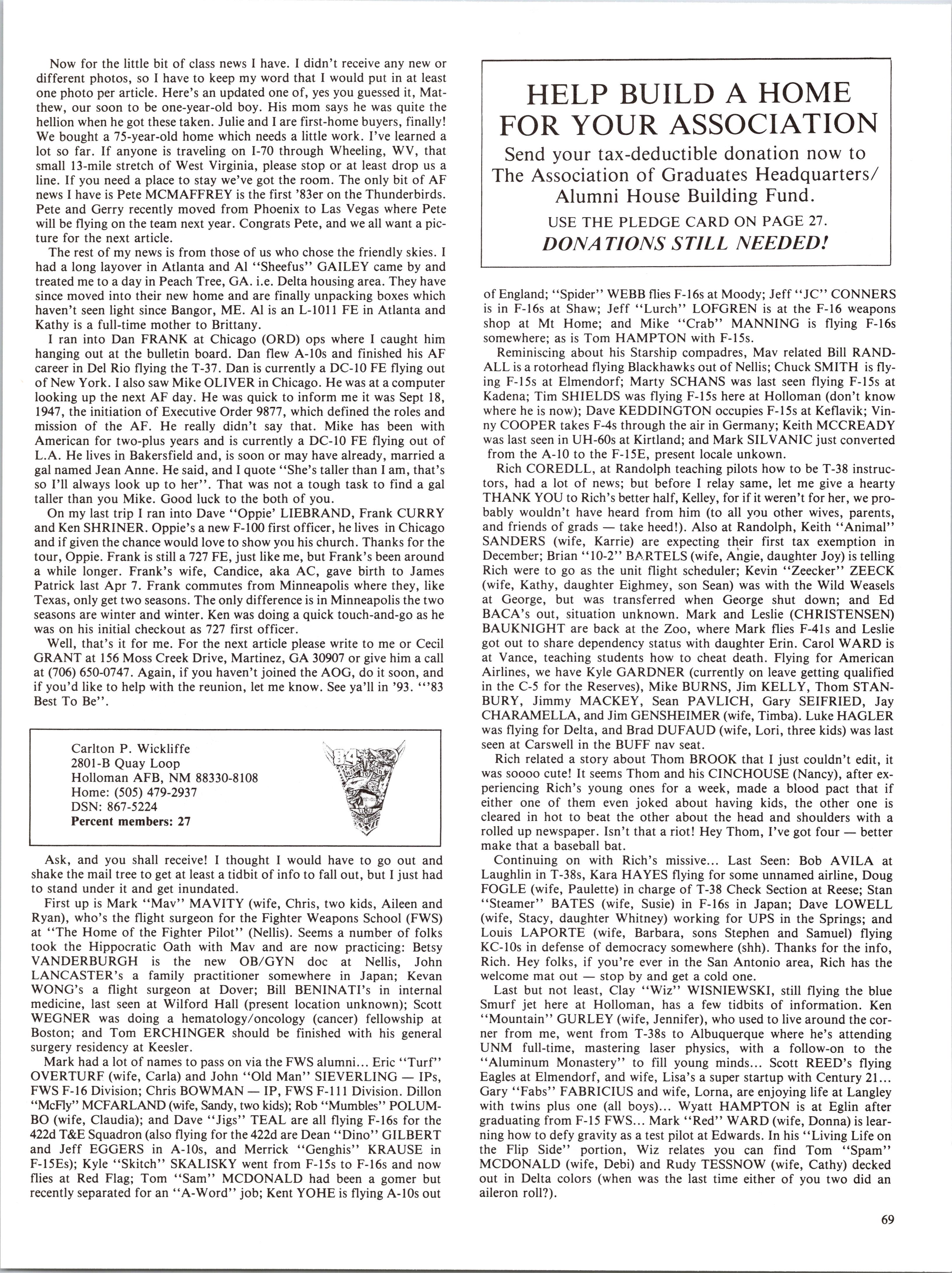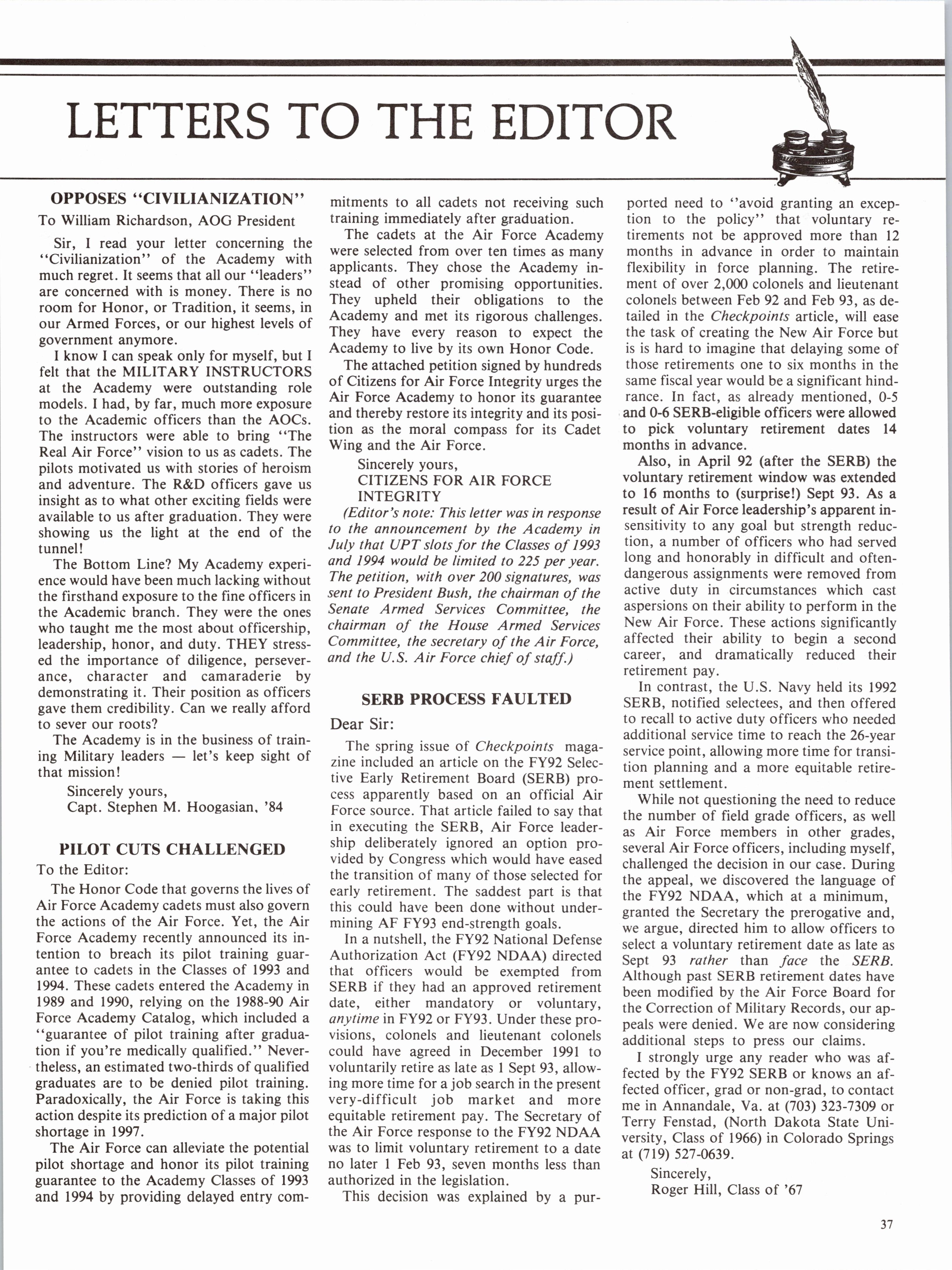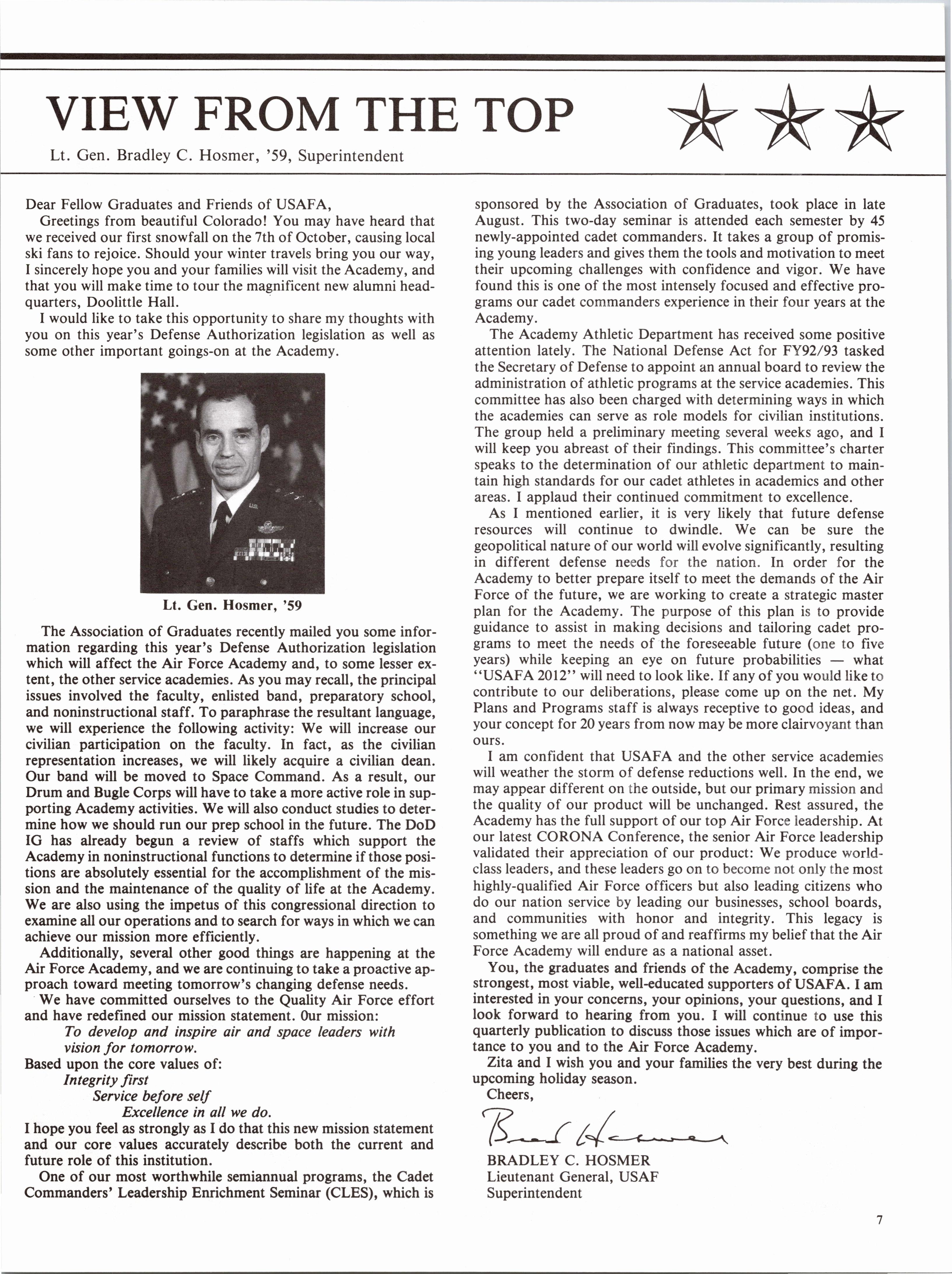 You, the graduates and friends of the Academy, comprise the strongest, most viable, well-educated supporters of USAFA. I am interested in your concerns, your opinions, your questions, and I look forward to hearing from you. I will continue to use this quarterly publication to discuss those issues which are of importance to you and to the Air Force Academy.