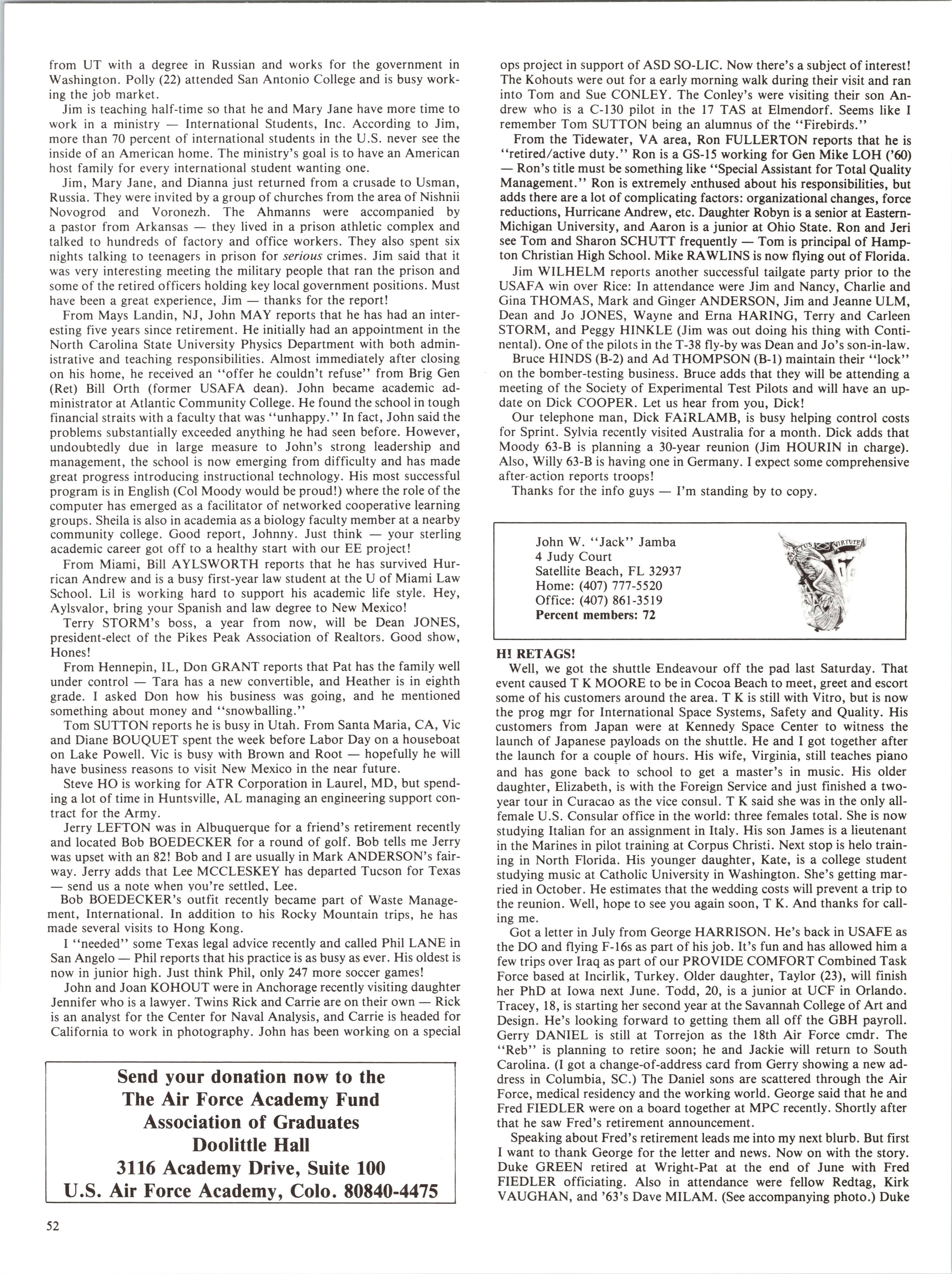 Dear Fellow Graduates and Friends of USAFA, Greetings from beautiful Colorado! You may have heard that we received our first snowfall on the 7th of October, causing local ski fans to rejoice. Should your winter travels bring you our way, I sincerely hope you and your families will visit the Academy, and that you will make time to tour the magnificent new alumni headquarters, Doolittle Hall.