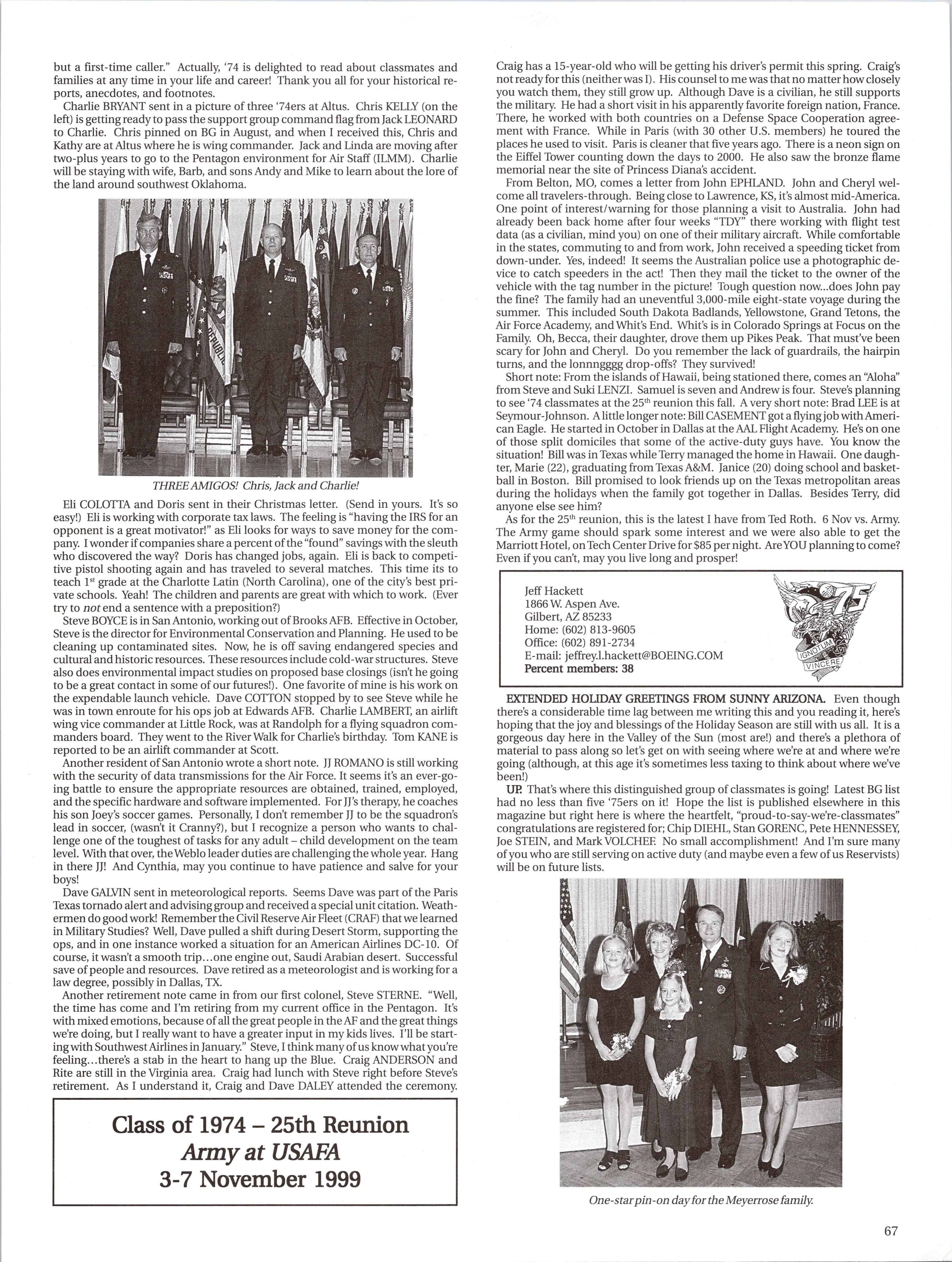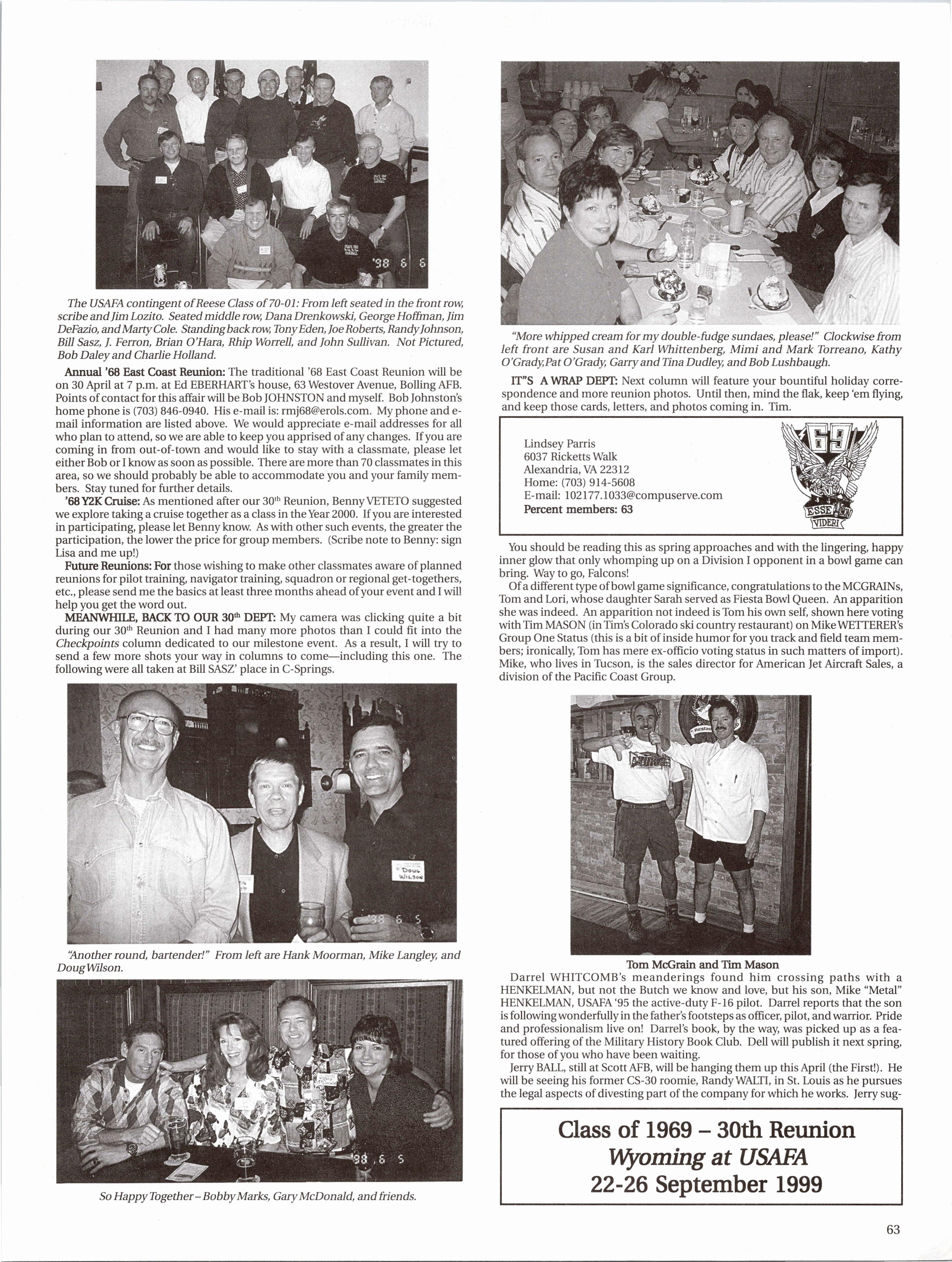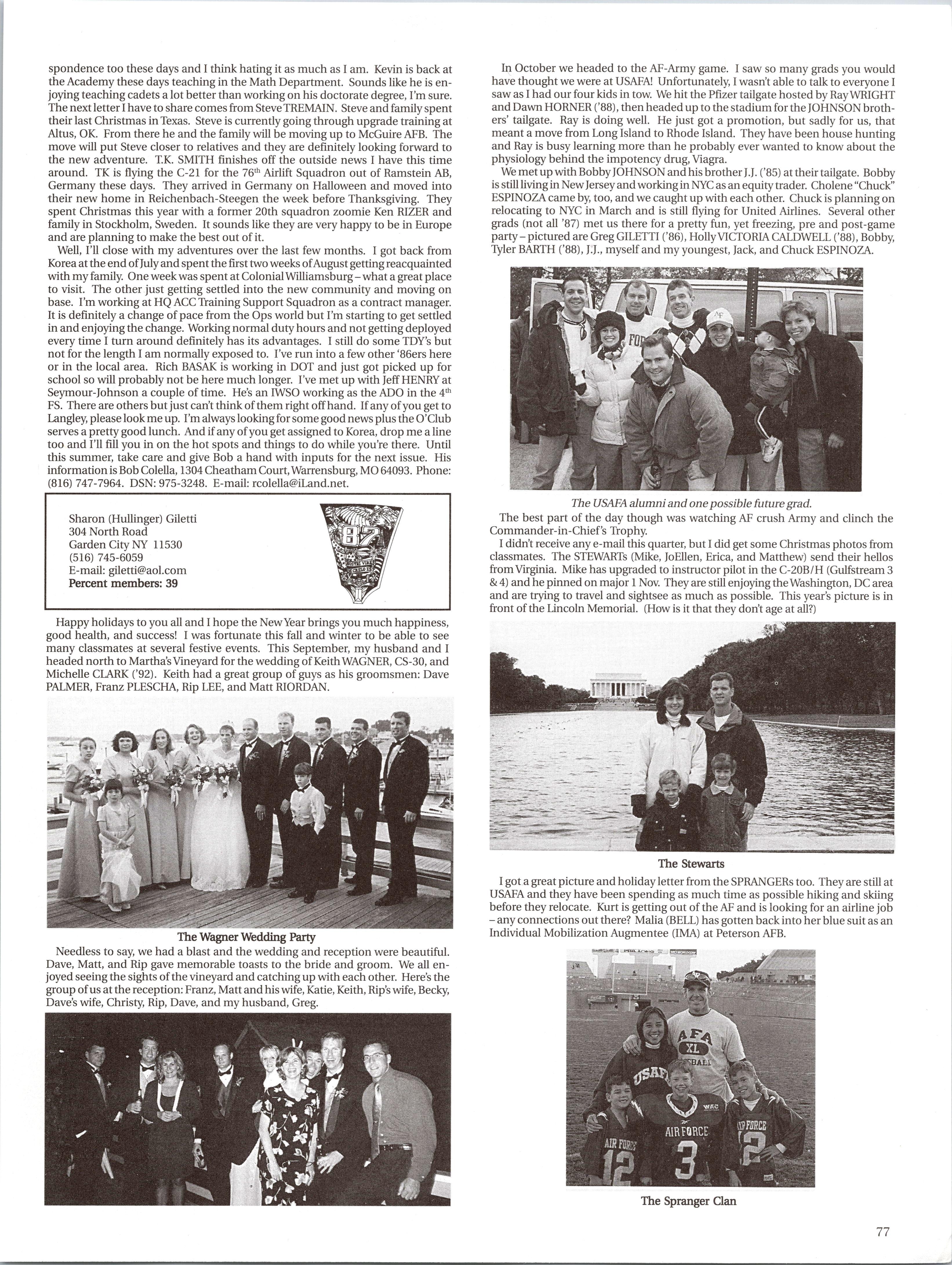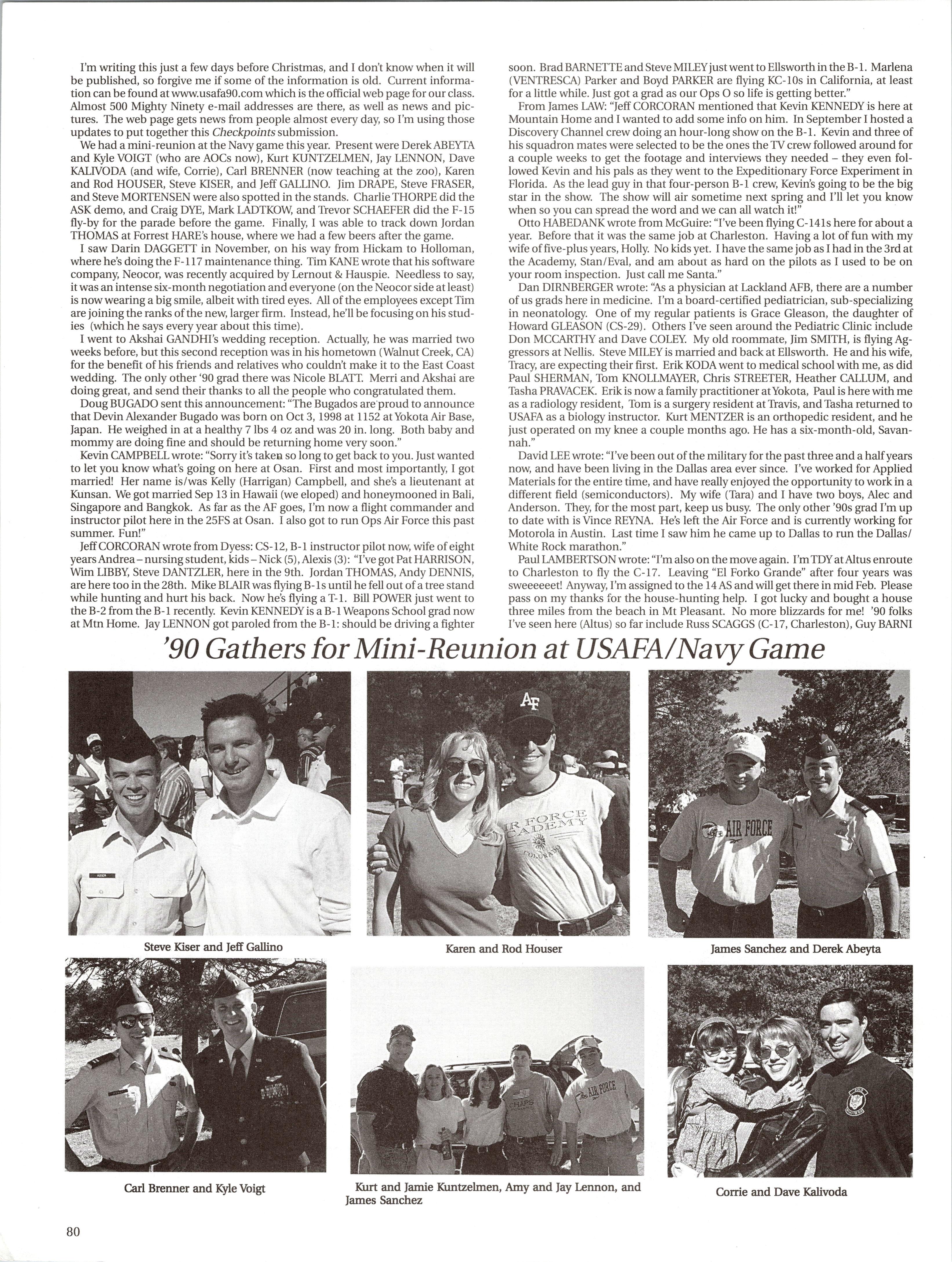 Kyle passed on news about a few Reapers. Jac COIL got married last May at the Academy. Kyle was the best man and Jason TRUDEL headed up the saber bearers. Mark SANDOR is flying T-38s at Sheppard and Mars ANDERSON is working Public Affairs at McChord.