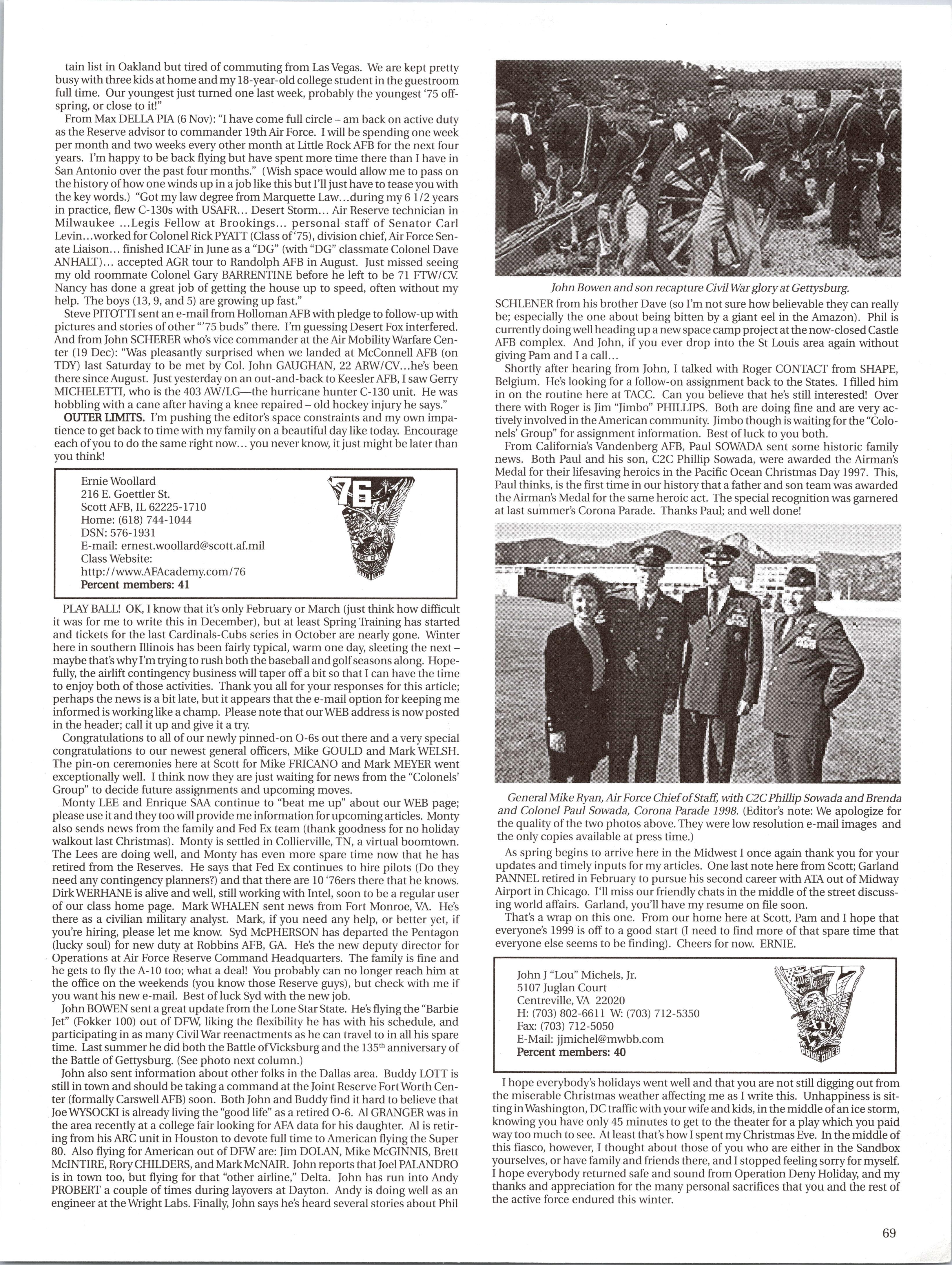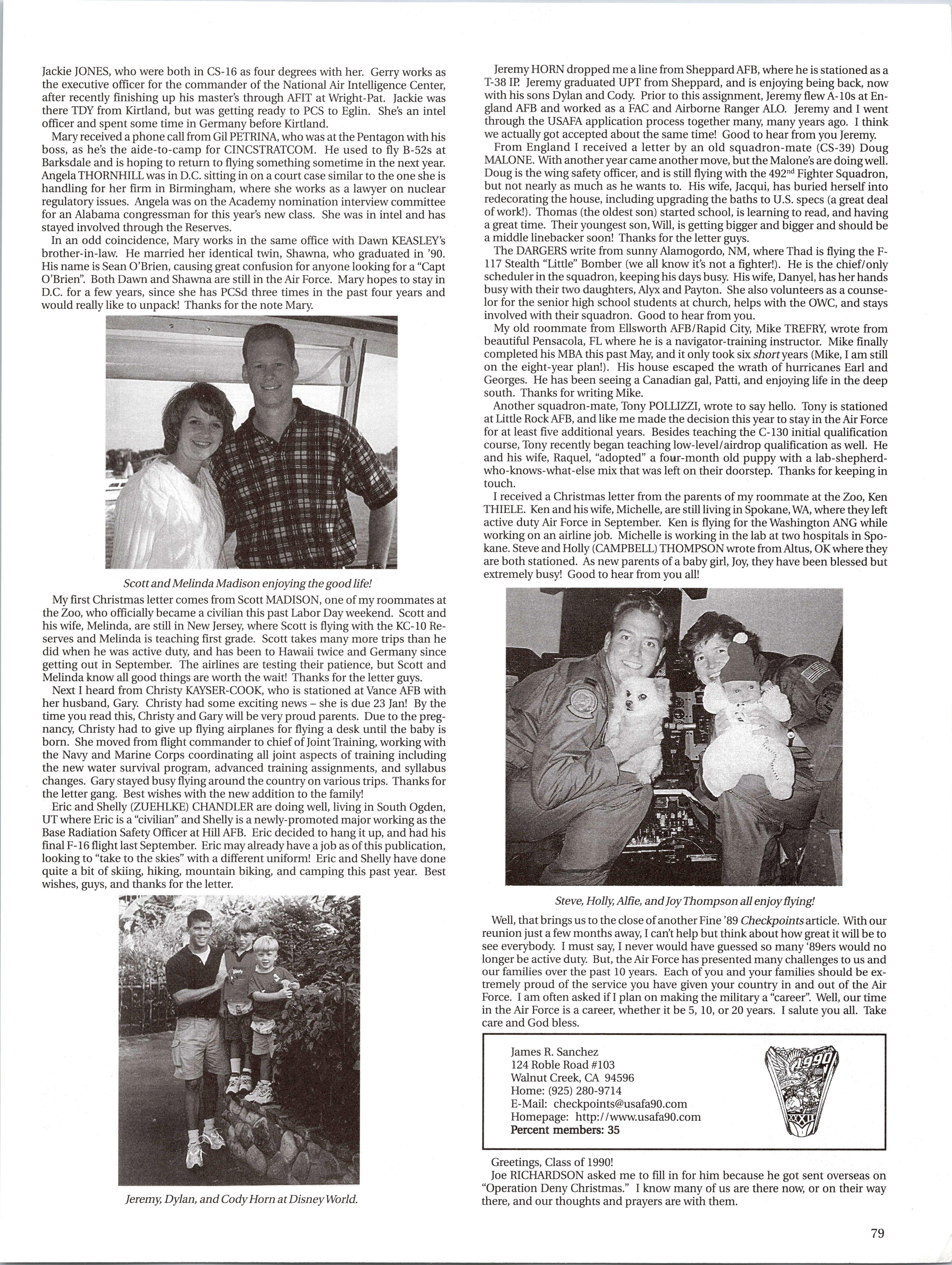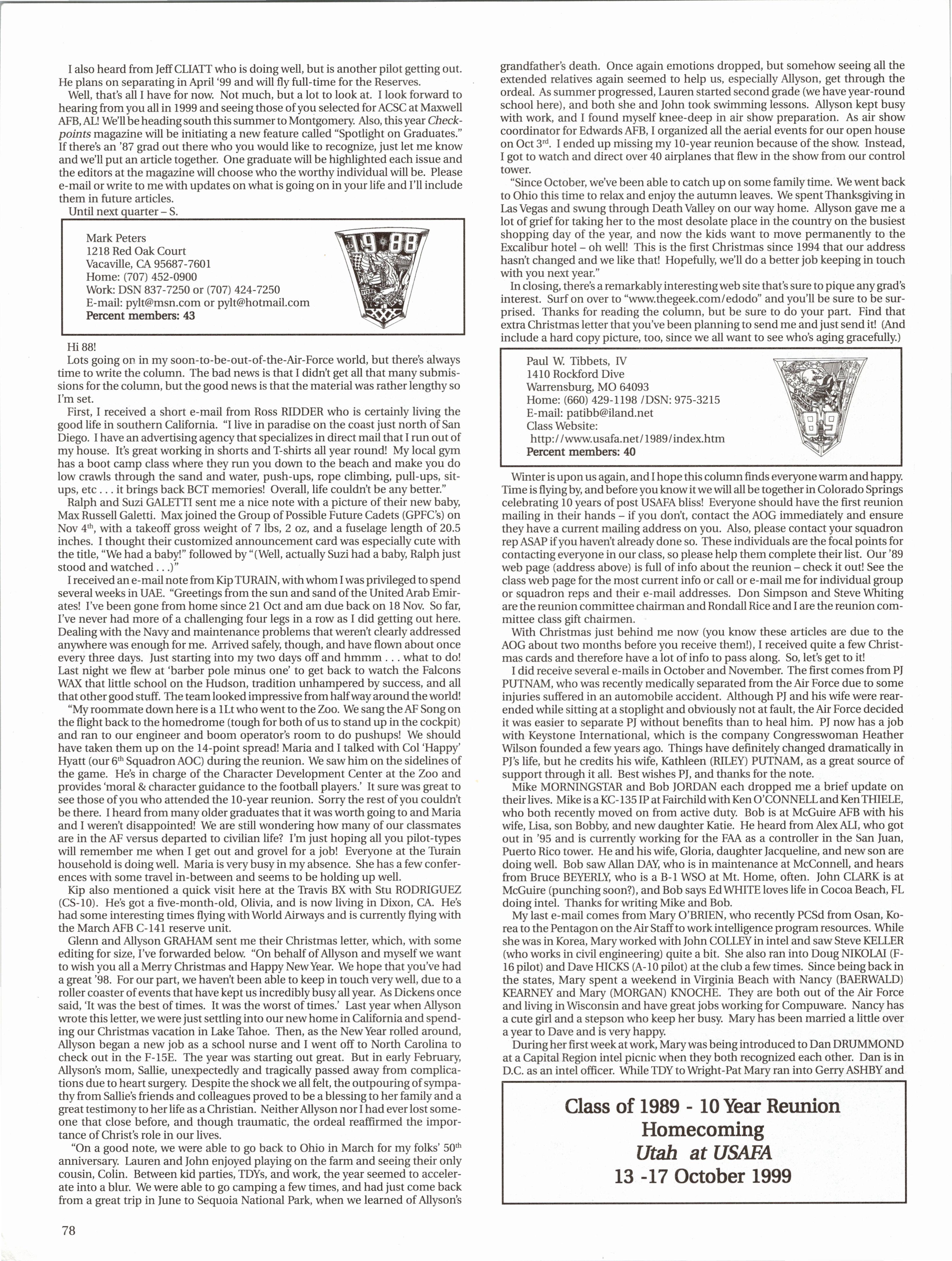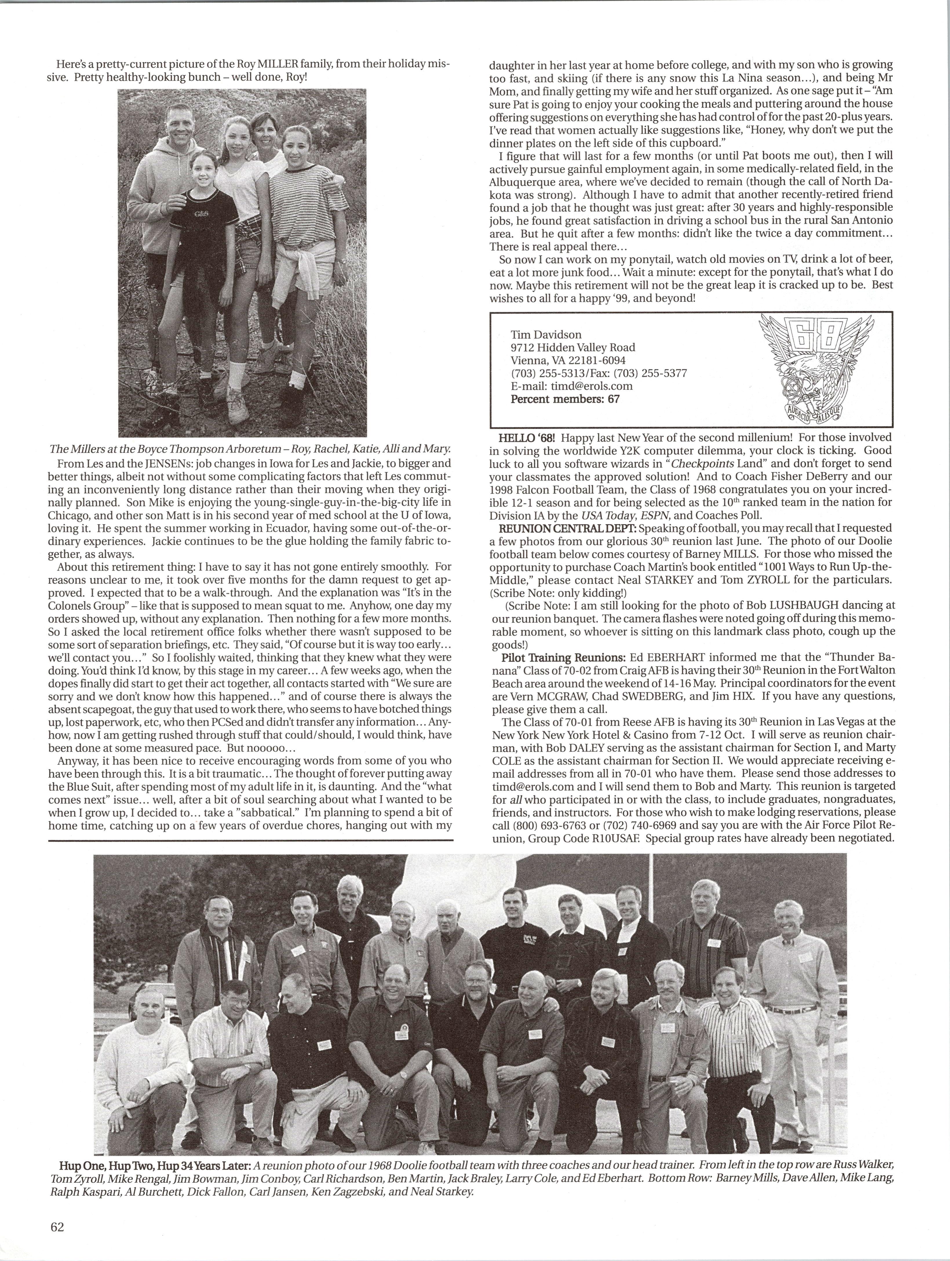 Kyle passed on news about a few Reapers. Jac COIL got married last May at the Academy. Kyle was the best man and Jason TRUDEL headed up the saber bearers. Mark SANDOR is flying T-38s at Sheppard and Mars ANDERSON is working Public Affairs at McChord.