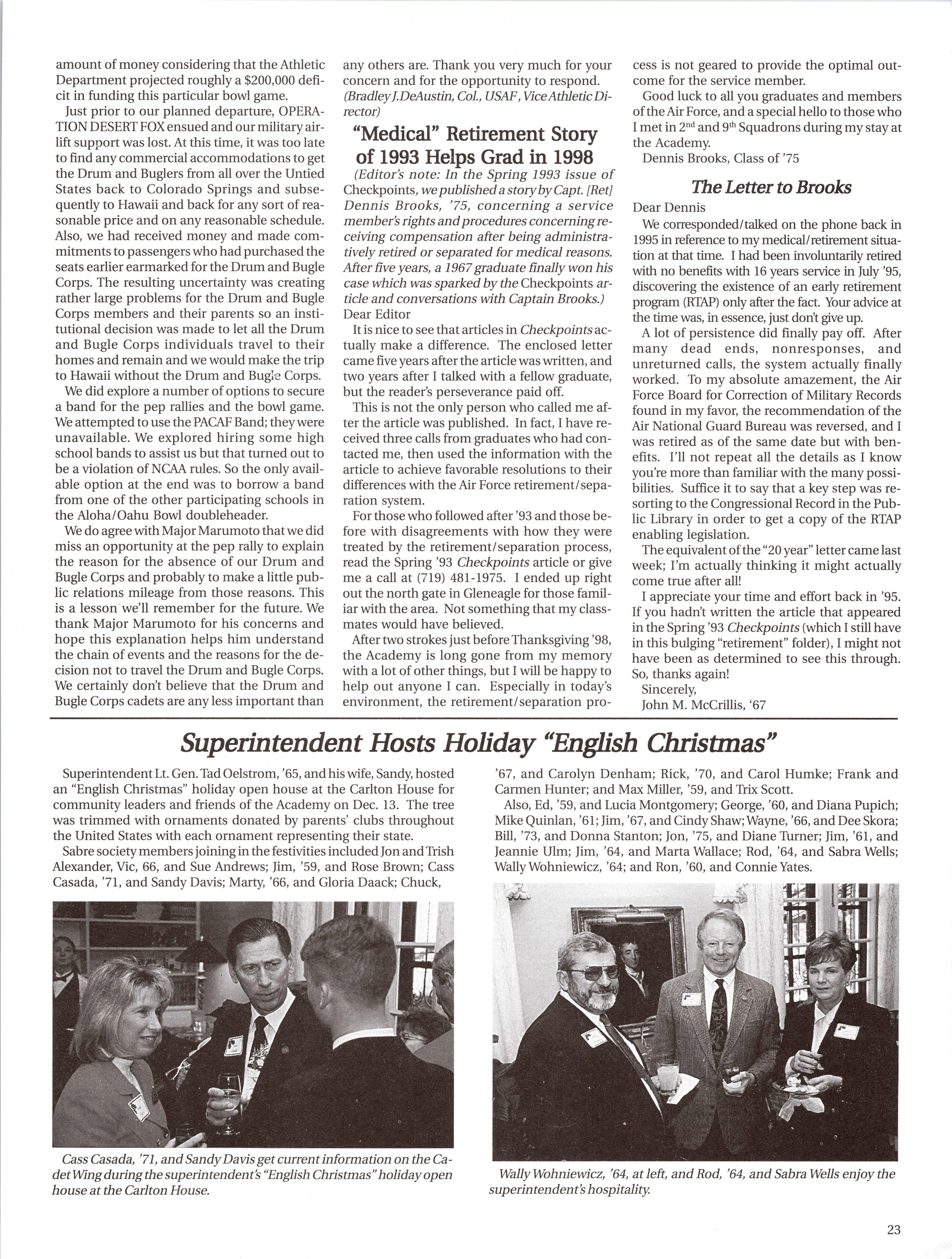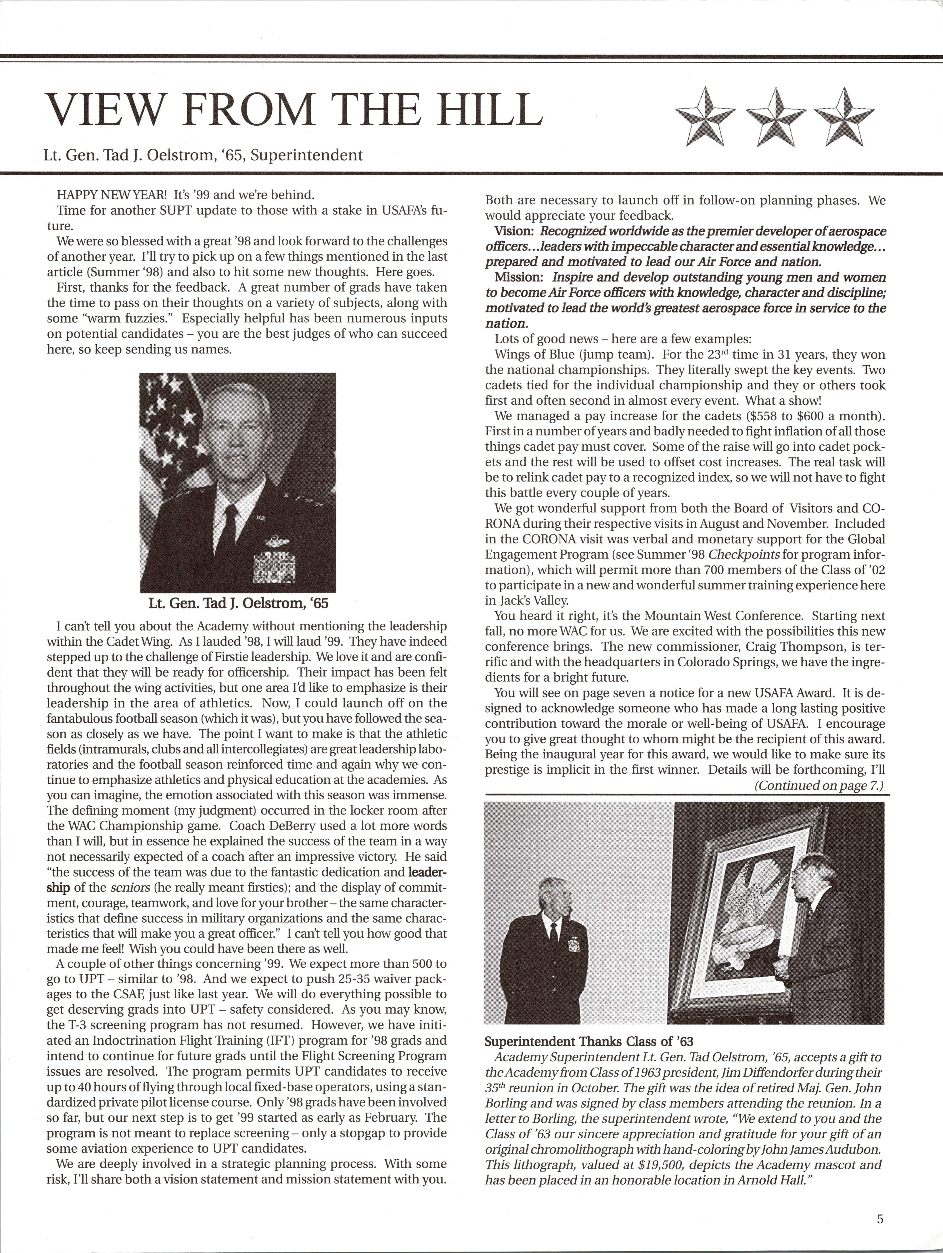 I can’t tell you about the Academy without mentioning the leadership within the CadetWing. As I lauded ’98,1 will laud ’99. They have indeed stepped up to the challenge ofFirstie leadership. We love it and are confident that they will be ready for officership. Their impact has been felt throughout the wing activities, but one area I’d like to emphasize is their leadership in the area of athletics. Now, I could launch off on the fantabulous football season (which it was), but you have followed the season as closely as we have. The point I want to make is that the athletic fields (intramurals, clubs and all intercollegiates) are greatleadership laboratories and the football season reinforced time and again why we continue to emphasize athletics and physical education at the academies. As you can imagine, the emotion associated with this season was immense. The defining moment (my judgment) occurred in the locker room after the WAC Championship game. Coach DeBerry used a lot more words than I will, but in essence he explained the success of the team in a way not necessarily expected of a coach after an impressive victory. He said “the success of the team was due to the fantastic dedication and leadership of the seniors (he really meant firsties); and the display of commitment, courage, teamwork, and love foryour brother - the same characteristics that define success in military organizations and the same characteristics that will make you a great officer.” I can’t tell you how good that made me feel! Wish you could have been there as well.