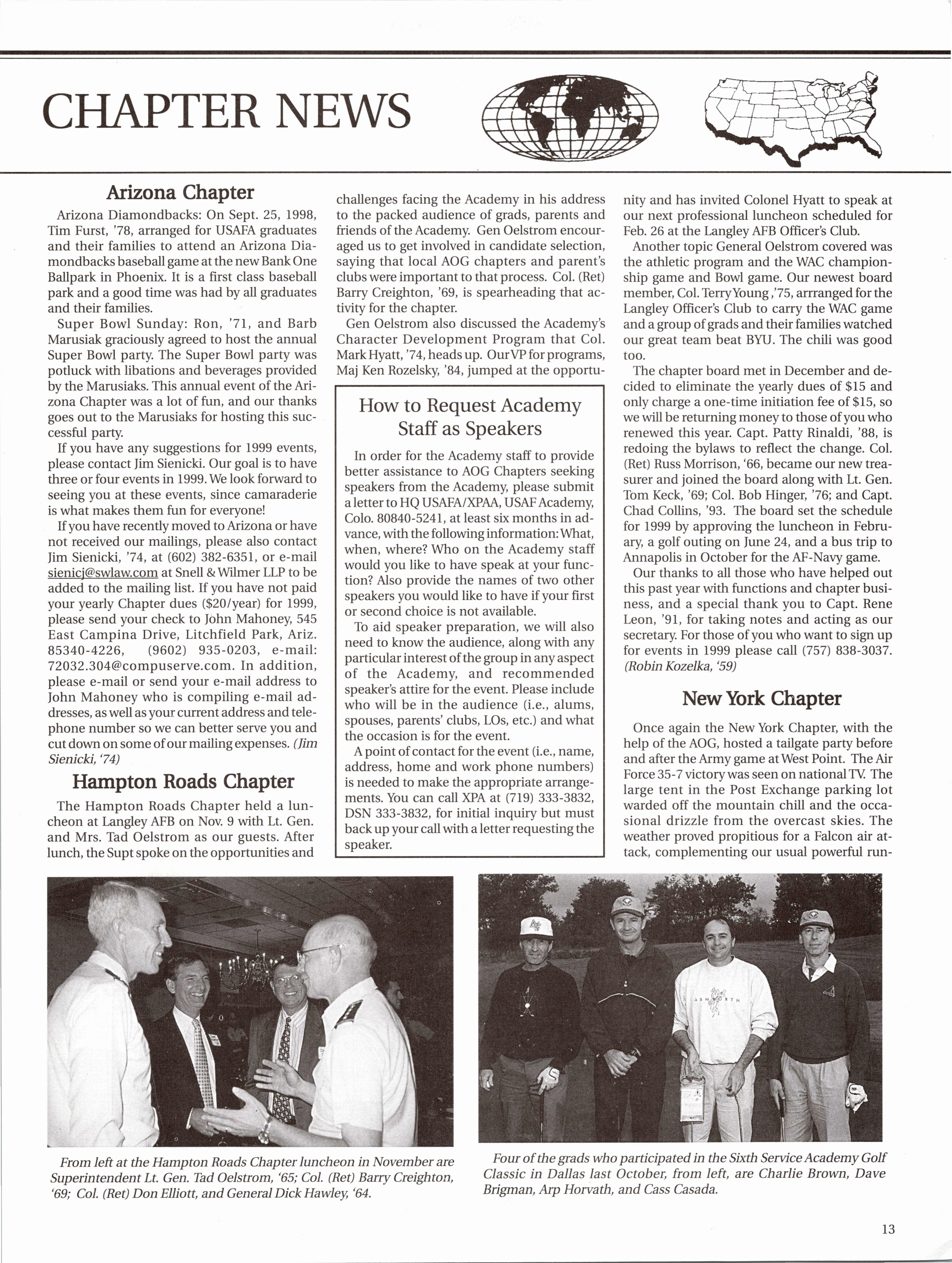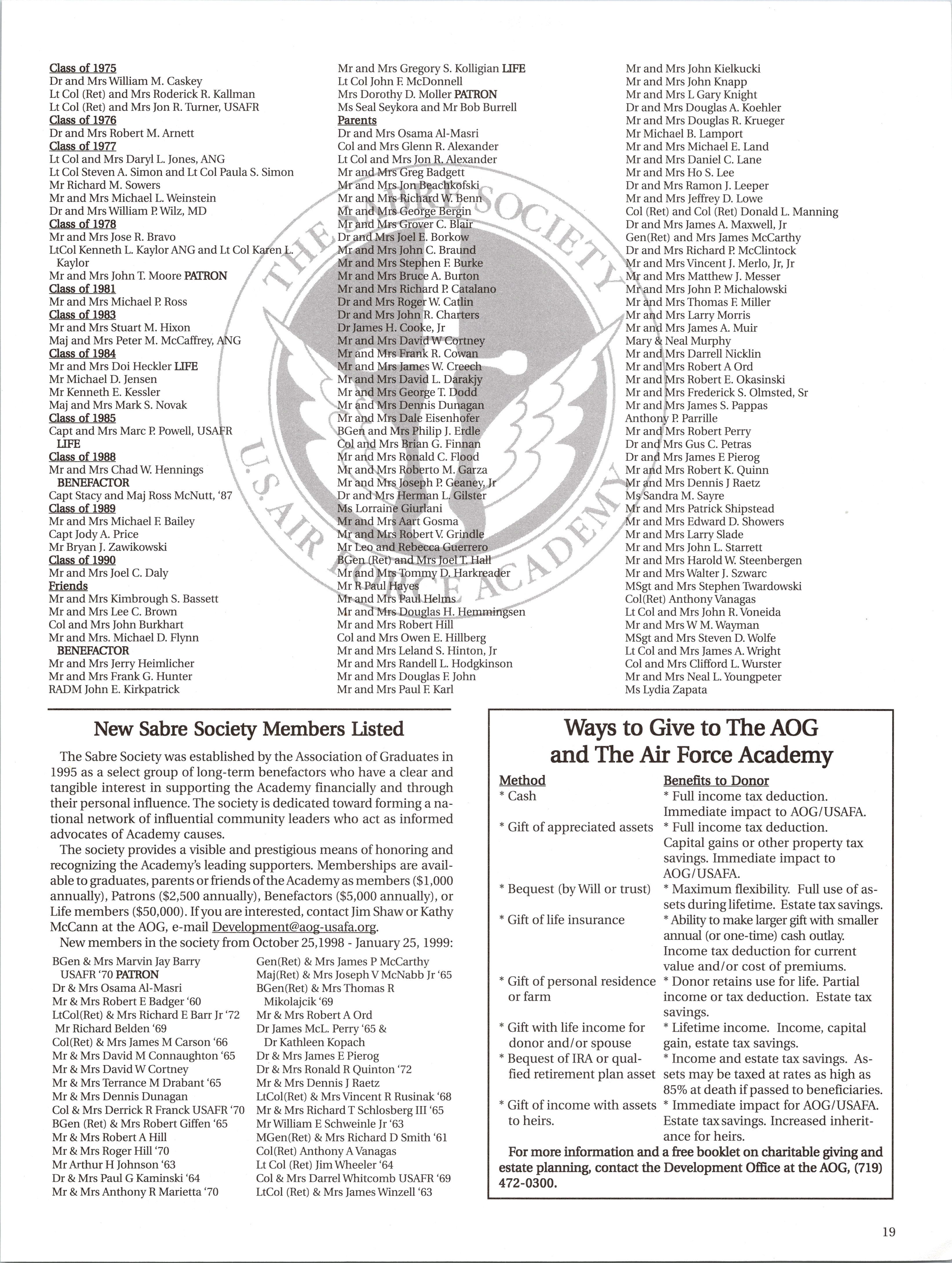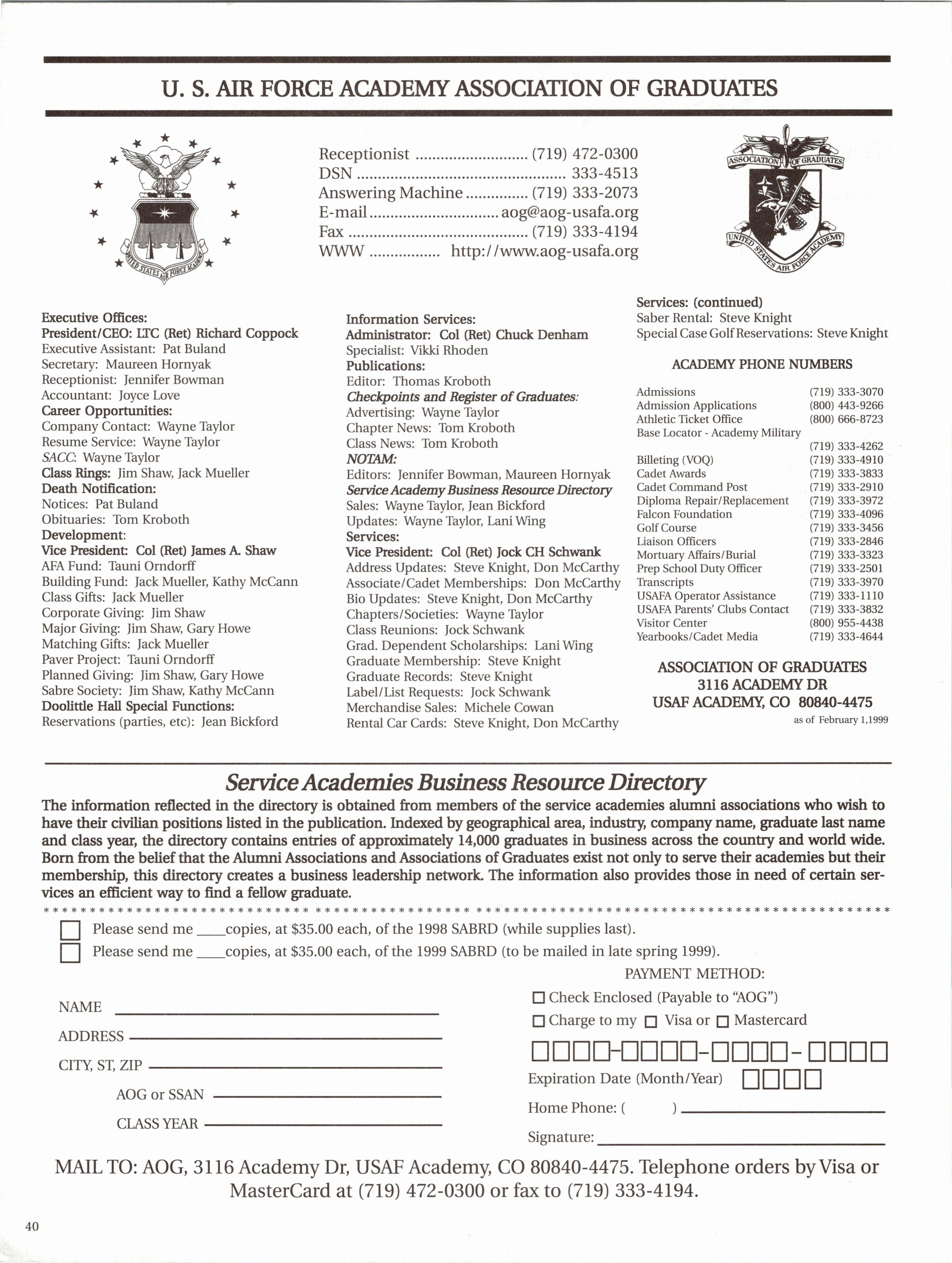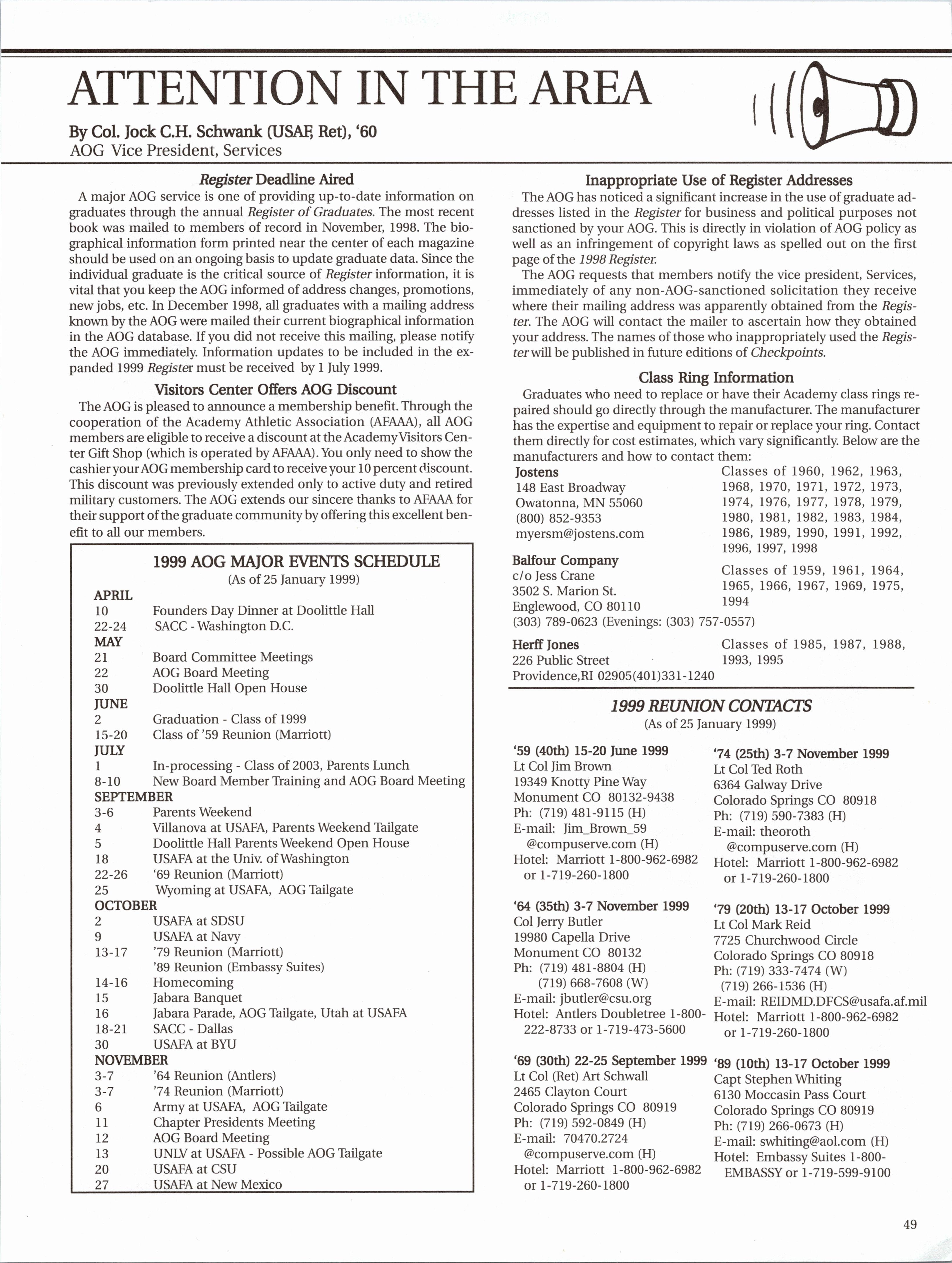 Opinions expressed in this magazine are those of the authors. They do not necessarily reflect the opinions, policy or attitude of the Association of Graduates, its officers or the editorial staff. The appearance of advertisements in this publication does not constitute an endorsement by the Association of Graduates of the products or services advertised. Copyright, Association of Graduates of the U.S. Air Force Academy, February 1999.