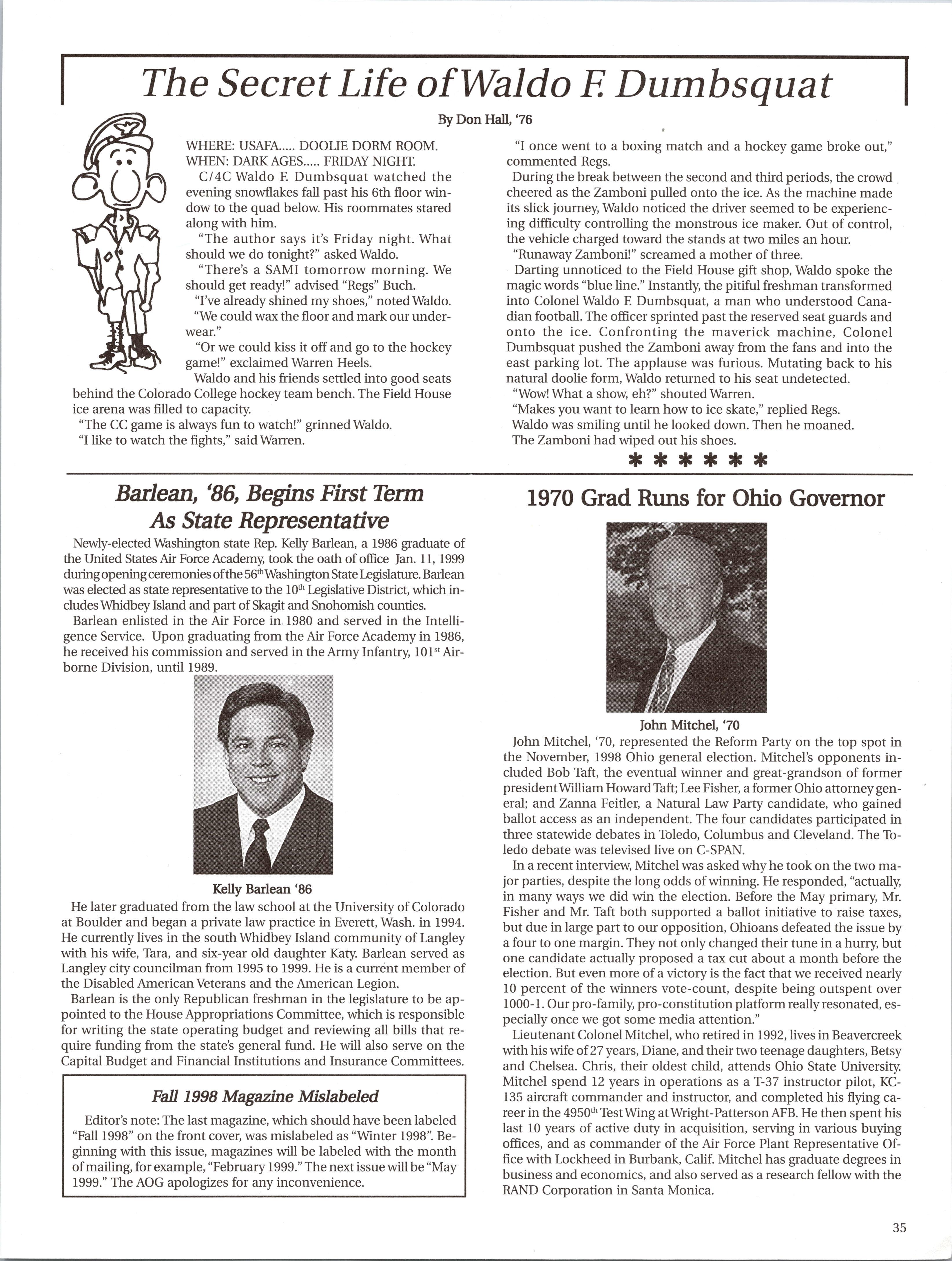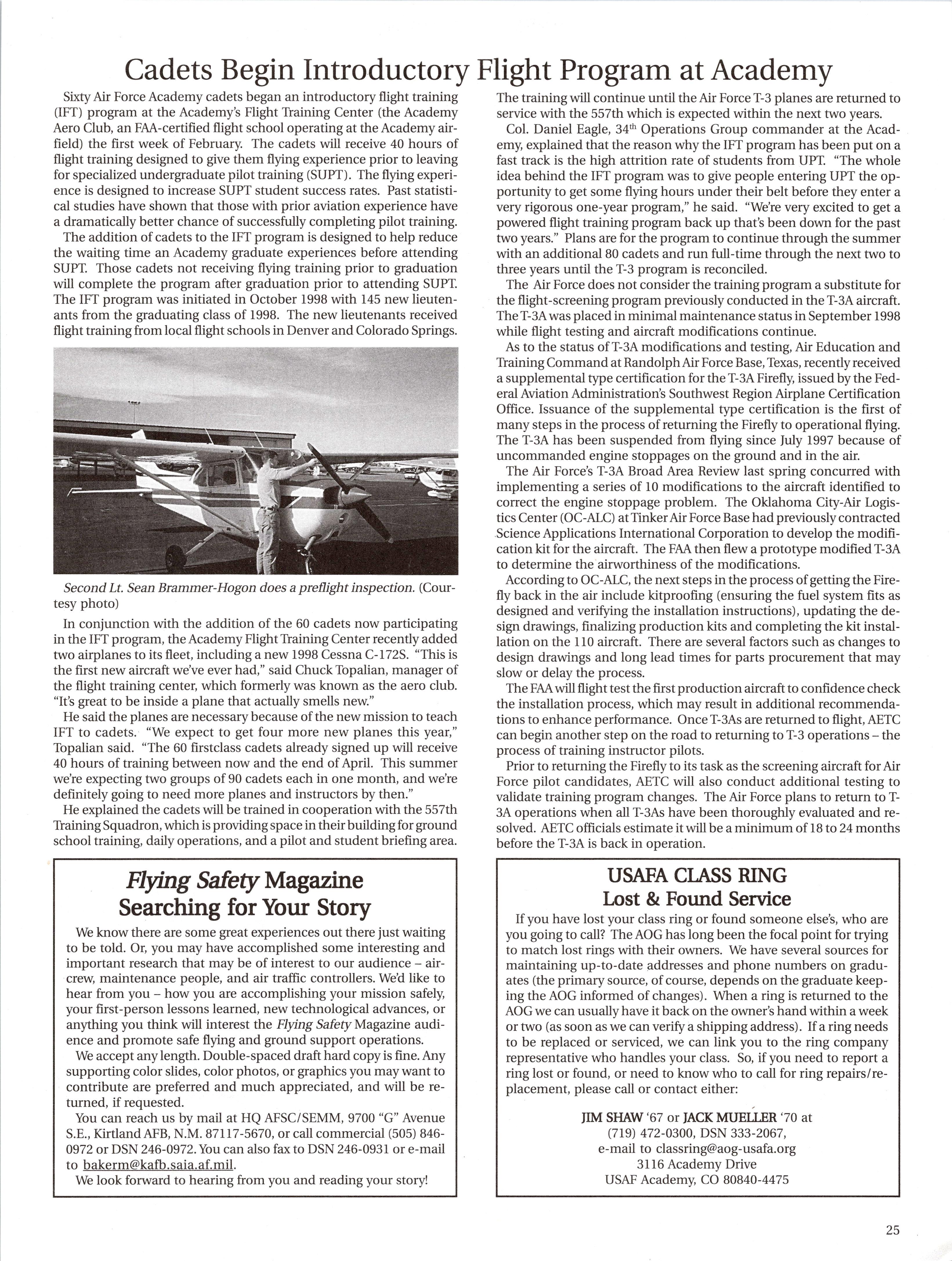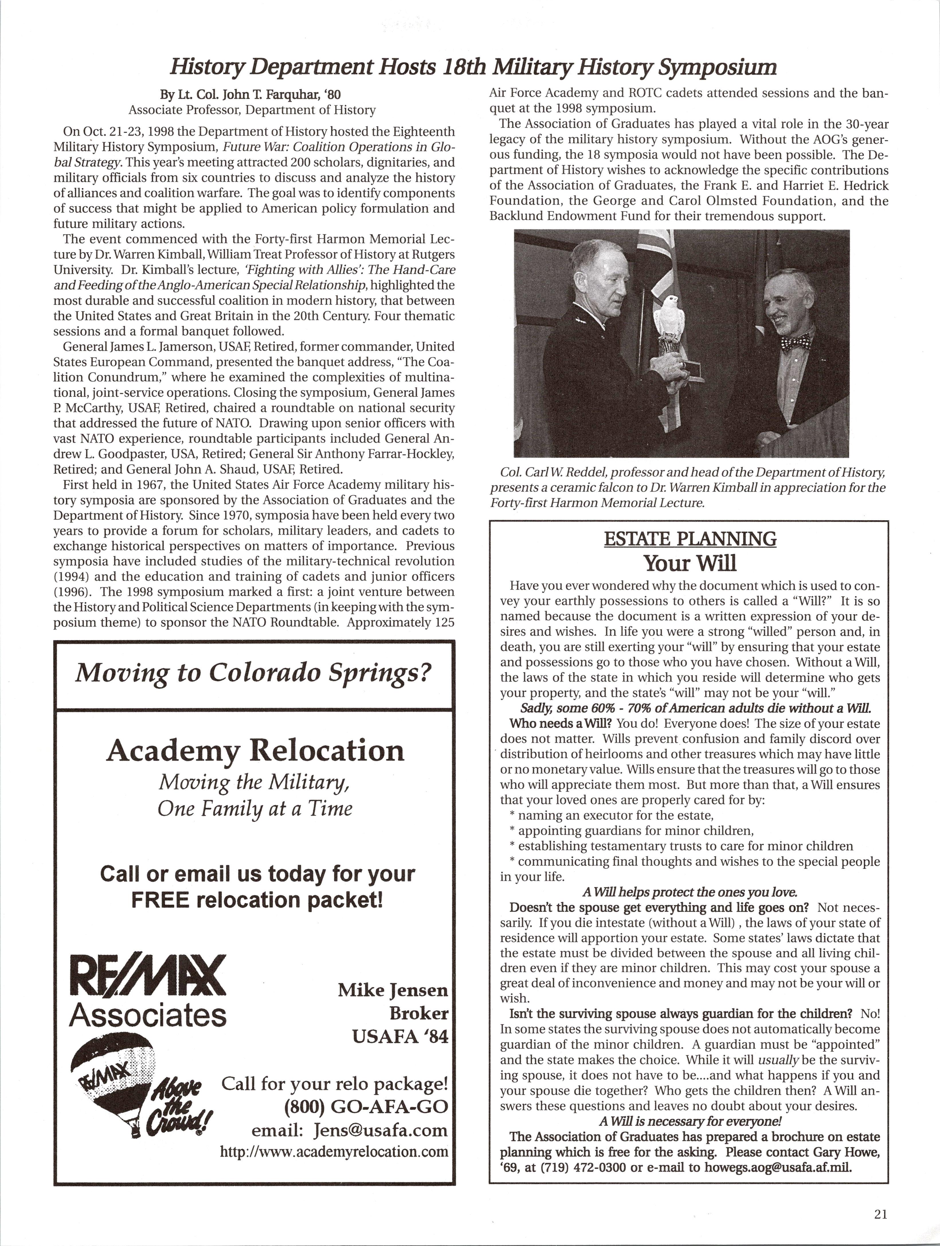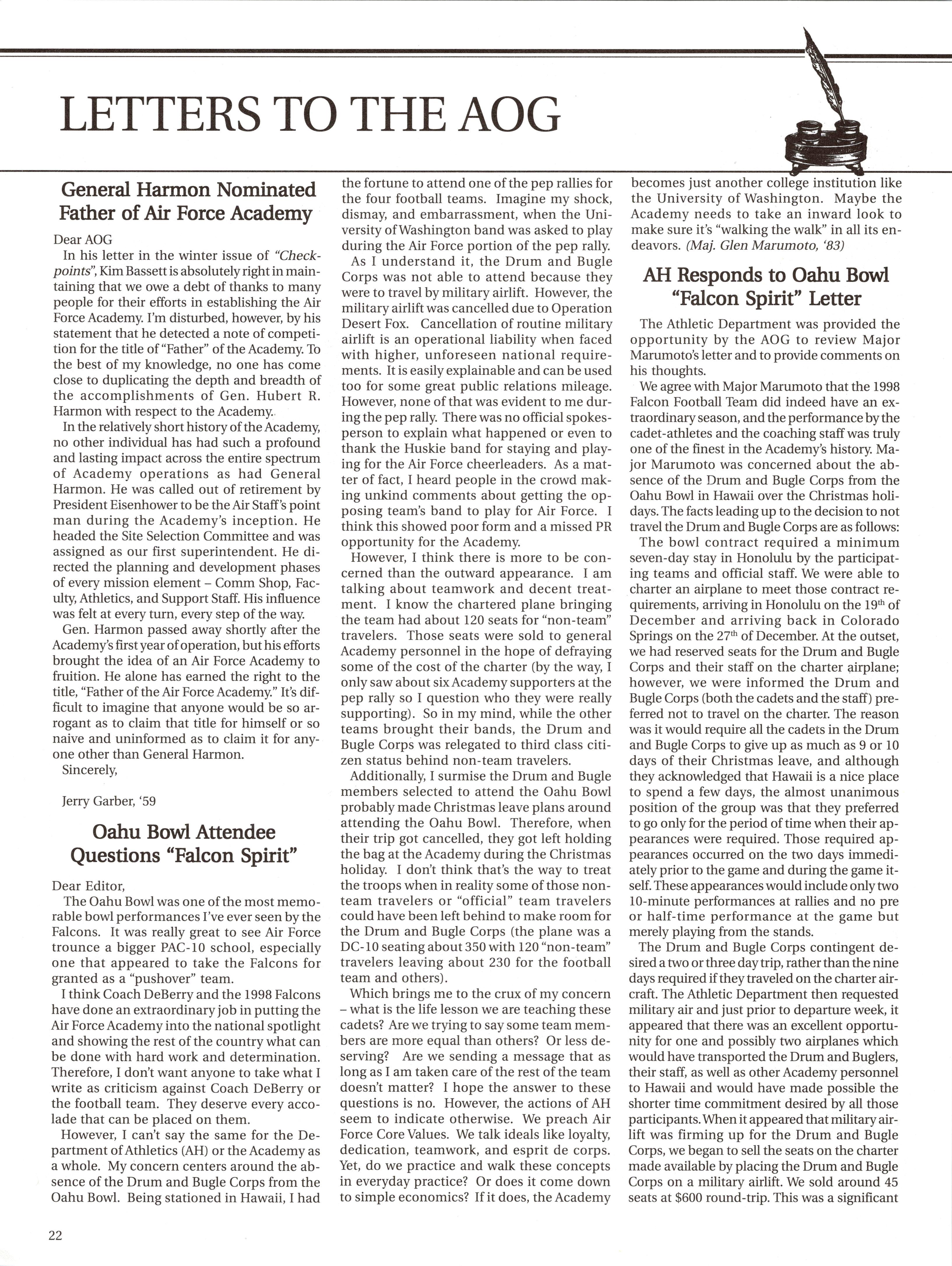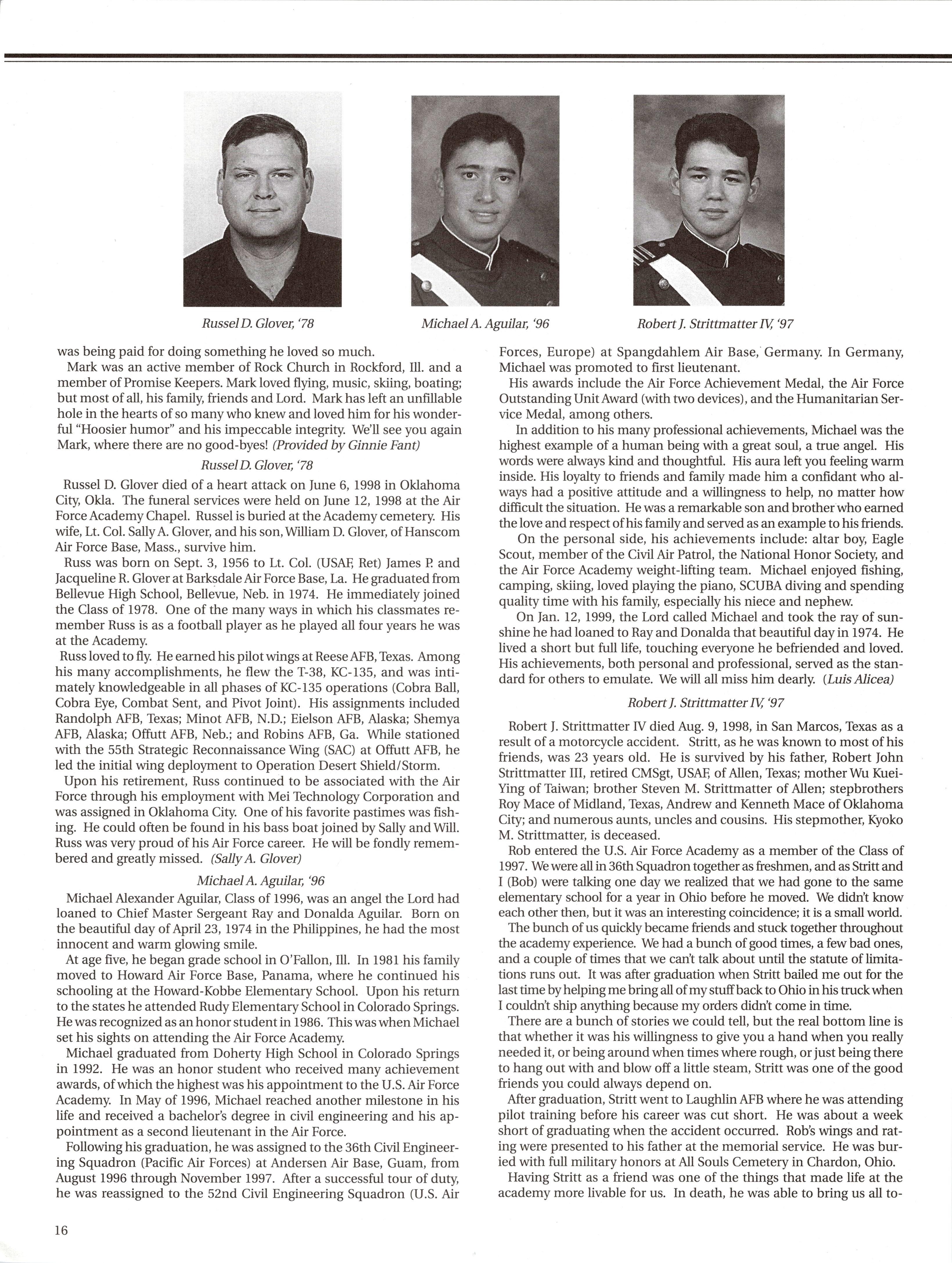Opinions expressed in this magazine are those of the authors. They do not necessarily reflect the opinions, policy or attitude of the Association of Graduates, its officers or the editorial staff. The appearance of advertisements in this publication does not constitute an endorsement by the Association of Graduates of the products or services advertised. Copyright, Association of Graduates of the U.S. Air Force Academy, February 1999.