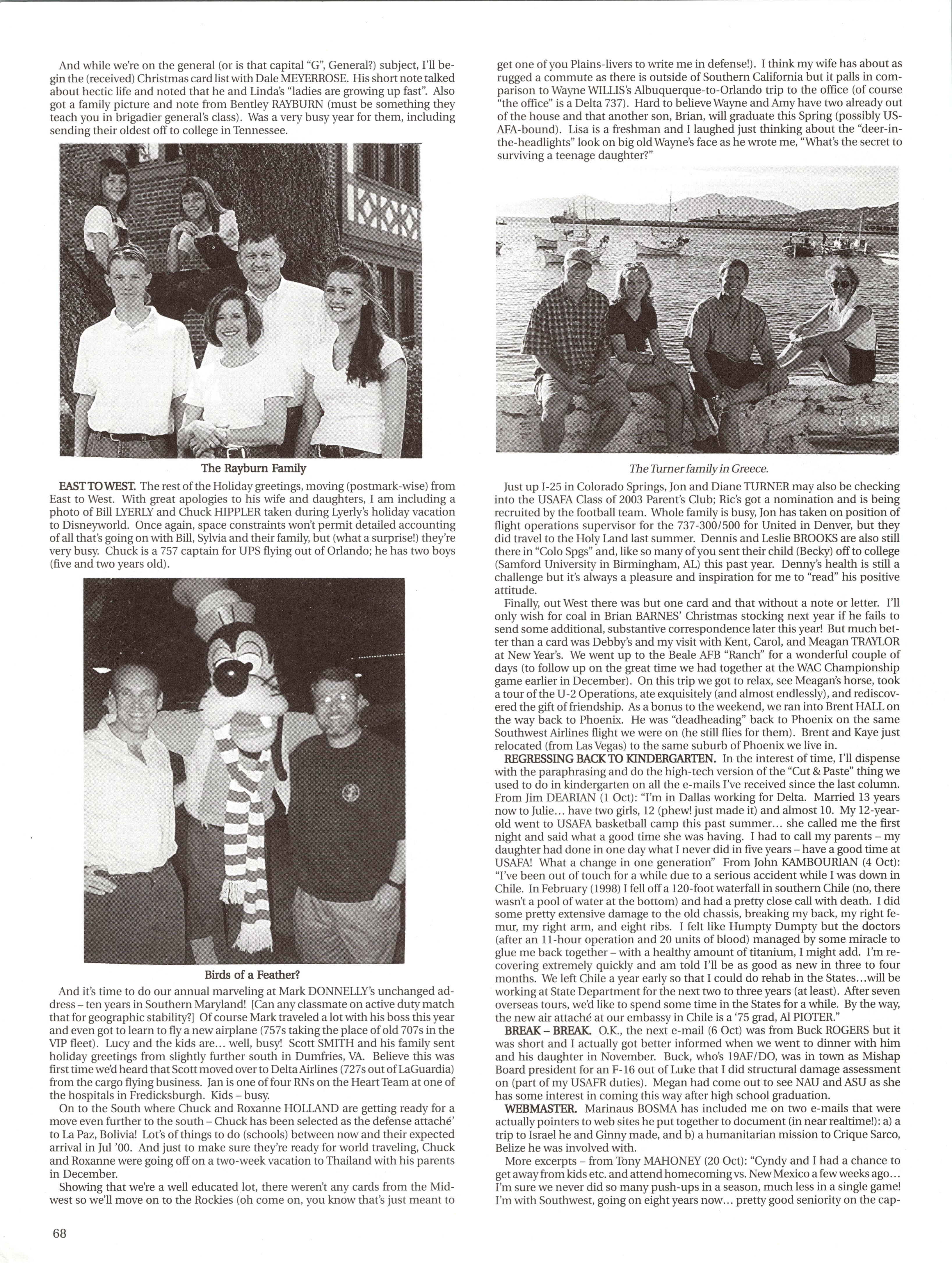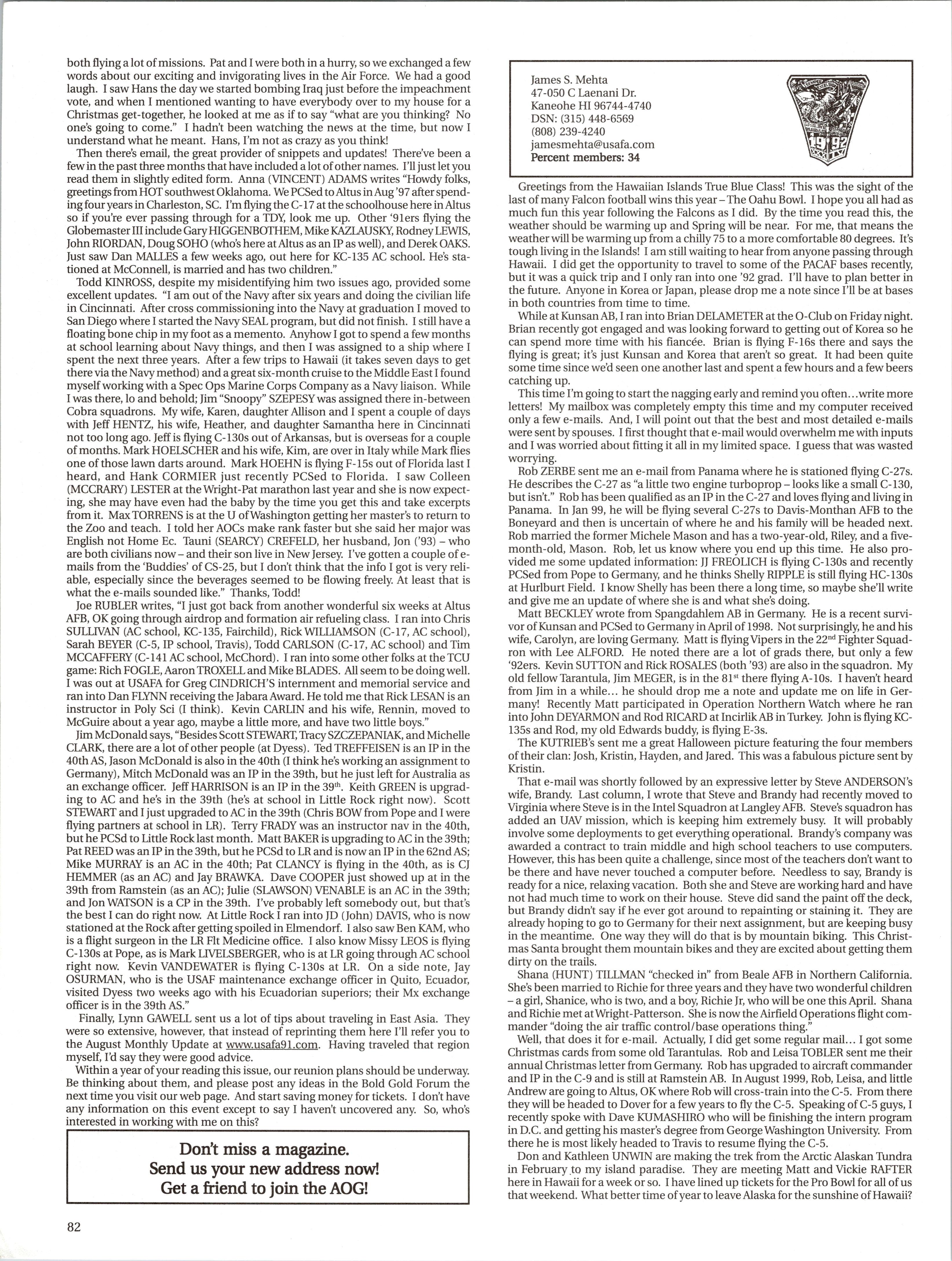 OK, now for the flow of people and places in no particular order: Byron ARMSTRONG, Matt DUNKER, Craig FITZPATRICK, Mason DULA, Charity KAUFMAN, Roy (Patrick) RECKER, Suzie ROURKE and Mo LEE finished up maintenance school at Sheppard AFB, TX and have now returned to their respective bases. JenniferYOUNG is at Seymour-Johnsonwaiting to go to pilottraining. Mack ERWIN is living with Tobin RUFF until he goes to Pensacola for pilot training in late January. ConnerWYATT is at the University ofVirginia pursuing a master’s in English. Lauren ECKERT just soloed and is having a good time at Laughlin AFB.