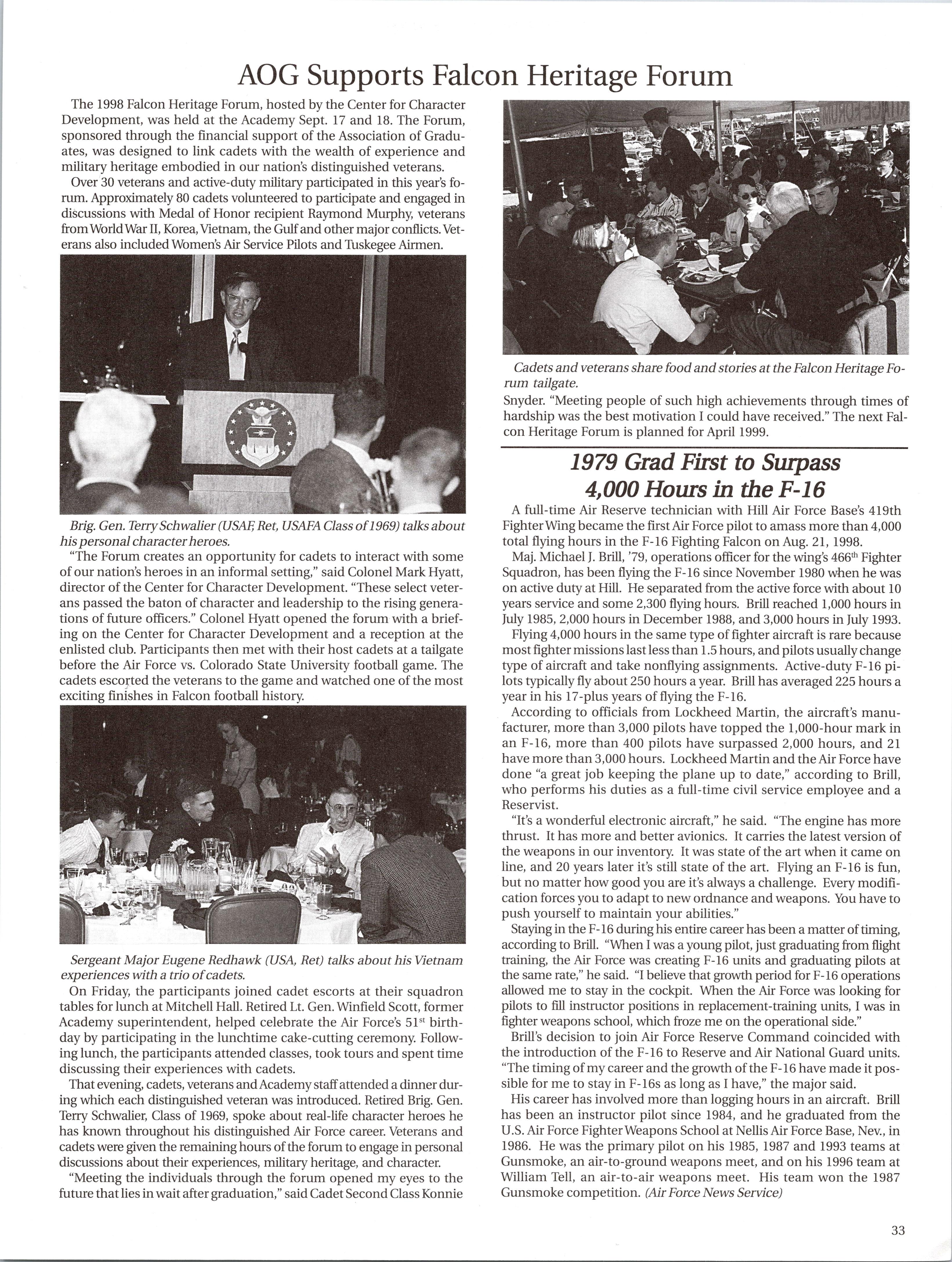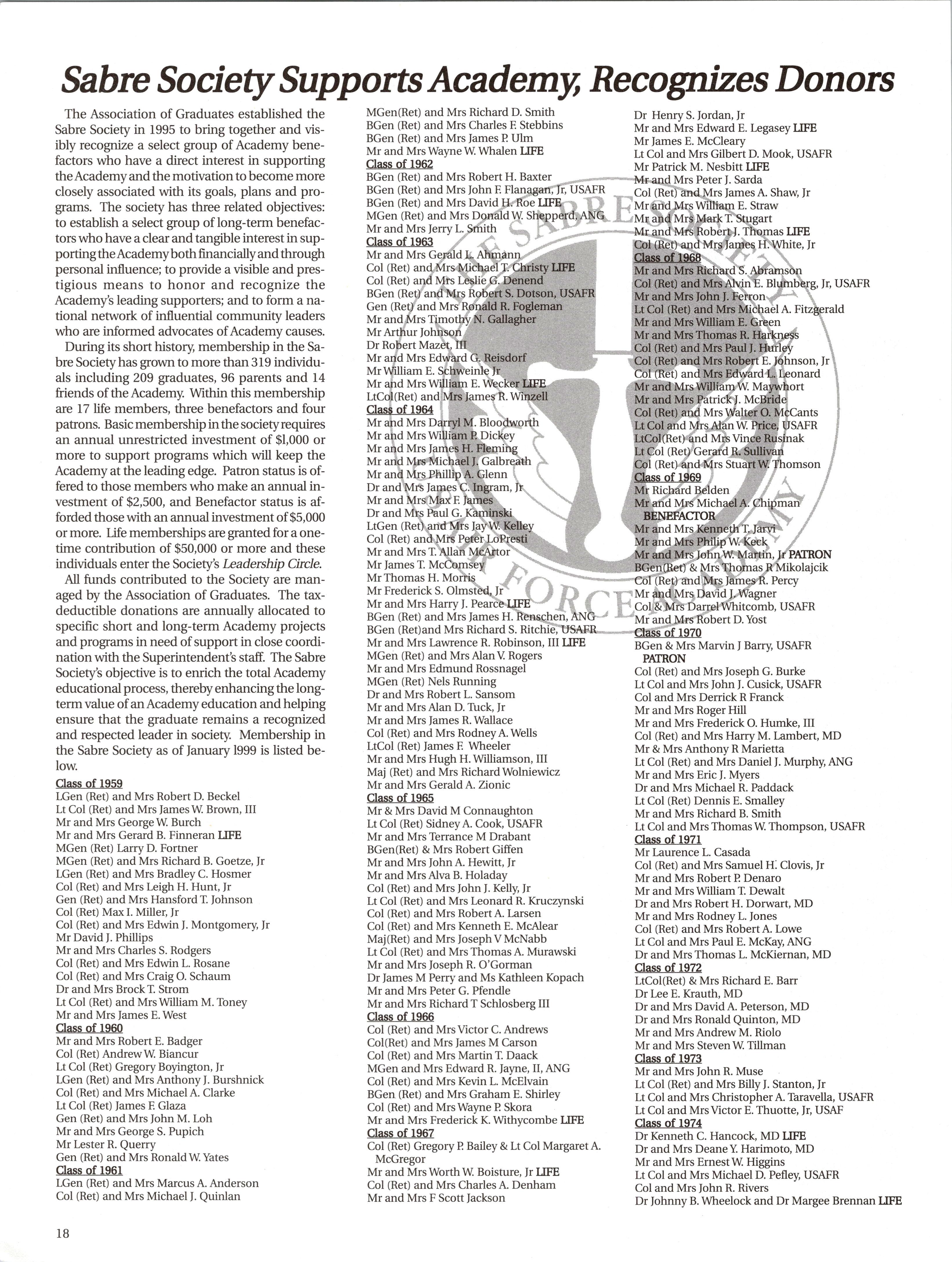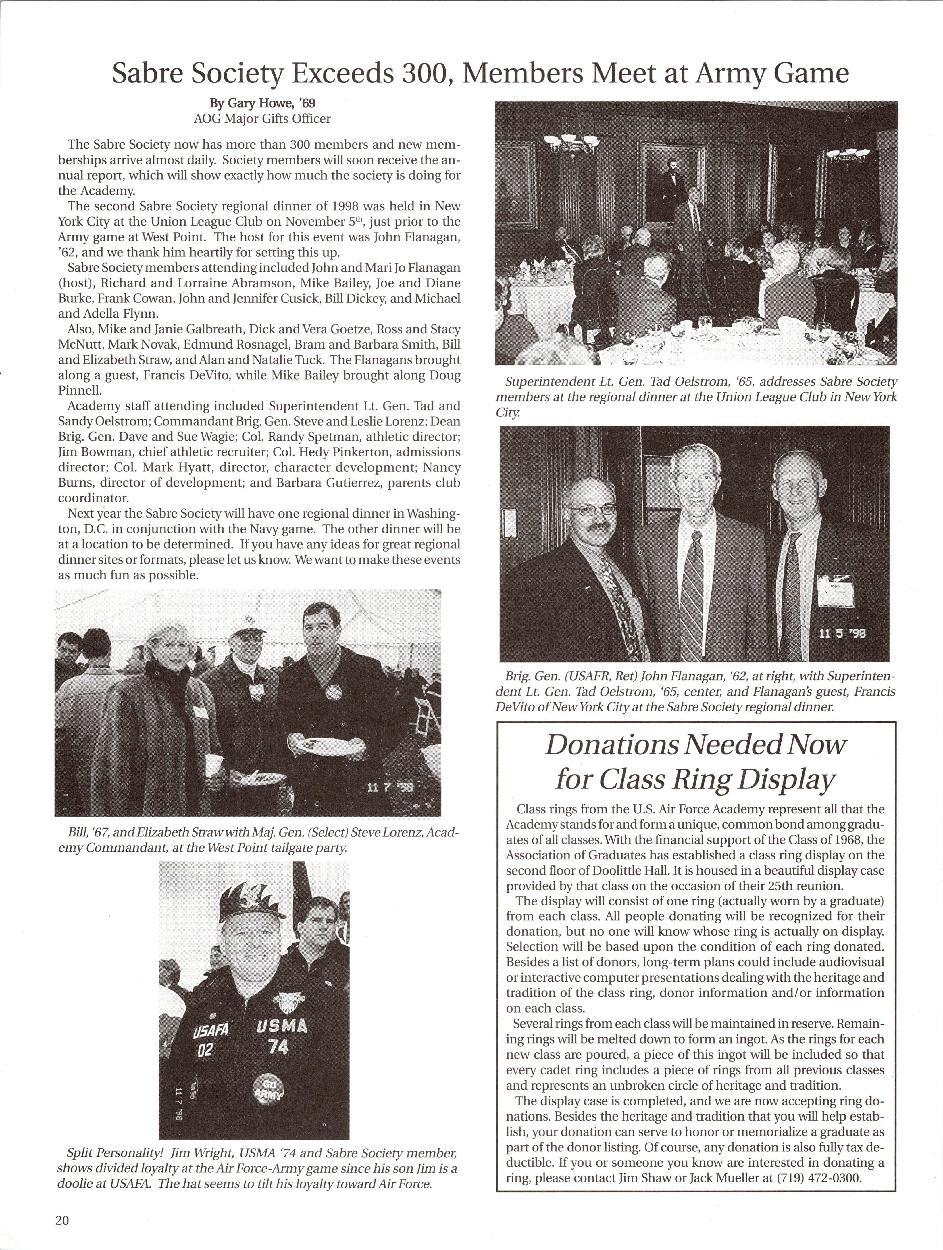 You will see on page seven a notice for a new USAFA Award. It is designed to acknowledge someone who has made a long lasting positive contribution toward the morale or well-being of USAFA. I encourage you to give great thought to whom might be the recipient of this award. Being the inaugural year for this award, we would like to make sure its prestige is implicit in the first winner. Details will be forthcoming, I’ll