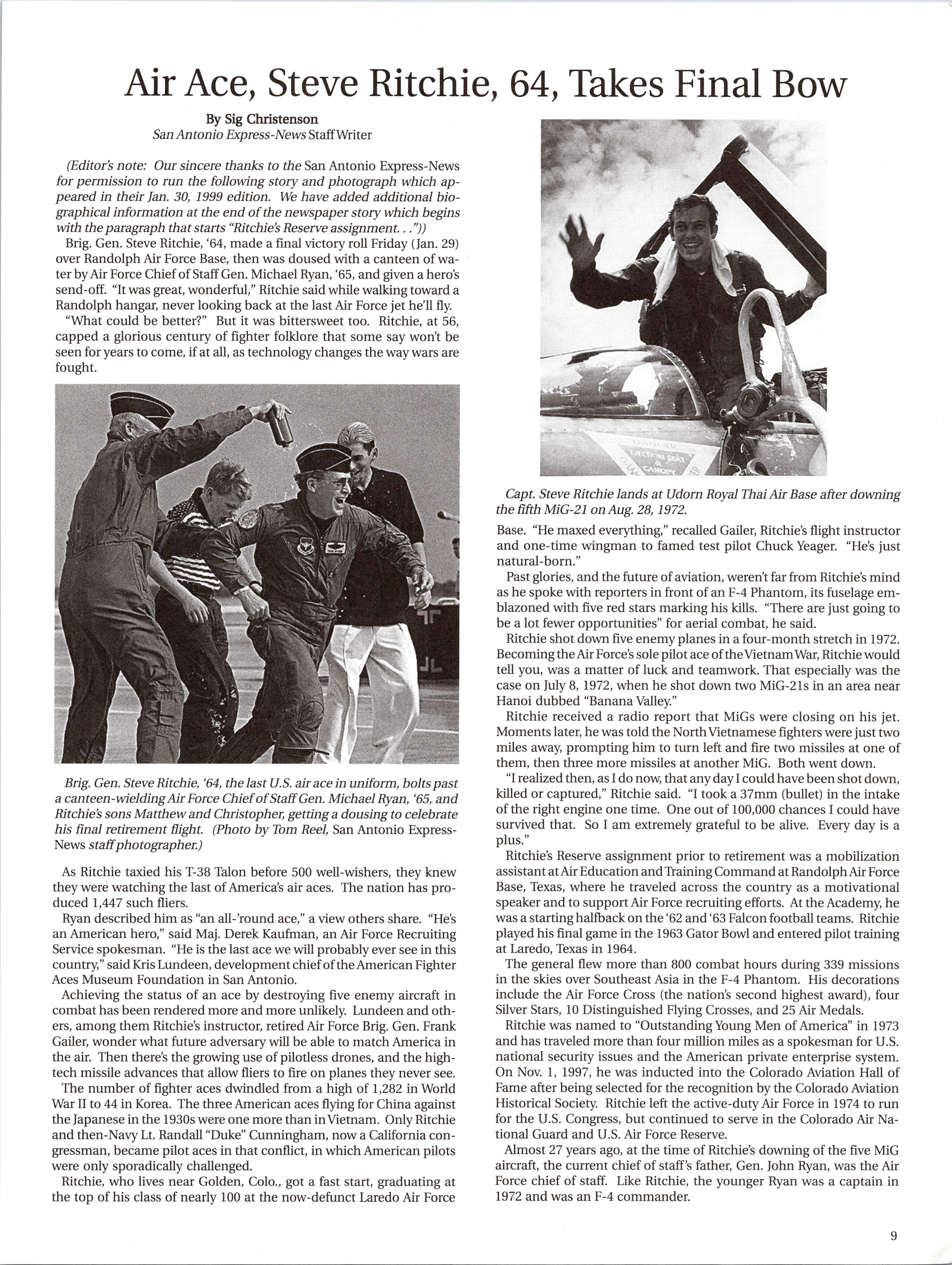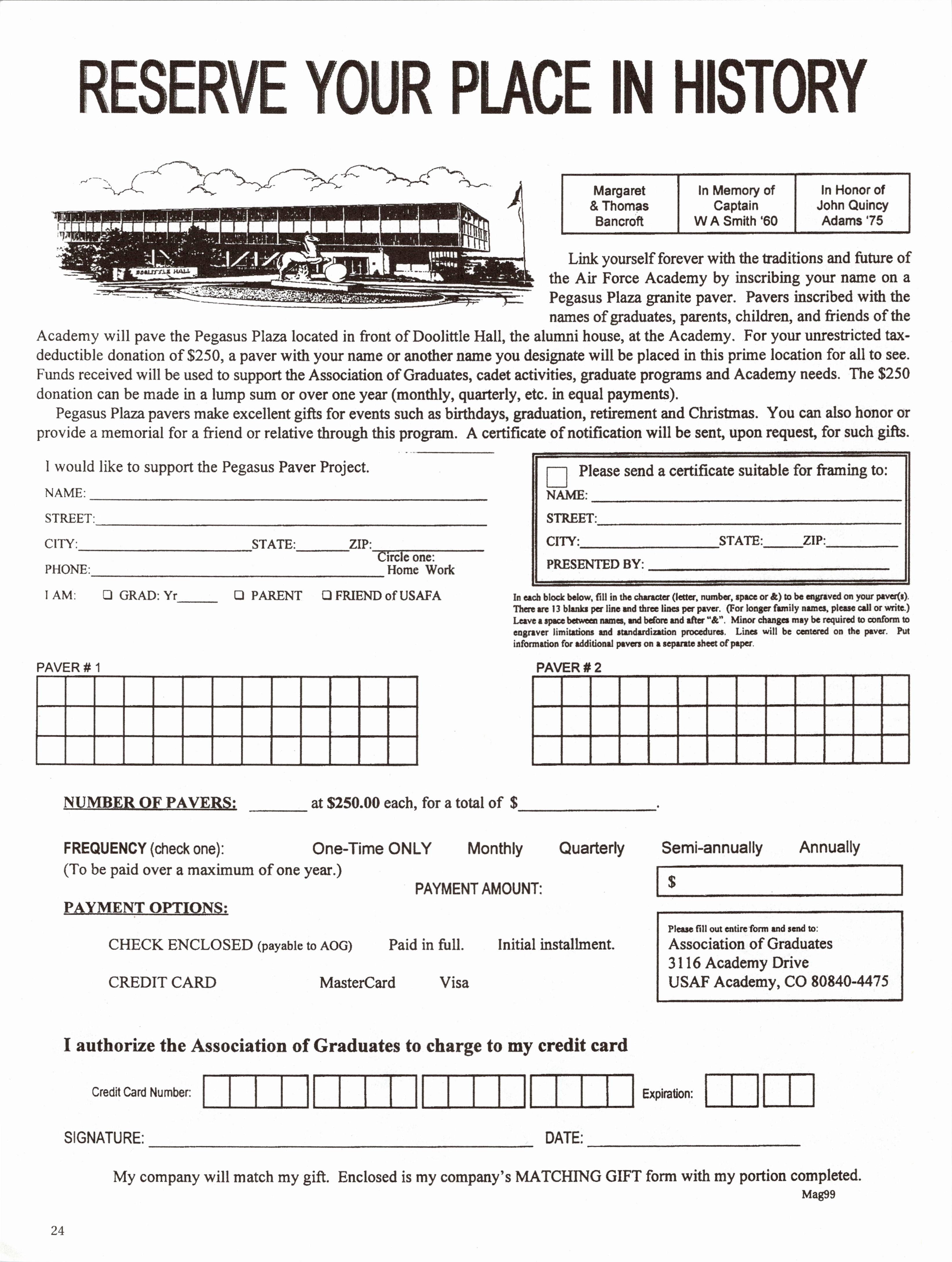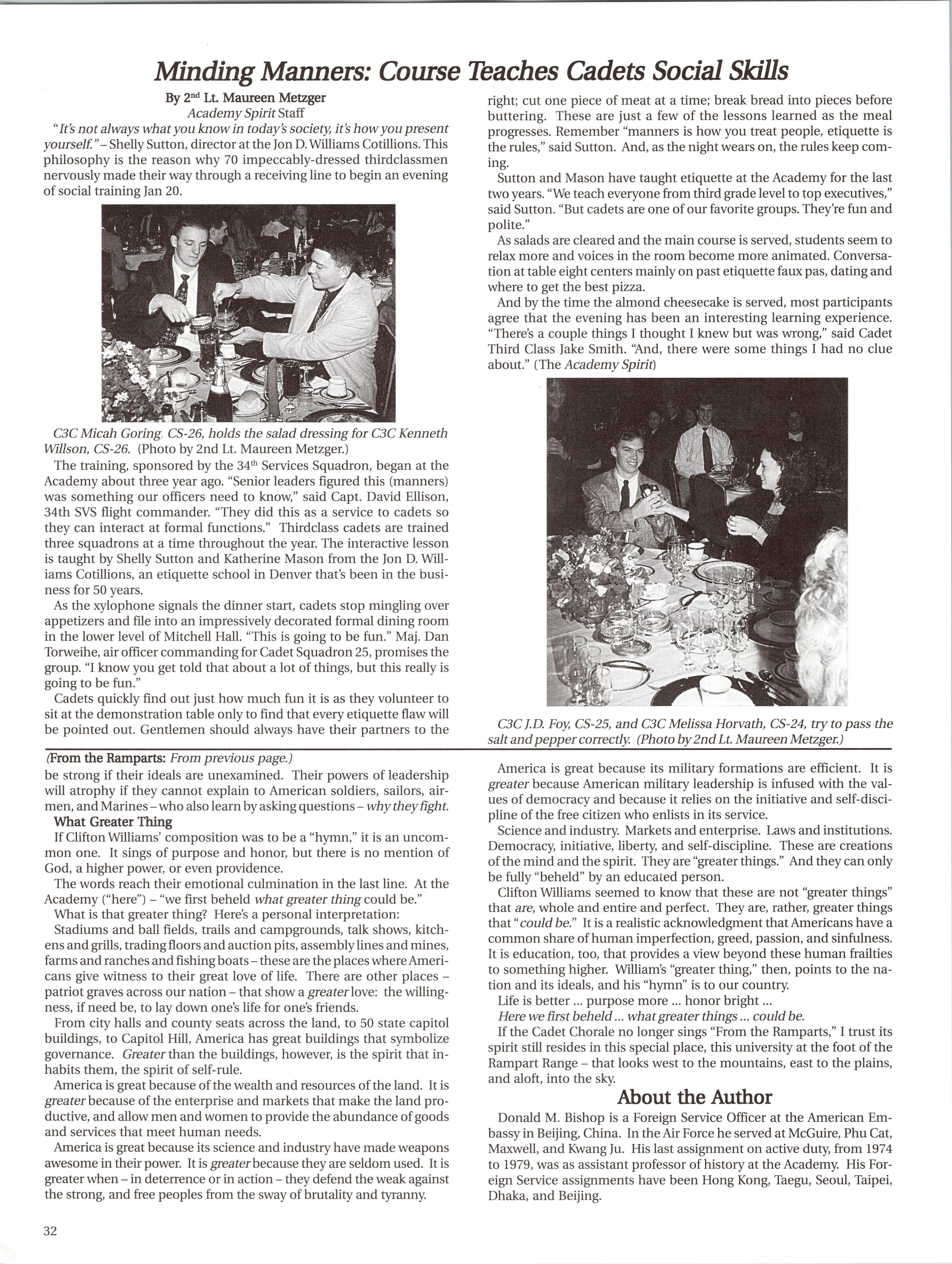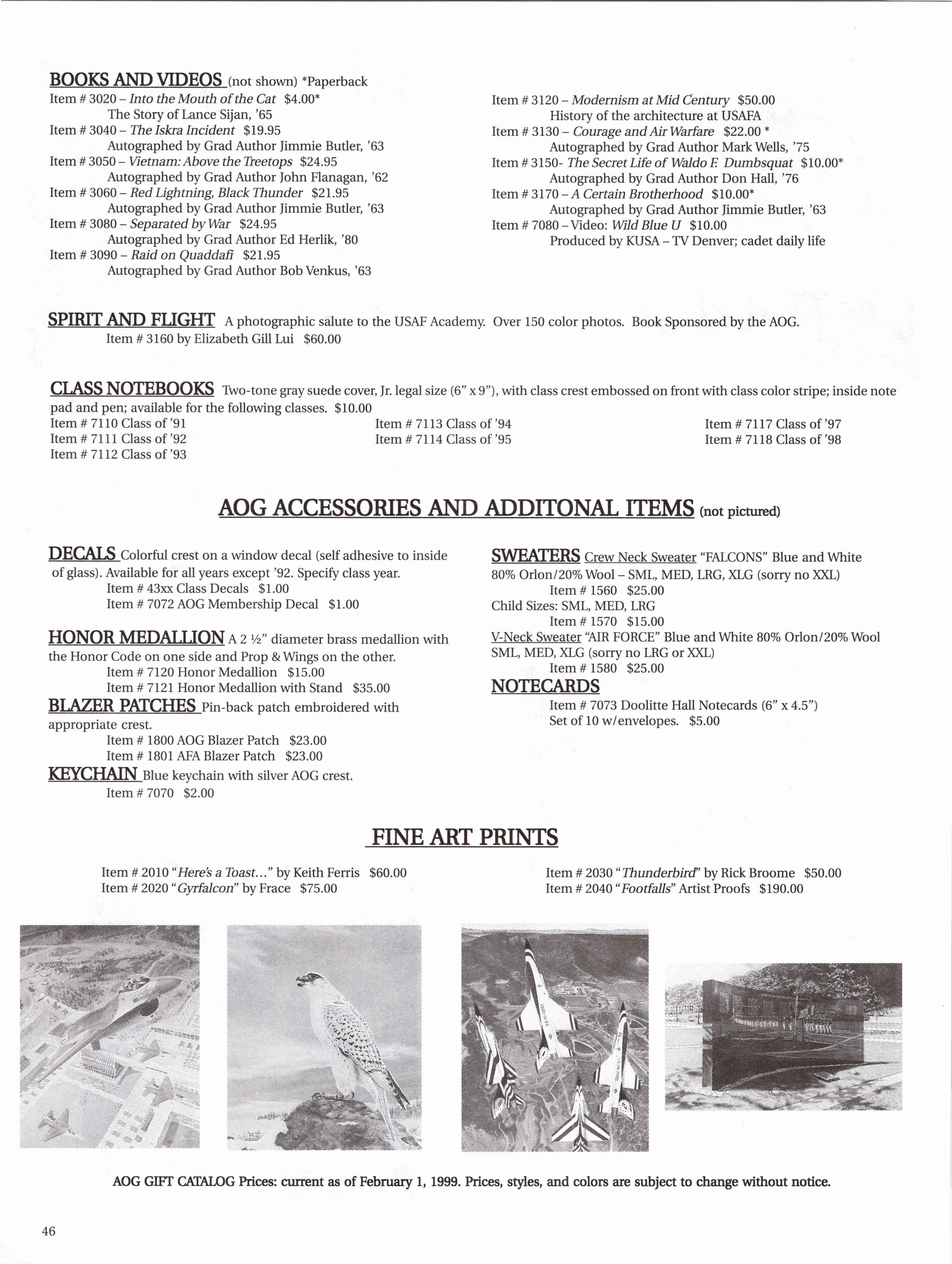 You will see on page seven a notice for a new USAFA Award. It is designed to acknowledge someone who has made a long lasting positive contribution toward the morale or well-being of USAFA. I encourage you to give great thought to whom might be the recipient of this award. Being the inaugural year for this award, we would like to make sure its prestige is implicit in the first winner. Details will be forthcoming, I’ll