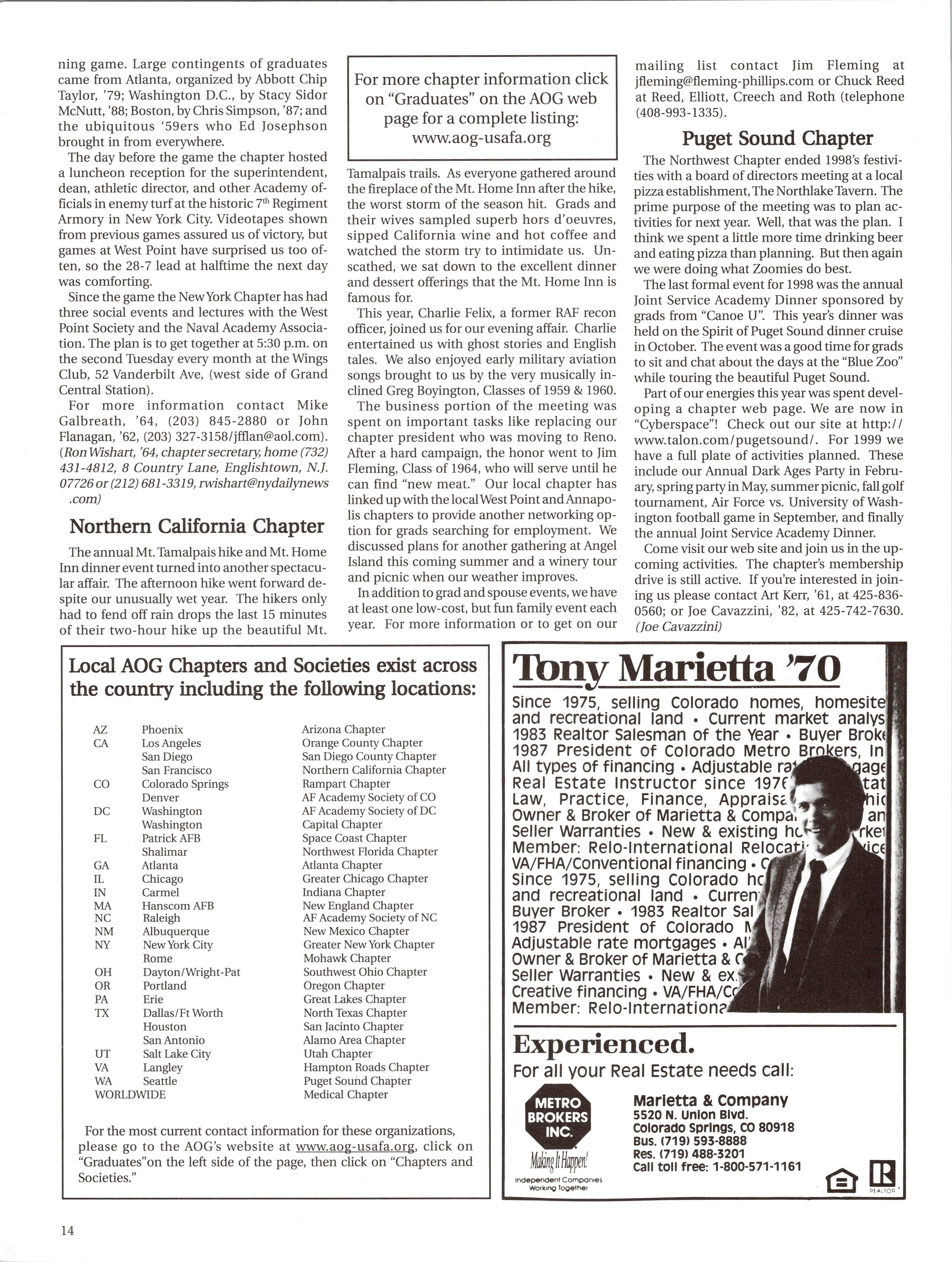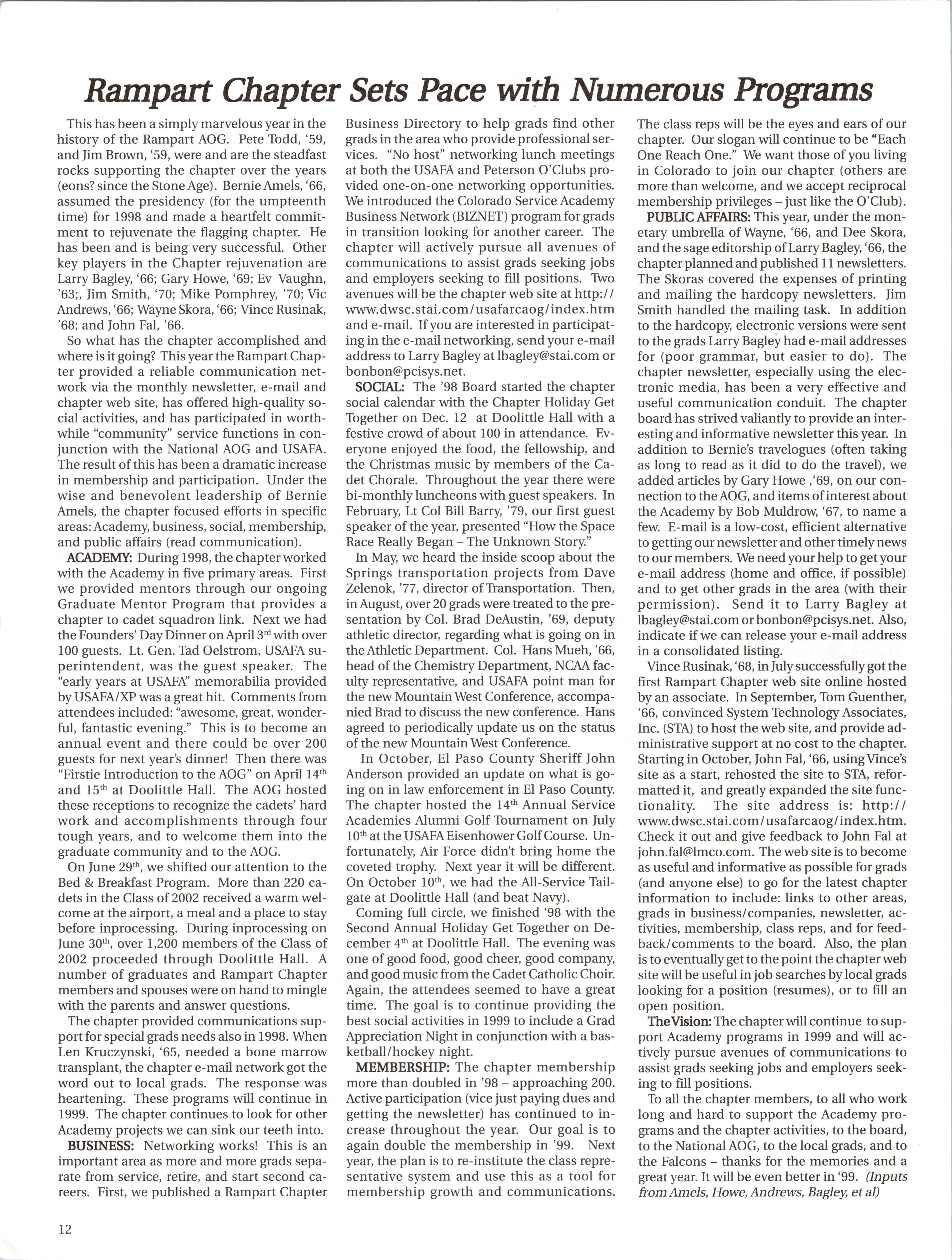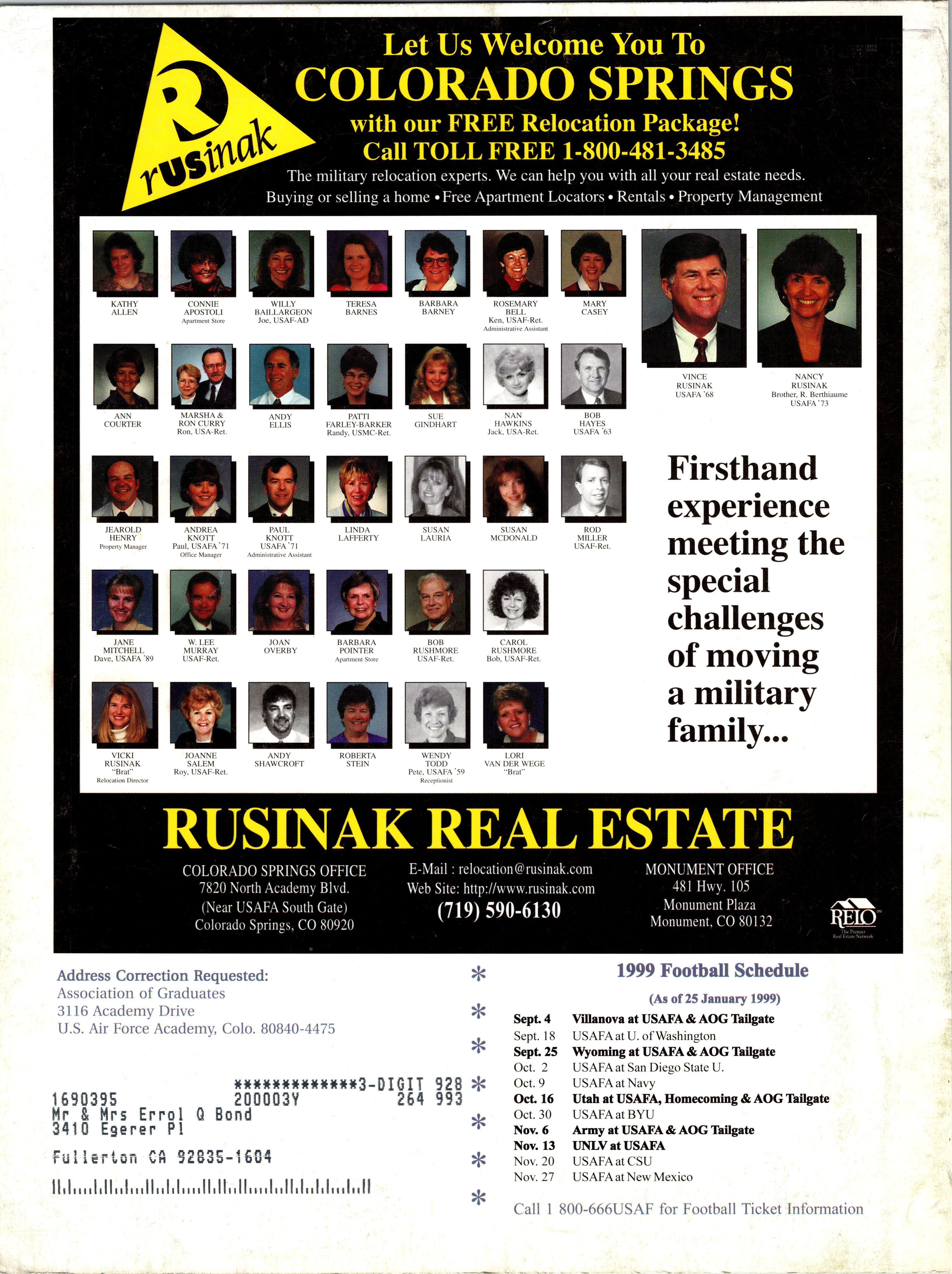 ,#s«i Let Us Welcome You To COLORADO SPRINGS with our FREE Relocation Package! Call TOLL FREE 1-800-481-3485 The military relocation experts. We can help you with all your real estate needs. Buying or selling a home »Free Apartment Locators Rentals Property Management CONNIE APOSTOLI Apartment Store WILLY BAILLARGEON Joe, USAF-AD ROSEMARY BELL Ken, USAF-Ret. JEAROLD HENRY Property Manager VICKI RUSINAK “Brat" MARSHA & RON CURRY Ron, USA-Ret. JANE MITCHELL Dave, USAFA 8' W. LEE MURRAY USAF-Ret. JOANNE SALEM Roy, USAF-Ret. PATTI FARLEY-BARKER Randy, USMC-Ret. ANDREA PAUL KNOTT KNOTT Paul, USAFA’71 USAFA’71 Office Manager Administrative Assis BARBARA POINTER Apartment Store BOB RUSHMORE USAF-Ret. WENDY TODD Pete, USAFA ’59 Receptionist NAN HAWKINS Jack, USA-Ret. CAROL RUSHMORE Bob. USAF-Ret. LORI VAN DER WEGE “Brat” BOB HAYES USAFA ’63 ROD MILLER USAF-Ret. VINCE RUSINAK USAFA ’68 NANCY RUSINAK Brother, R. Berthiaume USAFA’73 Firsthand experience meeting the special challenges of moving a military family... RUSINAK REAL ESTATE COLORADO SPRINGS OFFICE 7820 North Academy Blvd. (Near USAFA South Gate) Colorado Springs, CO 80920 E-Mail: relocation@rusinak.com Web Site: http://www.rusinak.com (719) 590-6130 MONUMENT OFFICE 481 Hwy. 10.5 Monument Plaza Monument, CO 80132 300 Address Correction Requested: Association of Graduates 3116 Academy Drive U.S. Air Force Academy, Colo. 80840-4475 #############3-0101T 1690395 200003V 264 Mr I Mrs Errol Q Bond 3410 Egerer PI Ful iifiofi Cft S283S-1604 * * * 928 * 993 * * * 1999 Football Schedule (As of 25 January 1999) Sept, 4 Villanova at USAFA & AOG Tailgate Sept. 18 USAFA at U. ofWashington Sept 25 Wyoming at USAFA & AOG Tailgate Oct. 2 USAFA at San Diego State U. Oct. 9 USAFA at Navy Oct 16 Utah at USAFA, Homecoming & AOG Tailgate Oct. 30 USAFA at BYU Nov. 6 Army at USAFA & AOG Tailgate Nov. 13 UNLV at USAFA Nov. 20 USAFA at CSU Nov. 27 USAFA at New Mexico Call 1 800-666USAF for Football Ticket Information