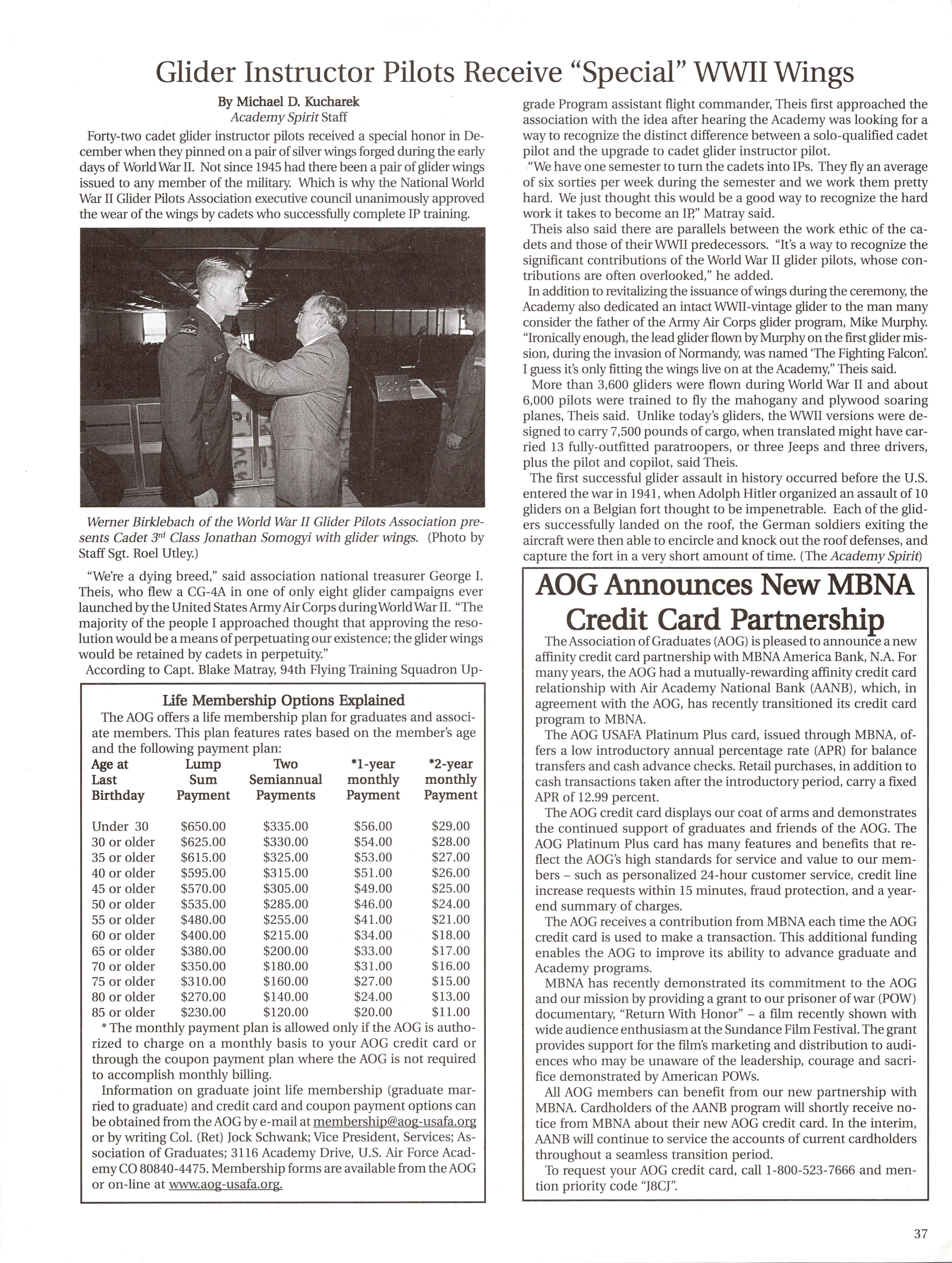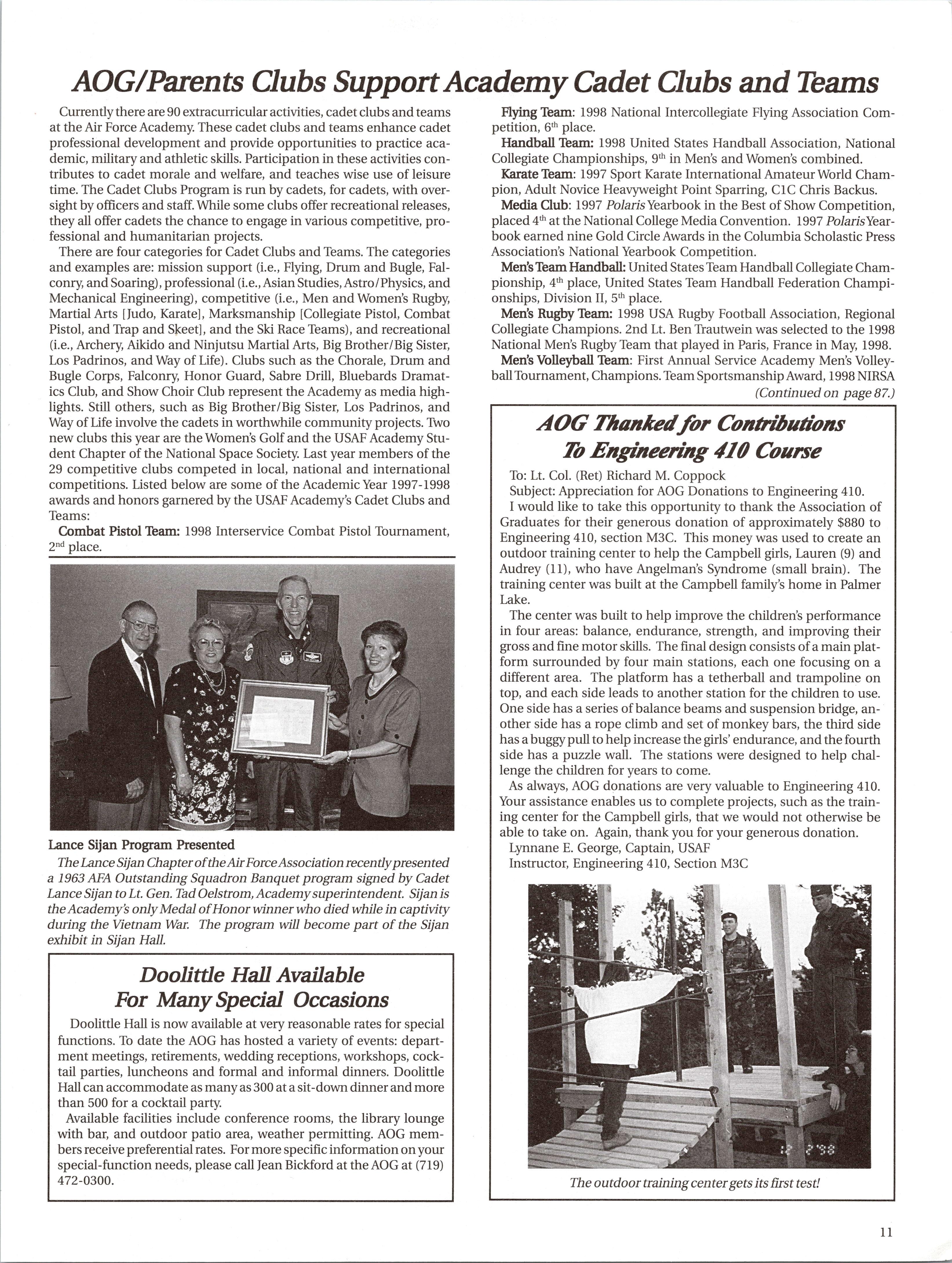 Annually, the Association ofGraduates (AOG) ofthe the United States Air Force Academy makes a generous donation to the Cadet Club’s Program. They have donated $81,651 for the current academic year to support cadet and Academy needs. Last year the AOG supported 26 cadet clubs and teams. The clubs and teams used the funds to purchase equipment, uniforms, awards, trophies, books, videos and supplies, and to pay for conference fees and travel expenses.
