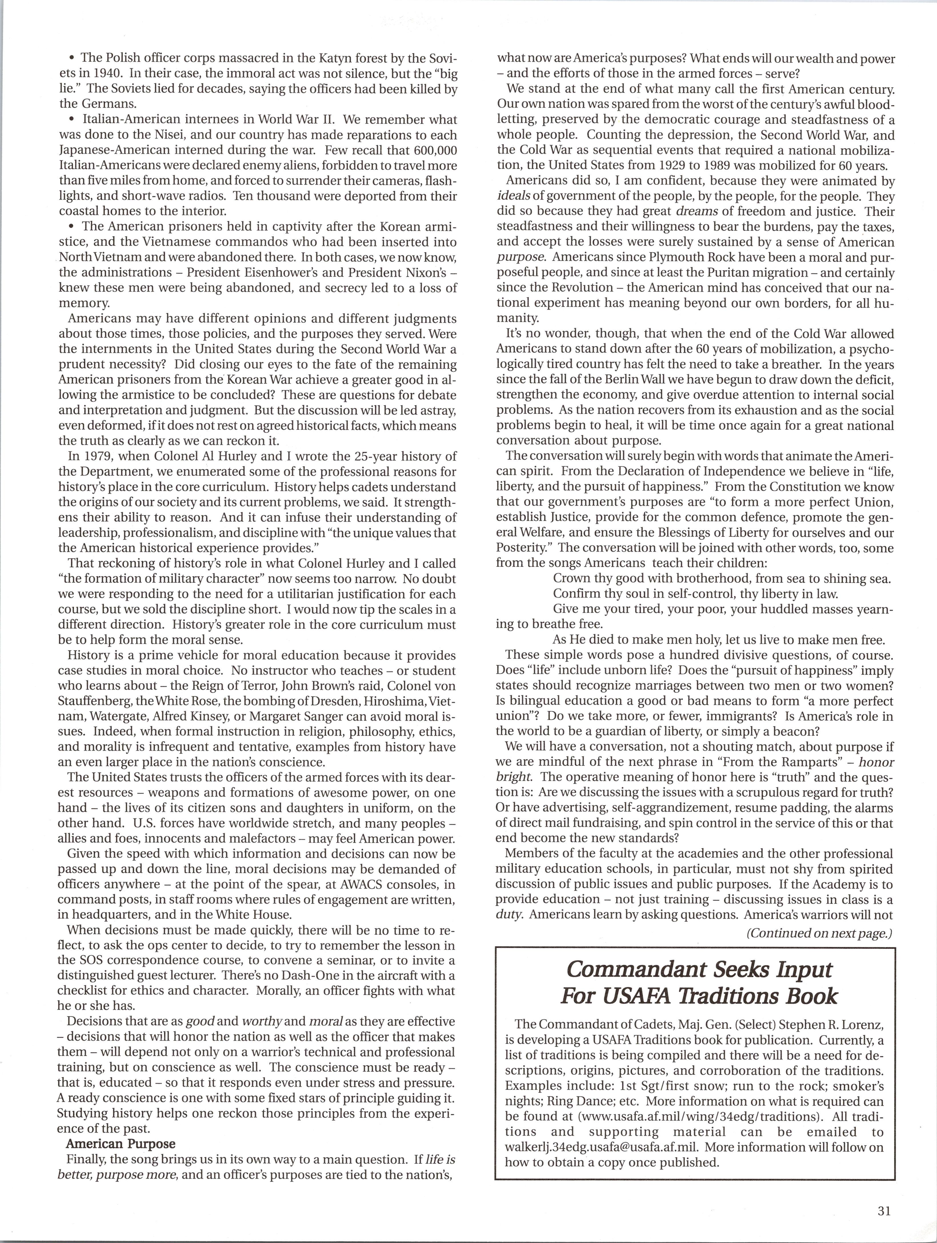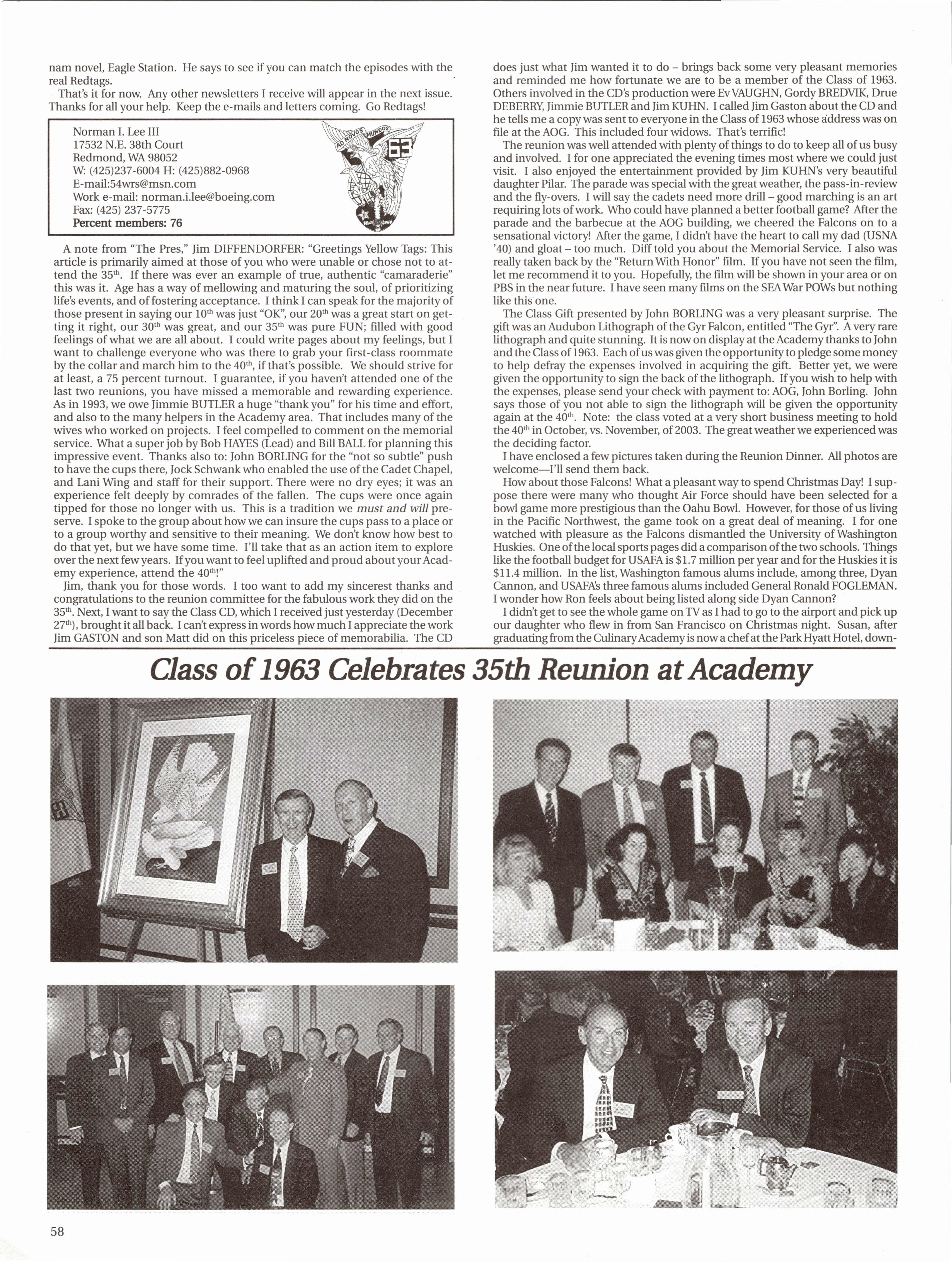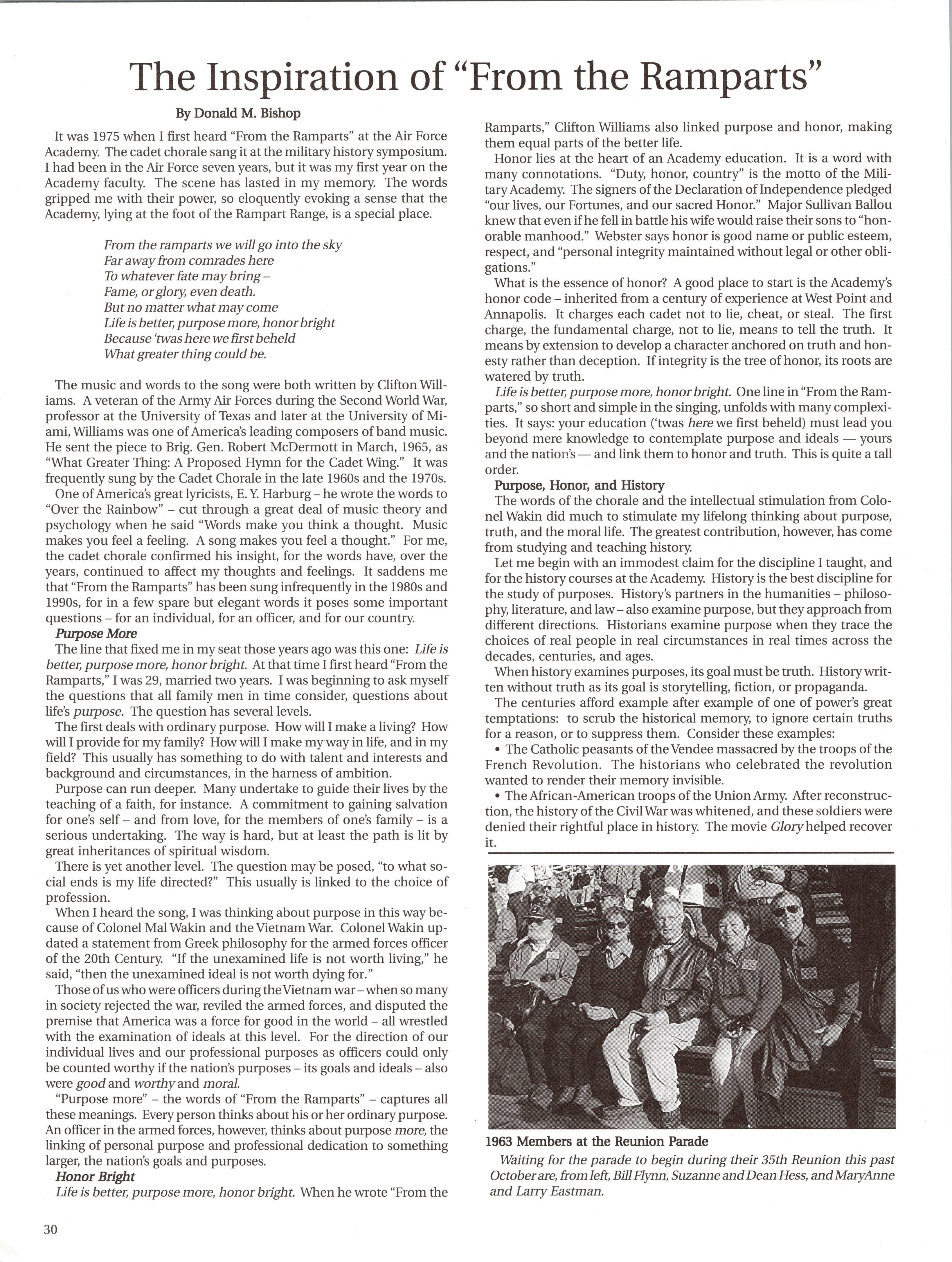 One of the joys of this job has been the experience and satisfaction I have gained from the reunion activities - most of which occur in the Fall. I have noticed a mood or feeling among classes during the reunion that is worth mentioning. Maybe it is just age, or maybe it is a sign that we are moving into another level or period in the life of the institution. I have gotten a definite sense from reunion classes that there is a deepening sense of emotion and commitment toward the Academy than may have been present when we were a younger institution. There is an emotional recognition of the Academy’s contributions to the country and the importance of graduate responsibilities to maintain the level of excellence. This transition is a huge factor in the life of theAcademy and will play an immense role in howthis institution copes in the next century. I invite all ofyou to be a part of the future.