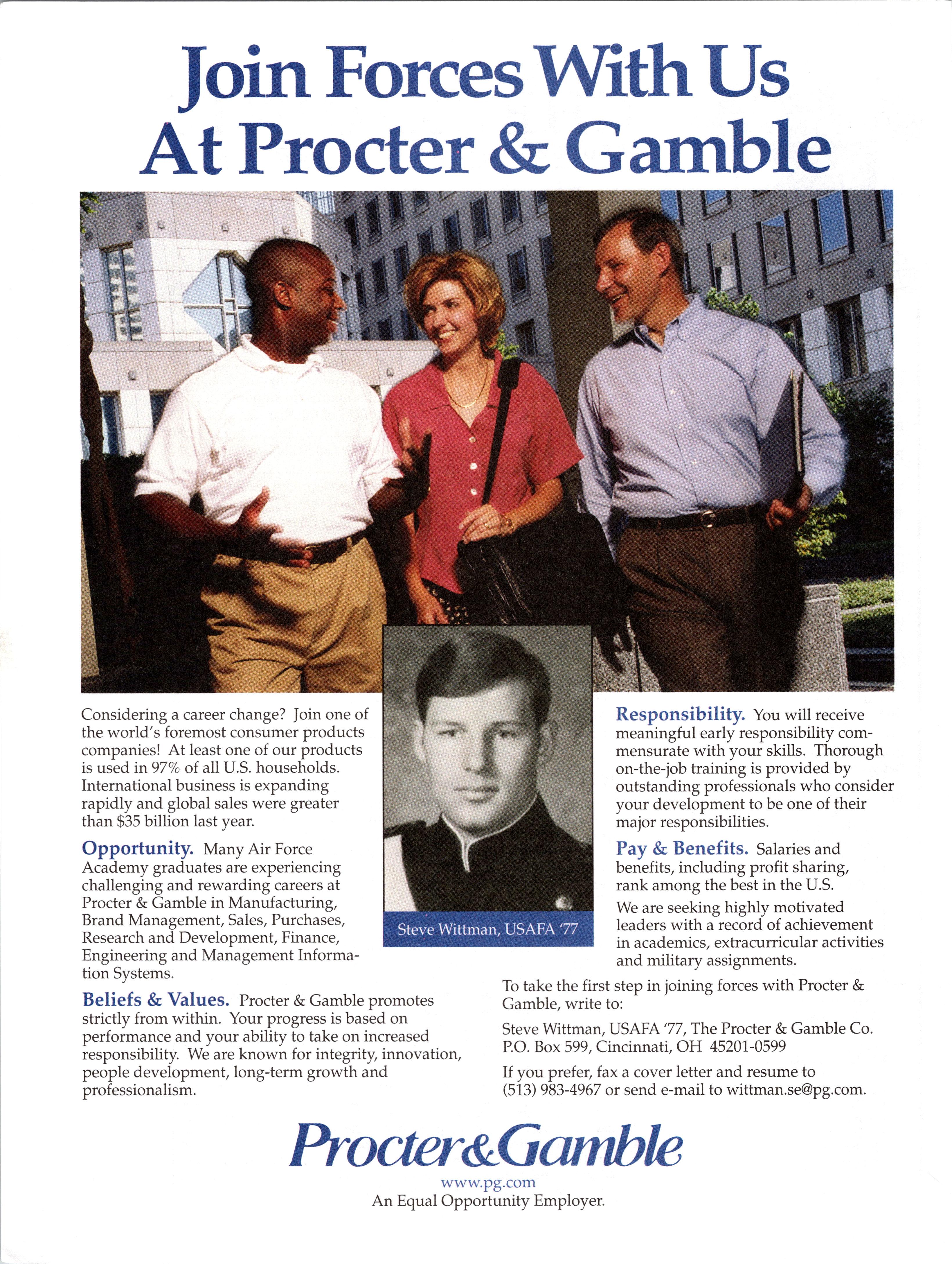 Opportunity. Many Air Force Academy graduates are experiencing challenging and rewarding careers at Procter & Gamble in Manufacturing, Brand Management, Sales, Purchases, Research and Development, Finance, Engineering and Management Information Systems.