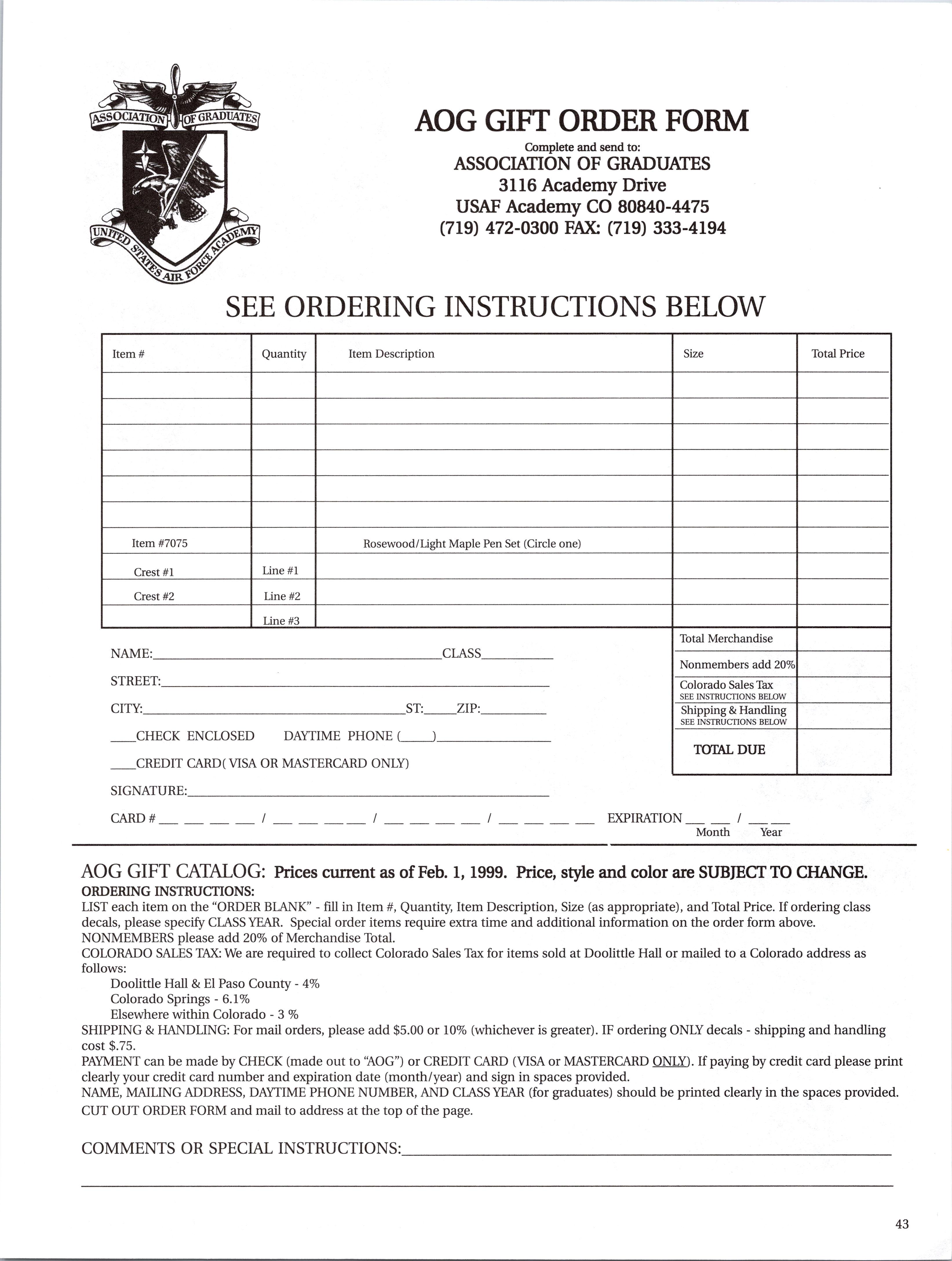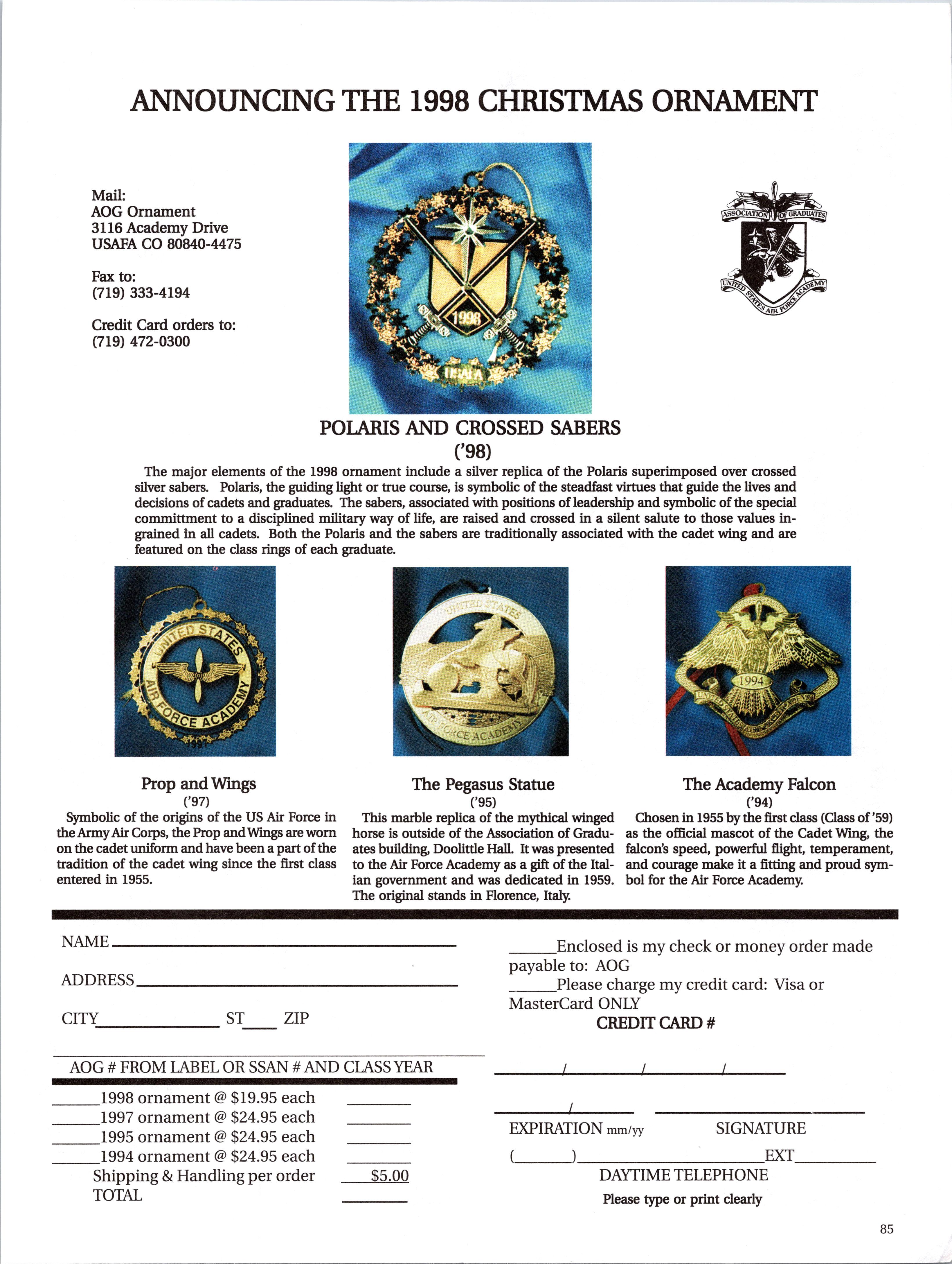 NAME ADDRESS CITY ST ZIP AOG # FROM LABEL OR SSAN # AND CLASS YEAR 1998 ornament @ $19.95 each 1997 ornament @ $24.95 each 1995 ornament @ $24.95 each 1994 ornament @ $24.95 each Shipping & Handling per order $5.00 TOTAL Enclosed is my check or money order made payable to: AOG Please charge my credit card: Visa or MasterCard ONLY CREDIT CARD# L L L L EXPIRATION mm/yy SIGNATURE ( ) EXT DAYTIME TELEPHONE Please type or print clearly