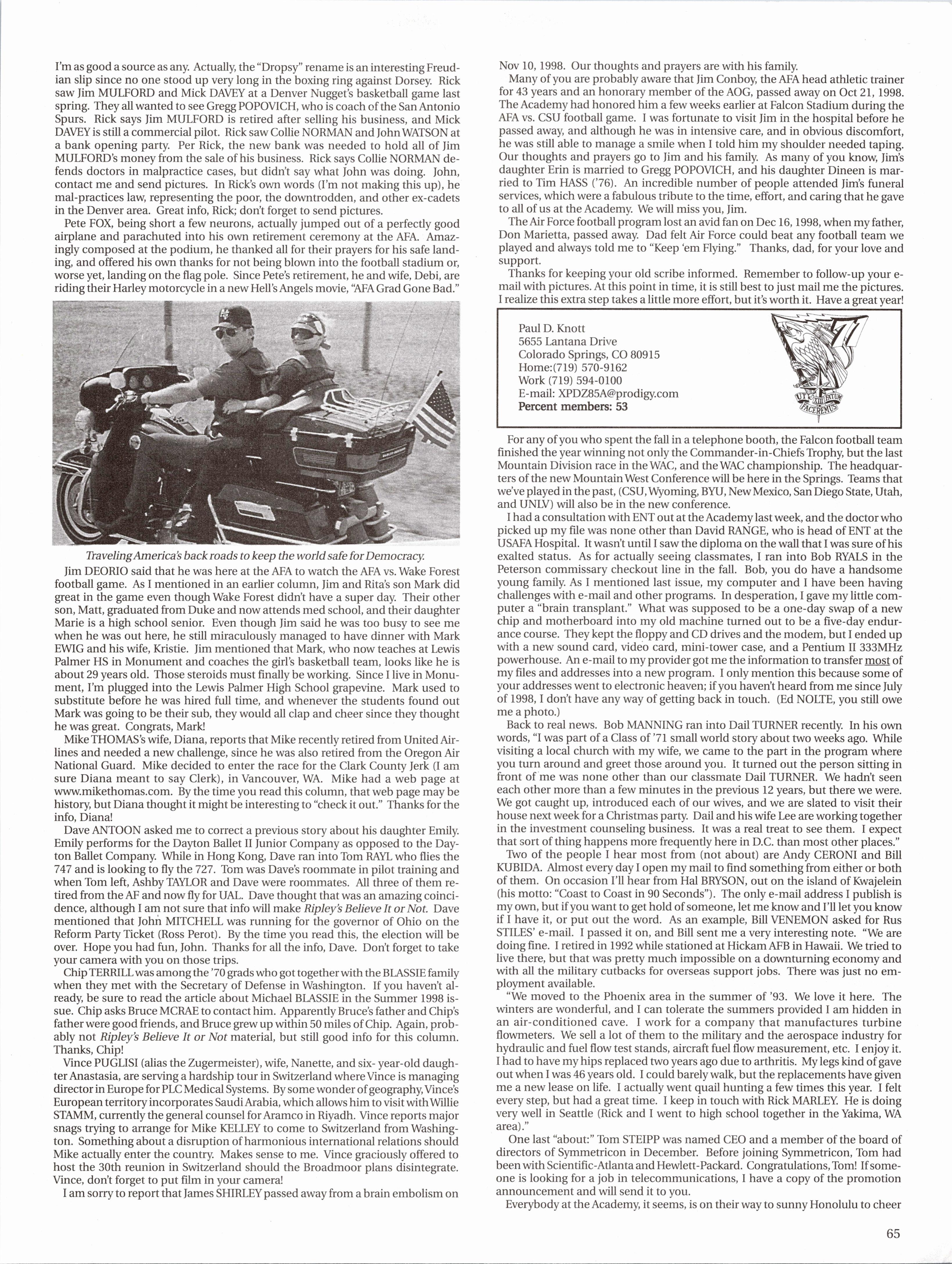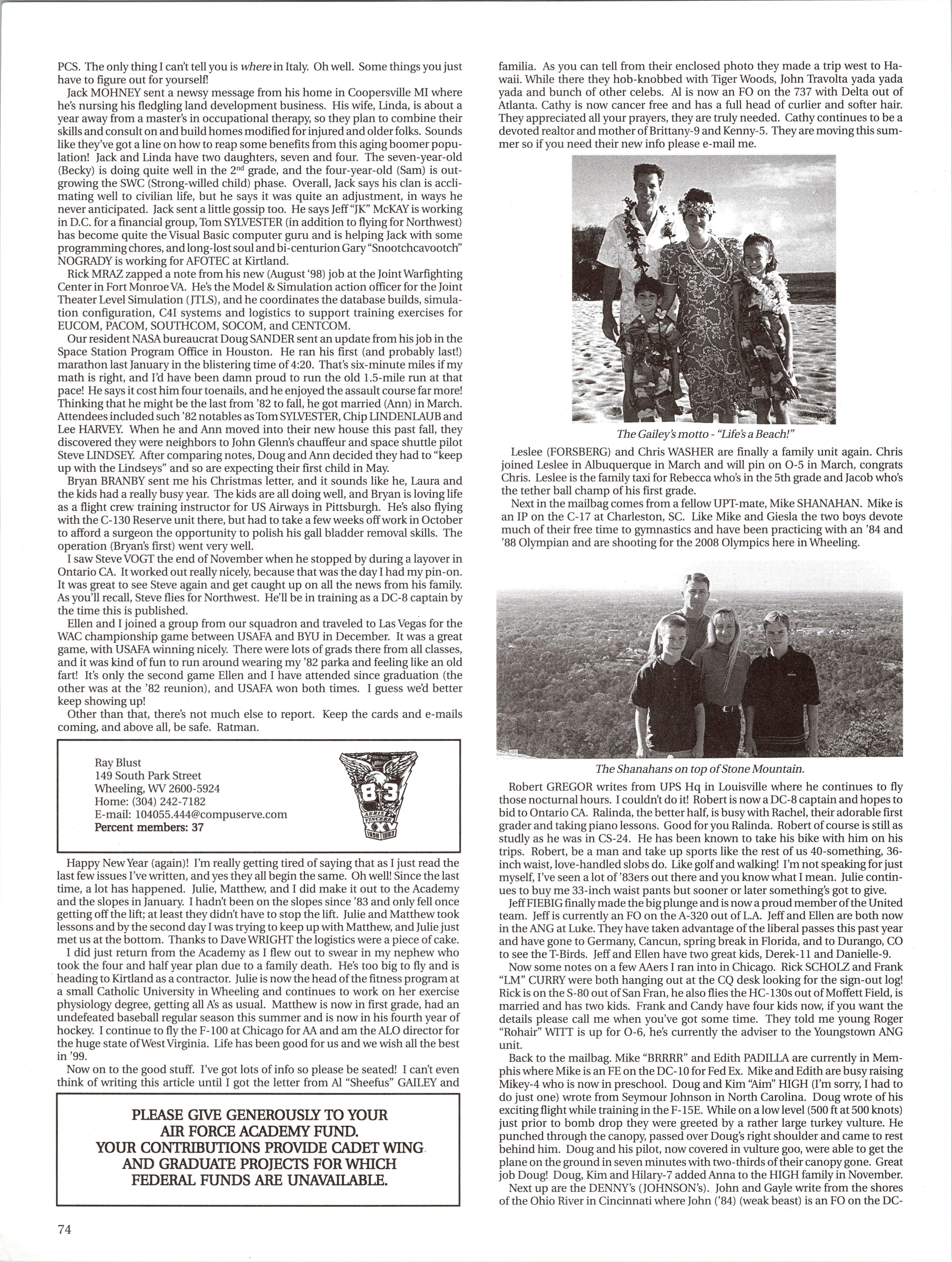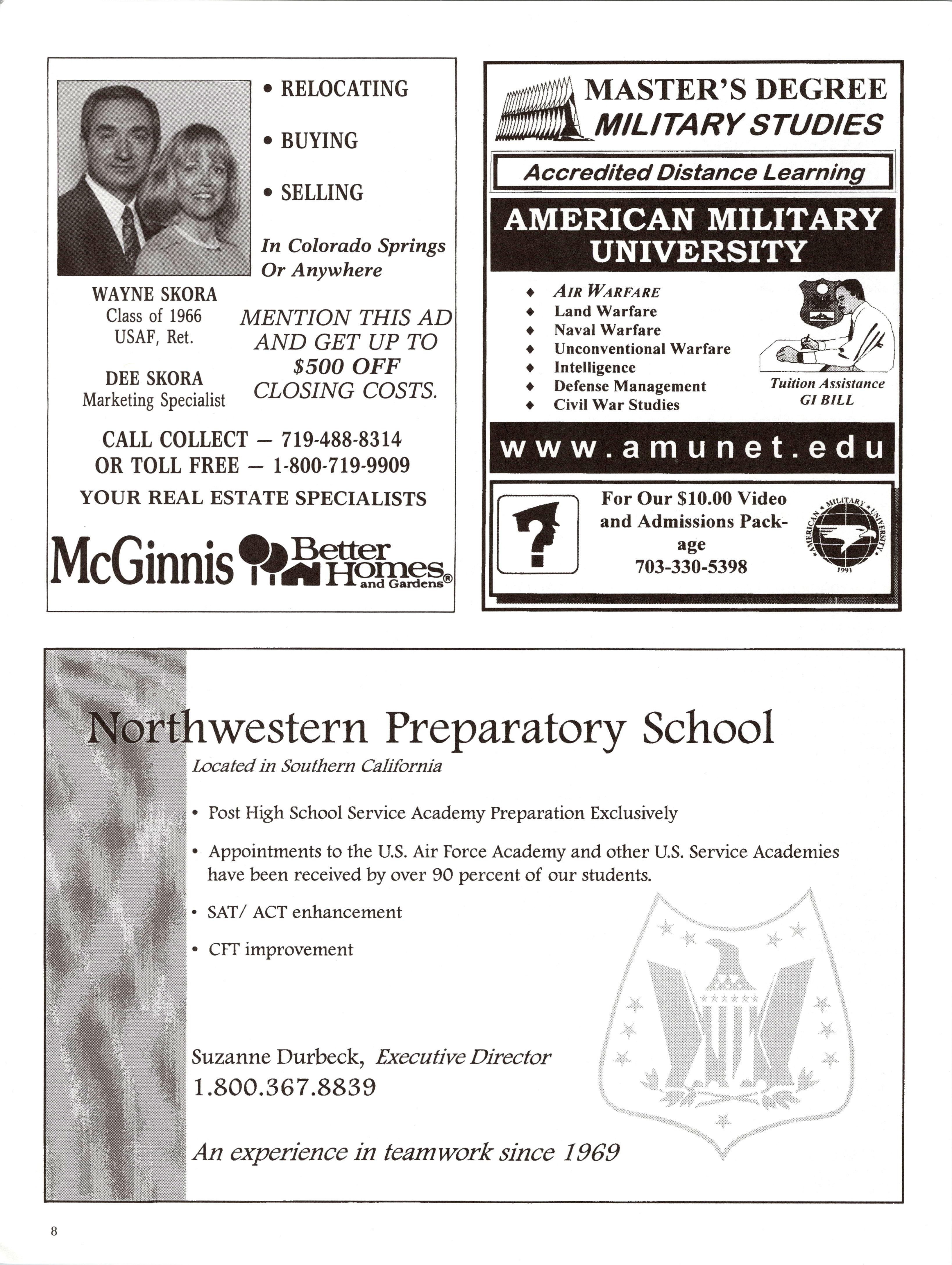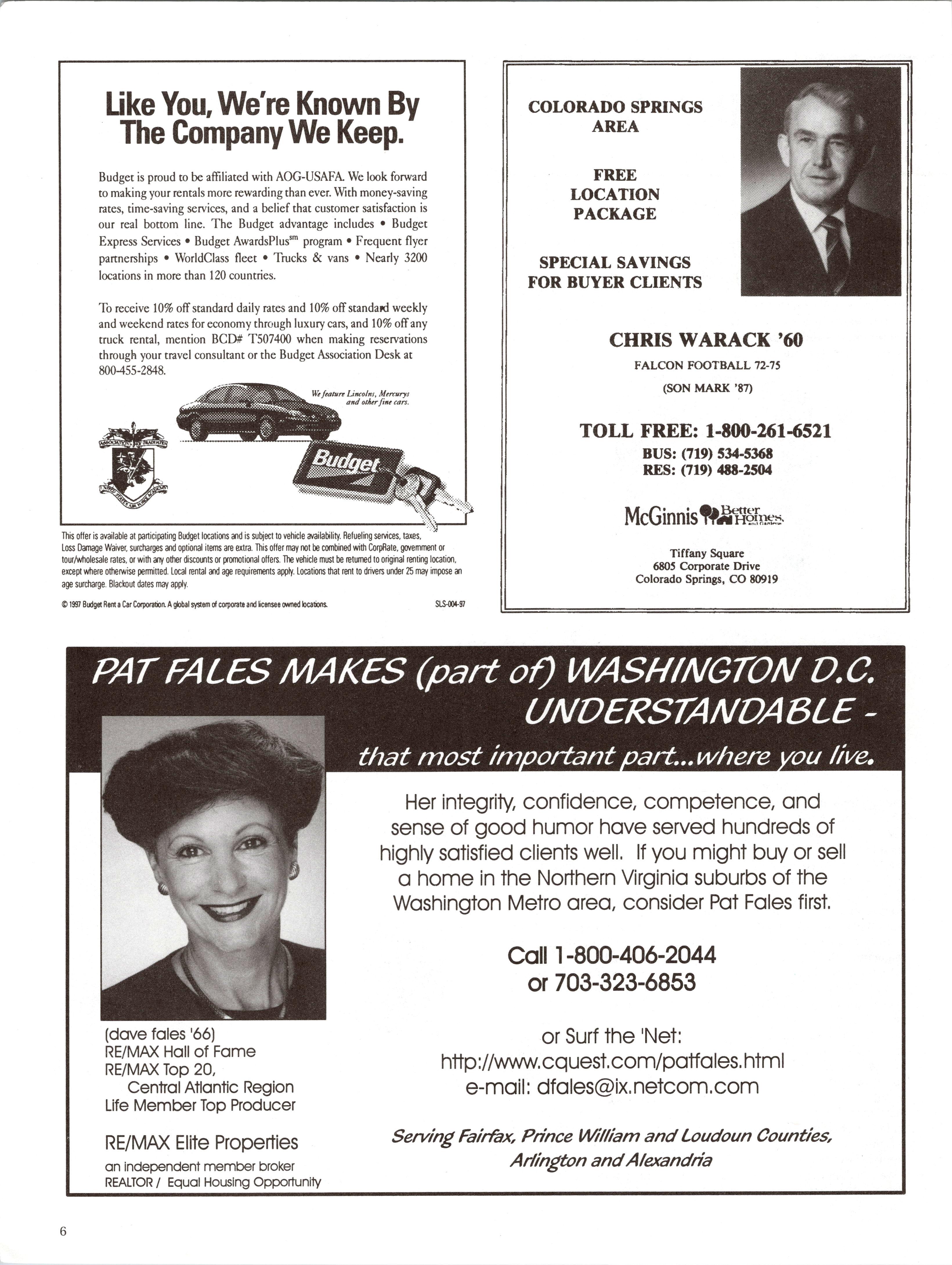 6 Like You, We're Known By The CompanyWe Keep. Budget is proud to be affiliated with AOG-USAFA. We look forward to making your rentals more rewarding than ever. With money-saving rates, time-saving services, and a belief that customer satisfaction is our real bottom line. The Budget advantage includes Budget Express Services Budget AwardsPlussm program Frequent flyer partnerships WorldClass fleet Trucks & vans Nearly 3200 locations in more than 120 countries. To receive 10% off standard daily rates and 10% off standard weekly and weekend rates for economy through luxury cars, and 10% offany truck rental, mention BCD# T507400 when making reservations through your travel consultant or the Budget Association Desk at 800-455-2848. This offer is available at Loss Damage Waiver, surcharges and optional items are extra. This offer may not be combined with CorpRate, government or tour/wholesale rates, or with any other discounts or promotional offers. The vehicle must be returned to original renting location, except where otherwise permitted. Local rental and age requirements apply. Locations that rent to drivers under 25 may impose an age surcharge. Blackout dates may apply. © 1997 Budget Rent a Car Corporatioa A global system of corporate and licensee owned locations. SLS-004-97 COLORADO SPRINGS AREA FREE LOCATION PACKAGE SPECIAL SAVINGS FOR BUYER CLIENTS CHRIS WARACK ’60 FALCON FOOTBALL 72-75 (SON MARK ’87) TOLL FREE: 1-800-261-6521 BUS: (719) 534-5368 RES: (719) 488-2504 McGinnisWiHoms-:Tiffany Square 6805 Corporate Drive Colorado Springs, CO 80919 PATFACES MAKES (part of) WASHINGTON D.C. UNDERSTANDABLEmost importantpart...where you live. Her integrity, confidence, competence, and sense of good humor have served hundreds of highly satisfied clients well. If you might buy or sell a home in the Northern Virginia suburbs of the Washington Metro area, consider Pat Fales first. Call 1 -800-406-2044 or 703-323-6853 or Surf the 'Net: http://www.cquest.com/patfales.htmI e-mail: dfales@ix.netcom.com Serving Fairfax, Prince William and Loudoun Counties, Arlington andAlexandria (dave fales '66) RE/MAX Hall of Fame RE/MAX Top 20, Central Atlantic Region Life Member Top Producer RE/MAX Elite Properties an independent member broker REALTOR / Equal Housing Opportunity